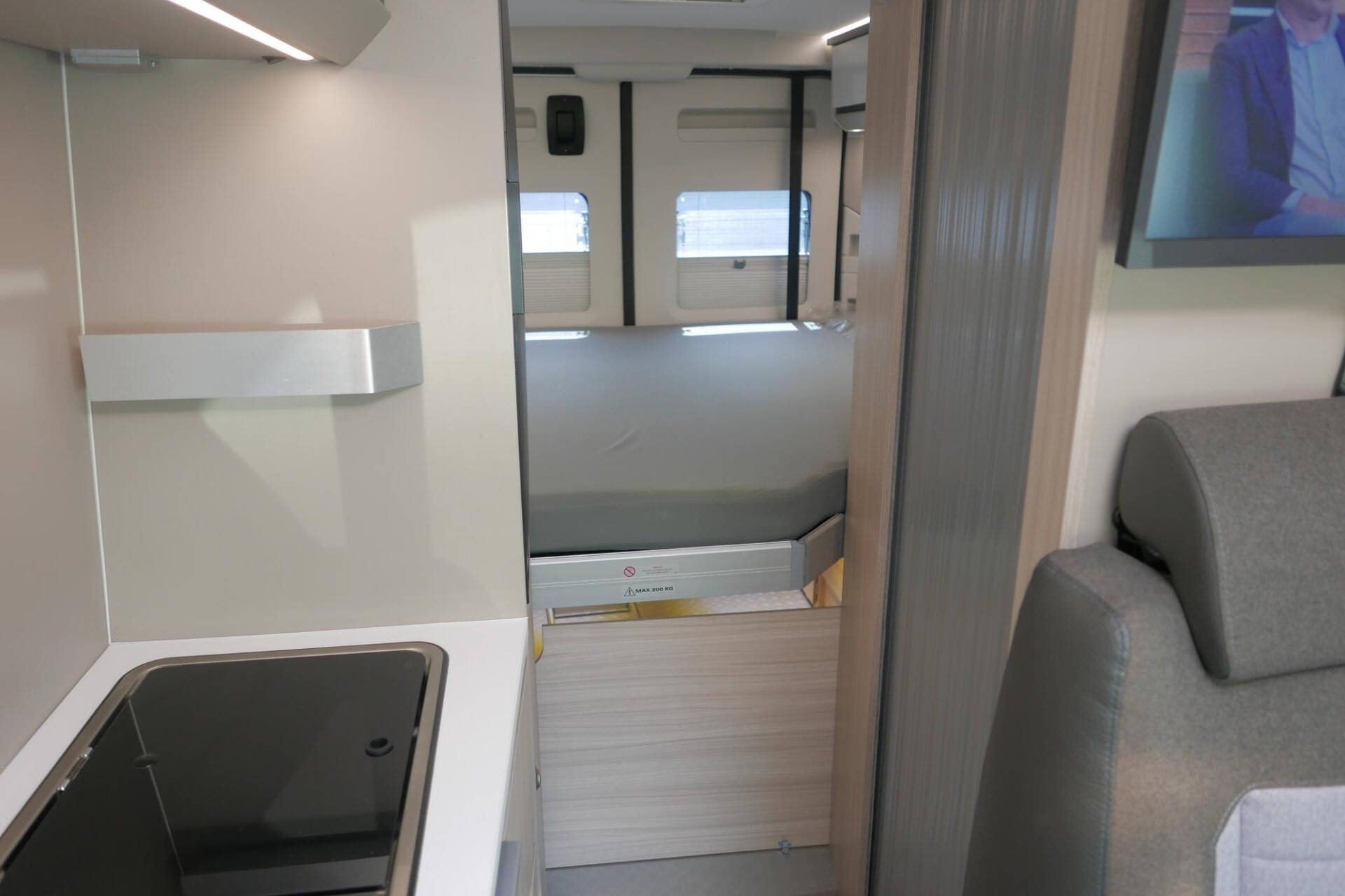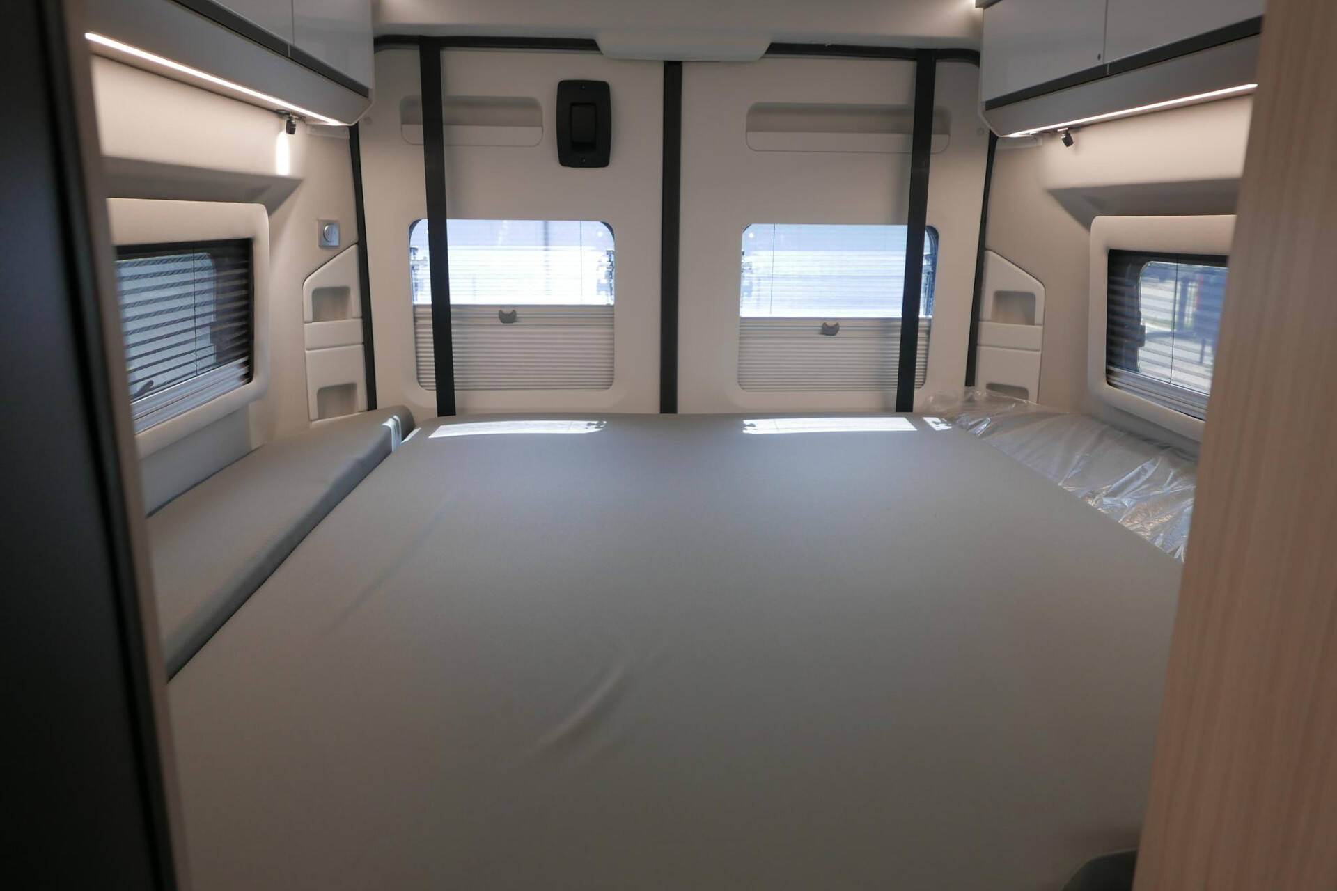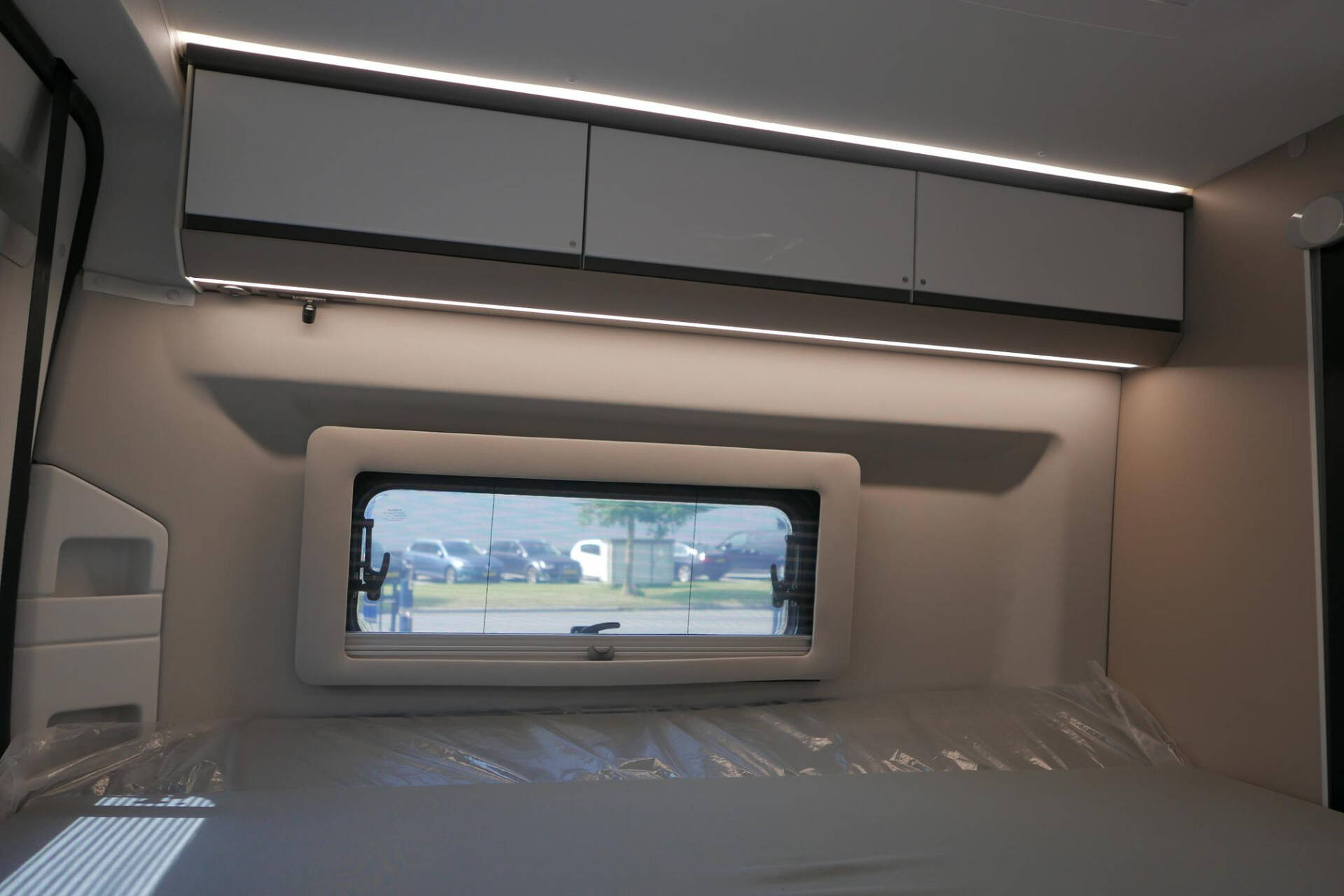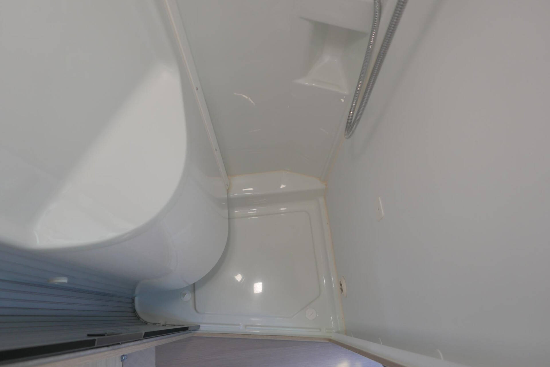 Tegenover de keuken vindt u de gecombineerde douche- en toiletruimte. Zeker wanneer u niet (vaak) doucht heeft u hierdoor een extra ruime badkamer. Deze is voorzien van toilet, wasbak en douche. Achterin bevind zich het 2 persons 1.90 m bij 1.95 m bed, wat u elektrische omhoog kunt doen voor meer bergruimte voor bijvoorbeeld fietsen. Onder het bed is extra kastruimte aanwezig.