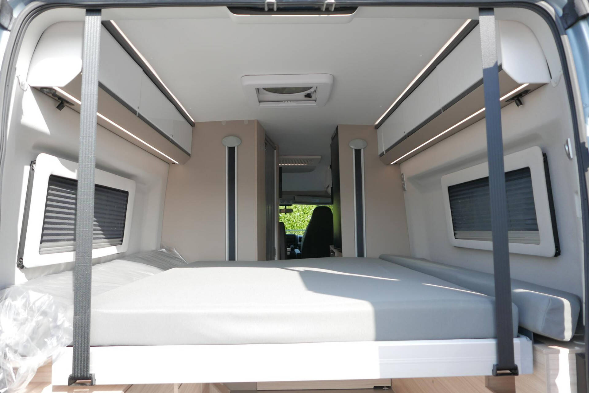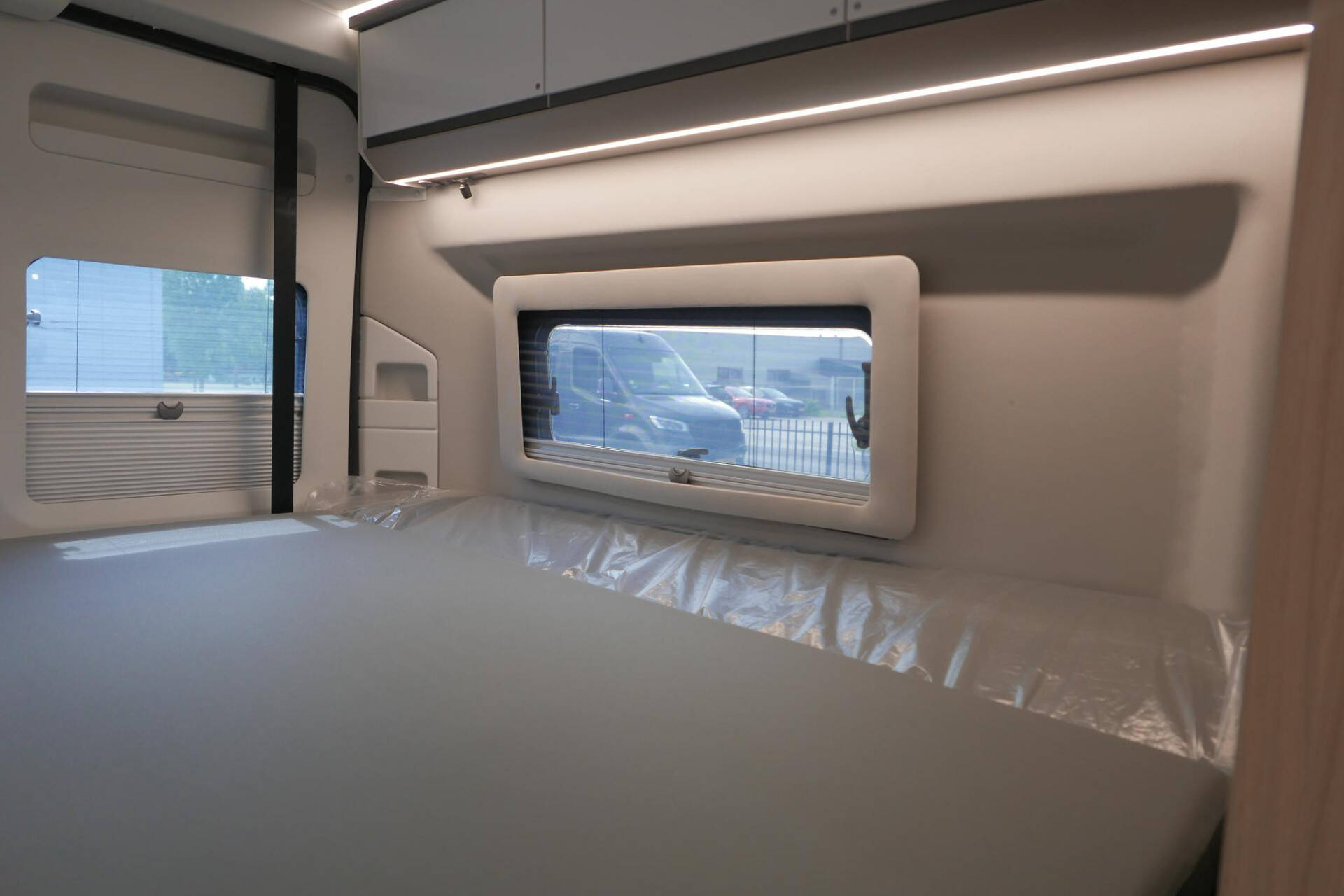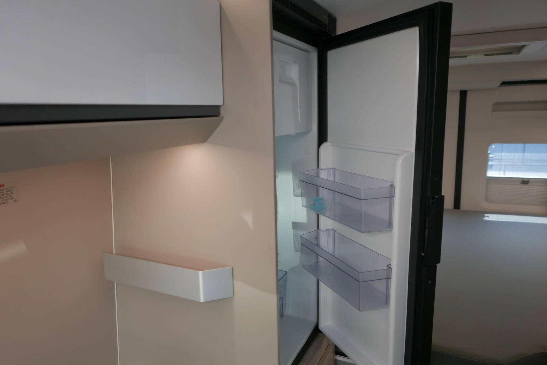 Tegenover de keuken vindt u de gecombineerde douche- en toiletruimte. Zeker wanneer u niet (vaak) doucht heeft u hierdoor een extra ruime badkamer. Deze is voorzien van toilet, wasbak en douche. Achterin bevind zich het 2 persons 1.90 m bij 1.95 m bed, wat u elektrische omhoog kunt doen voor meer bergruimte voor bijvoorbeeld fietsen. Onder het bed is extra kastruimte aanwezig.