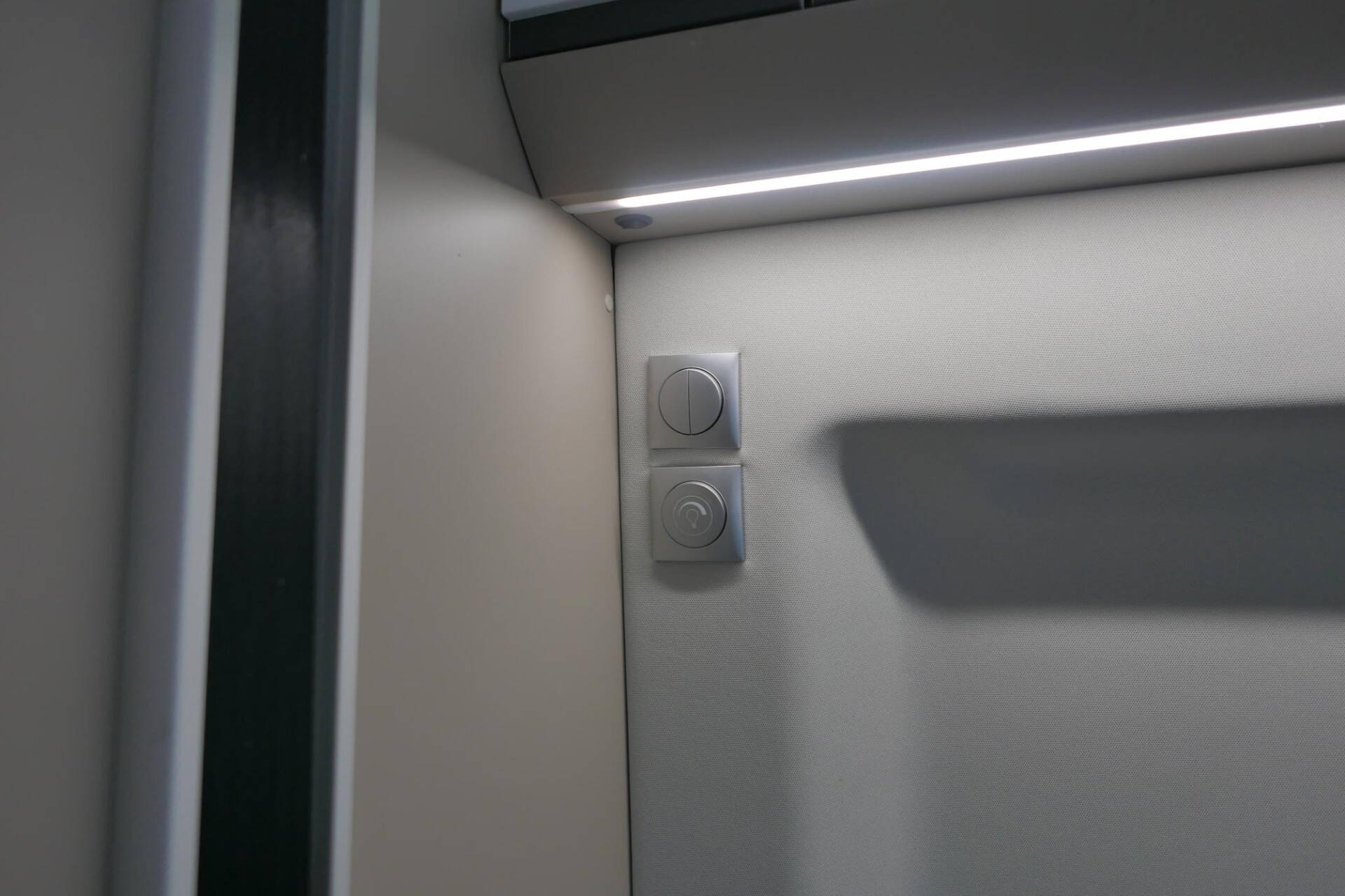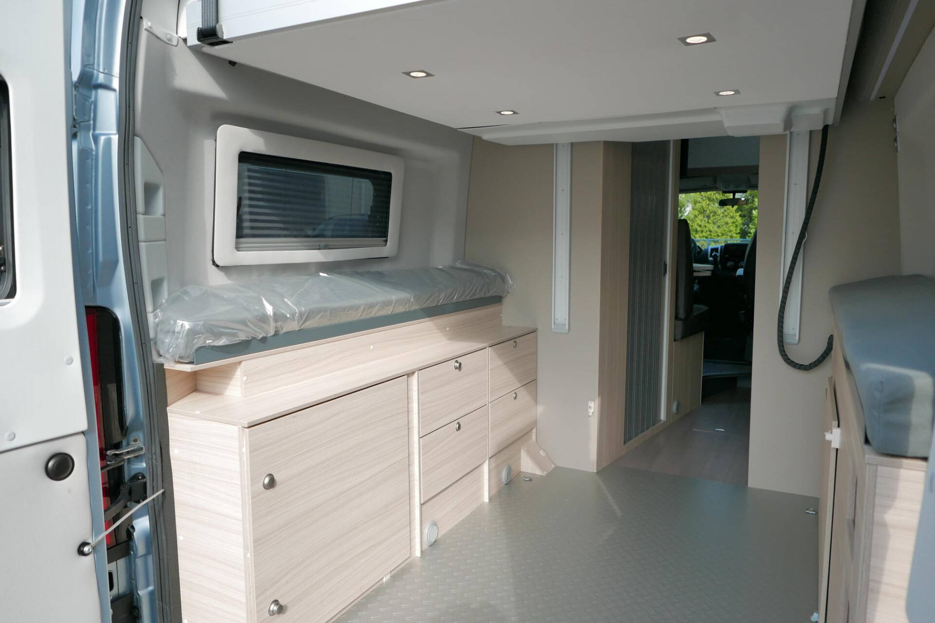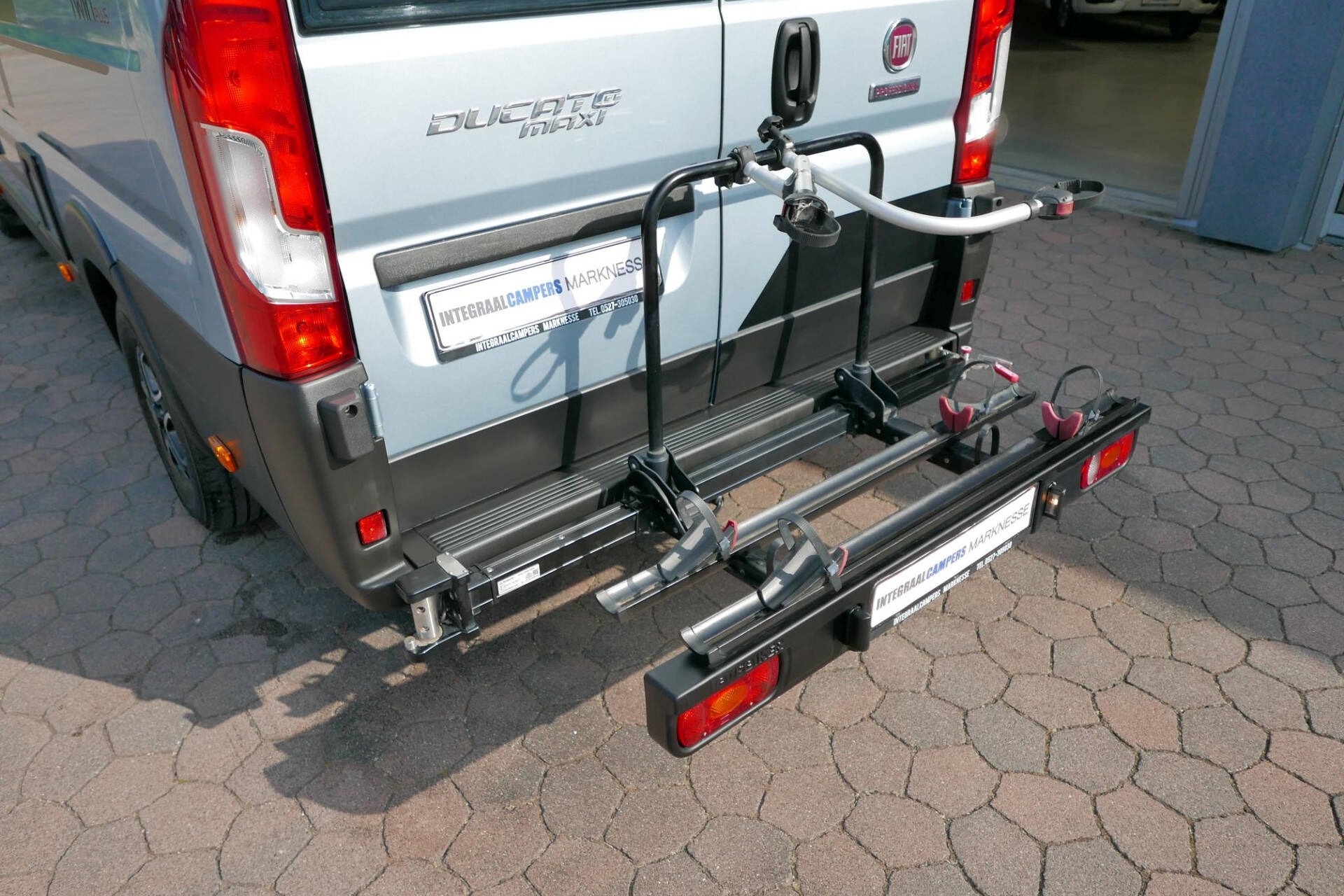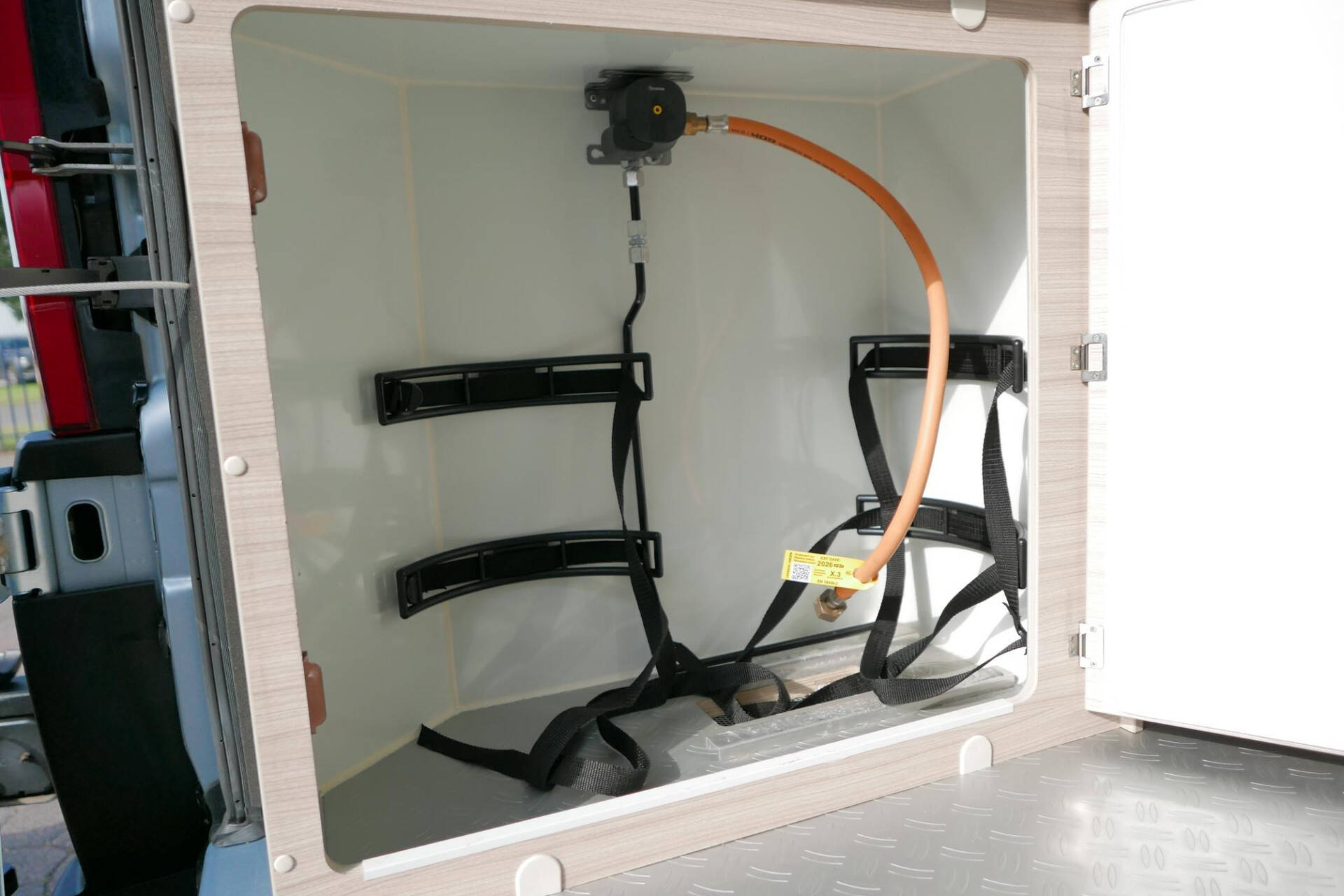 Tegenover de keuken vindt u de gecombineerde douche- en toiletruimte. Zeker wanneer u niet (vaak) doucht heeft u hierdoor een extra ruime badkamer. Deze is voorzien van toilet, wasbak en douche. Achterin bevind zich het 2 persons 1.90 m bij 1.95 m bed, wat u elektrische omhoog kunt doen voor meer bergruimte voor bijvoorbeeld fietsen. Onder het bed is extra kastruimte aanwezig.