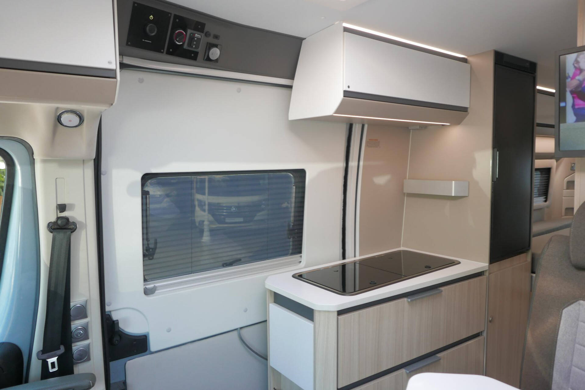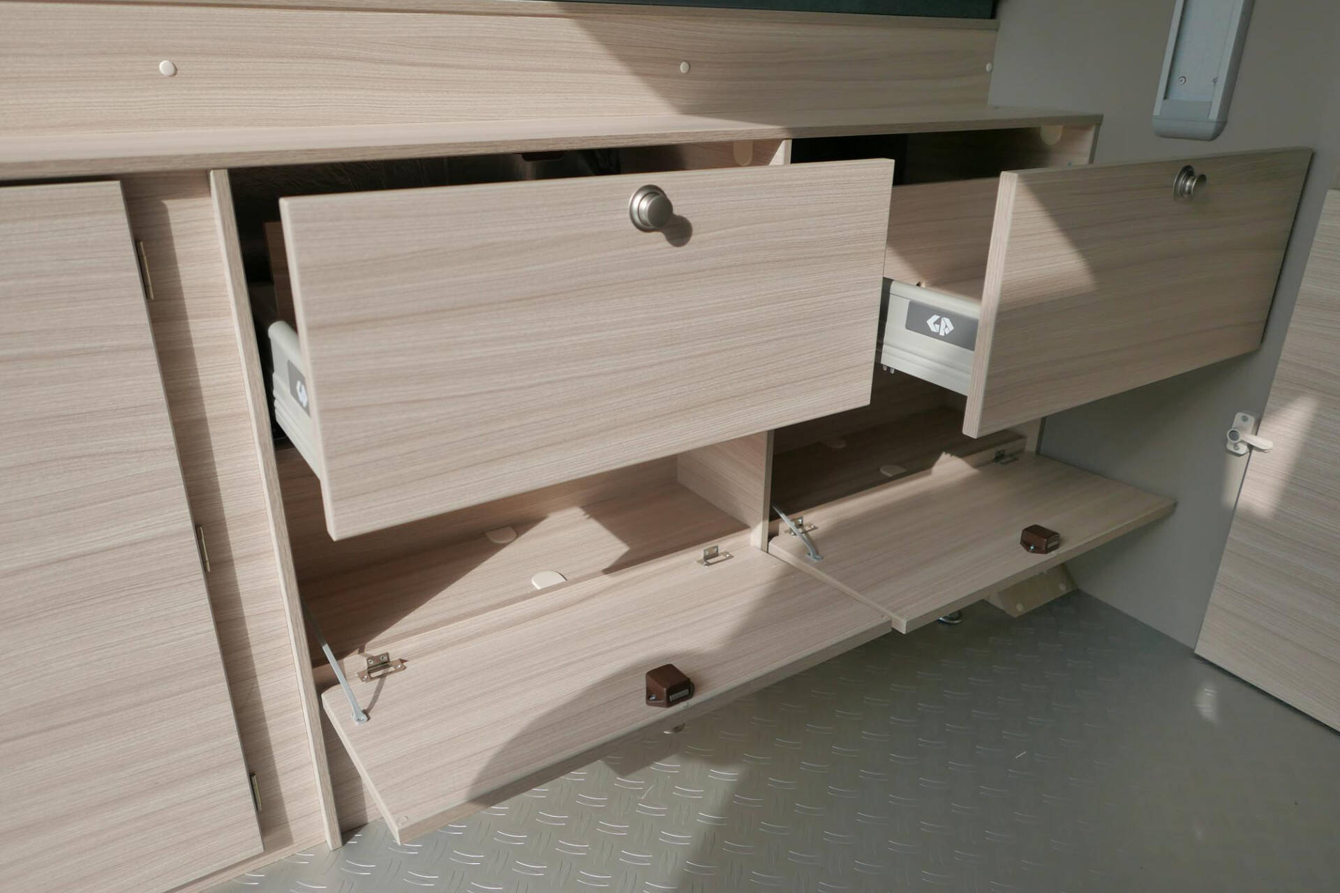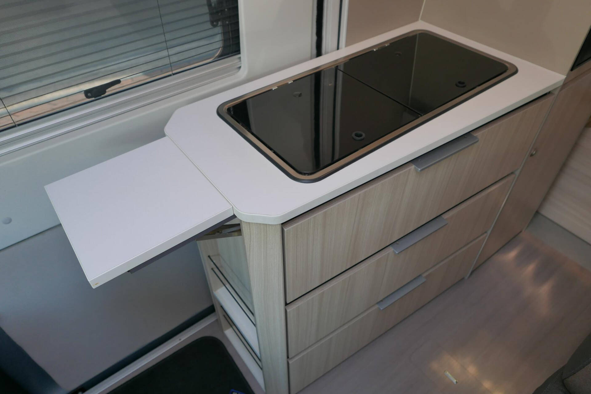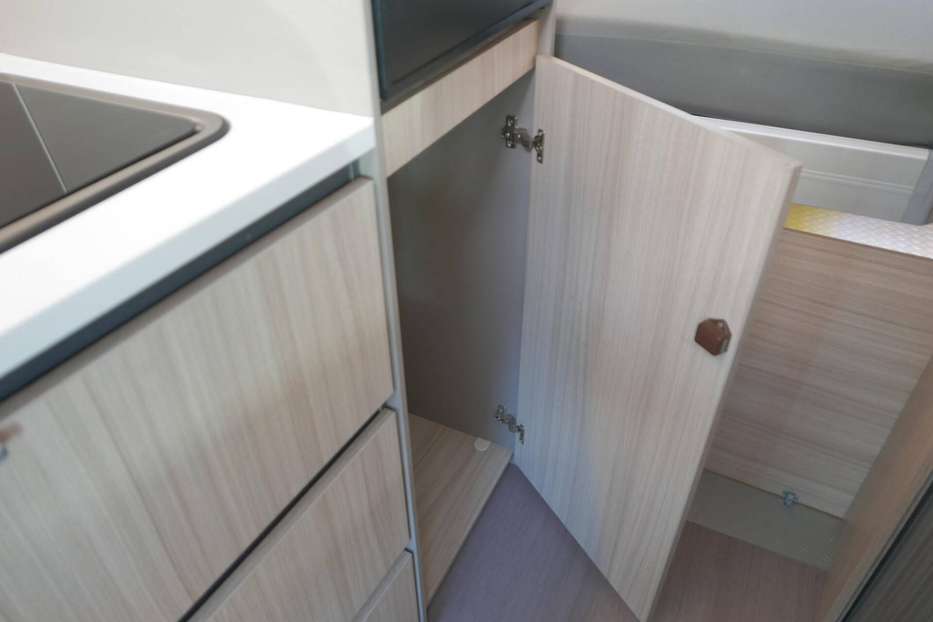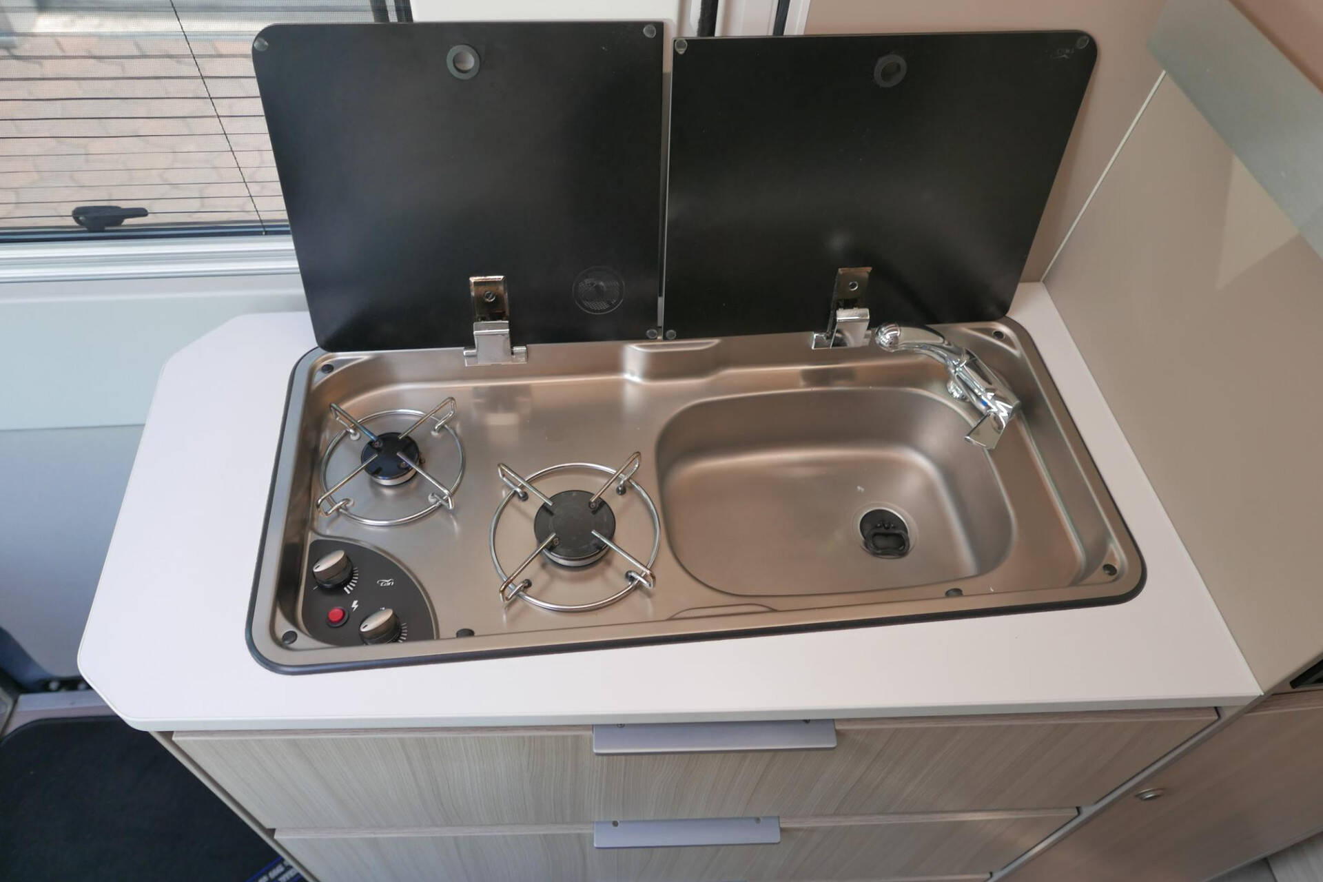 De keuken is voorzien van een 2 pits gasstel, wasbak en diverse gelagerde boodschappenladen. Met daarnaast een grote 90 l compressor koelkast (12V of 230V) incl. vriesvak.