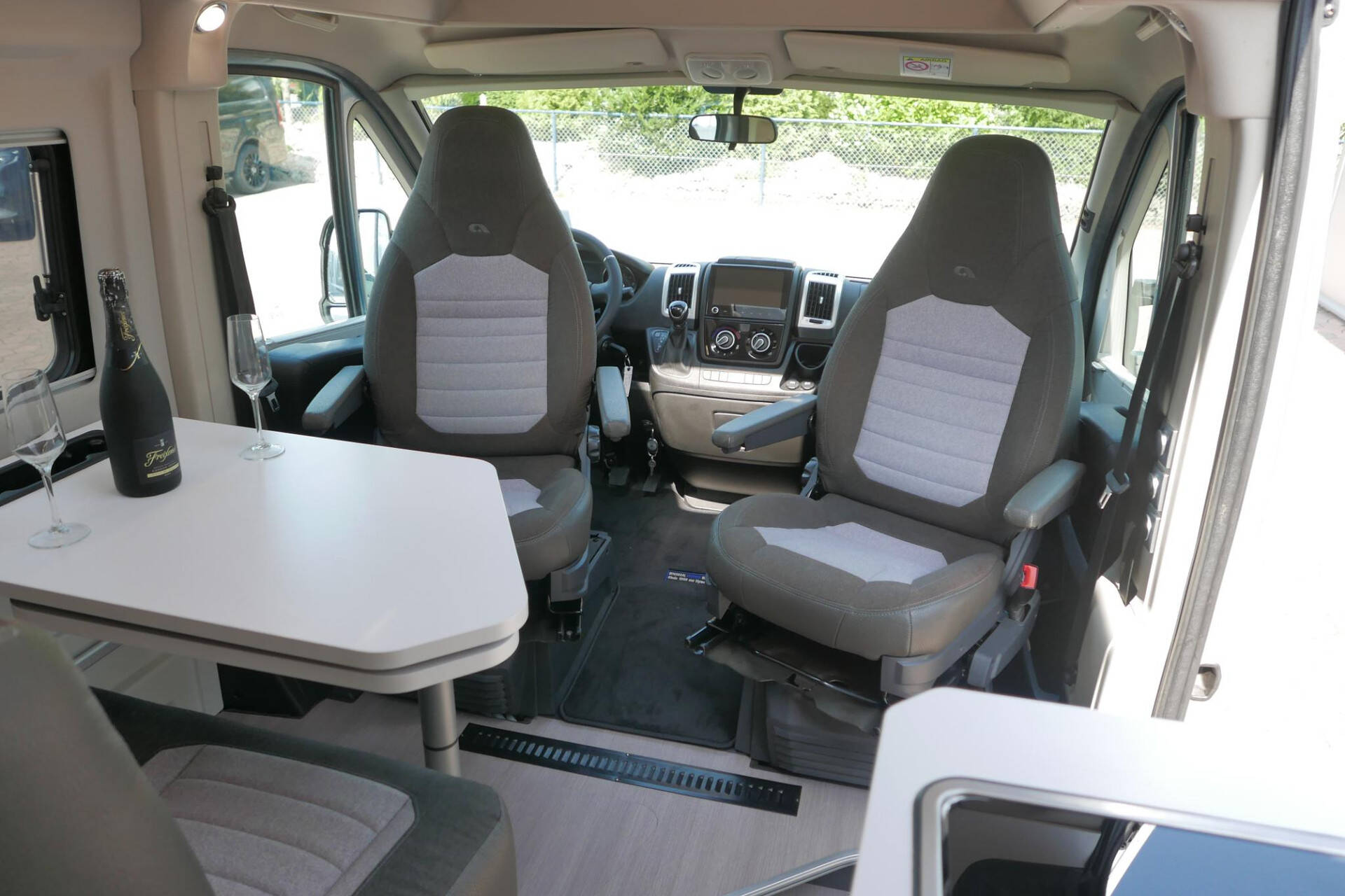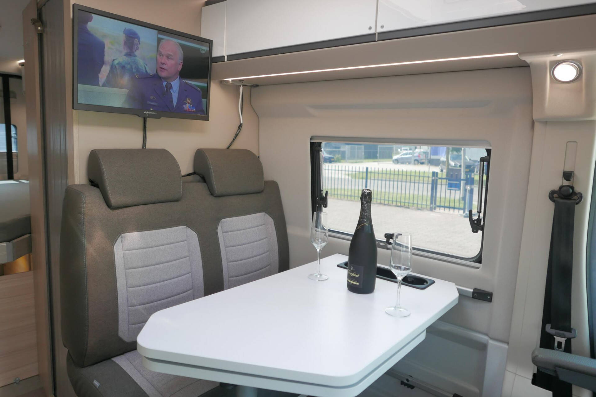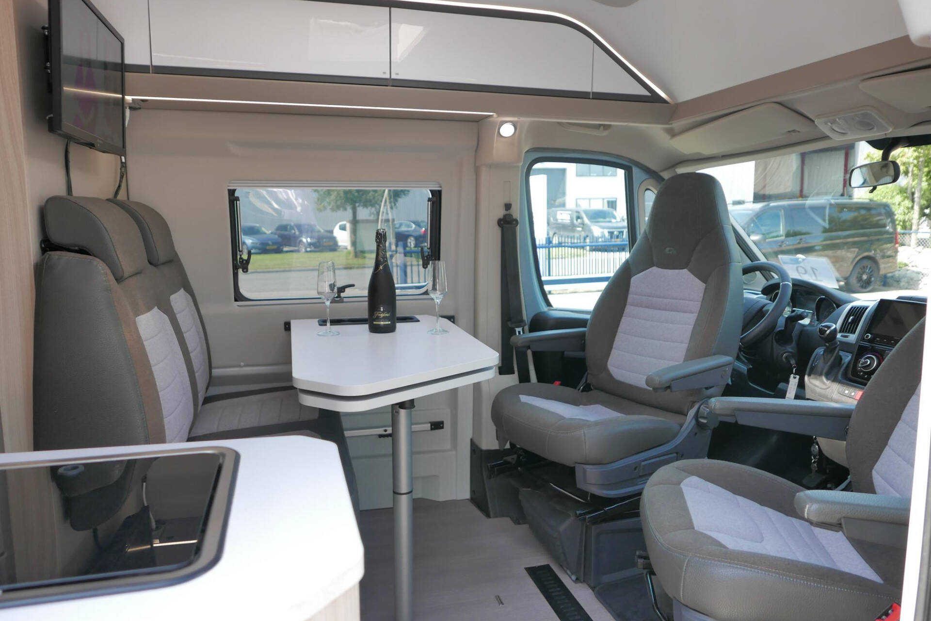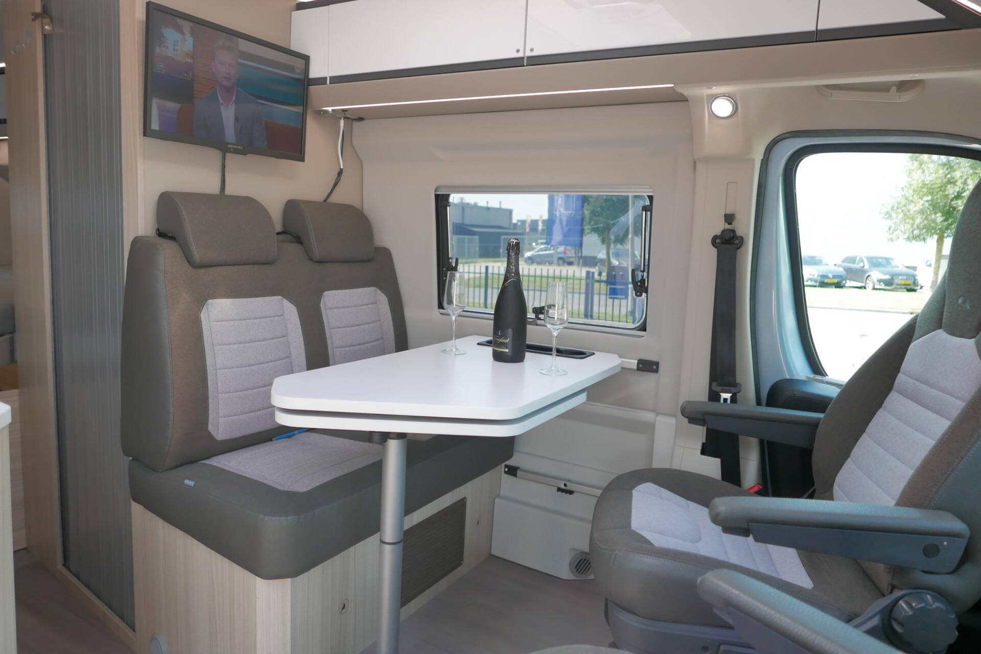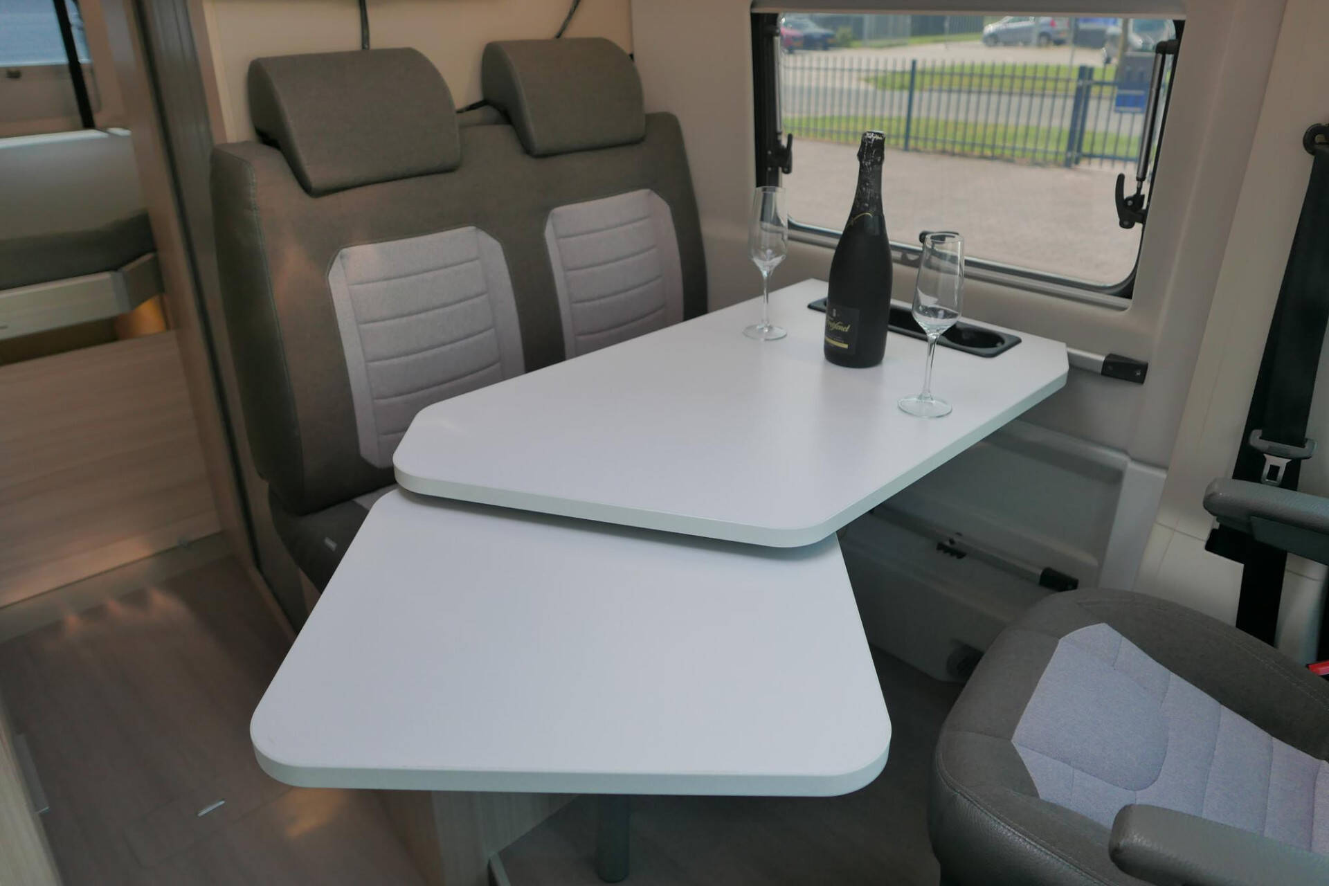 Door de voorstoelen te draaien ontstaat een ruime zithoek. Het mooie lichte meubeldecor in combinatie met de stoffen bekleding geven het interieur moderne uitstraling. De tafel is makkelijk uit te klappen voor een grotere tafel of helemaal weg te klappen voor meer ruimte. Natuurlijk zijn alle ramen en de toegangsdeur voorzien van plisséverduistering en horren.
