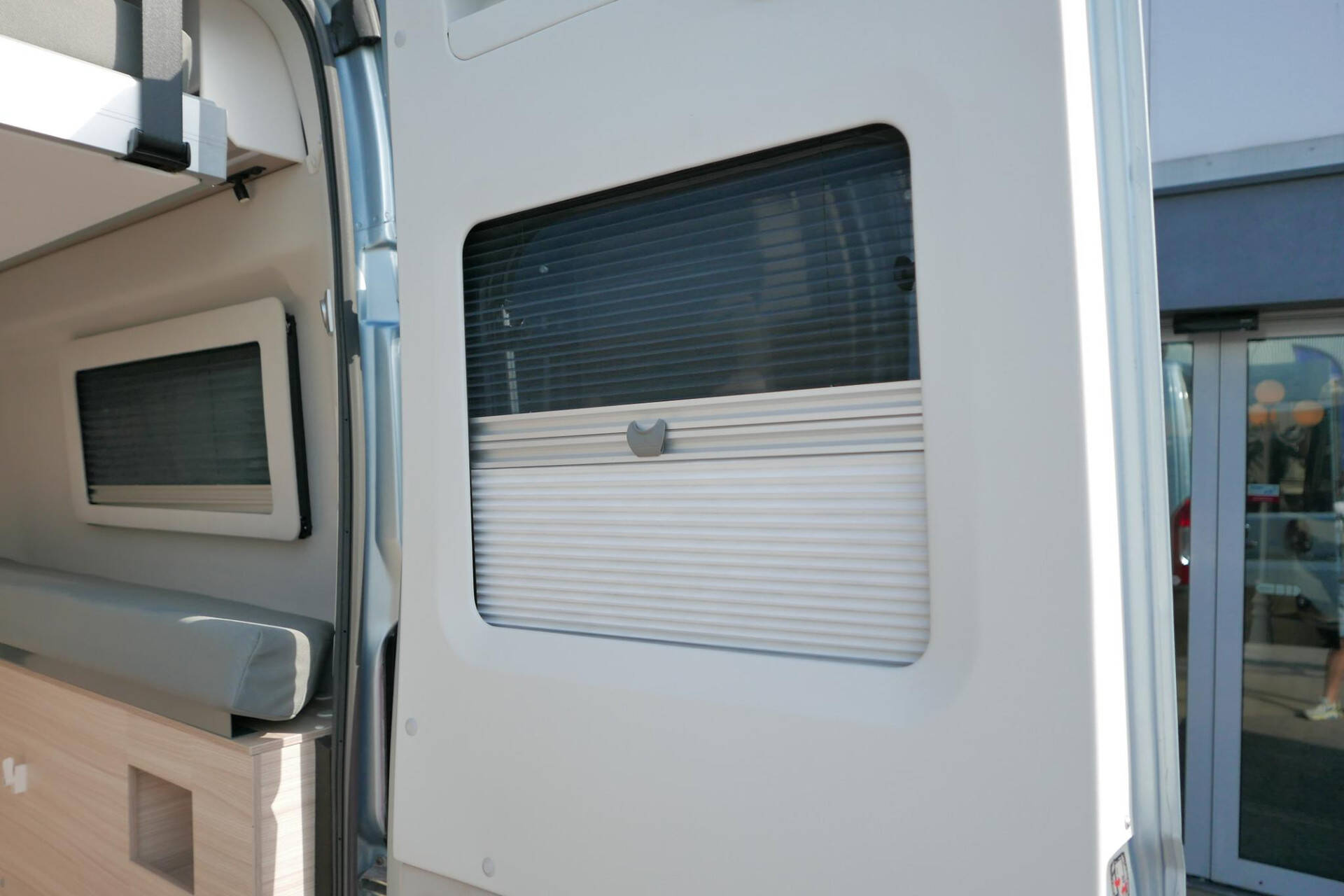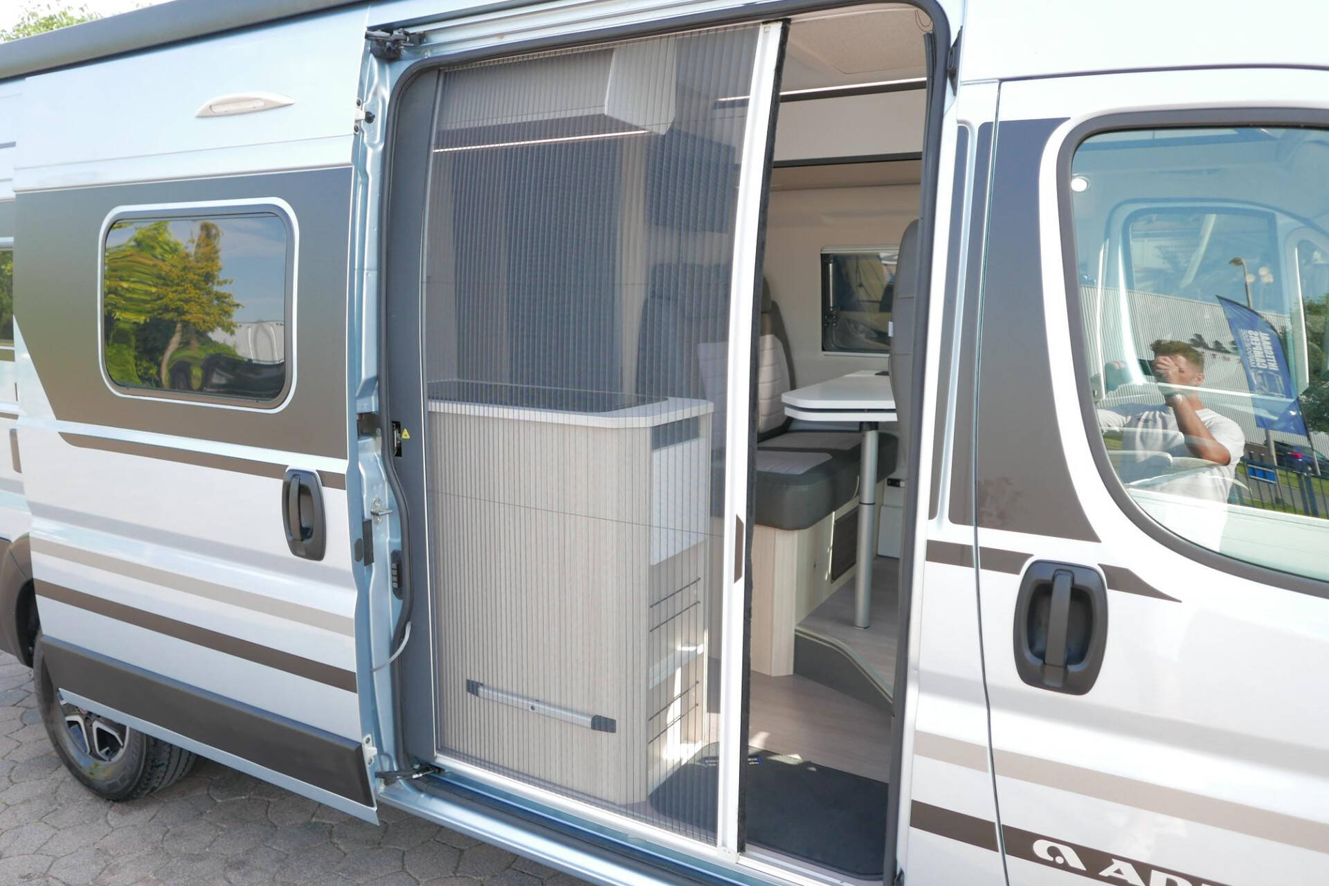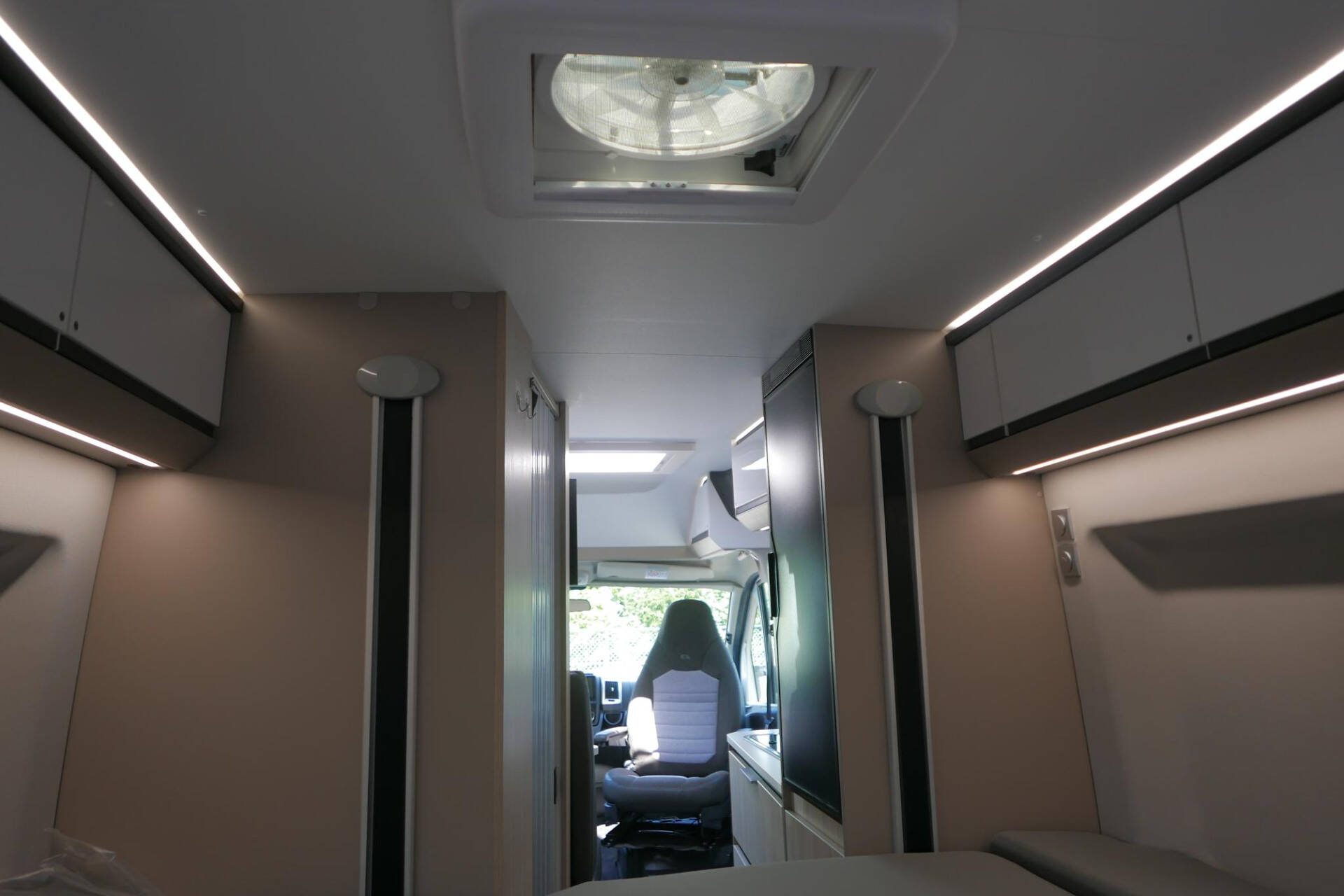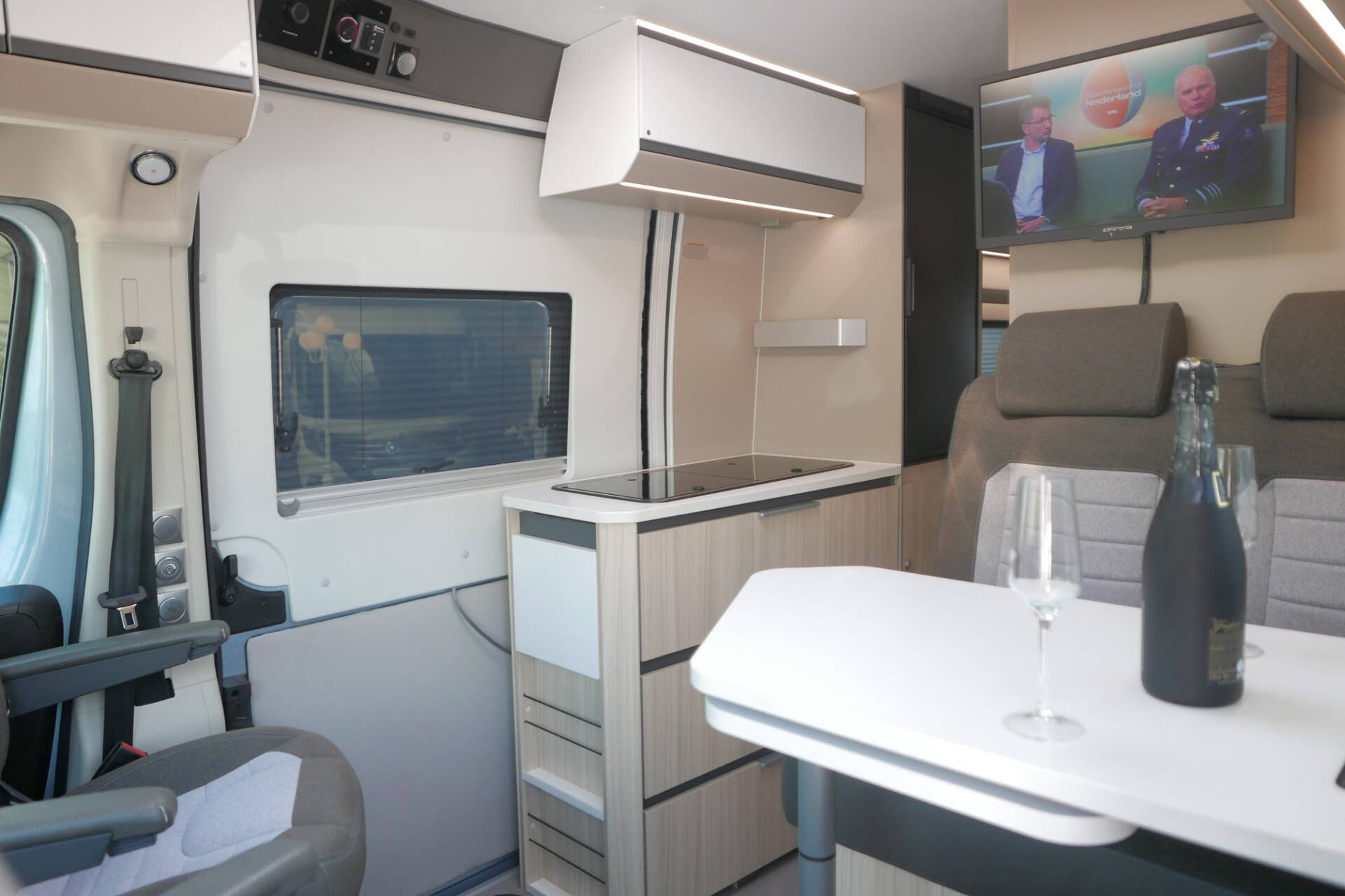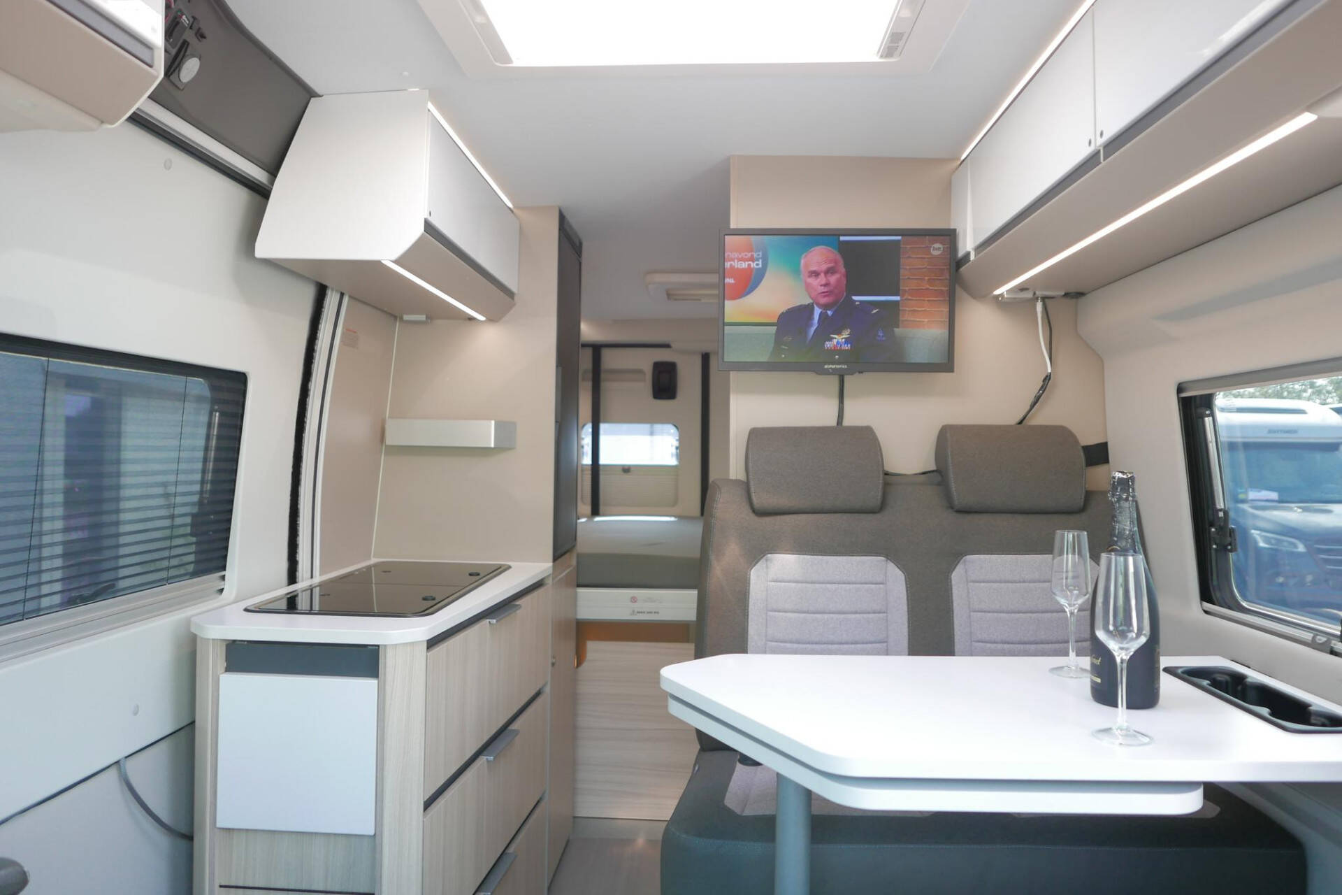 Door de voorstoelen te draaien ontstaat een ruime zithoek. Het mooie lichte meubeldecor in combinatie met de stoffen bekleding geven het interieur moderne uitstraling. De tafel is makkelijk uit te klappen voor een grotere tafel of helemaal weg te klappen voor meer ruimte. Natuurlijk zijn alle ramen en de toegangsdeur voorzien van plisséverduistering en horren.
