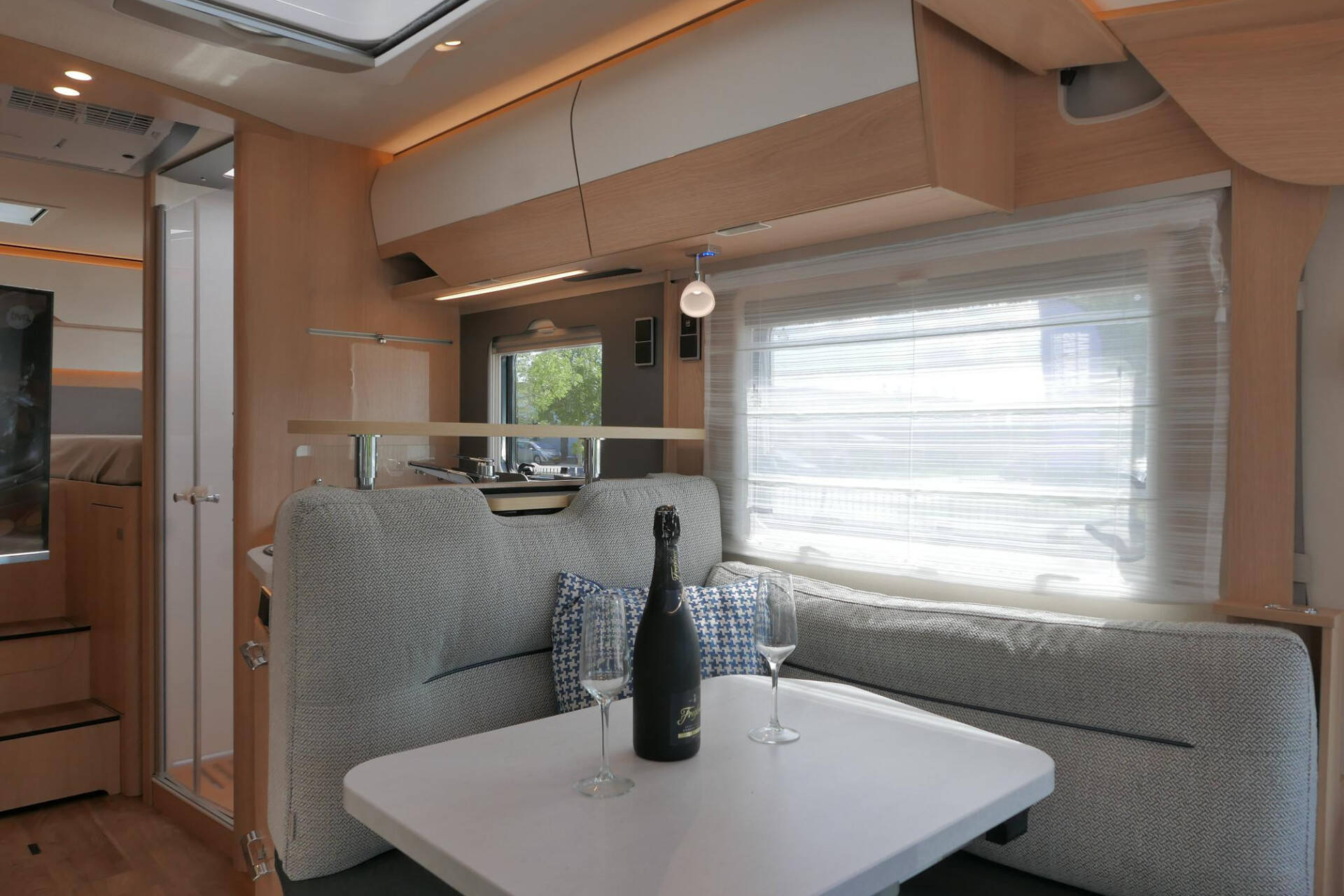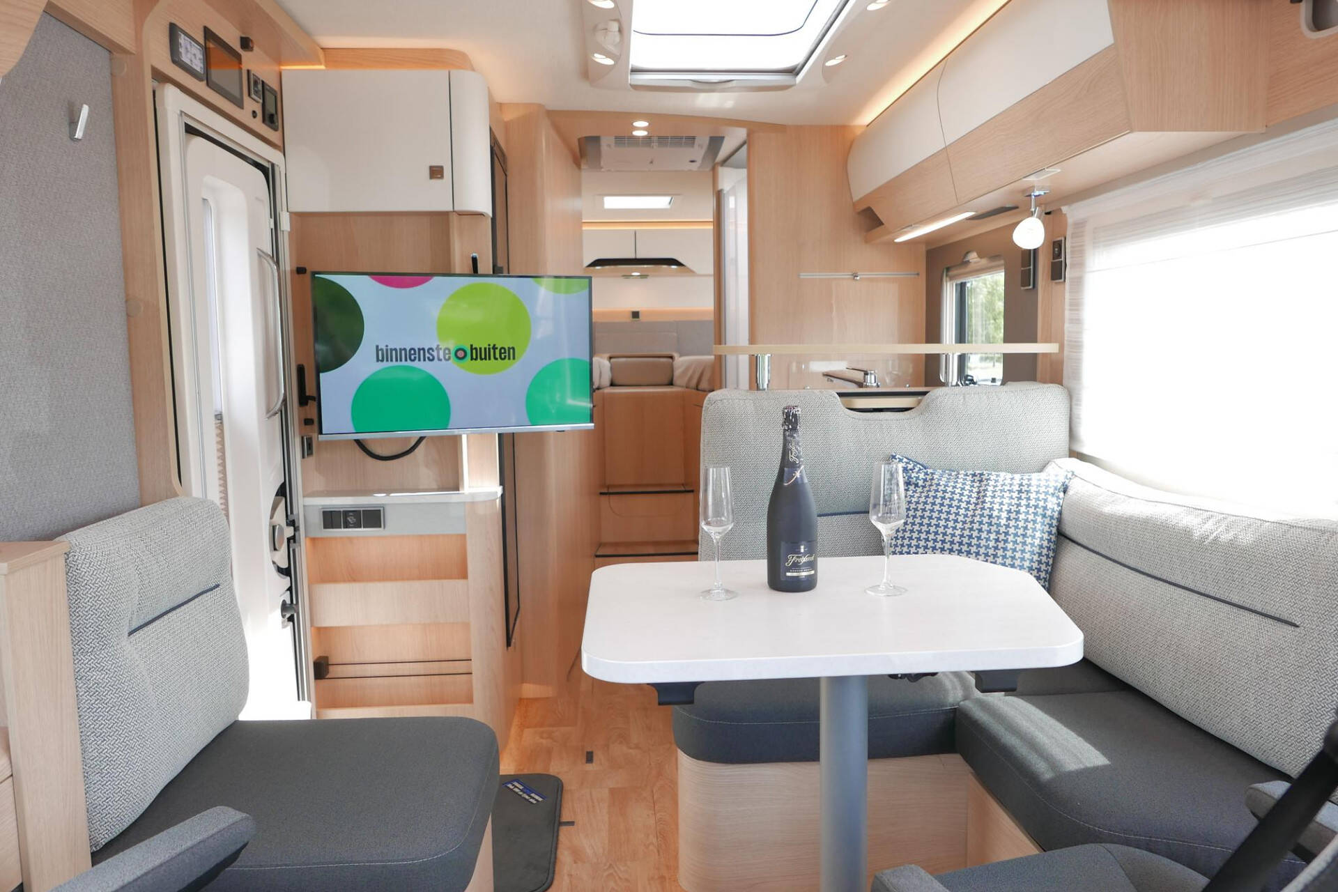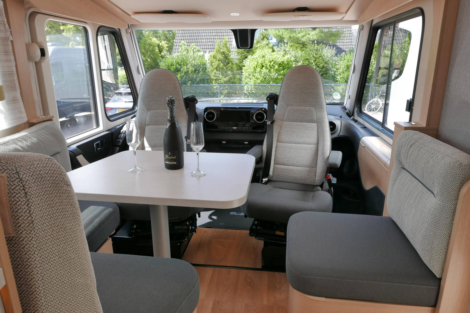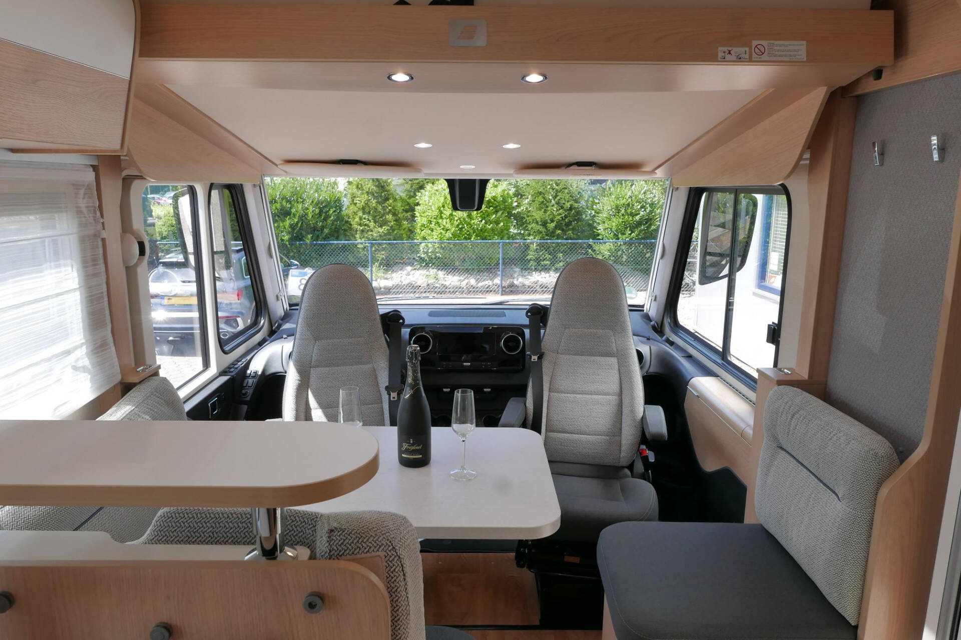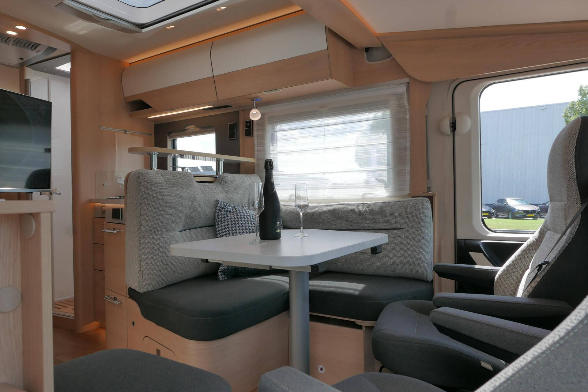 Door de voorstoelen te draaien ontstaat een ruime zithoek met L-zit met een draaibare én in de lengte en breedte verschuifbare tafel. Het Grand Oak meubeldecor in combinatie met stof Kitami bekleding geven de zithoek een moderne uitstraling. Door het AL-KO chassis beschikt deze camper over een volledig vlakke vloer. In de mee verwarmde dubbele bodem bevindt zich, naast de schoon- en vuilwatertank, extra opbergruimte die doormiddel van de luiken in de vloer én van buitenaf te bereiken is. Uiteraard zijn alle ramen en de toegangsdeur voorzien van horren en plisséverduistering.