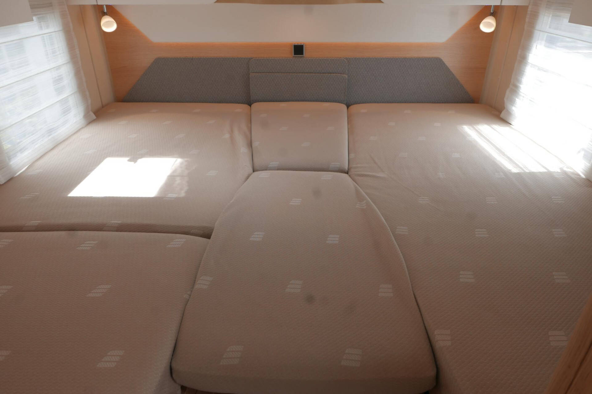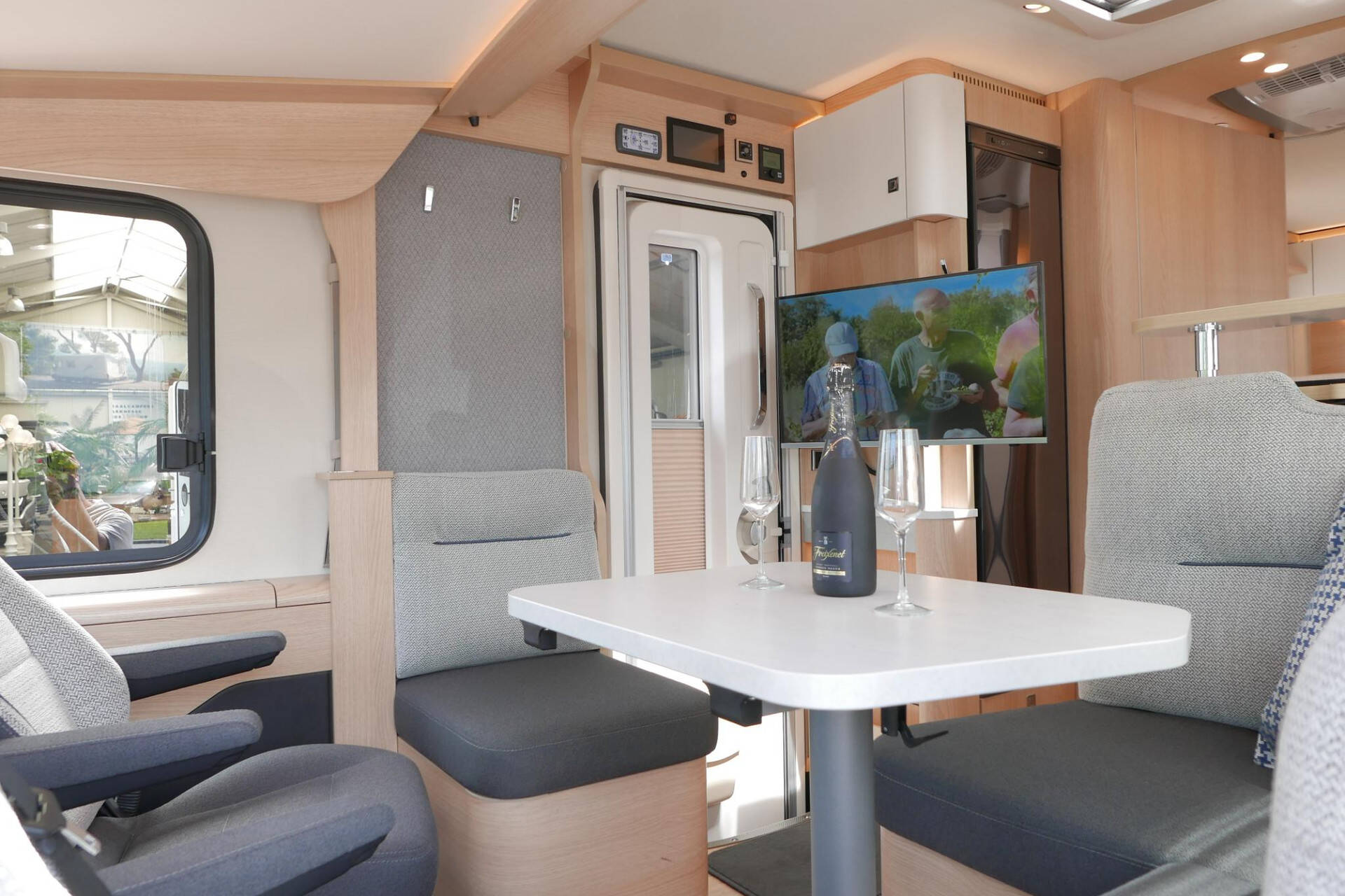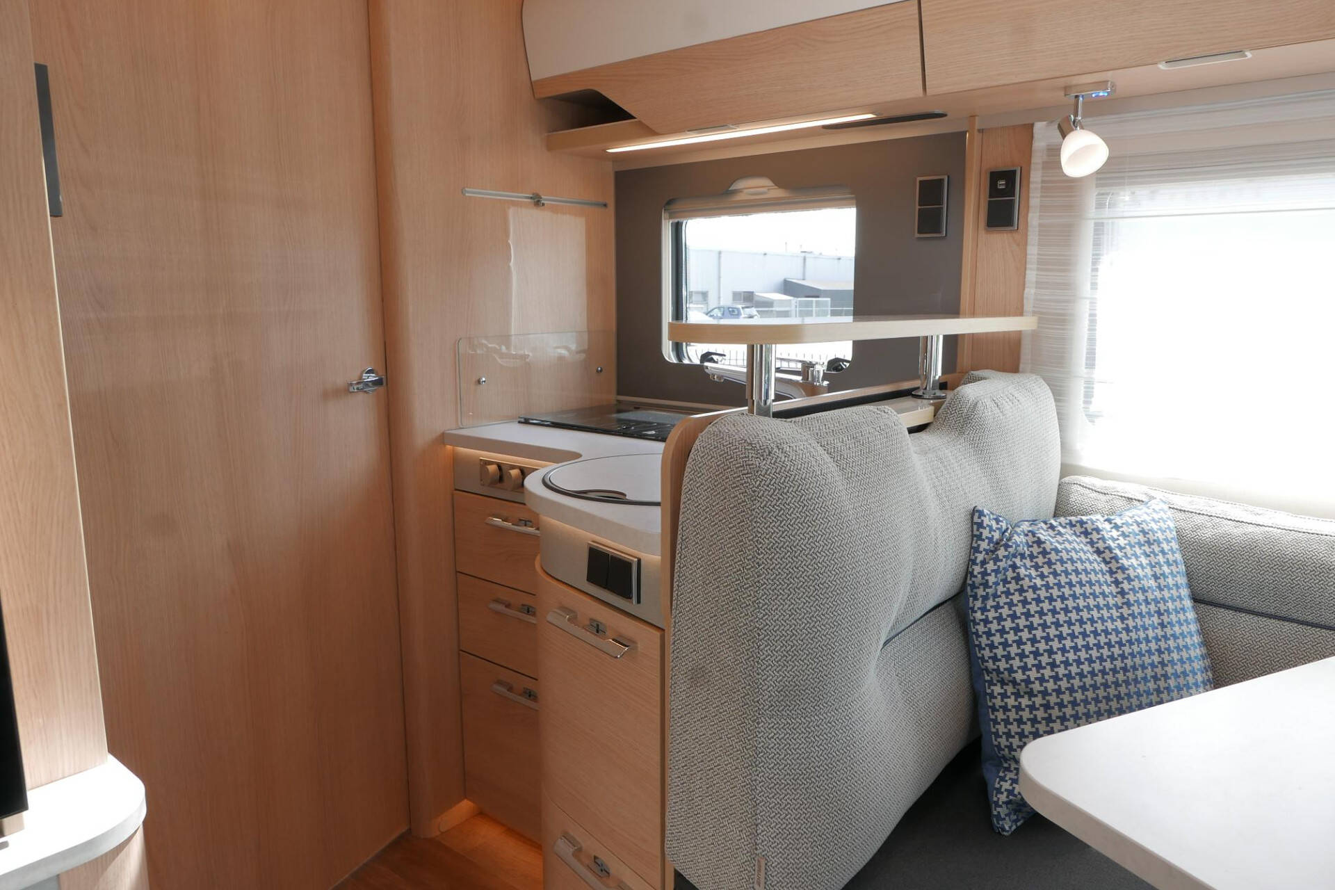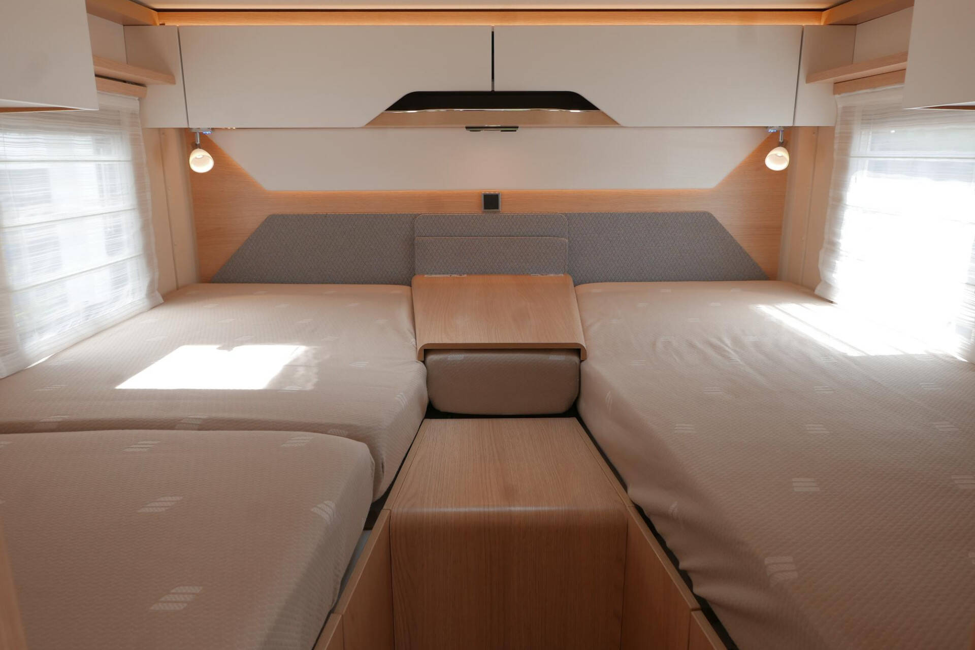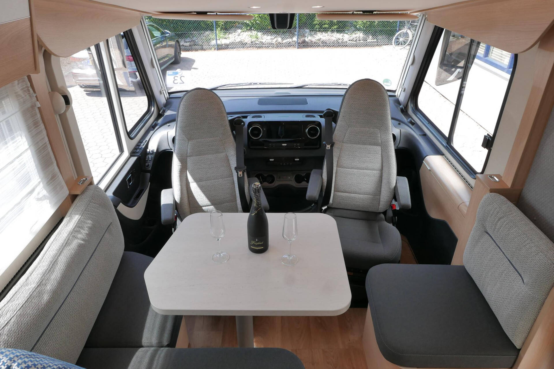 Door de voorstoelen te draaien ontstaat een ruime zithoek met L-zit met een draaibare én in de lengte en breedte verschuifbare tafel. Het Grand Oak meubeldecor in combinatie met stof Kitami bekleding geven de zithoek een moderne uitstraling. Door het AL-KO chassis beschikt deze camper over een volledig vlakke vloer. In de mee verwarmde dubbele bodem bevindt zich, naast de schoon- en vuilwatertank, extra opbergruimte die doormiddel van de luiken in de vloer én van buitenaf te bereiken is. Uiteraard zijn alle ramen en de toegangsdeur voorzien van horren en plisséverduistering.