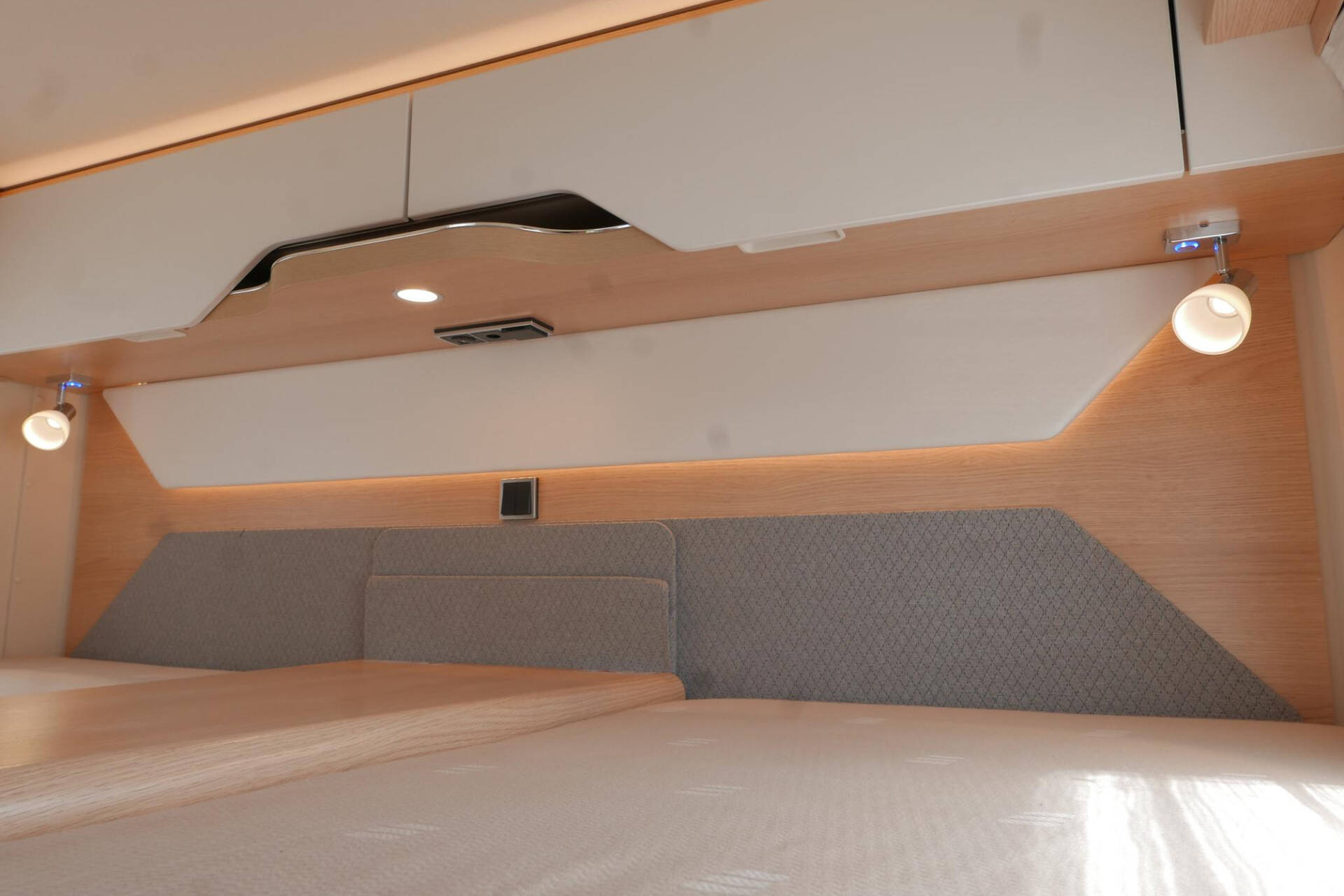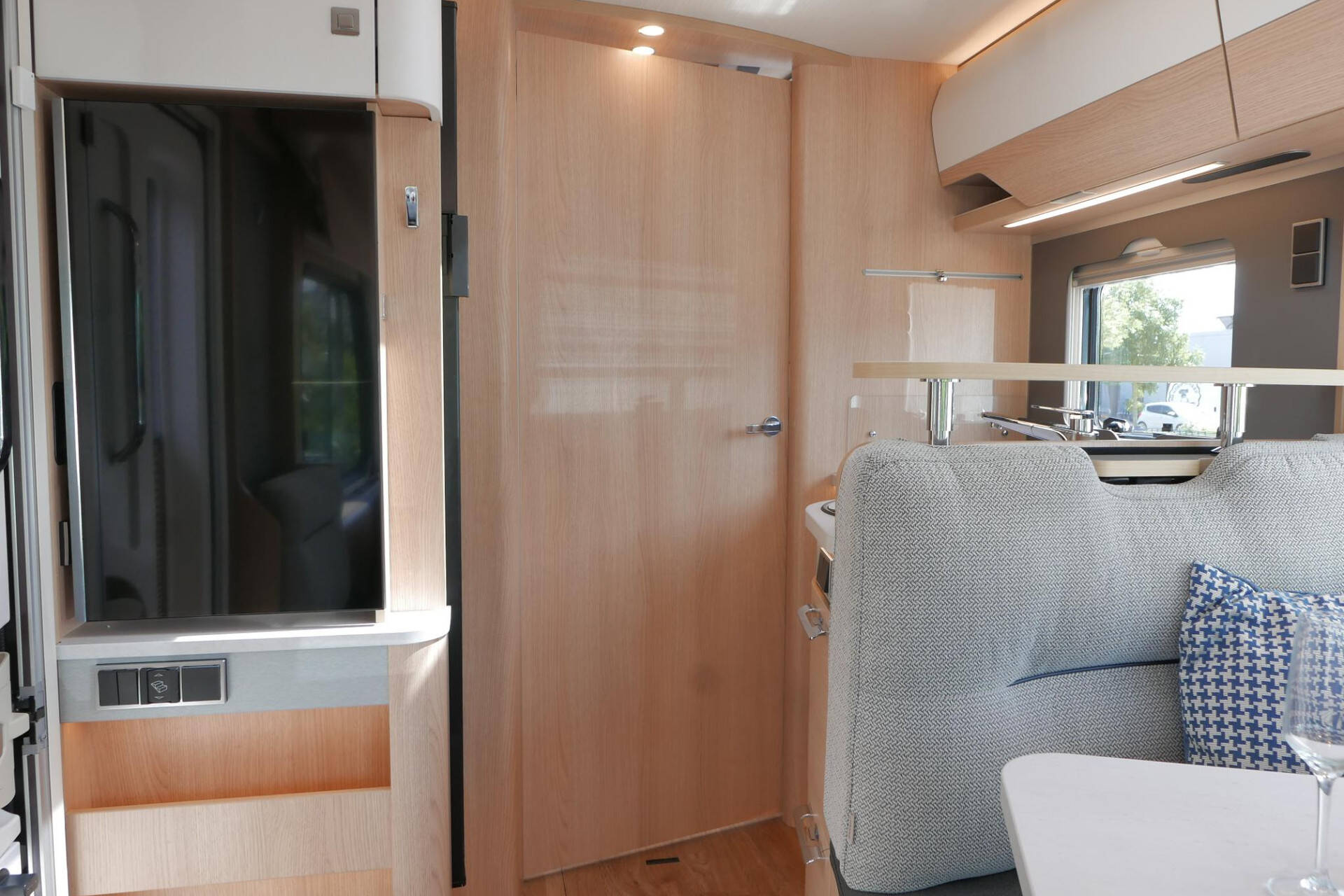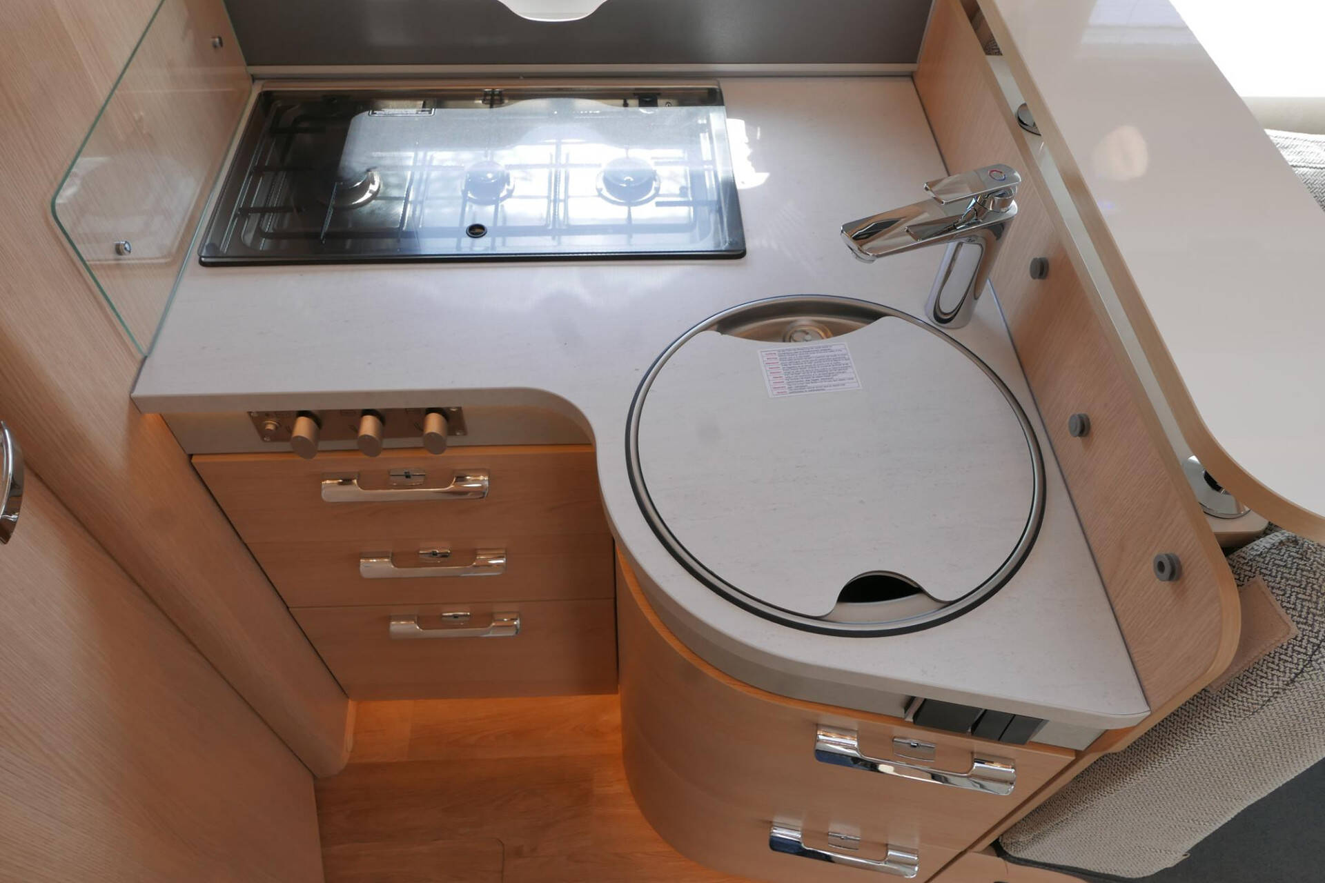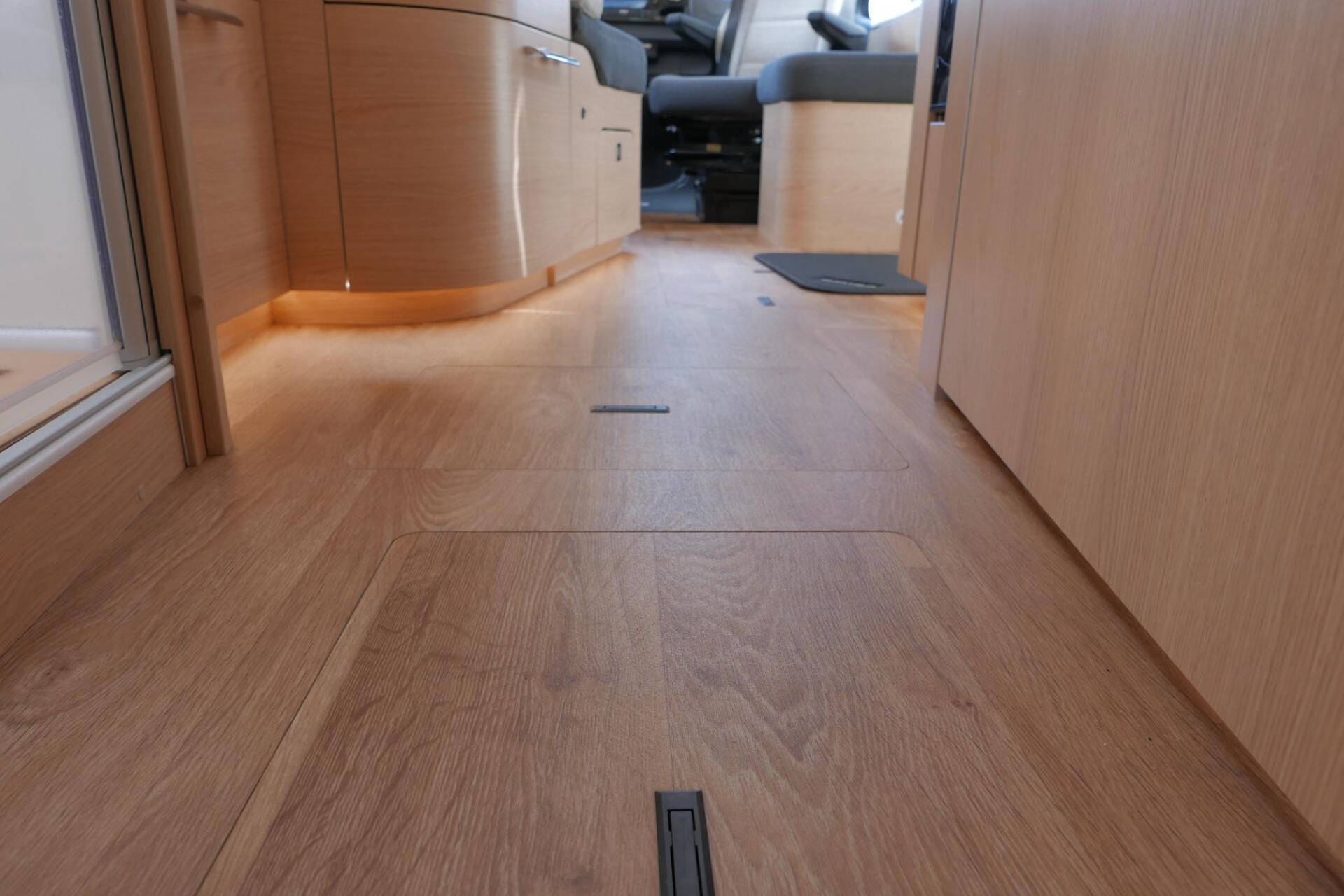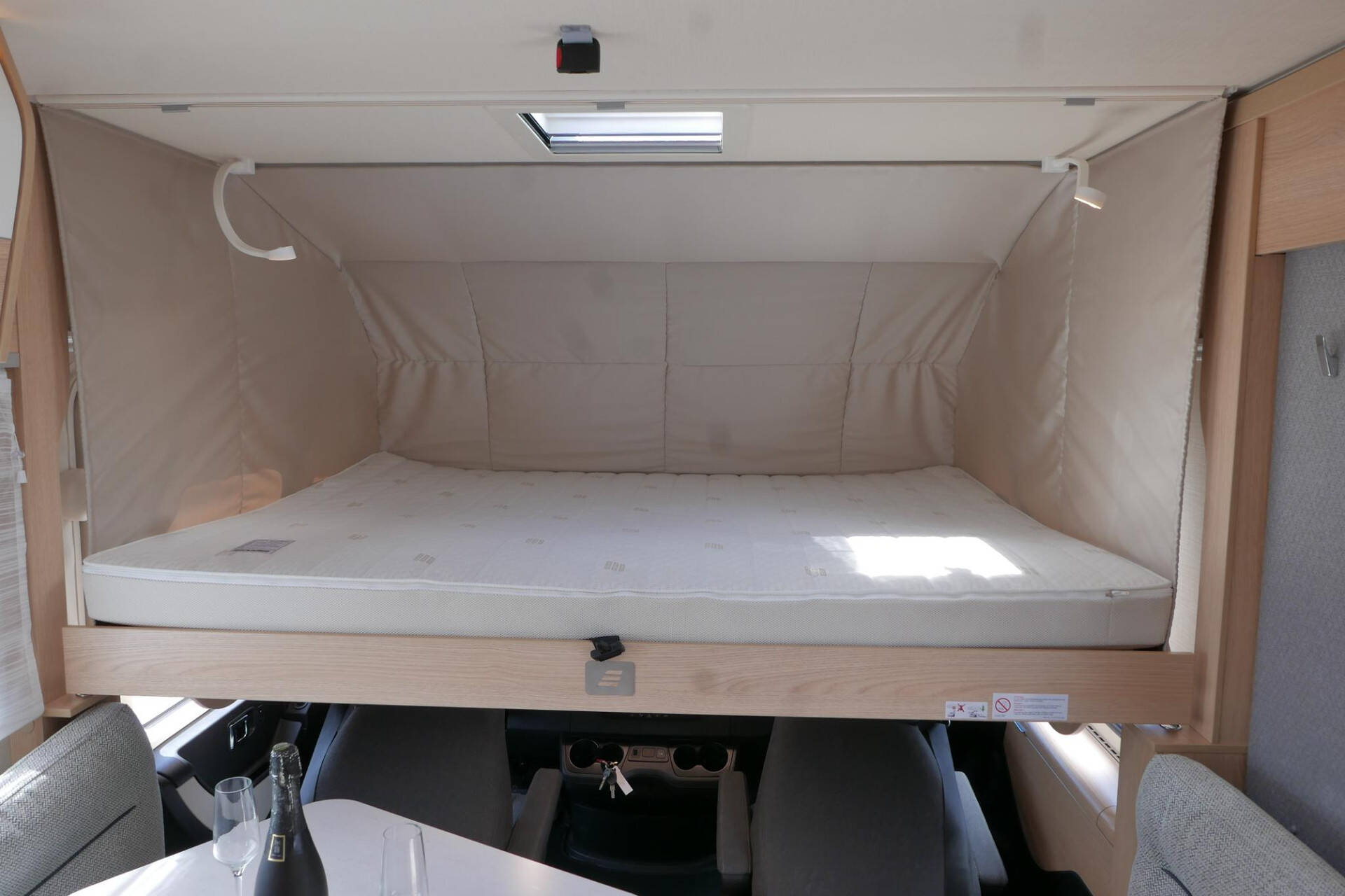 Door de voorstoelen te draaien ontstaat een ruime zithoek met L-zit met een draaibare én in de lengte en breedte verschuifbare tafel. Het Grand Oak meubeldecor in combinatie met stof Kitami bekleding geven de zithoek een moderne uitstraling. Door het AL-KO chassis beschikt deze camper over een volledig vlakke vloer. In de mee verwarmde dubbele bodem bevindt zich, naast de schoon- en vuilwatertank, extra opbergruimte die doormiddel van de luiken in de vloer én van buitenaf te bereiken is. Uiteraard zijn alle ramen en de toegangsdeur voorzien van horren en plisséverduistering.