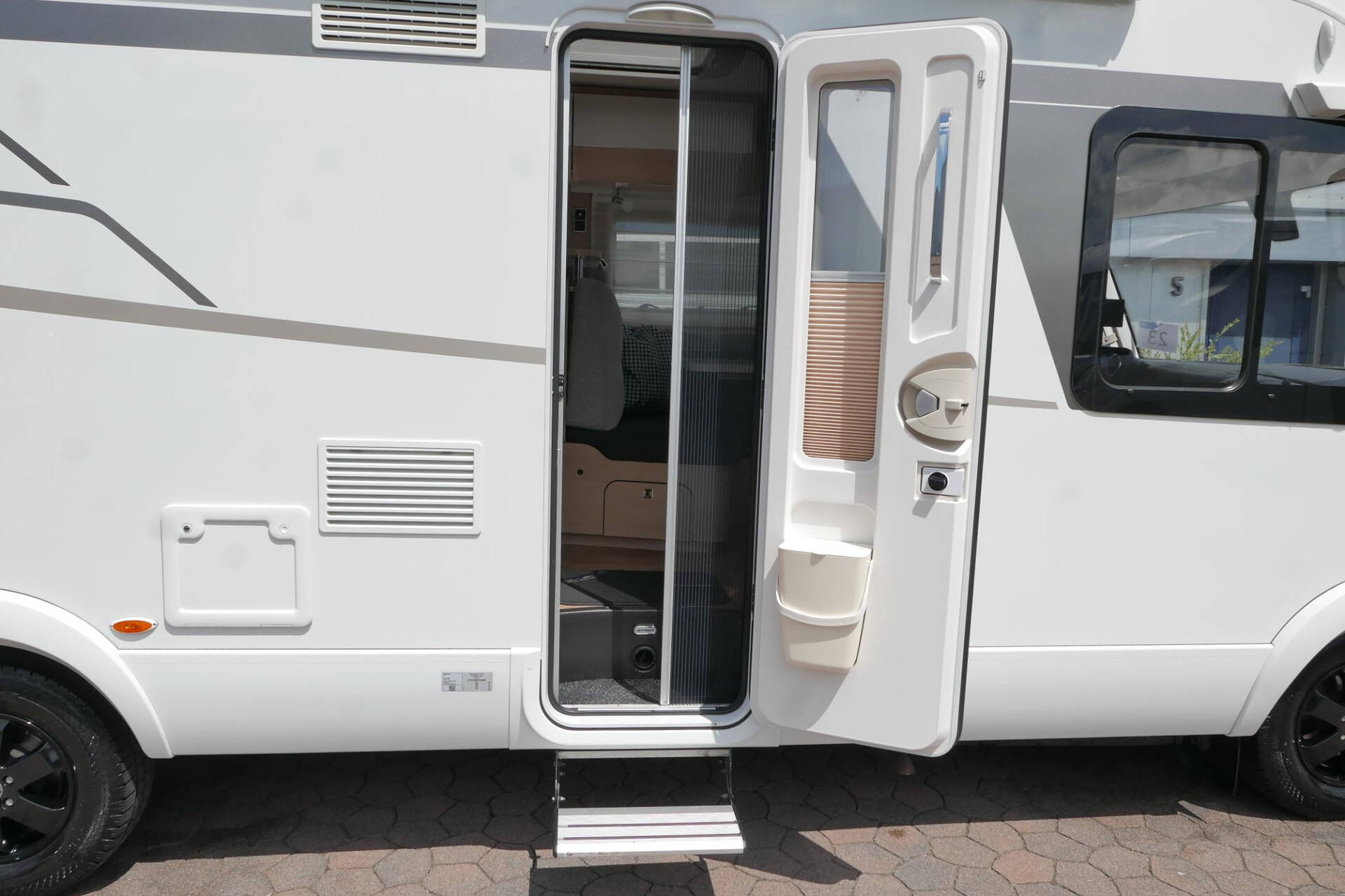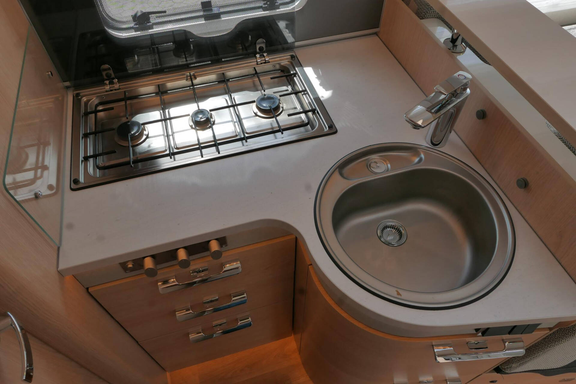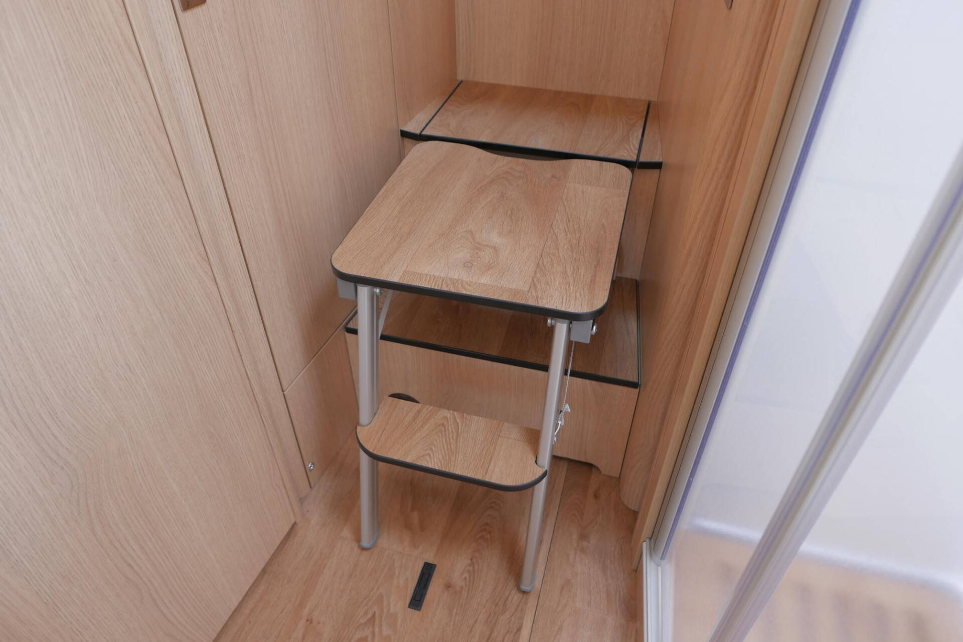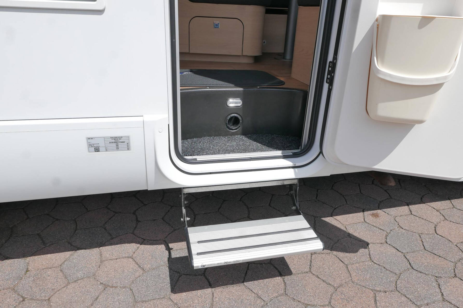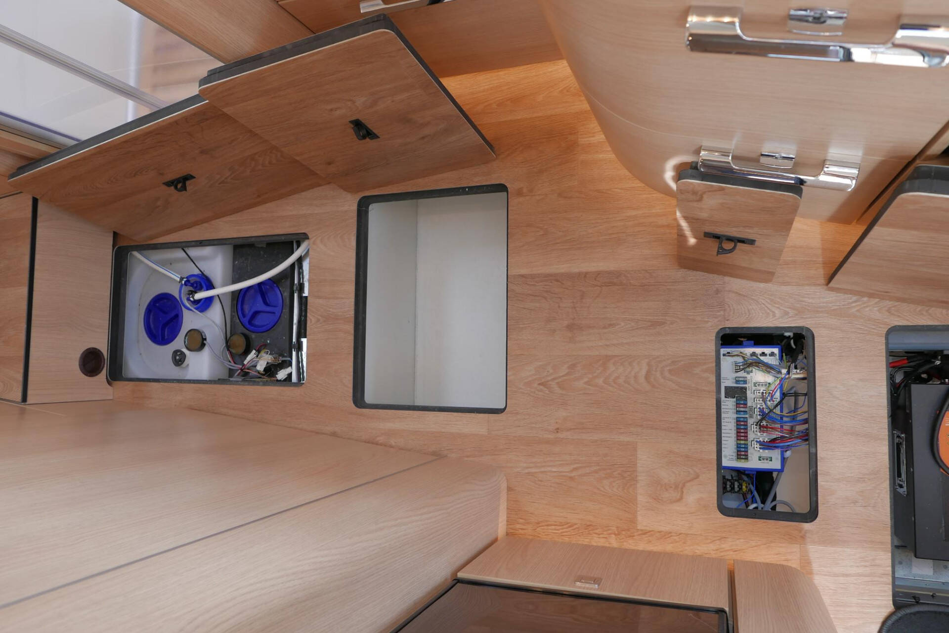 Door de voorstoelen te draaien ontstaat een ruime zithoek met L-zit met een draaibare én in de lengte en breedte verschuifbare tafel. Het Grand Oak meubeldecor in combinatie met stof Kitami bekleding geven de zithoek een moderne uitstraling. Door het AL-KO chassis beschikt deze camper over een volledig vlakke vloer. In de mee verwarmde dubbele bodem bevindt zich, naast de schoon- en vuilwatertank, extra opbergruimte die doormiddel van de luiken in de vloer én van buitenaf te bereiken is. Uiteraard zijn alle ramen en de toegangsdeur voorzien van horren en plisséverduistering.