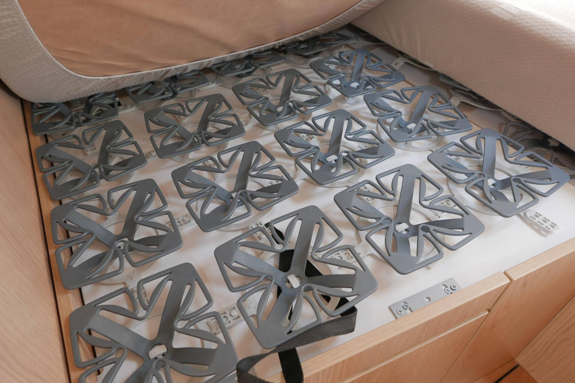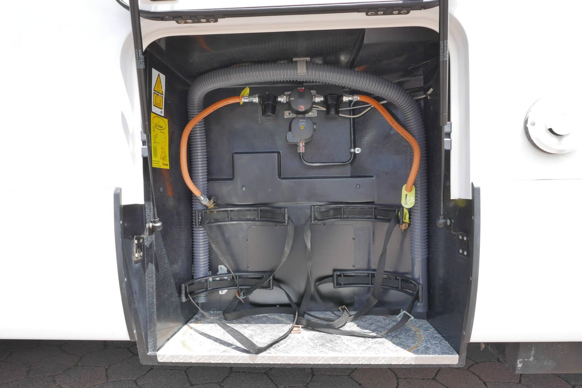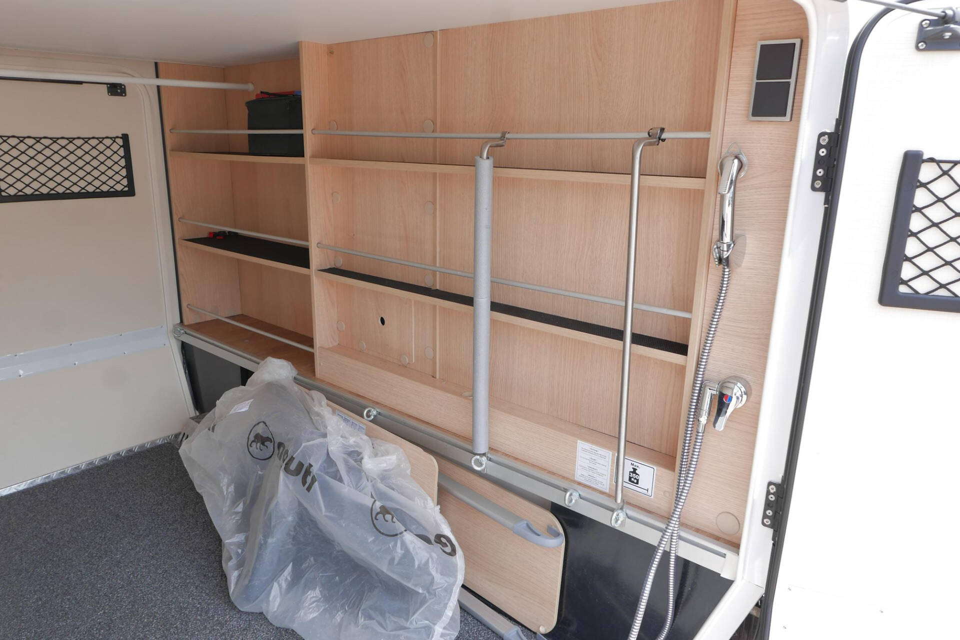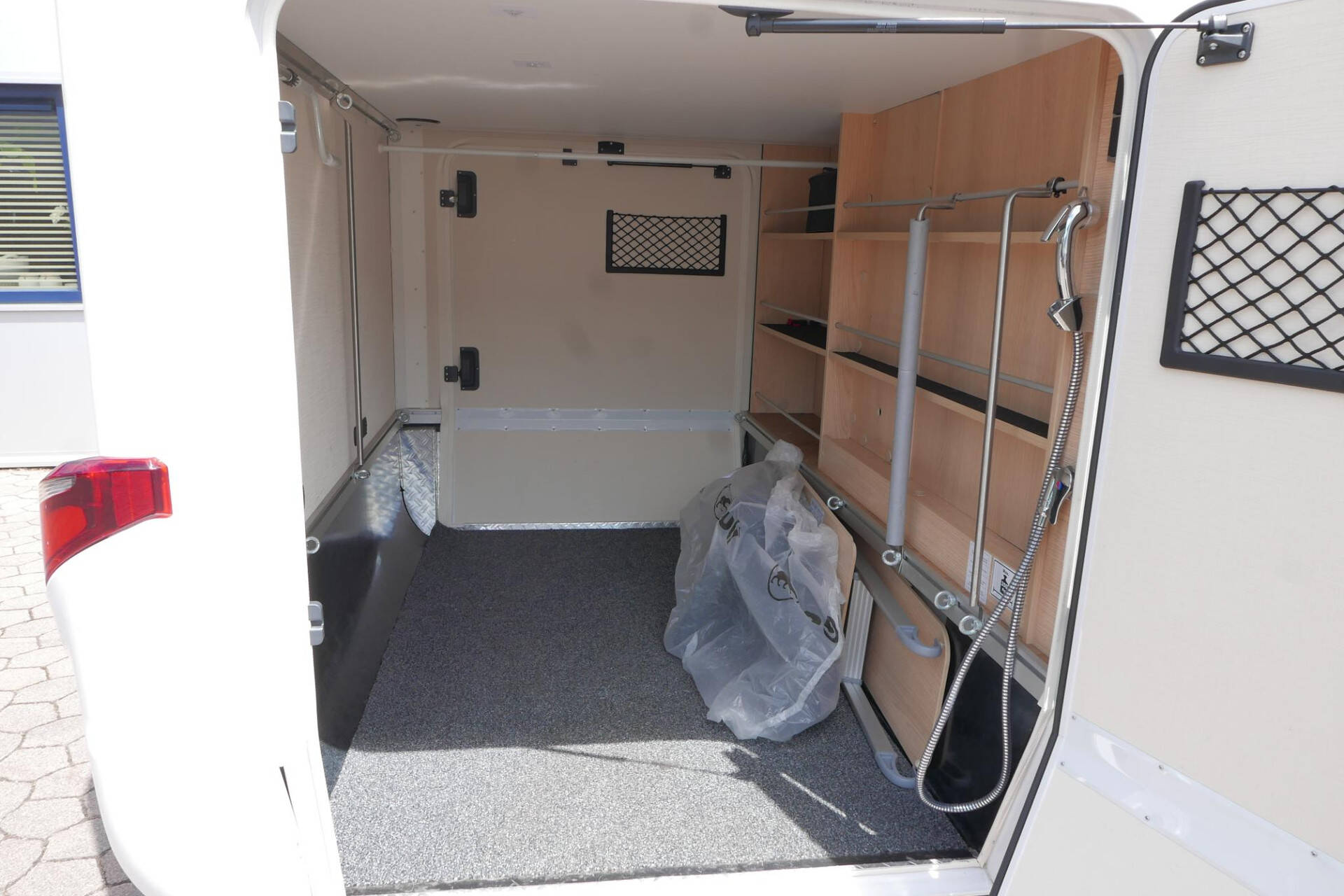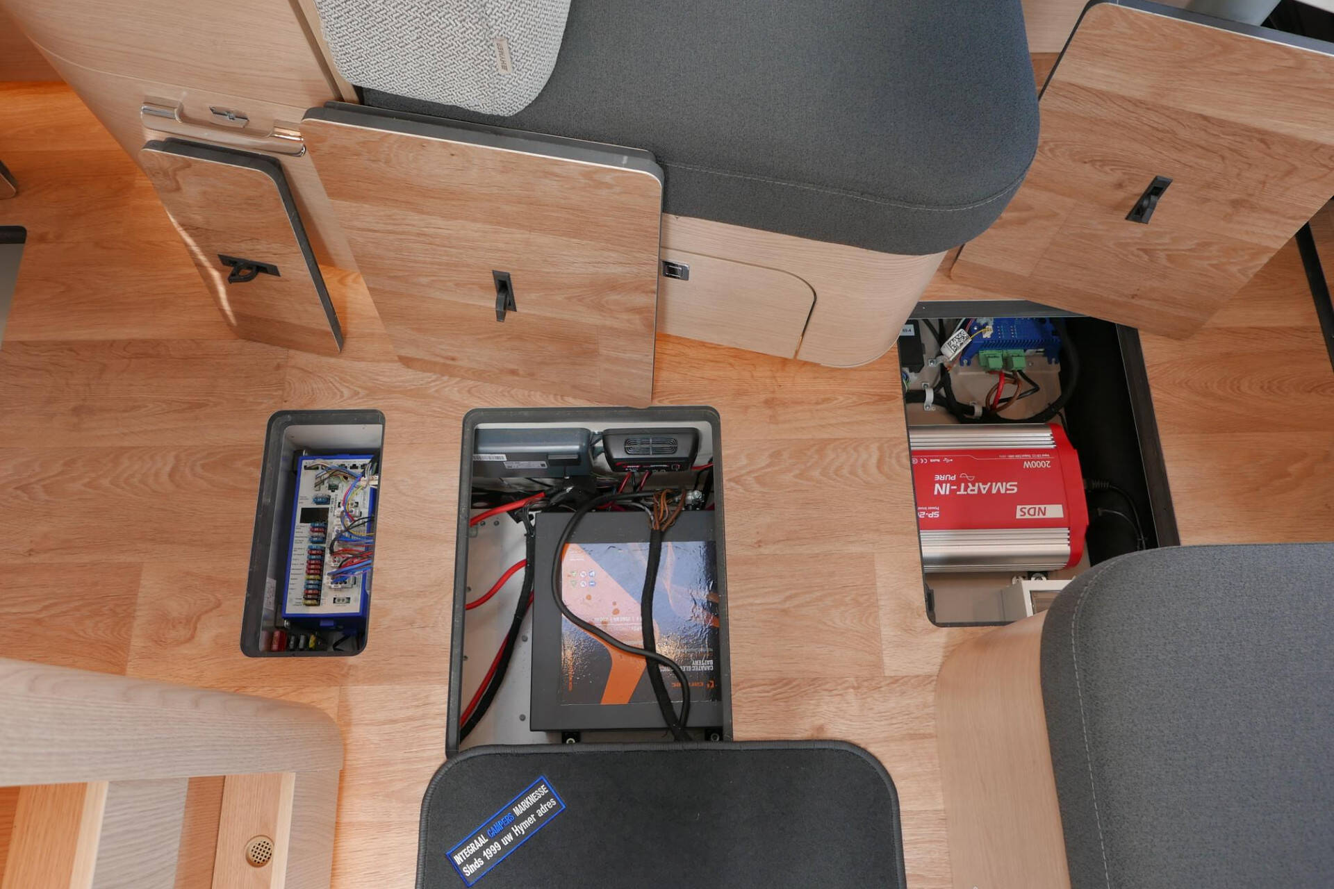 Door de voorstoelen te draaien ontstaat een ruime zithoek met L-zit met een draaibare én in de lengte en breedte verschuifbare tafel. Het Grand Oak meubeldecor in combinatie met stof Kitami bekleding geven de zithoek een moderne uitstraling. Door het AL-KO chassis beschikt deze camper over een volledig vlakke vloer. In de mee verwarmde dubbele bodem bevindt zich, naast de schoon- en vuilwatertank, extra opbergruimte die doormiddel van de luiken in de vloer én van buitenaf te bereiken is. Uiteraard zijn alle ramen en de toegangsdeur voorzien van horren en plisséverduistering.
