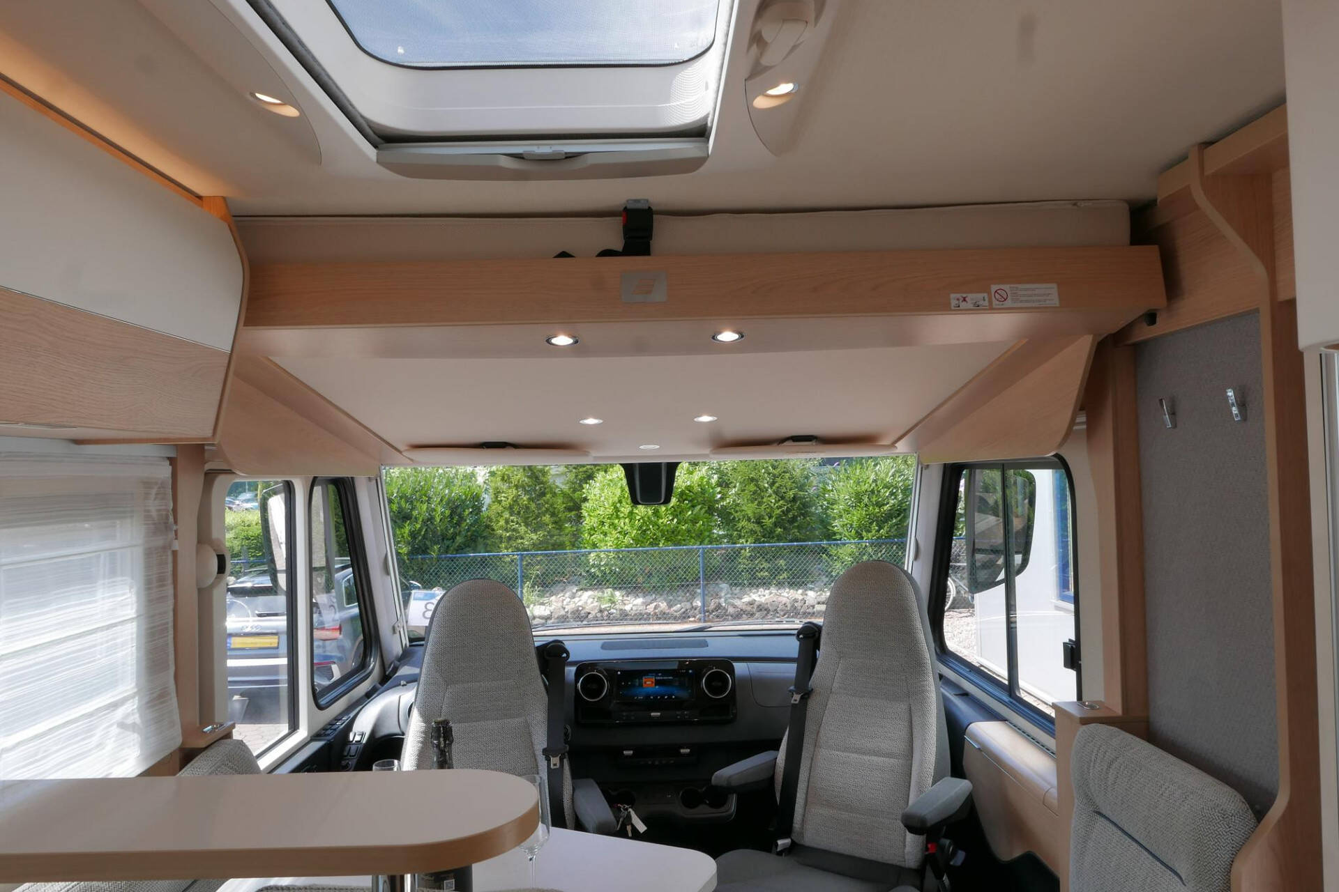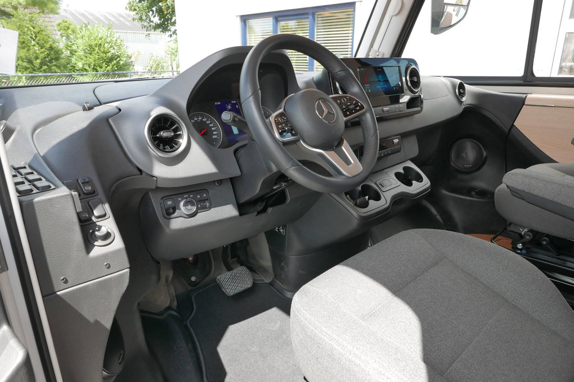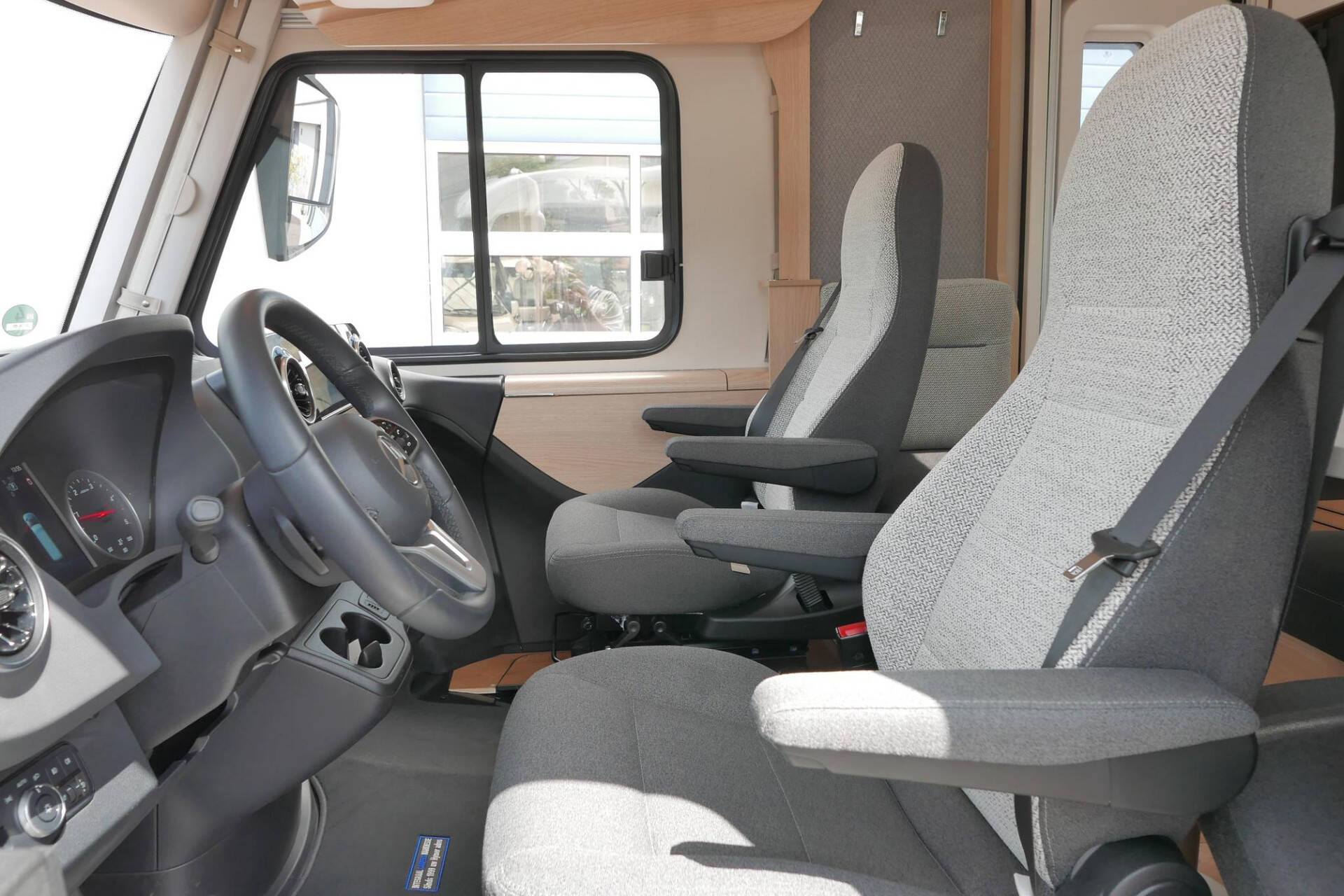 In de cabine van deze integraal camper valt meteen het geweldige panorama uitzicht op. Niet alleen om volop te genieten van de omgeving om u heen, maar ook voor een goed overzicht op het verkeer tijdens het rijden. De cockpit is voorzien van het luxe Mercedes-Benz MBUX multimediasysteem met 10,25 inch scherm voor onder andere navigatie, achteruitrijcamera en media. De 2 comfortabele Aguti ergoflex stoelen zijn volledig verstelbaar en draaibaar. Verder beschikt deze Hymer over: