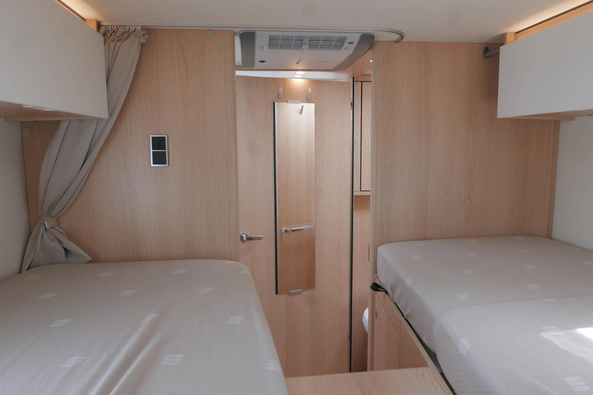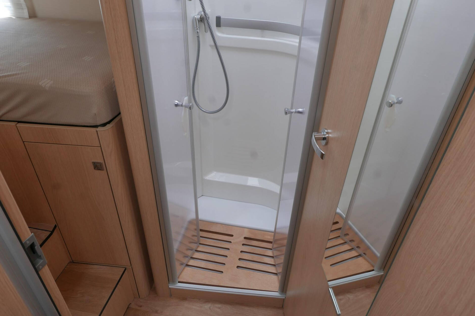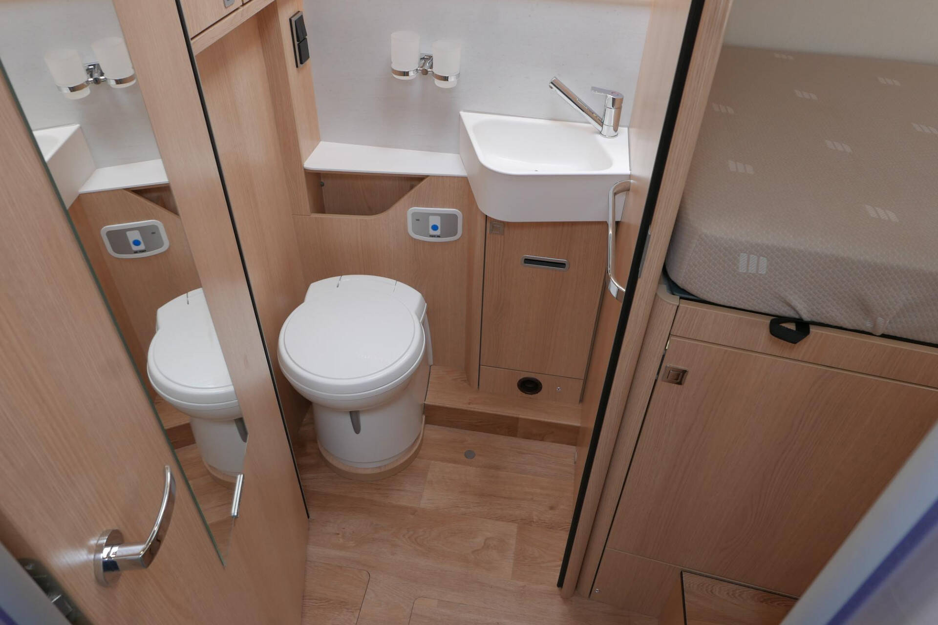 Achterin bevinden zich de aparte douche en toilet en de enkele lengte bedden. Doormiddel van de tussendeur is deze ruimte af te sluiten van het woongedeelte voor extra privacy. De ruime toiletruimte is voorzien van toilet en wasbak, grote spiegel en kastjes. Hier tegenover vindt u de douchecabine.