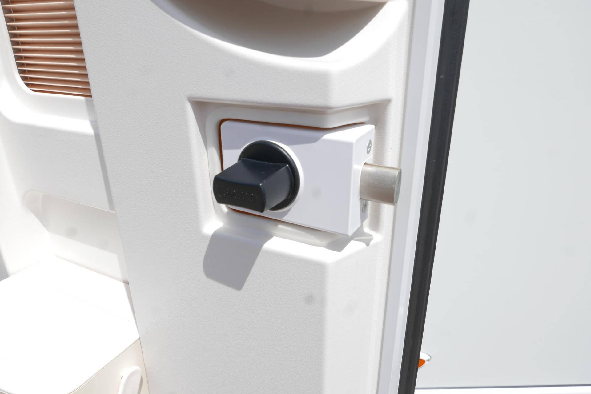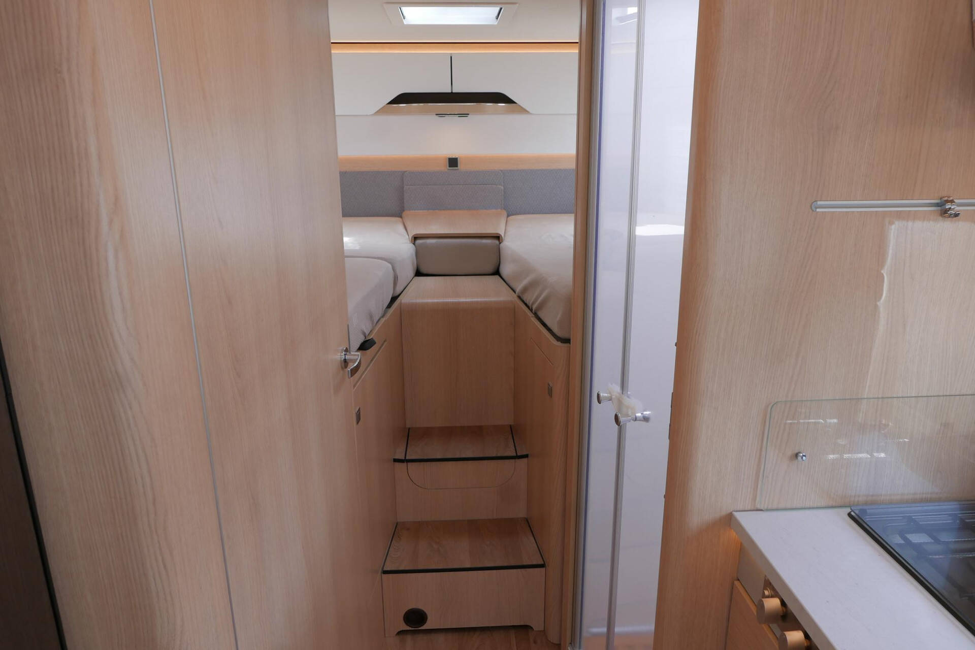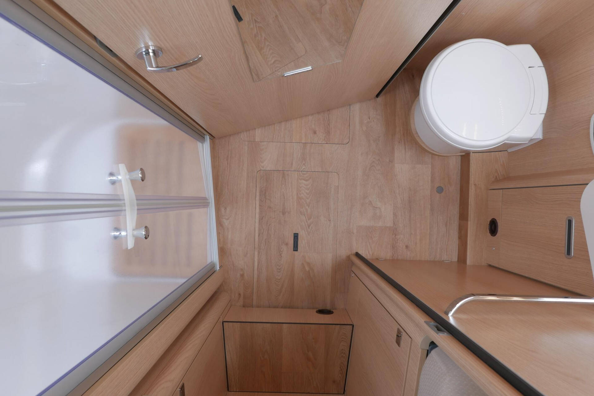 Achterin bevinden zich de aparte douche en toilet en de enkele lengte bedden. Doormiddel van de tussendeur is deze ruimte af te sluiten van het woongedeelte voor extra privacy. De ruime toiletruimte is voorzien van toilet en wasbak, grote spiegel en kastjes. Hier tegenover vindt u de douchecabine.