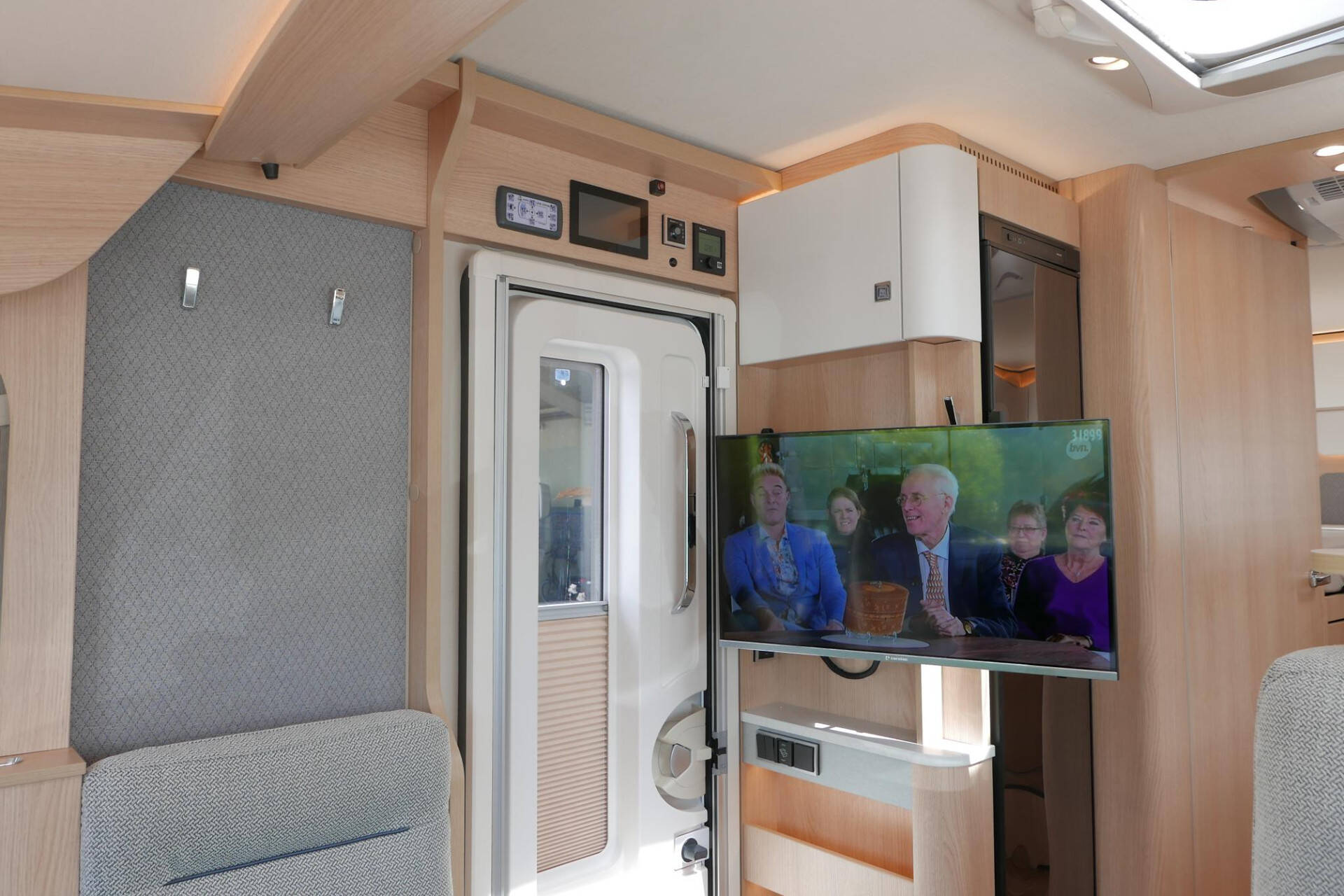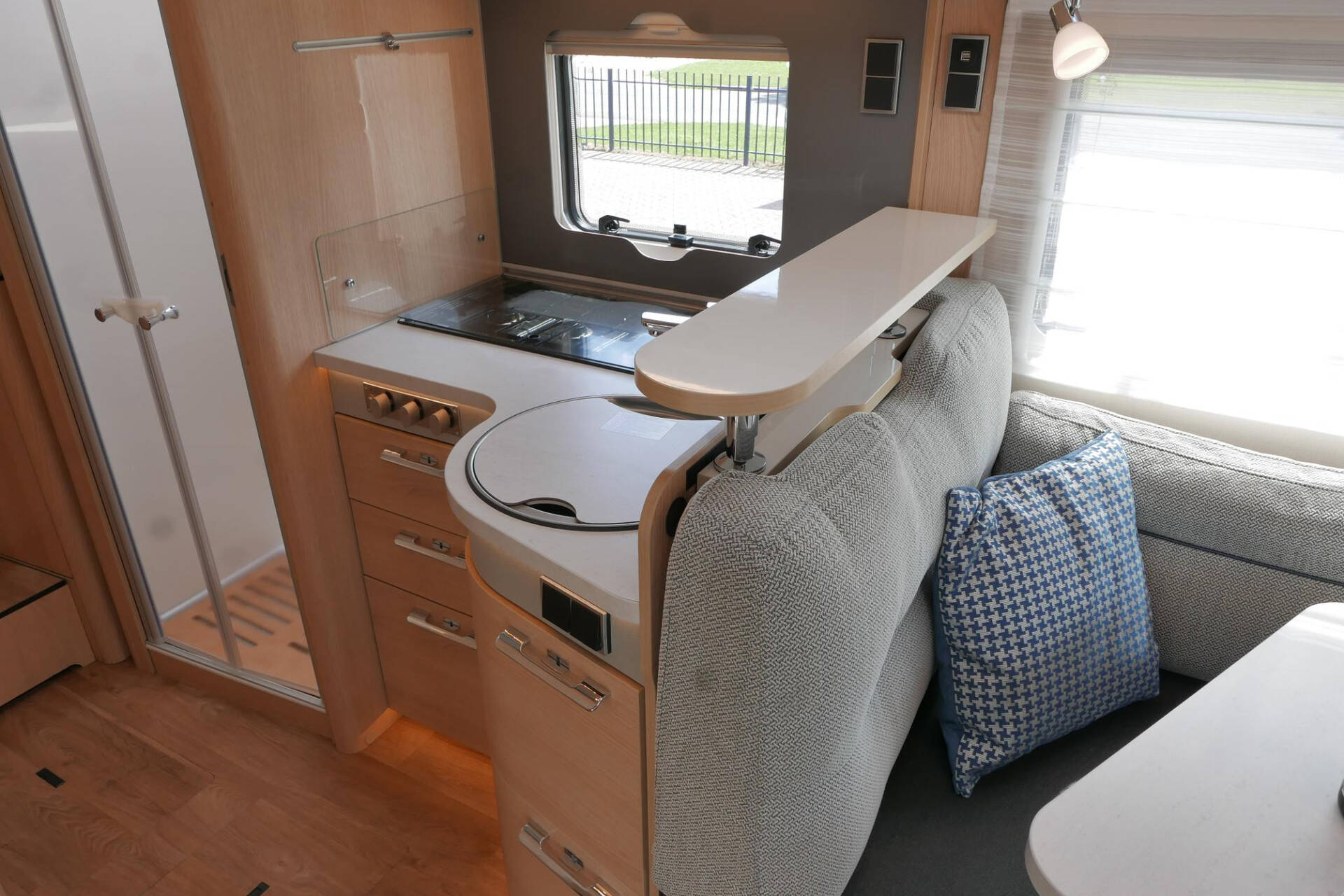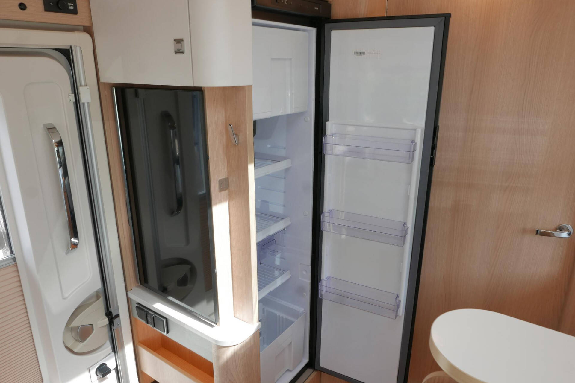 De ruime hoekkeuken is voorzien van diverse gelagerde boodschappenladen en een 3 pits gasstel. Hier tegenover vindt u de hoge Smart-Tower koelkast 142 l met apart vriesvak en automatische omschakeling 230V/12V/gas.