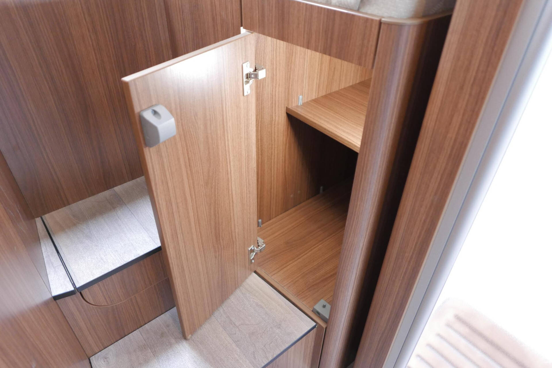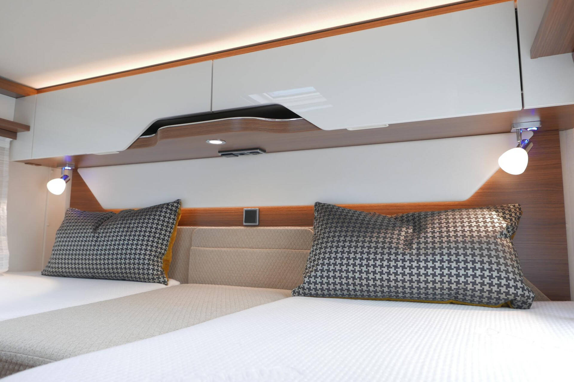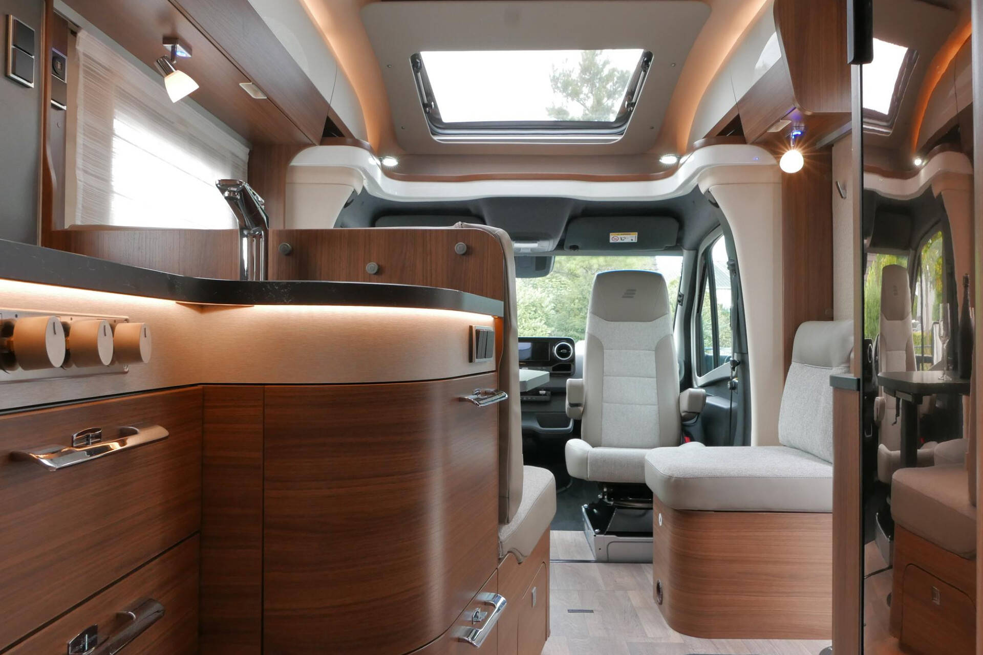 Door de voorstoelen te draaien ontstaat een ruime en gezellige zithoek met L-zit. Het Grand Oak meubeldecor in combinatie met de lederen Dalana bekleding geven de woonruimte een moderne uitstraling. Door het AL-KO maxi chassis beschikt deze camper over een volledig vlakke vloer met in de mee verwarmde dubbele bodem extra opbergruimte die ook vanaf de buitenkant te bereiken is. De 180 liter schoon- en 150 liter vuilwatertank zijn tevens in de dubbele bodem gesitueerd. Uiteraard zijn alle ramen en deuren voorzien van horren en plisséverduistering.