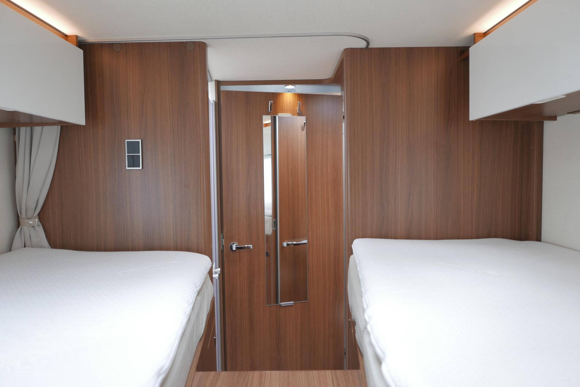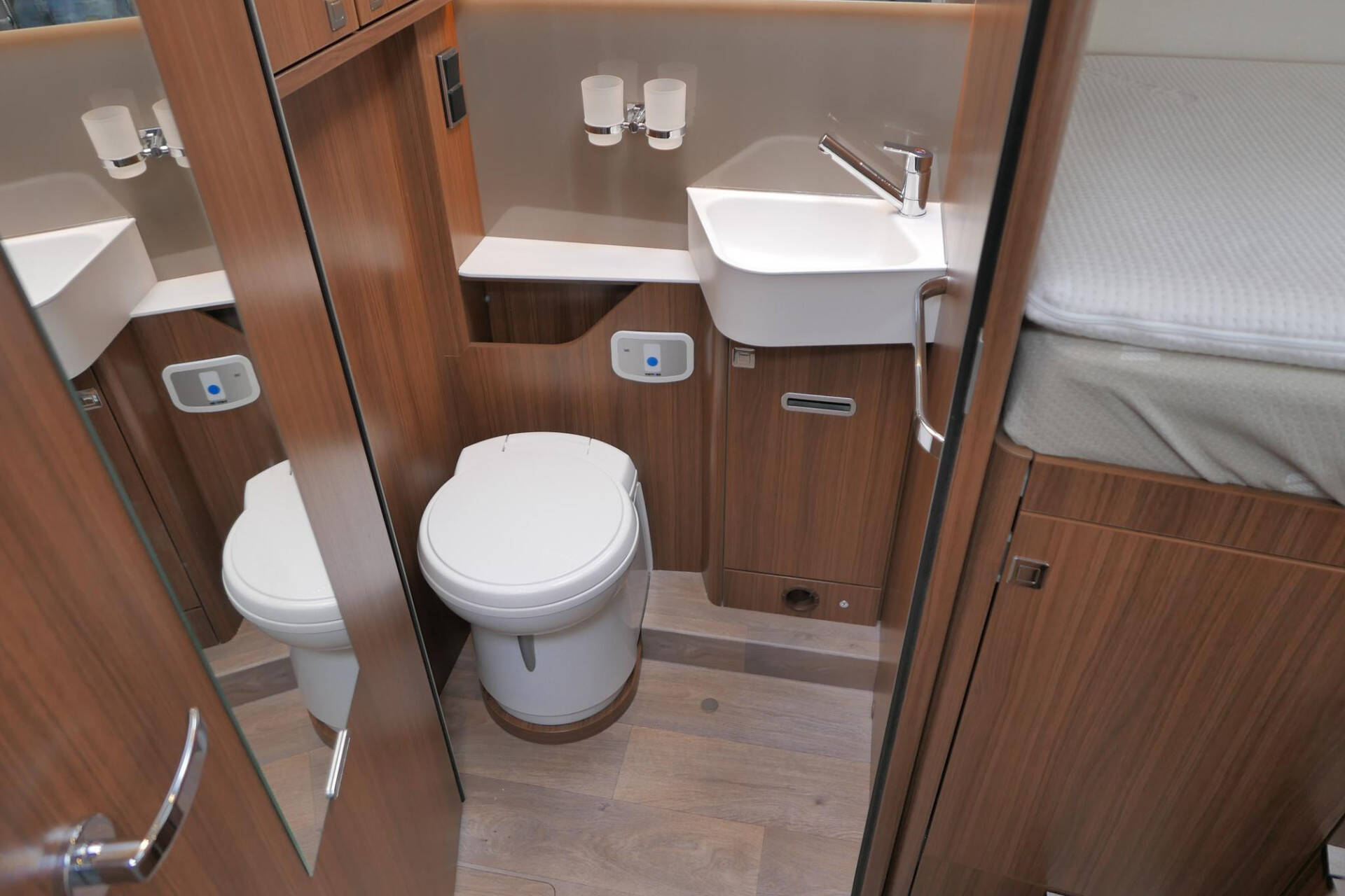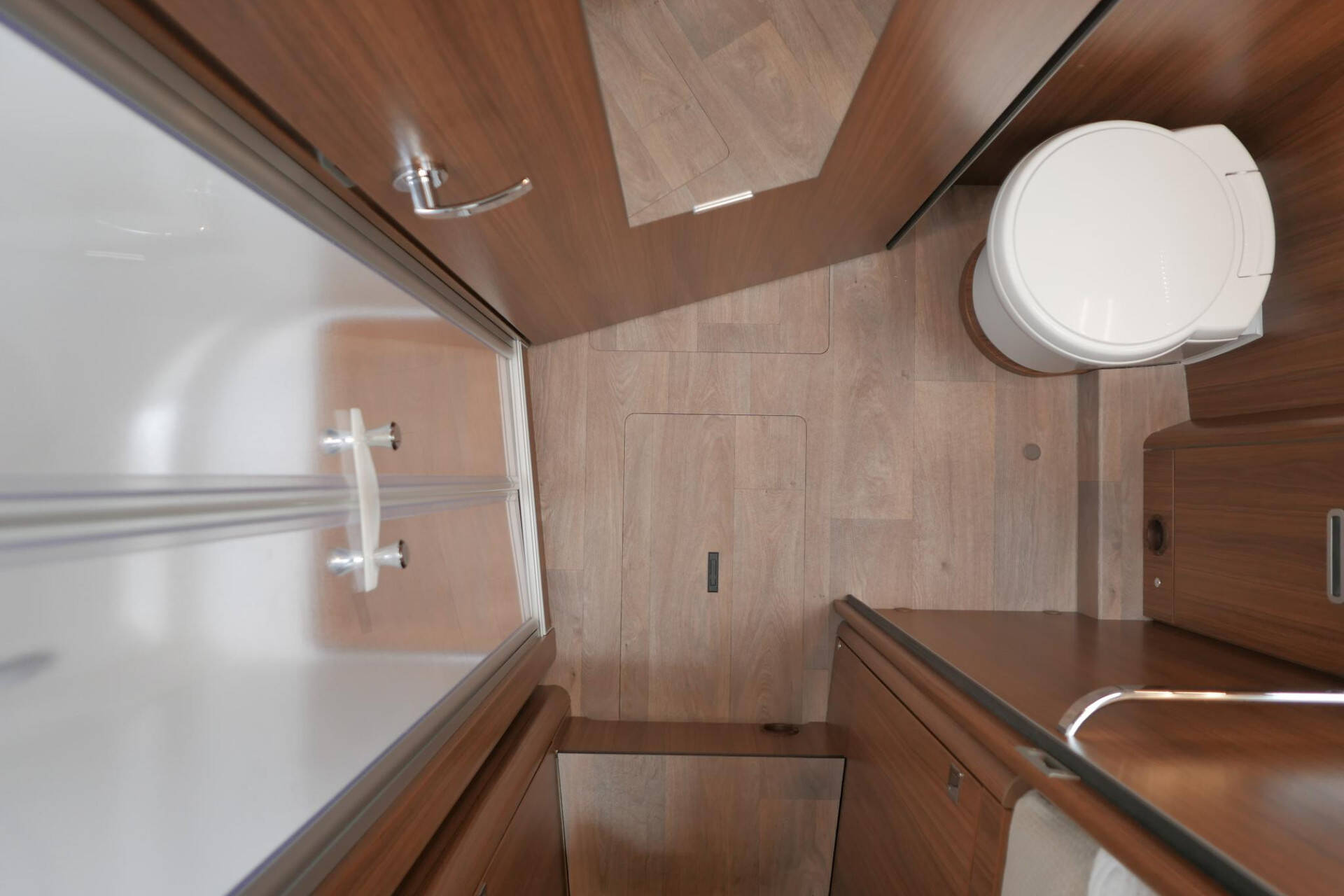 Achterin bevinden zich de aparte douche en toilet en de enkele lengte bedden. Doormiddel van de tussendeur is deze ruimte af te sluiten van het woongedeelte voor extra privacy. De ruime toiletruimte is voorzien van toilet en wasbak, grote spiegel en kastjes. Hier tegenover vindt u de douchecabine.