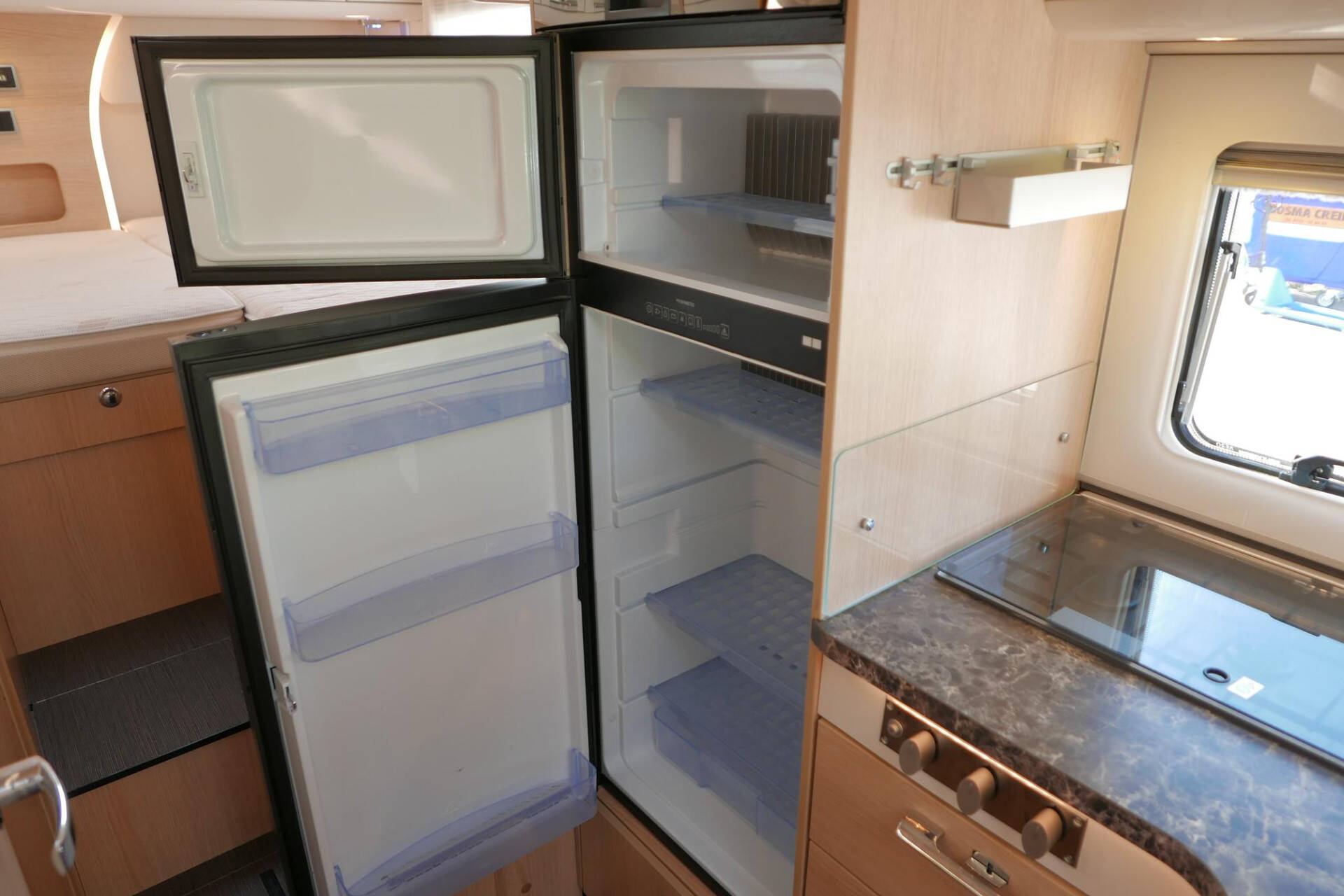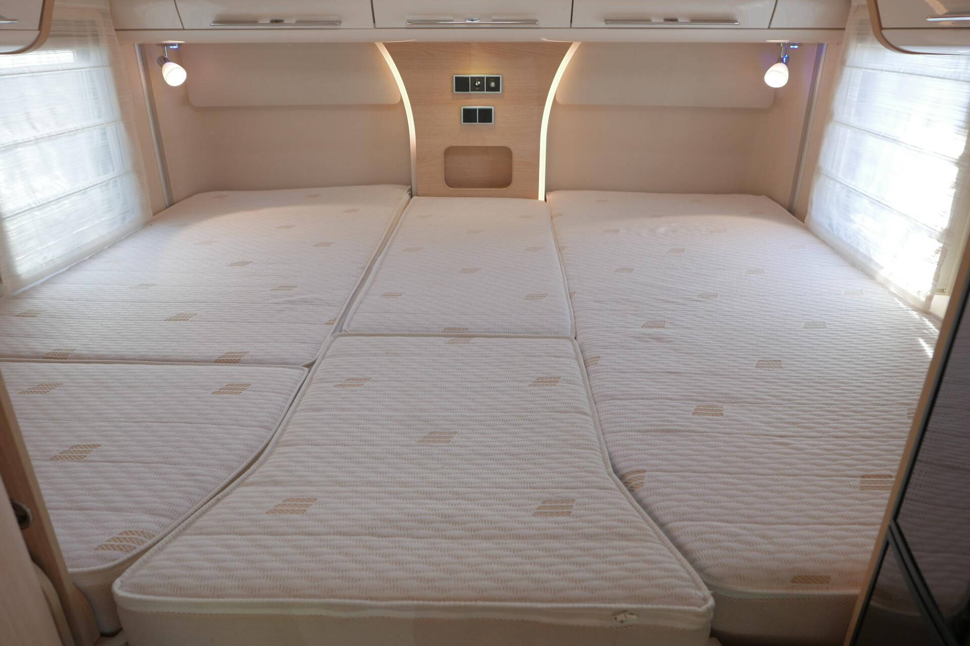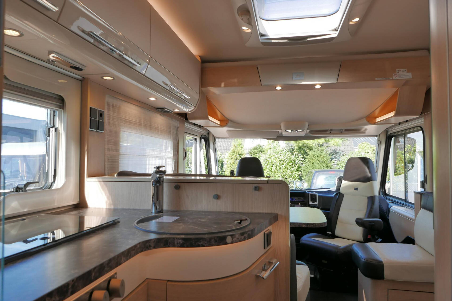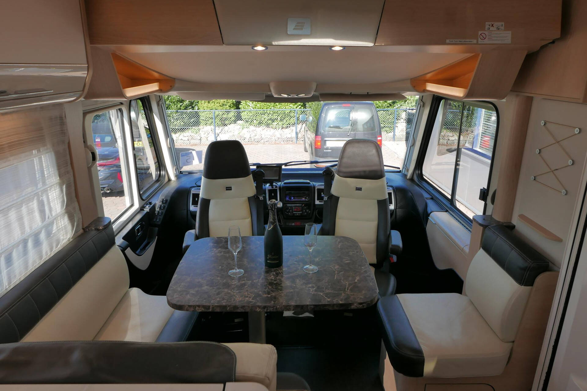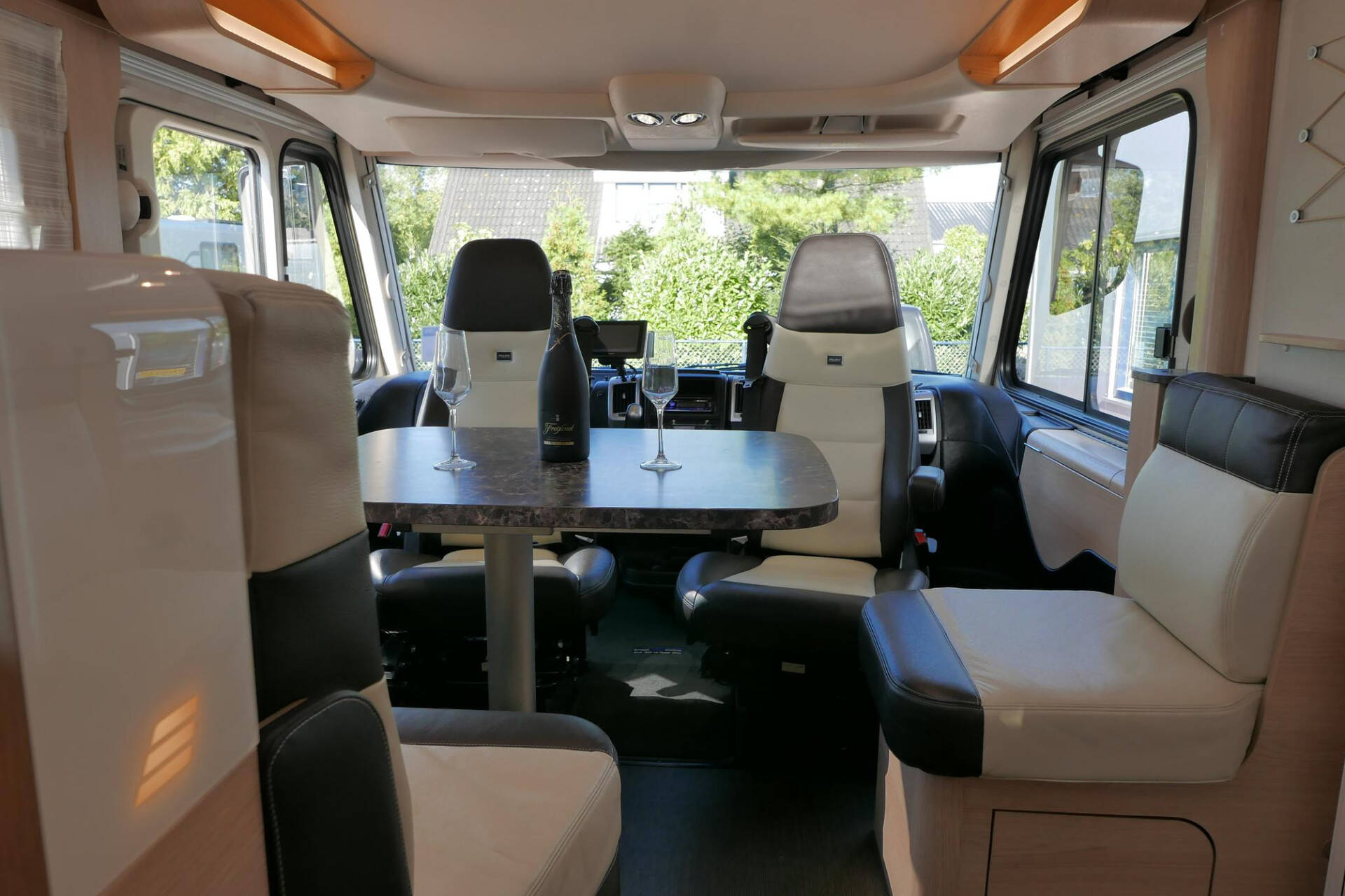 Door de voorstoelen te draaien ontstaat een ruime en gezellige zithoek met L-zit. Het Grand Oak meubeldecor in combinatie met het door Palmo beklede lederen bekleding zorgen een lichte uitstraling. Door het AL-KO chassis beschikt deze camper over een volledig vlakke vloer met in de mee verwarmde dubbele bodem extra opbergruimte die ook vanaf de buitenkant te bereiken is. Ook de 180 liter schoon- 150 liter vuilwatertank bevinden zich in de dubbele bodem. Natuurlijk zijn alle ramen en de toegangsdeur voorzien van horren en plisséverduistering.