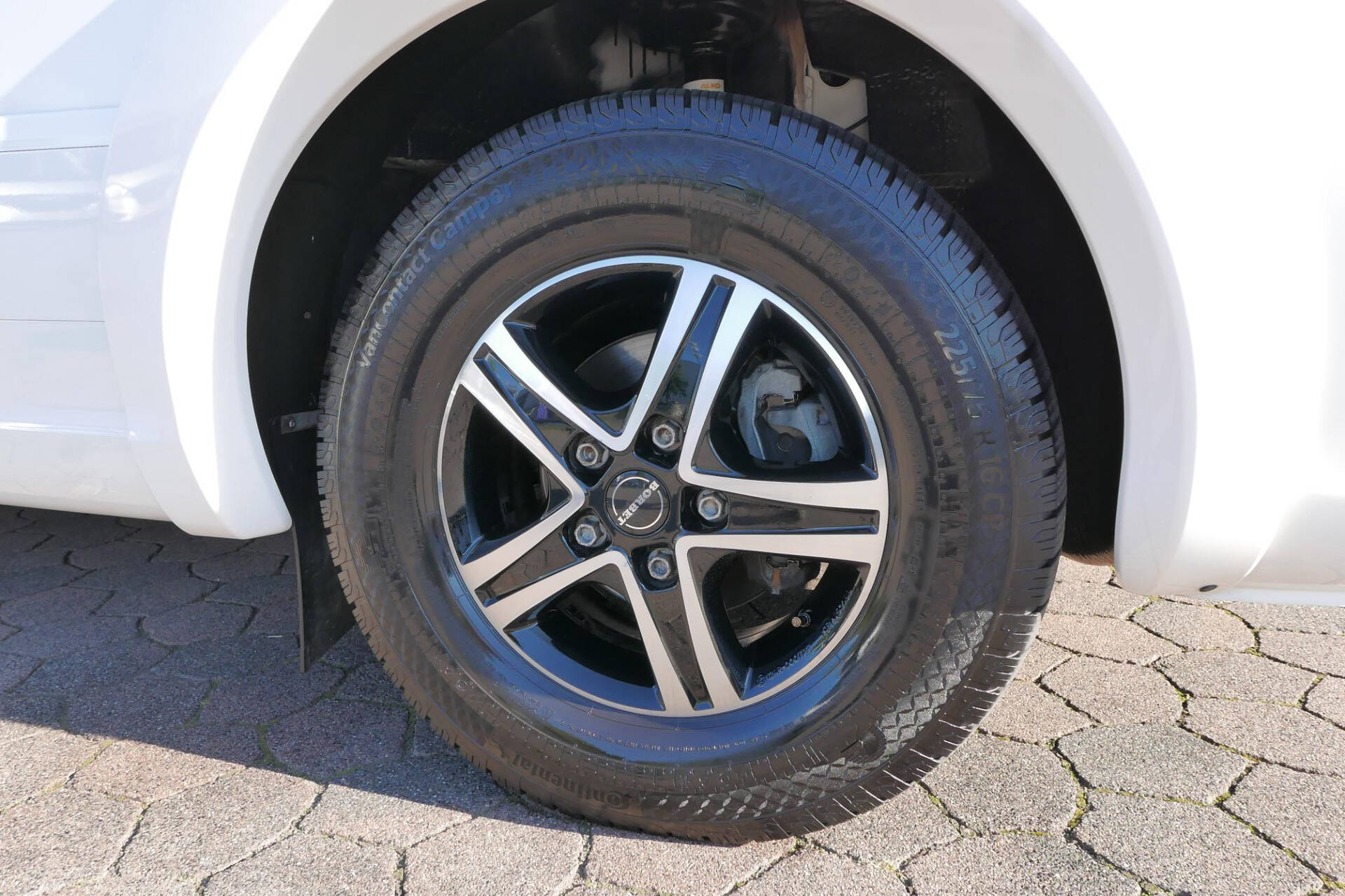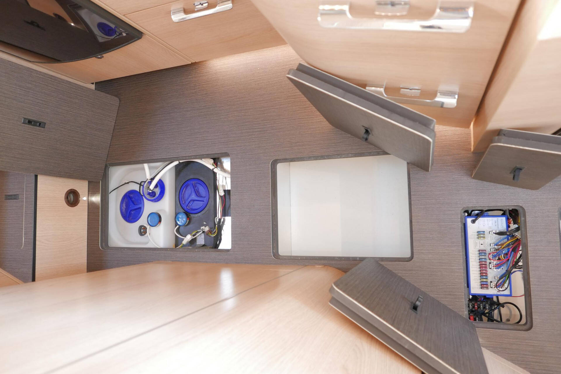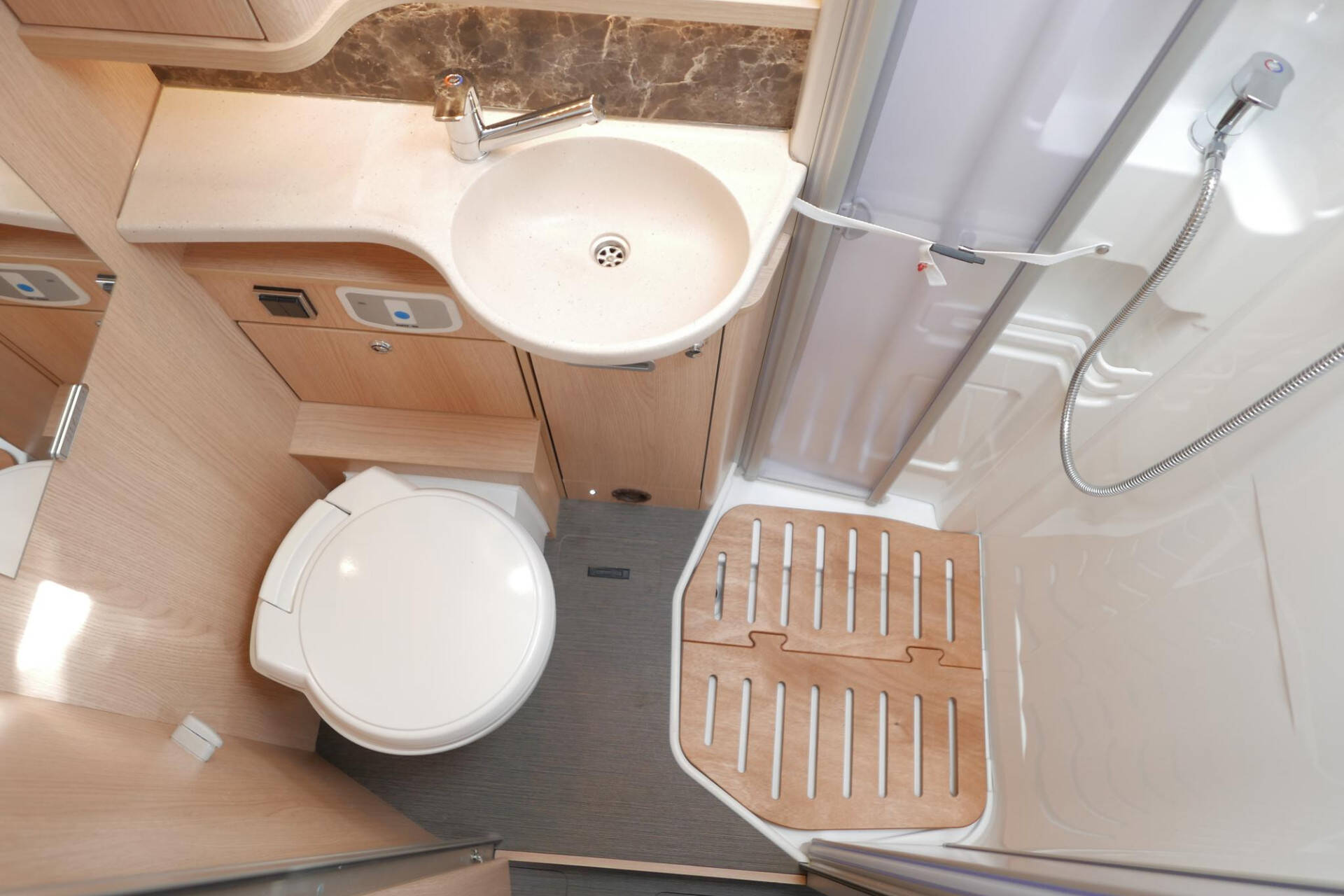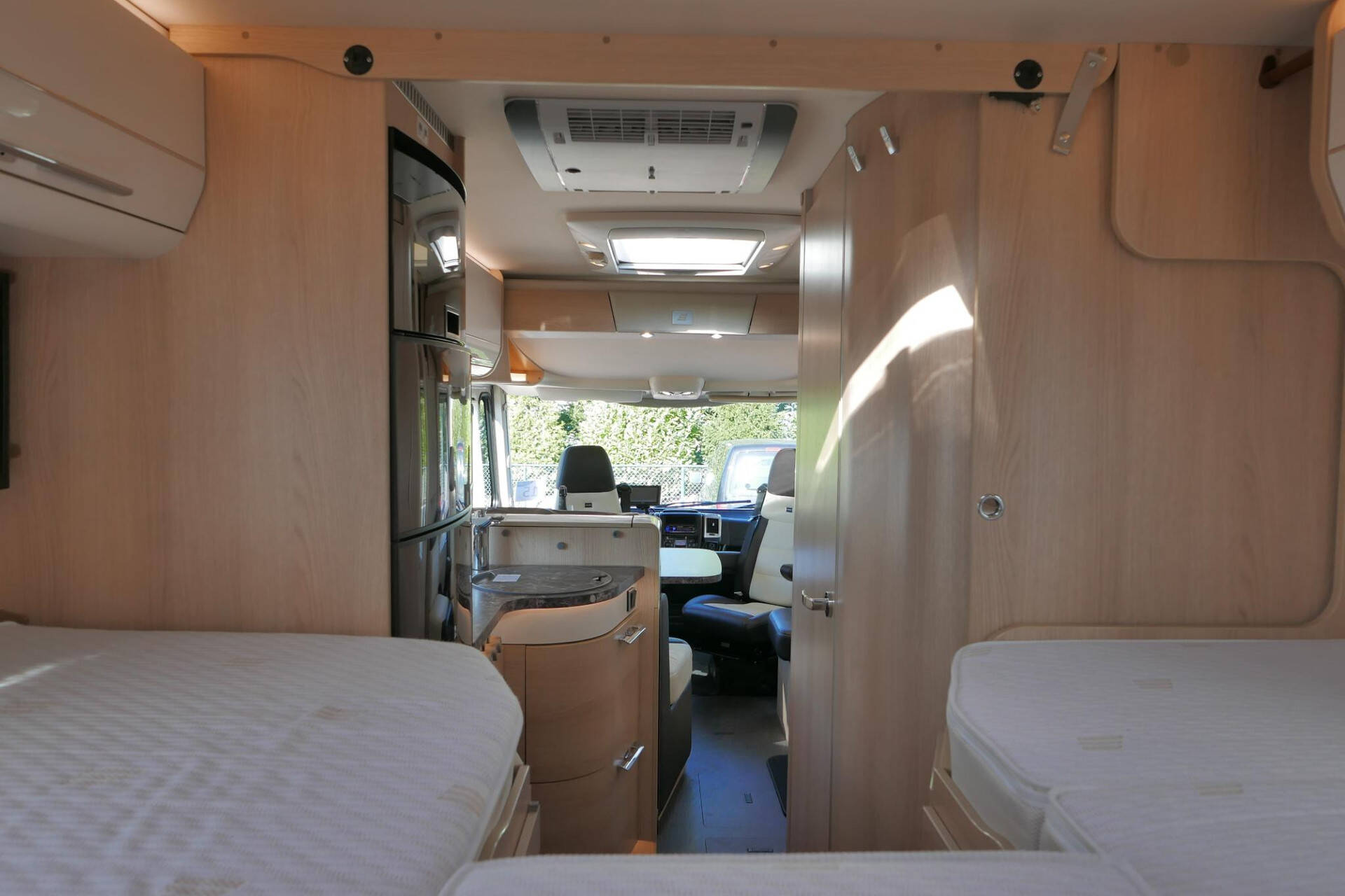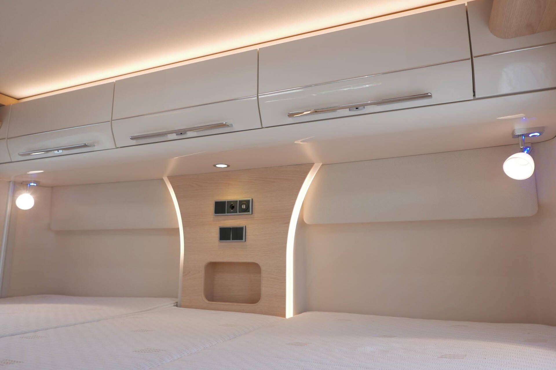 Door de voorstoelen te draaien ontstaat een ruime en gezellige zithoek met L-zit. Het Grand Oak meubeldecor in combinatie met het door Palmo beklede lederen bekleding zorgen een lichte uitstraling. Door het AL-KO chassis beschikt deze camper over een volledig vlakke vloer met in de mee verwarmde dubbele bodem extra opbergruimte die ook vanaf de buitenkant te bereiken is. Ook de 180 liter schoon- 150 liter vuilwatertank bevinden zich in de dubbele bodem. Natuurlijk zijn alle ramen en de toegangsdeur voorzien van horren en plisséverduistering.