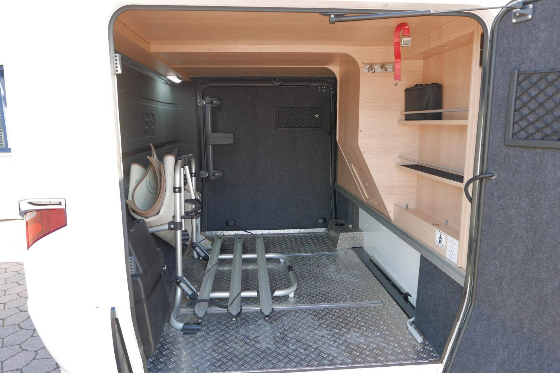 De grote garage heeft een laadhoogte van 132 cm. Deze ruimte is van beide kanten te bereiken en biedt voldoende ruimte voor vouwfietsen en bagage. Tot slot is deze Hymer B-SL 674 zeer compleet uitgerust met onder andere: