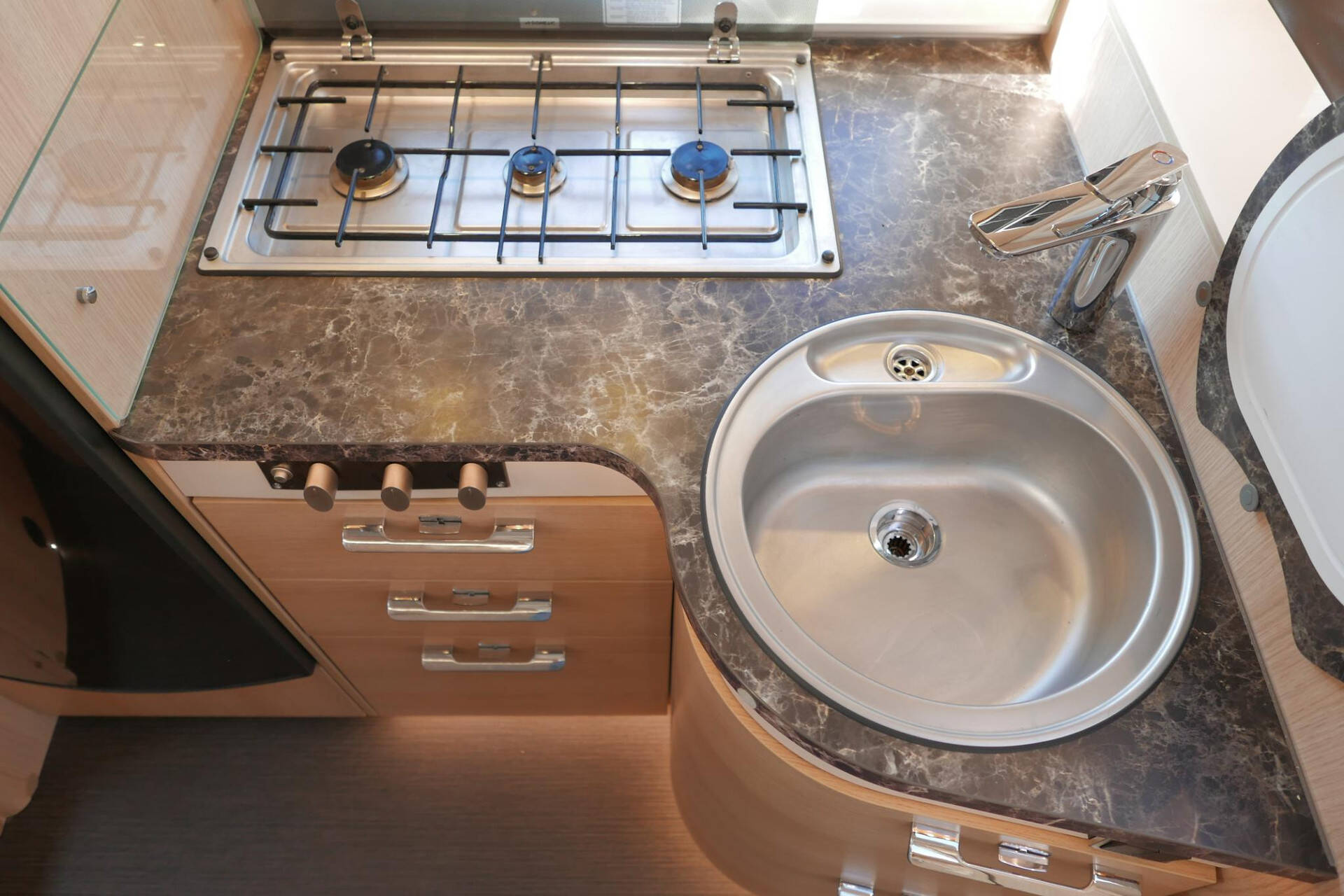 De luxe hoekkeuken is voorzien van diverse gelagerde boodschappenladen, waaronder een 3 pits gasstel. Hier naast bevindt zich de grote dubbeldeurs AES koelkast type Tectower met apart vriesgedeelte, volautomatische omschakeling 220 V/ 12 V/ gas met luxe gasbakoven.