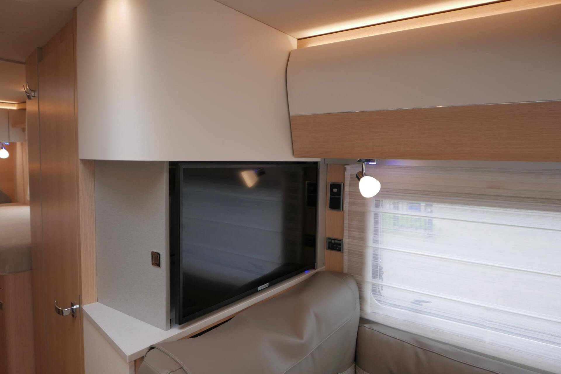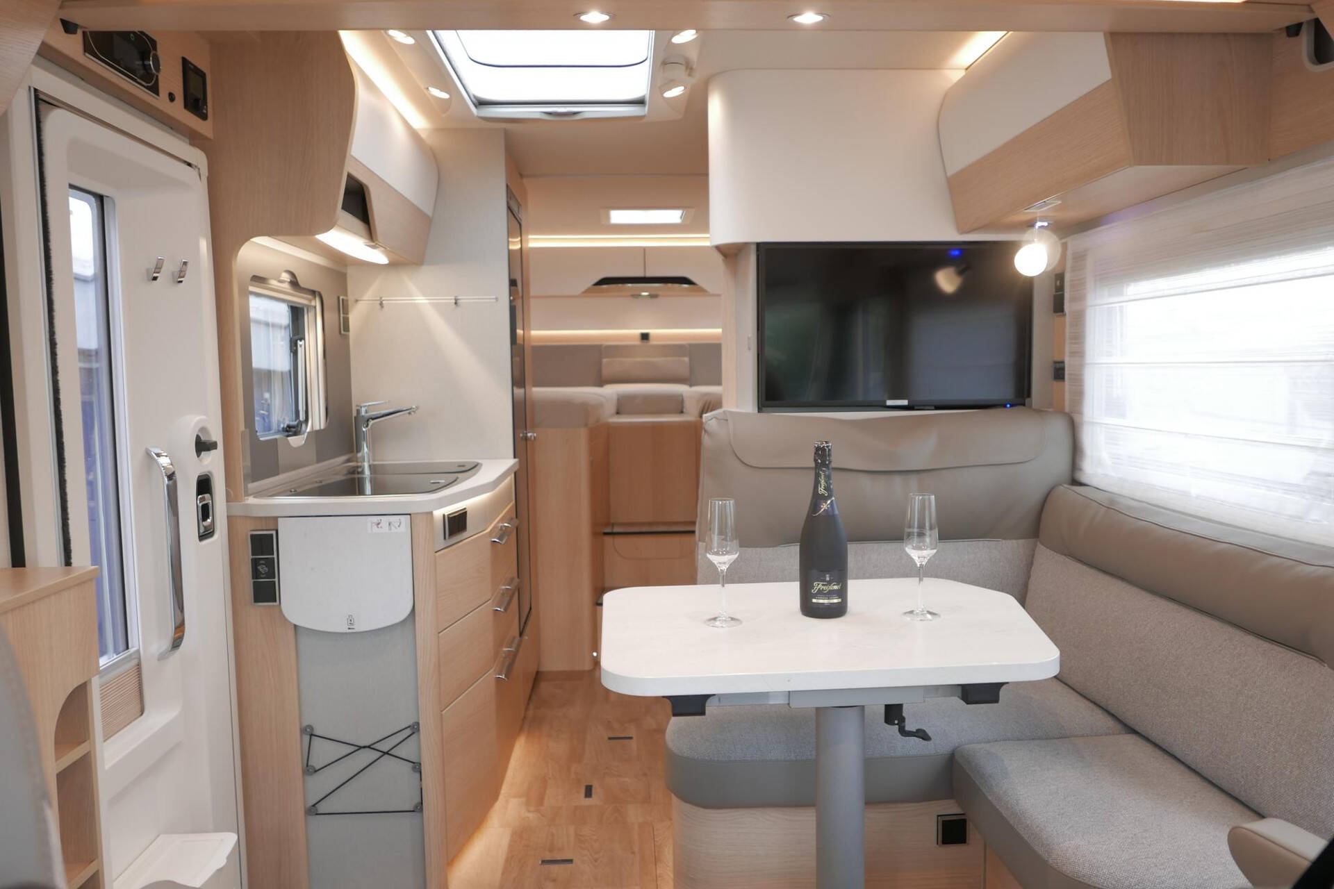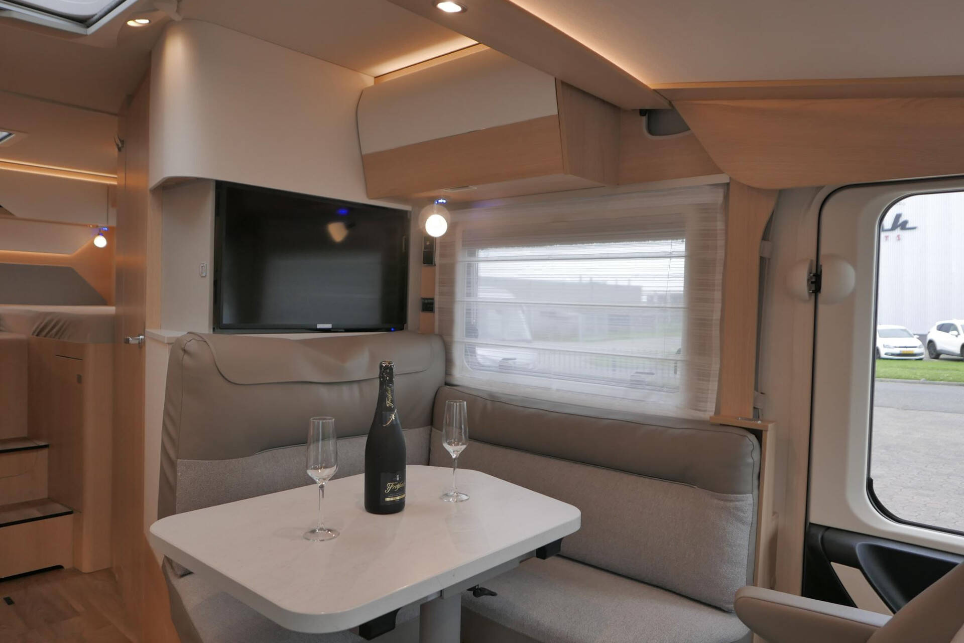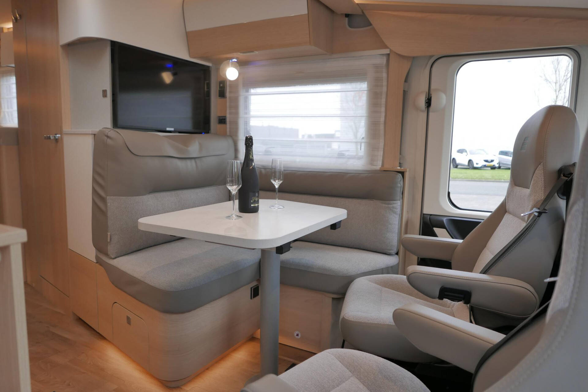 Door de voorstoelen te draaien ontstaat een ruime en gezellige zithoek met L-zit. Het Grand Oak meubeldecor in combinatie met de luxe Dalana bekleding geven de woonruimte een luxe uitstraling. Door het AL-KO chassis beschikt deze camper over een volledig vlakke vloer met in de mee verwarmde dubbele bodem extra opbergruimte die ook vanaf de buitenkant te bereiken is. De 180 liter schoon- en 150 liter vuilwatertank zijn tevens in de dubbele bodem gesitueerd. Uiteraard zijn alle ramen en deuren voorzien van horren en plisséverduistering.