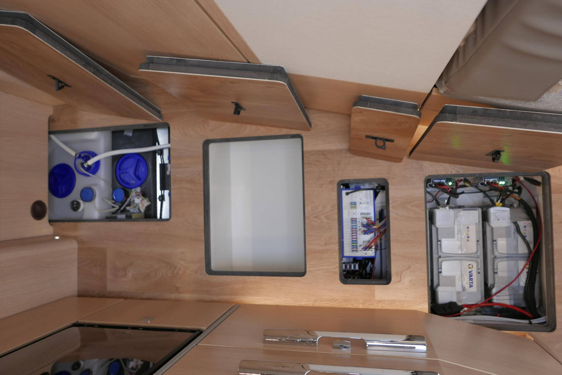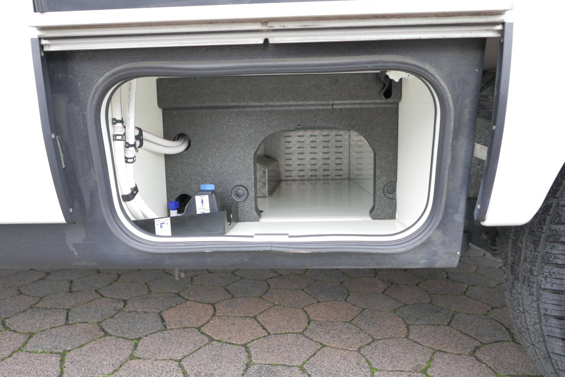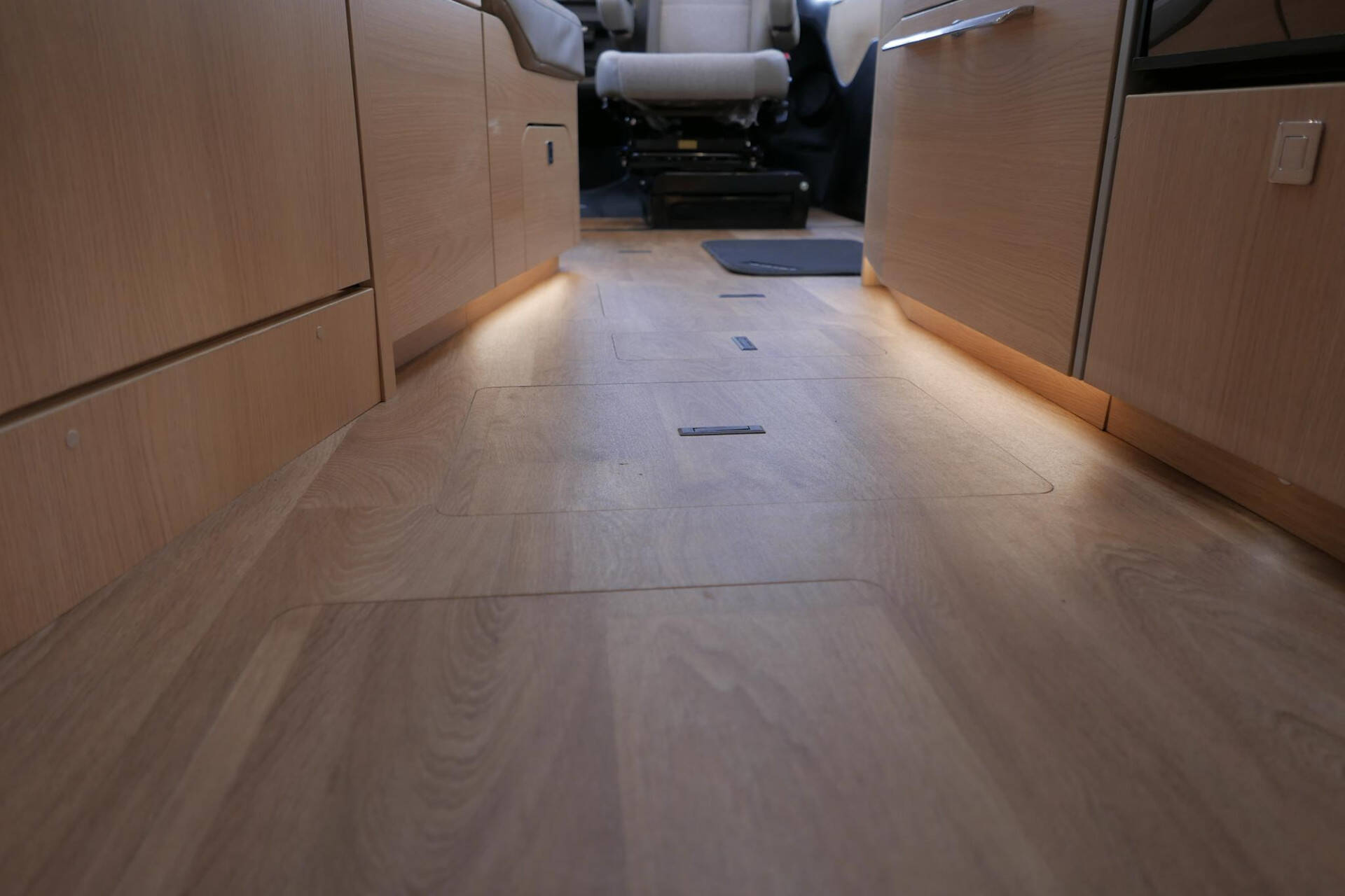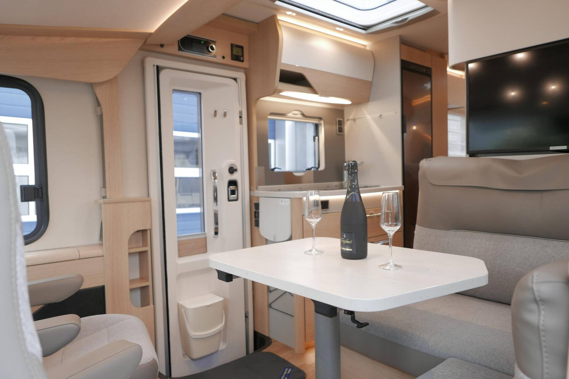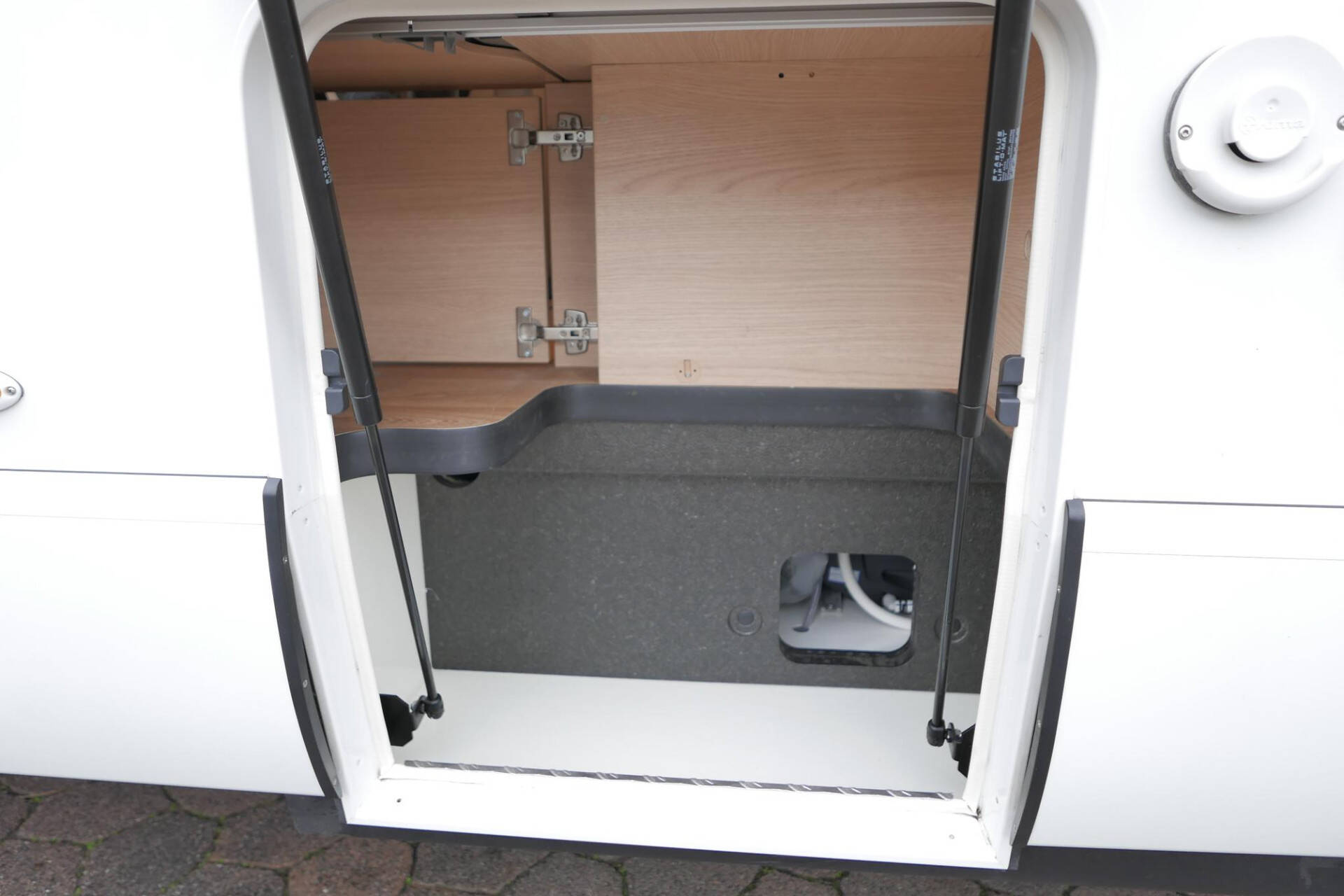 Door de voorstoelen te draaien ontstaat een ruime en gezellige zithoek met L-zit. Het Grand Oak meubeldecor in combinatie met de luxe Dalana bekleding geven de woonruimte een luxe uitstraling. Door het AL-KO chassis beschikt deze camper over een volledig vlakke vloer met in de mee verwarmde dubbele bodem extra opbergruimte die ook vanaf de buitenkant te bereiken is. De 180 liter schoon- en 150 liter vuilwatertank zijn tevens in de dubbele bodem gesitueerd. Uiteraard zijn alle ramen en deuren voorzien van horren en plisséverduistering.