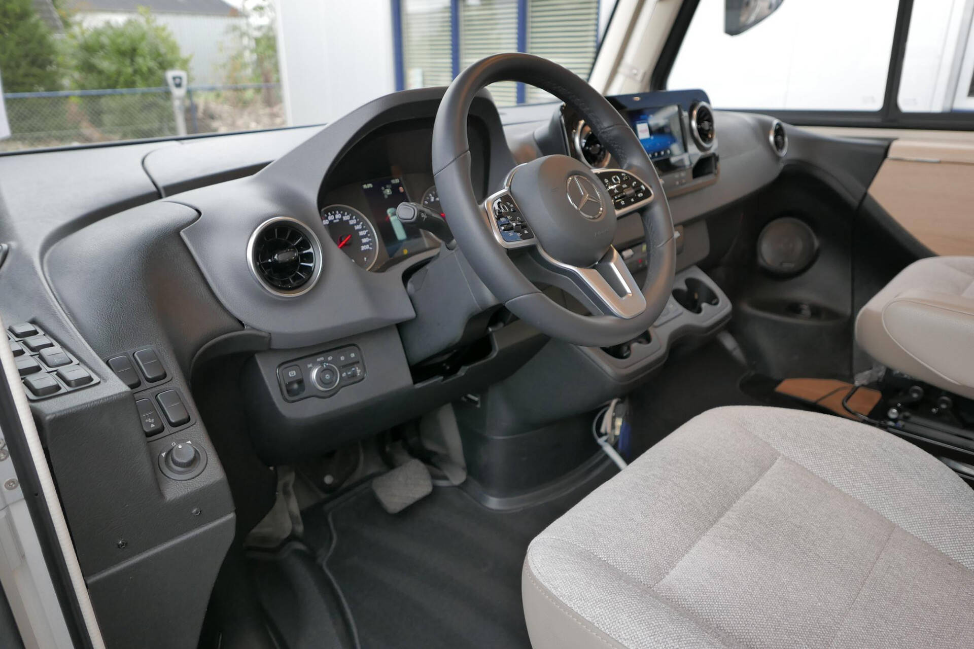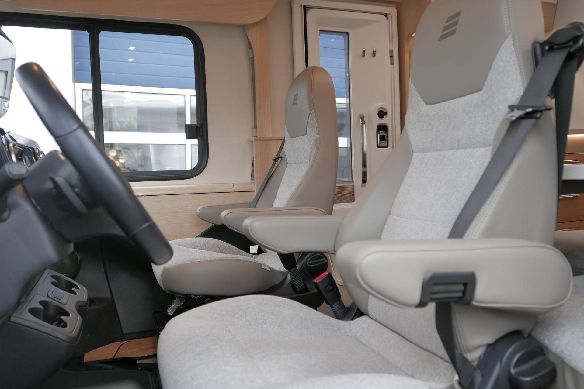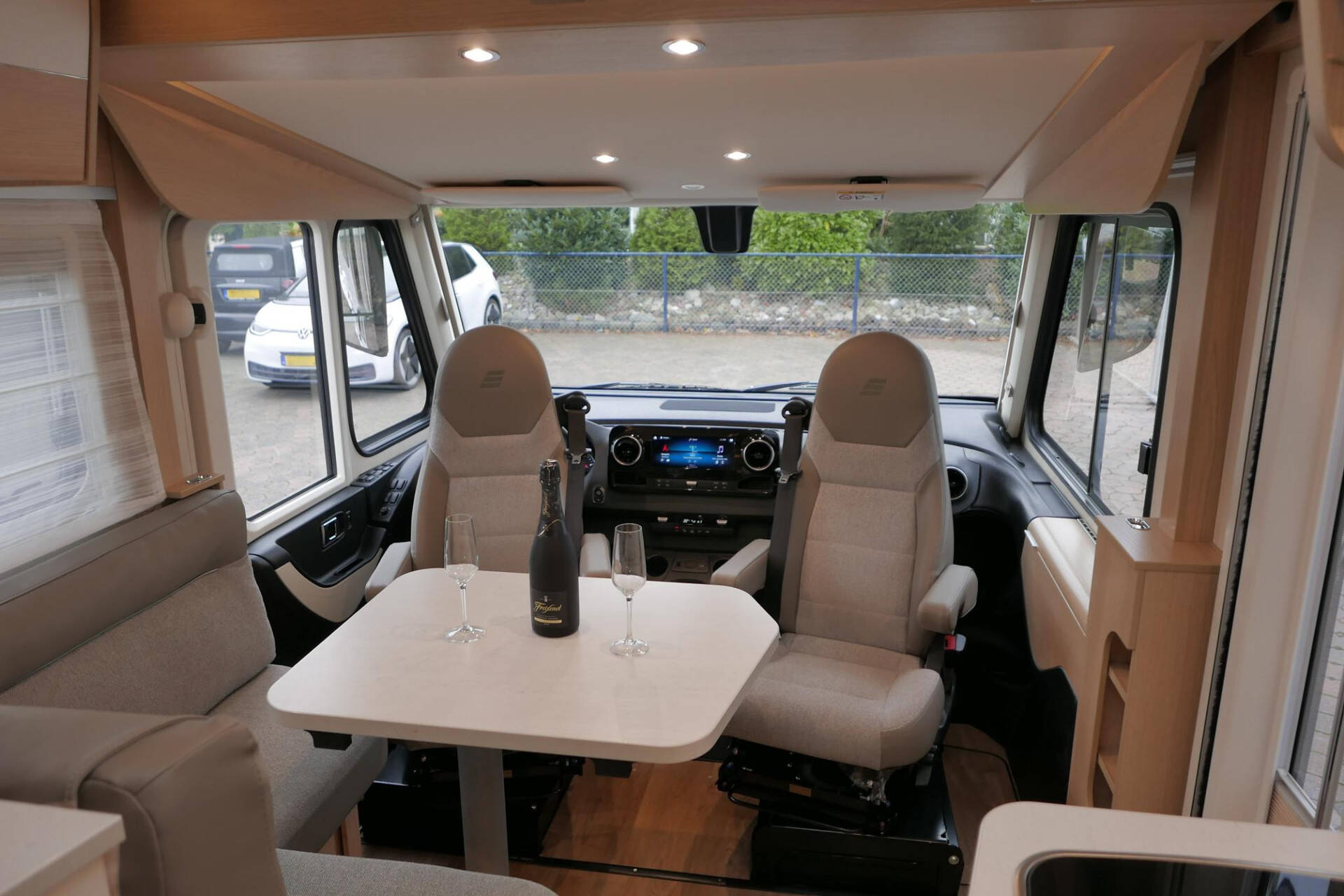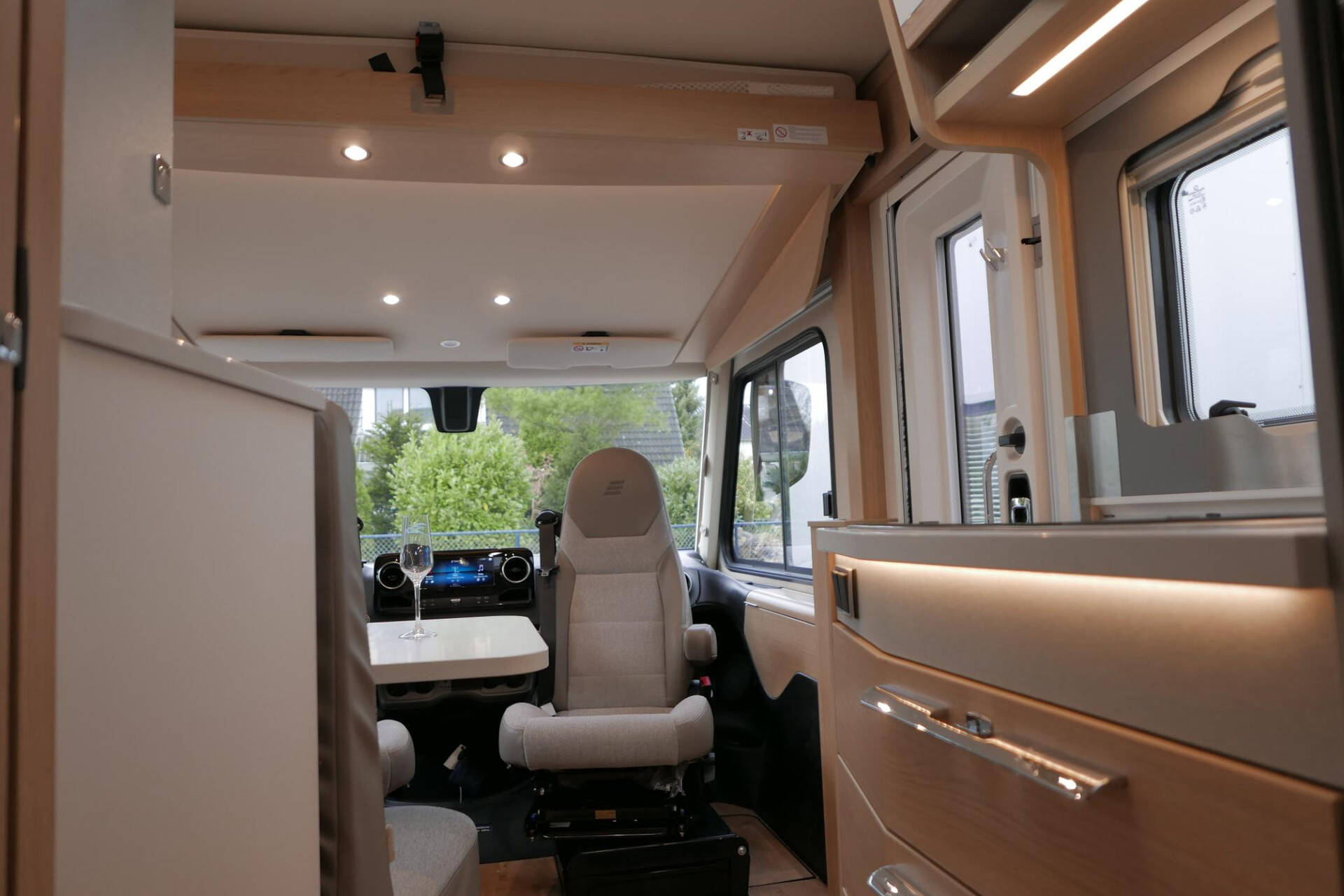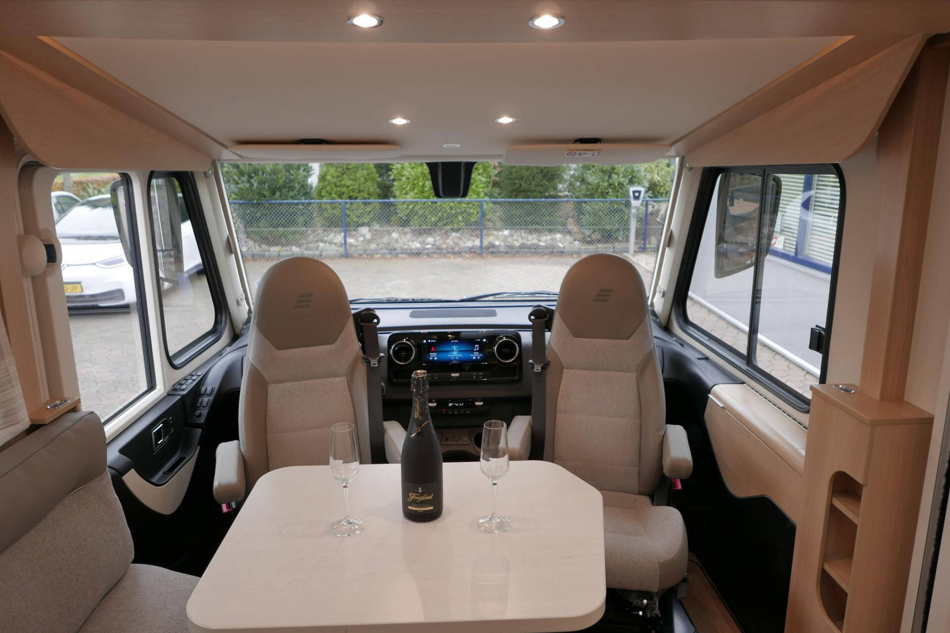 In de cabine van deze integraalcamper valt meteen het panorama uitzicht op, niet alleen om volop te genieten van de omgeving, maar ook tijdens het rijden een goed overzicht op het verkeer. De cabine is uitgerust met het Mercedes-Benz MBUX multimedia systeem en 2 luxe Aguti pilotenstoelen die volledig verstelbaar en draaibaar zijn. Verder beschikt deze camper over: