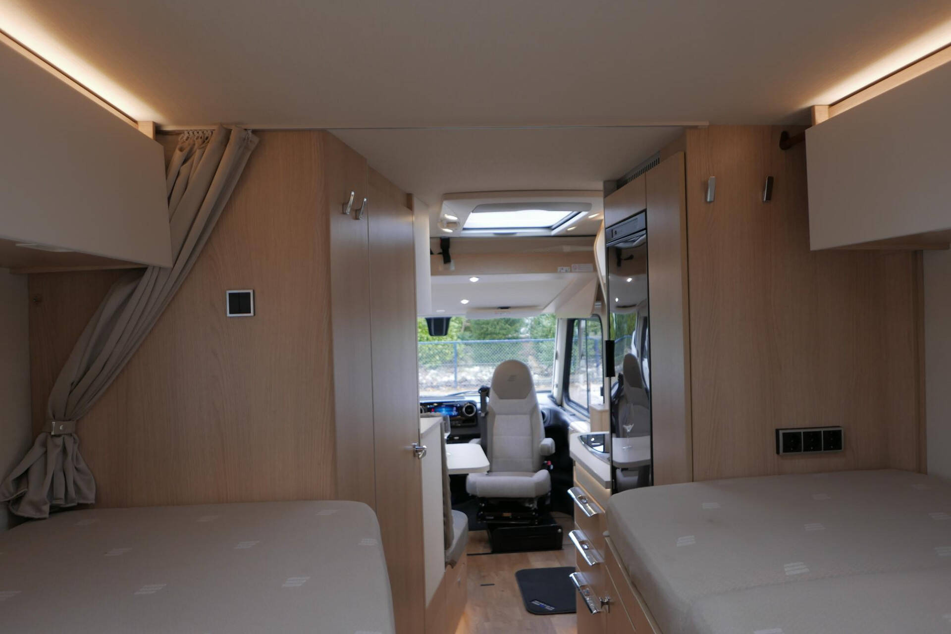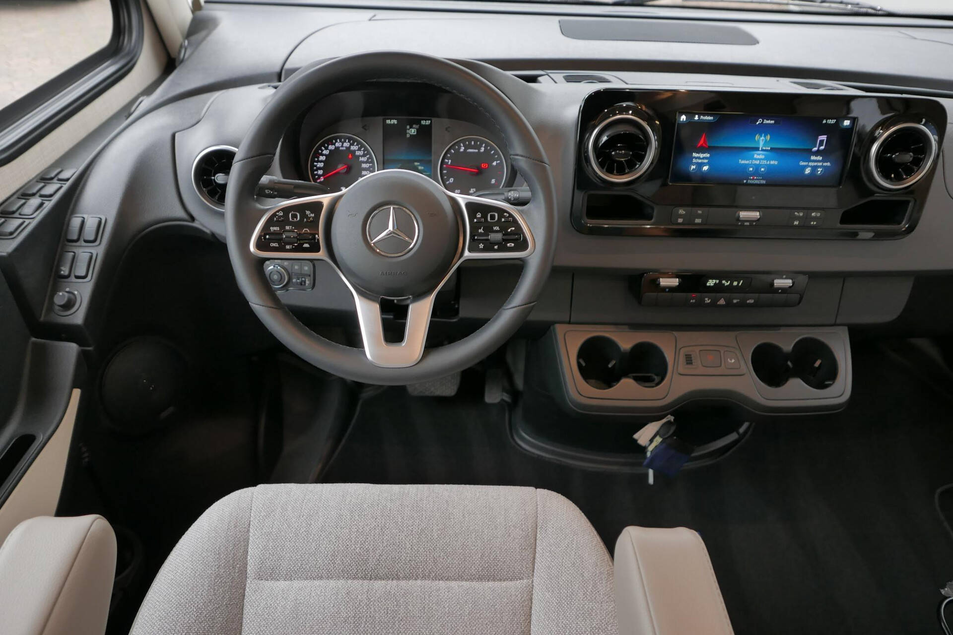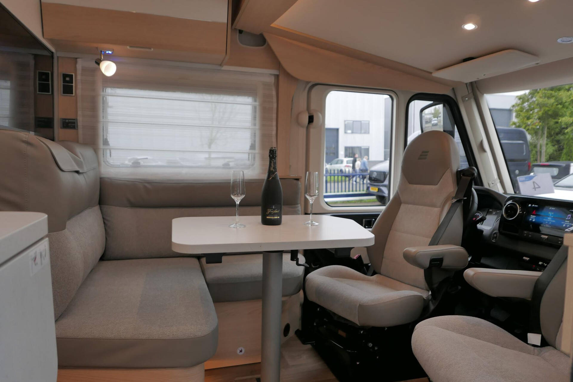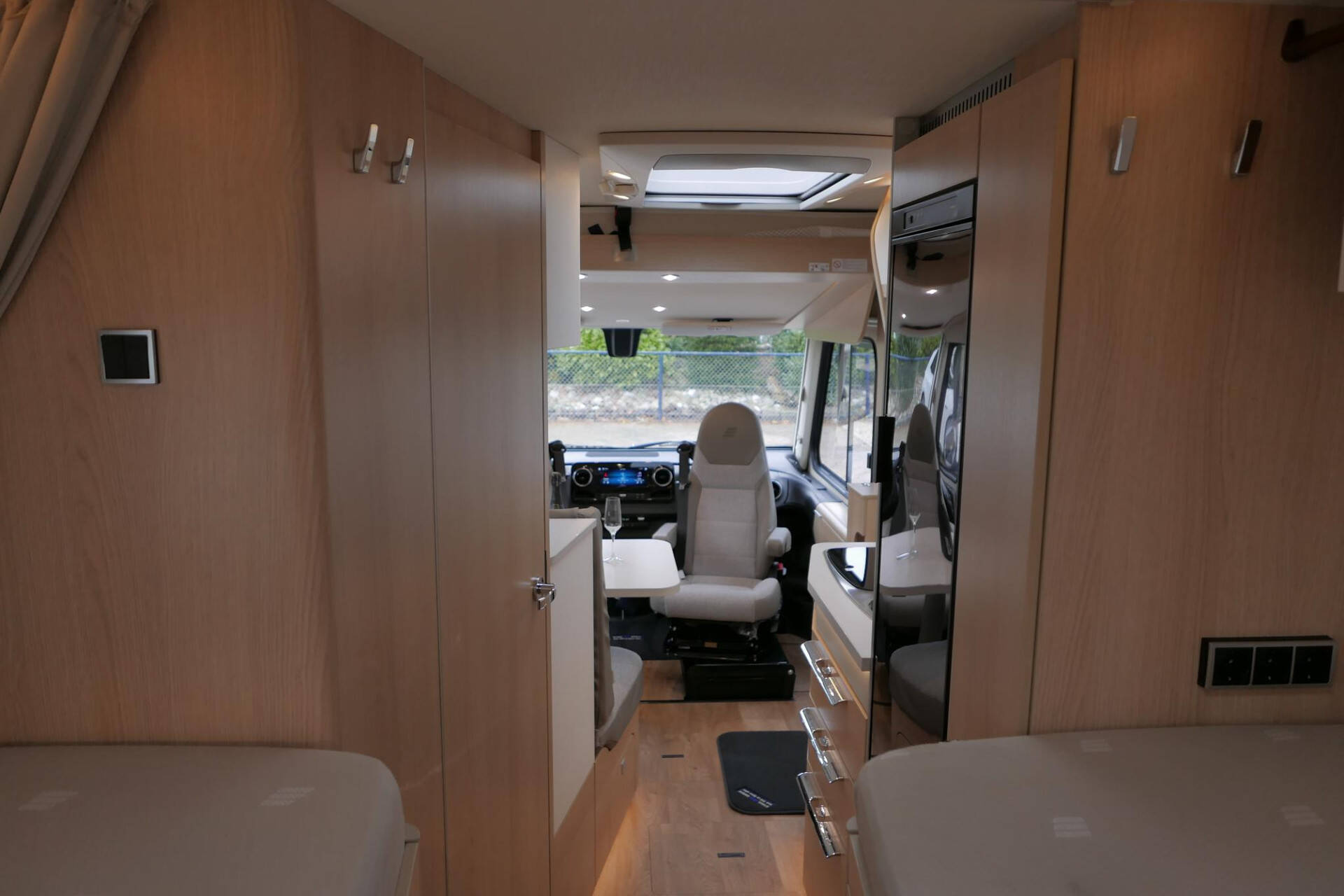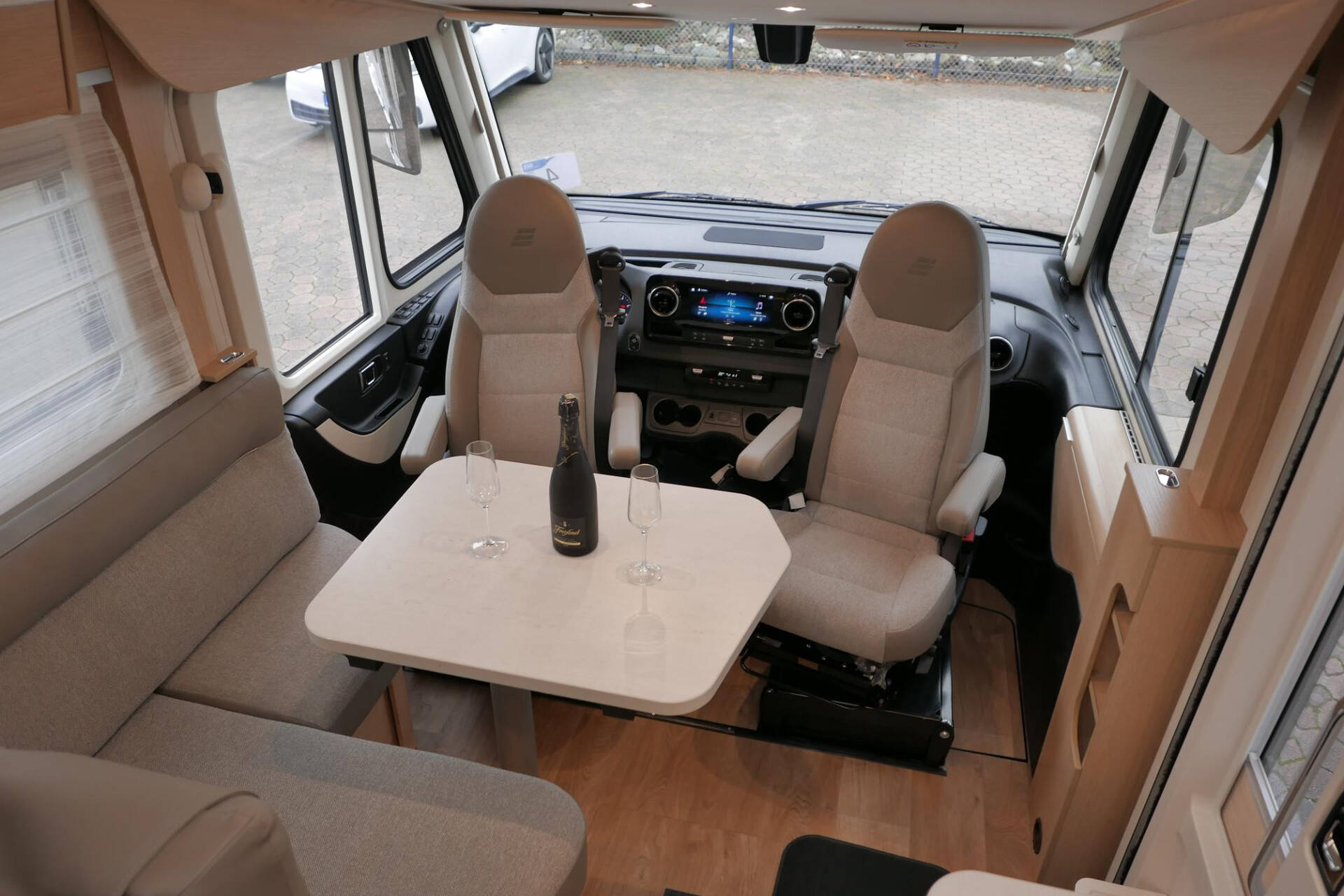 In de cabine van deze integraalcamper valt meteen het panorama uitzicht op, niet alleen om volop te genieten van de omgeving, maar ook tijdens het rijden een goed overzicht op het verkeer. De cabine is uitgerust met het Mercedes-Benz MBUX multimedia systeem en 2 luxe Aguti pilotenstoelen die volledig verstelbaar en draaibaar zijn. Verder beschikt deze camper over: