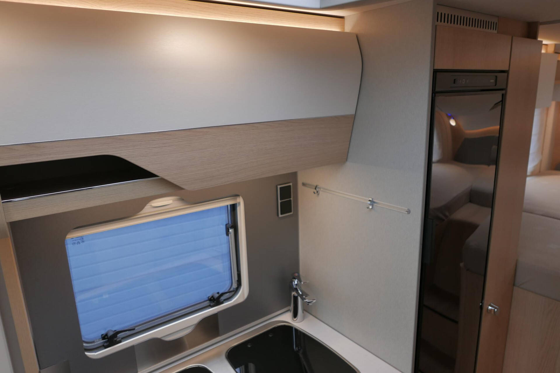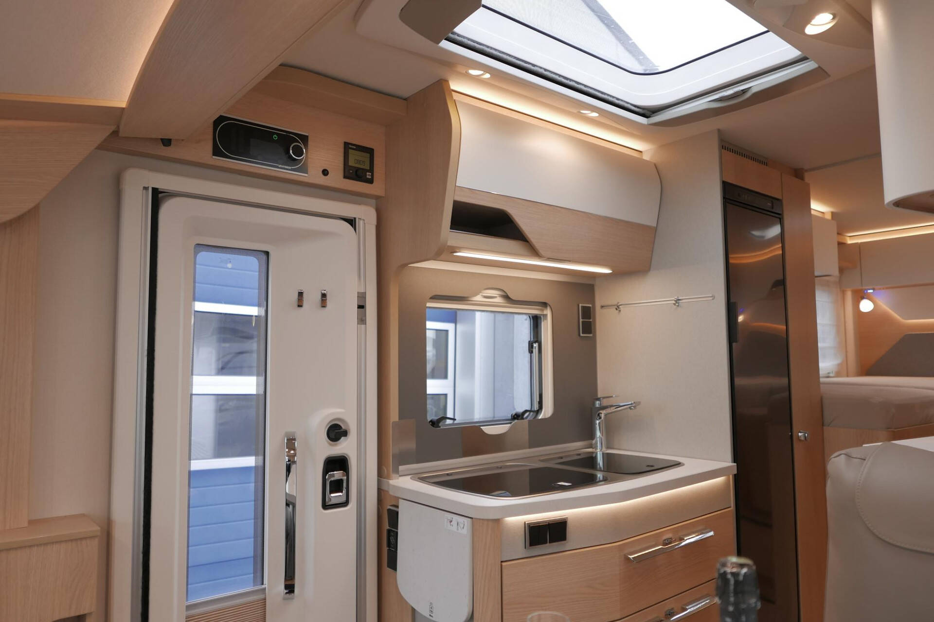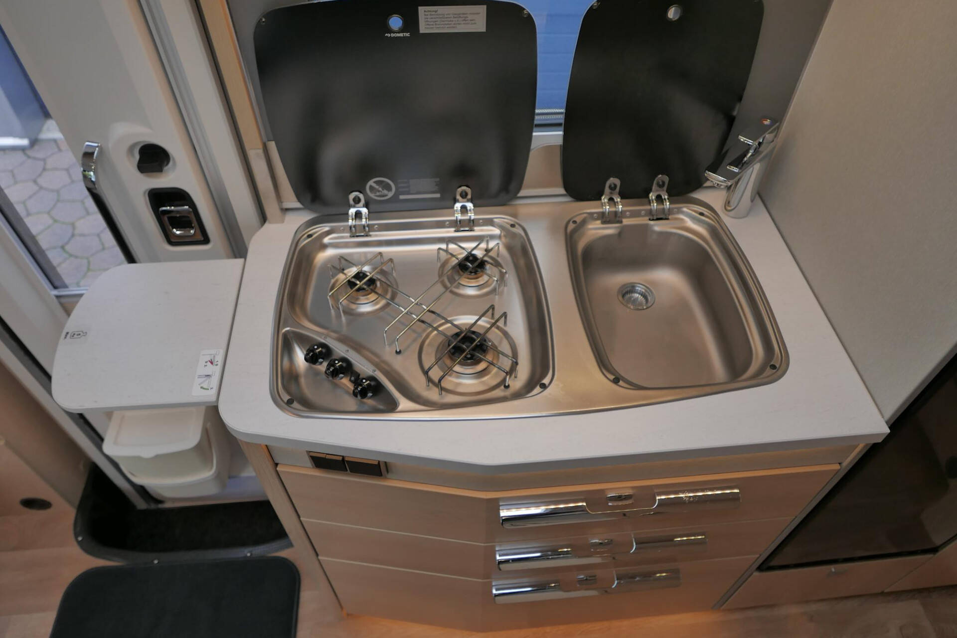 De keuken is uitgerust met diverse gelagerde boodschappenladen, een 3 pits gasstel en daarnaast een grote Smart-Tower koelkast (142 L) met apart vriesgedeelte en automatische omschakeling 220V/12V/gas. Ook in de klepkasten boven het aanrecht is voldoende opbergruimte voor al uw keukengerei.