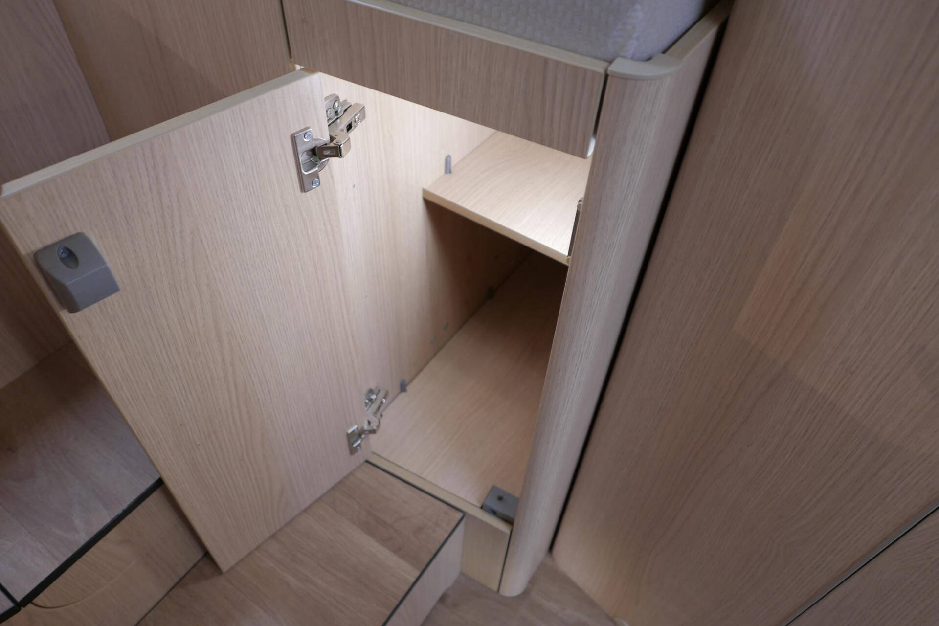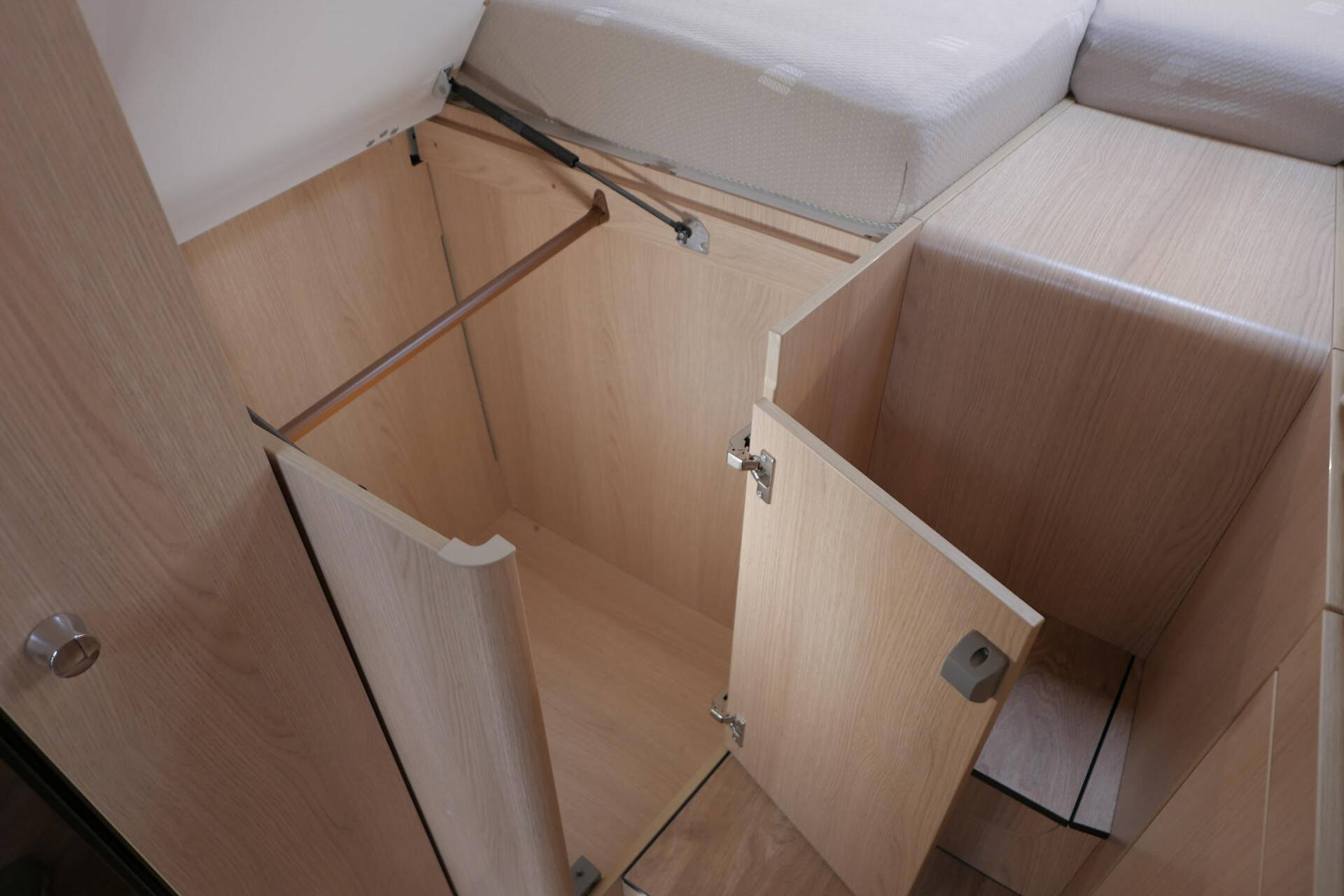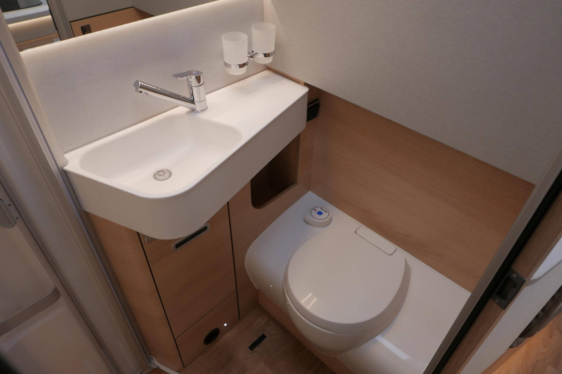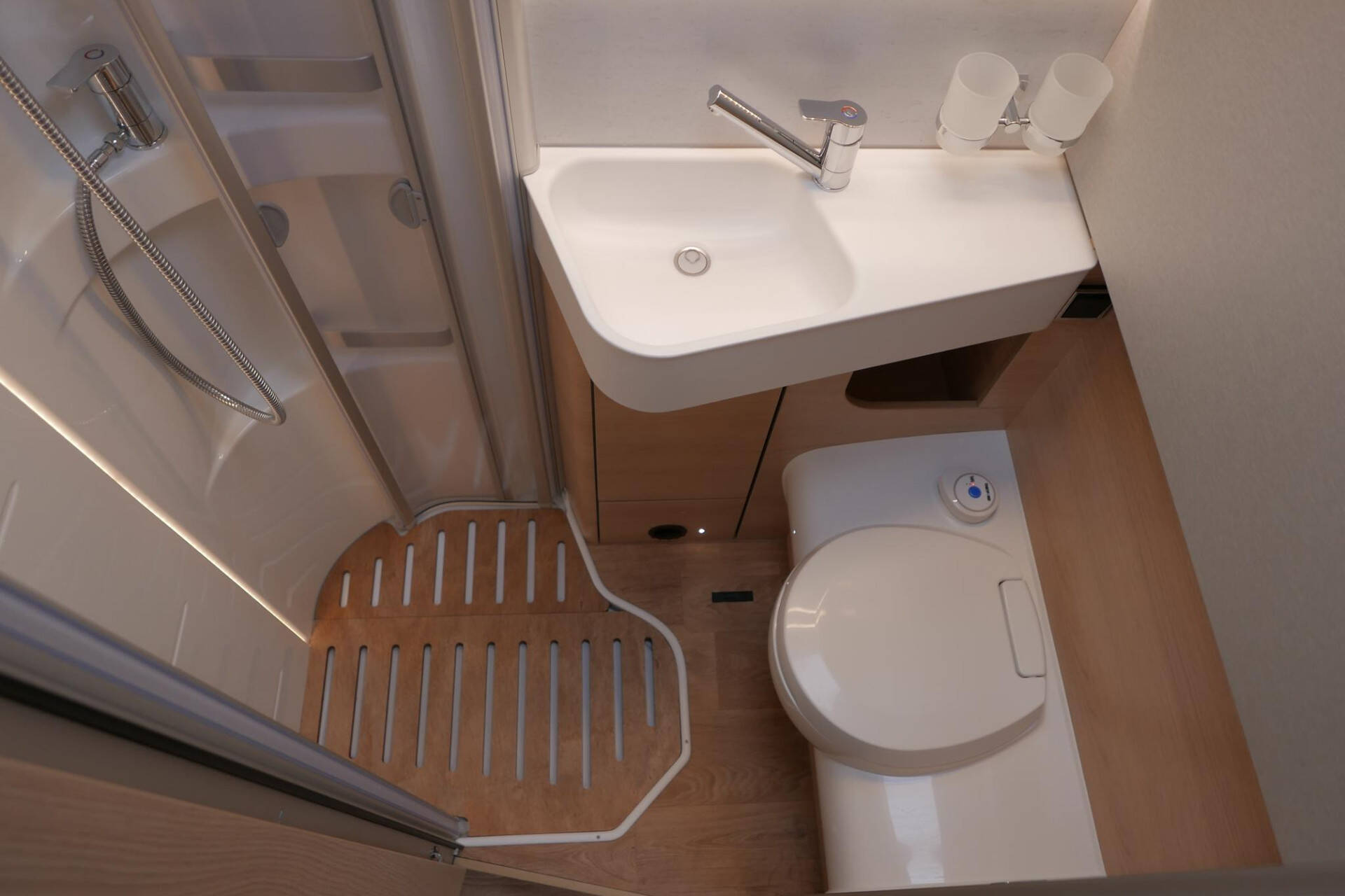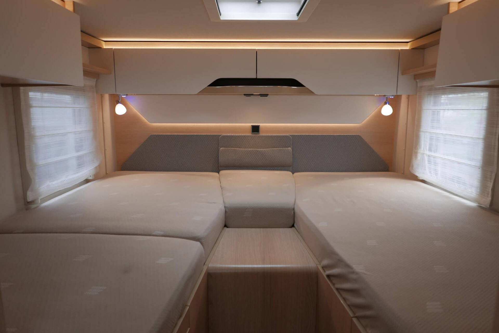 Tegenover de keuken vindt u de comfortabele toiletruimte met wastafel en ruime douchecabine. Achterin de camper zijn 2 enkele lengte bedden. Onder de bedden is aan 2 kanten extra kastruimte aanwezig.