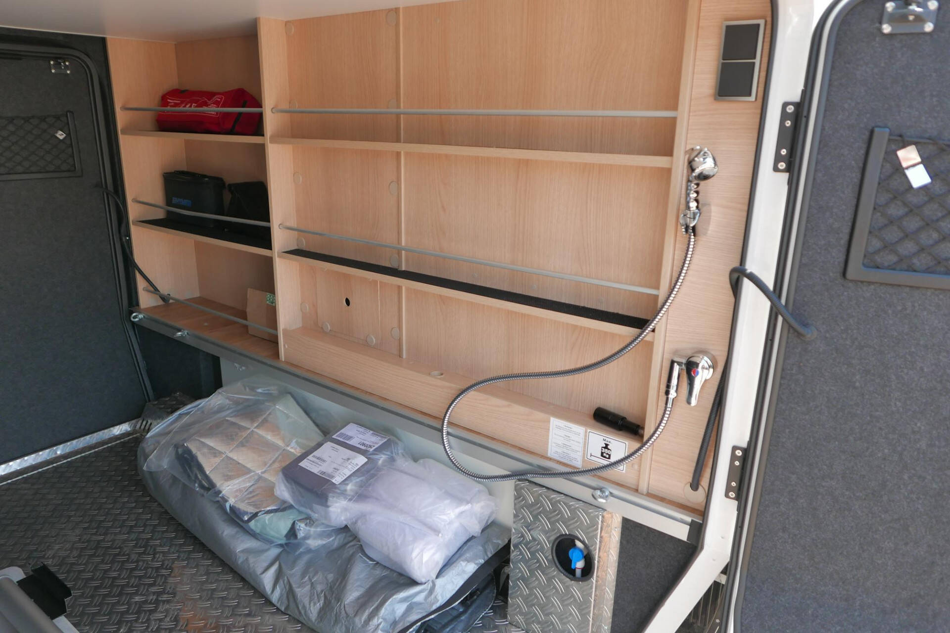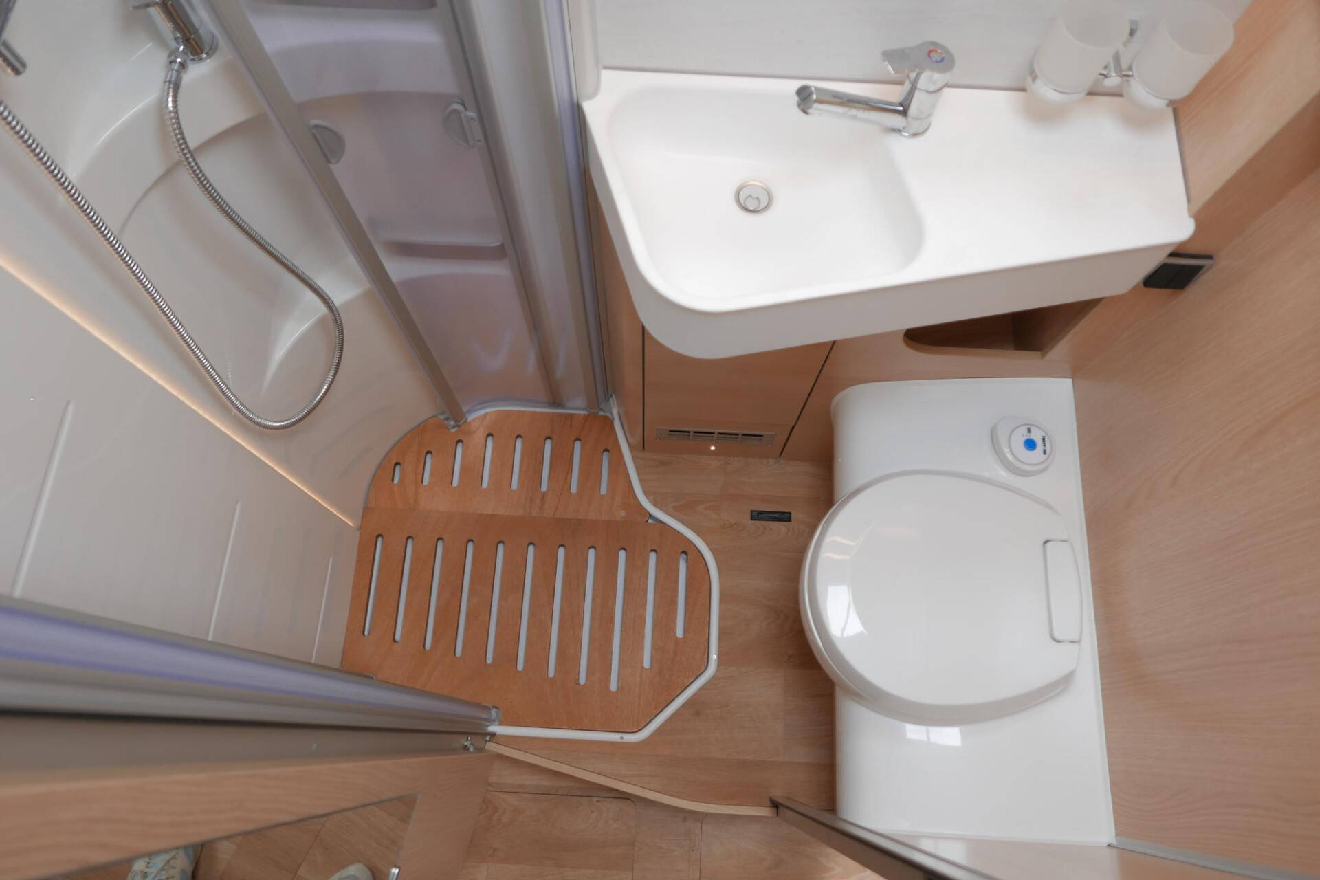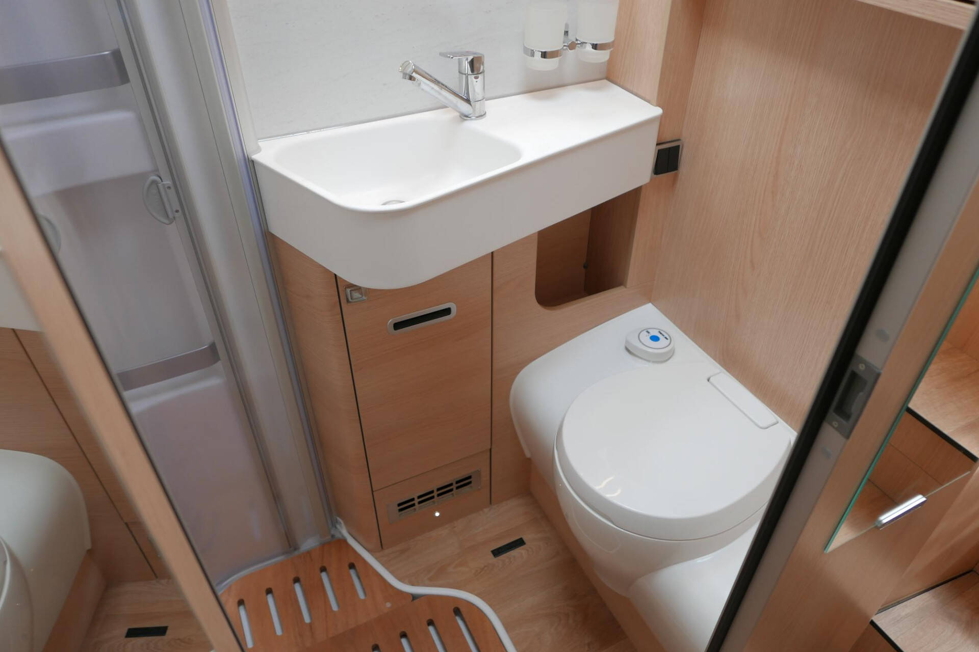 Tegenover de keuken is de gecombineerde douche- en toiletruimte gesitueerd. Zeker wanneer u niet (vaak) in de camper doucht heeft u hierdoor een royale badkamer. Naast de toilet en douche is een wasbak met grote spiegel en diverse kastruimte aanwezig. De houten douchevlonder zorgt voor een vlakke vloer in de ruimte.