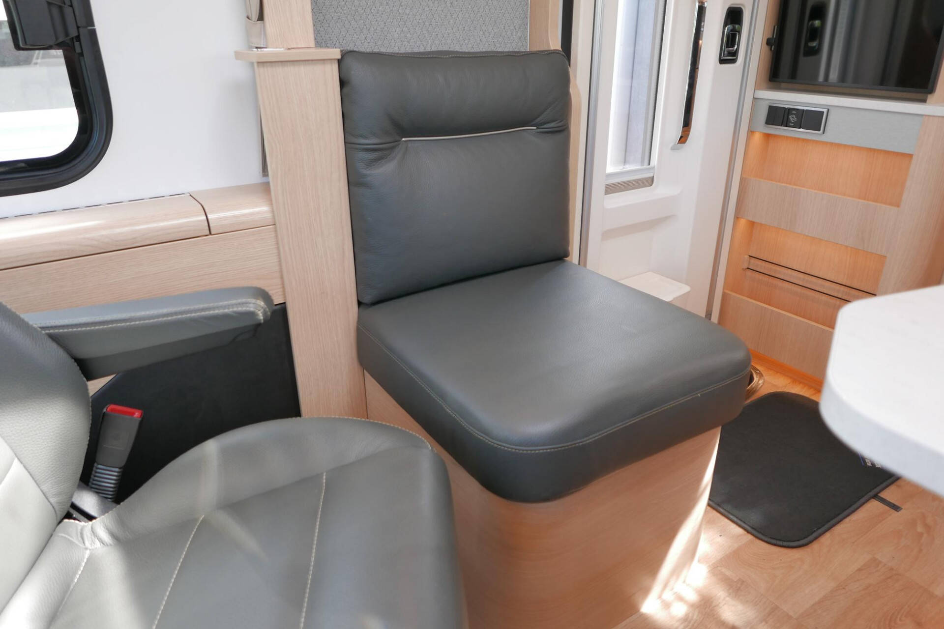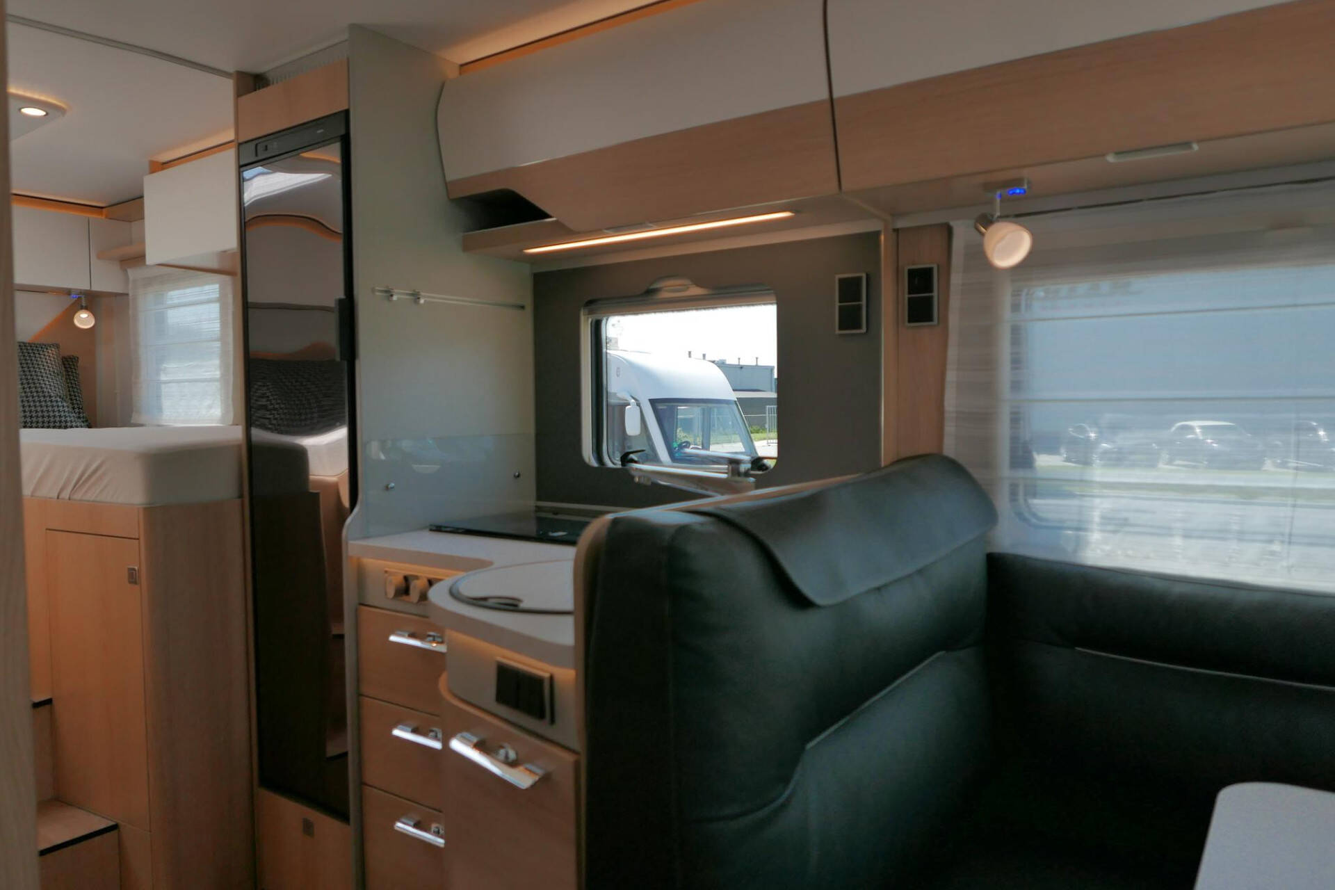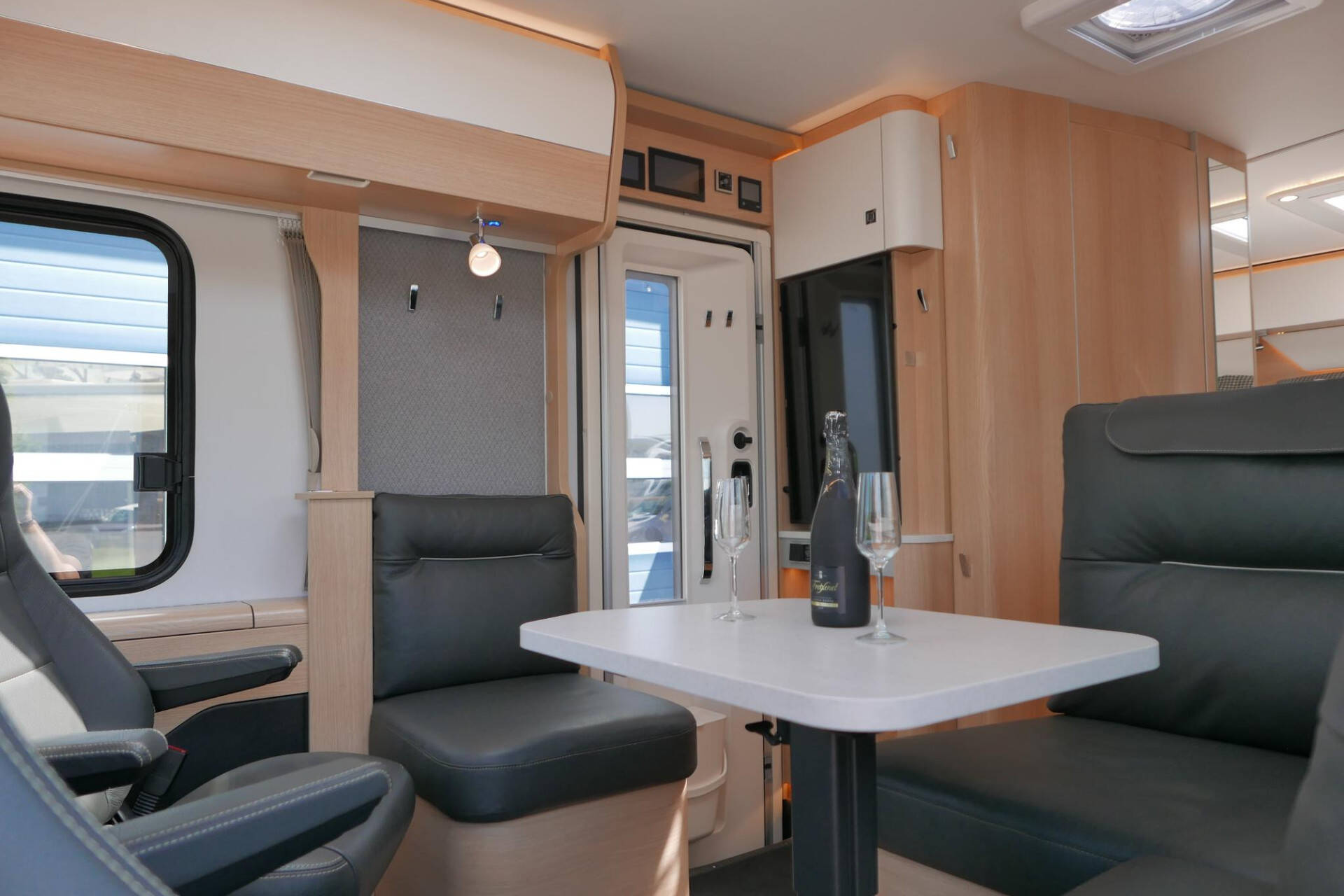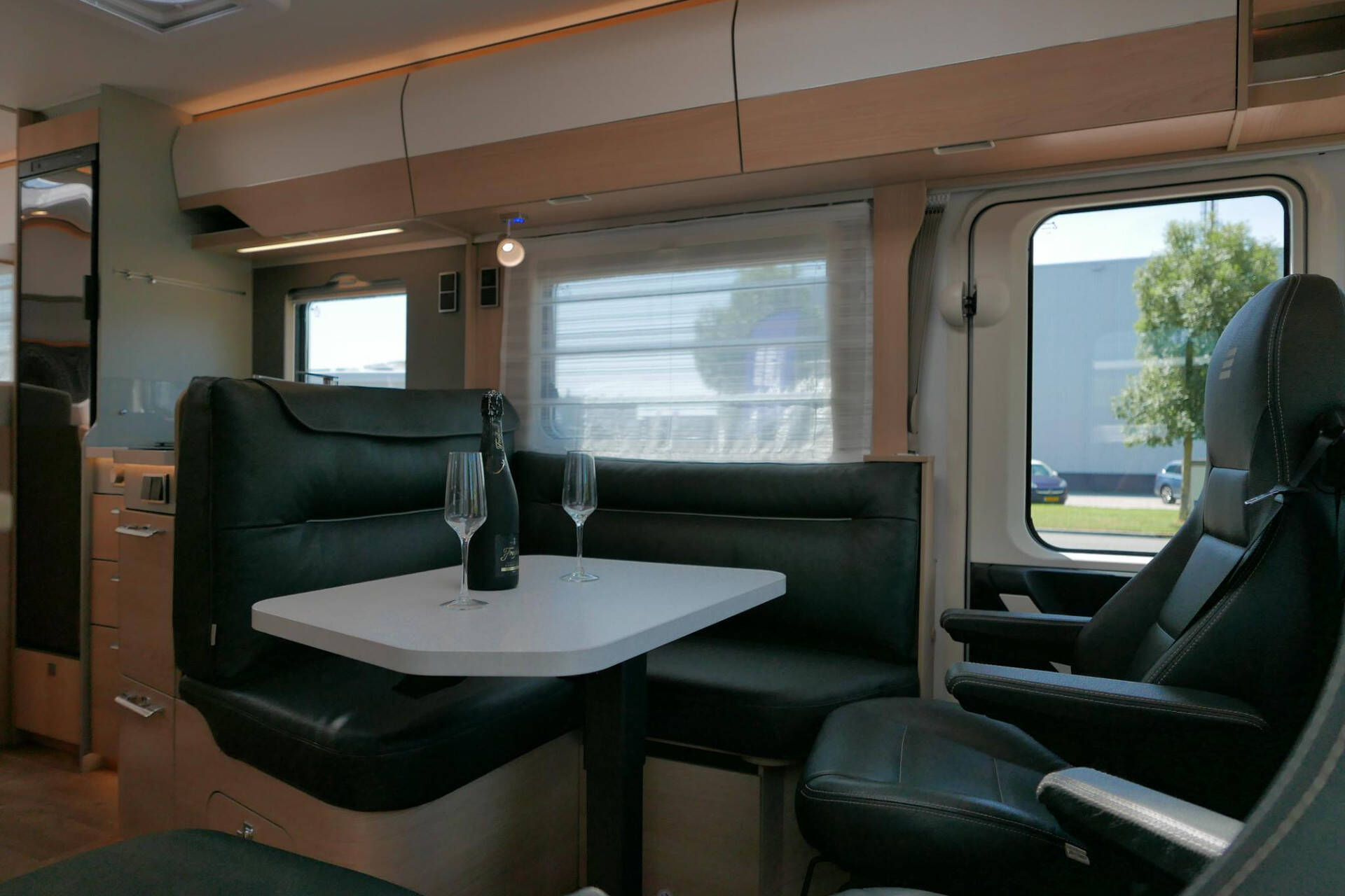 Door de voorstoelen te draaien ontstaat een gezellige en ruime zithoek met L-zit. De tafel is in lengte en breedte verschuifbaar. Het Grand Oak meubeldecor in combinatie met de luxe leder Grigio bekleding geven de zithoek een moderne uitstraling. De bovenkastjes geven een extra ruimtelijk gevoel en stahoogte. Door het AL-KO chassis beschikt deze camper over een volledig vlakke vloer. In de mee verwarmde dubbele bodem bevindt zich, naast de 180 l schoon- en 150 l vuilwatertank, extra opbergruimte. Deze ruimte is doormiddel van de luiken in de vloer en via de kleppen aan de buitenkant te bereiken is. Uiteraard zijn alle ramen en de toegangsdeur voorzien van horren en plisséverduistering.