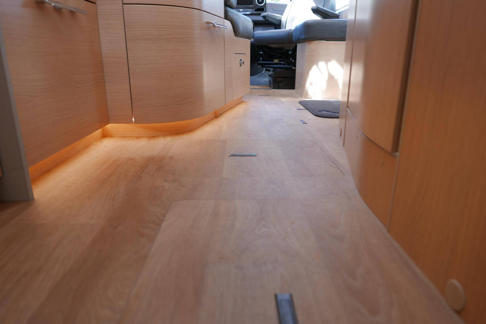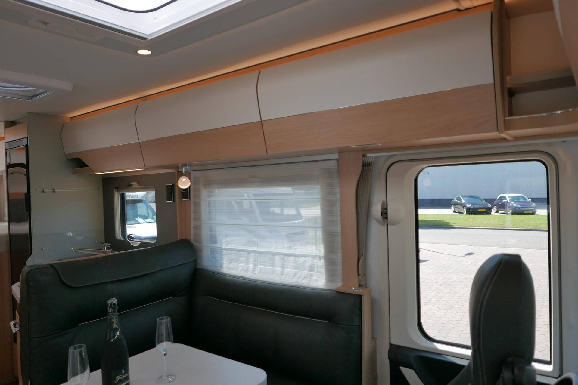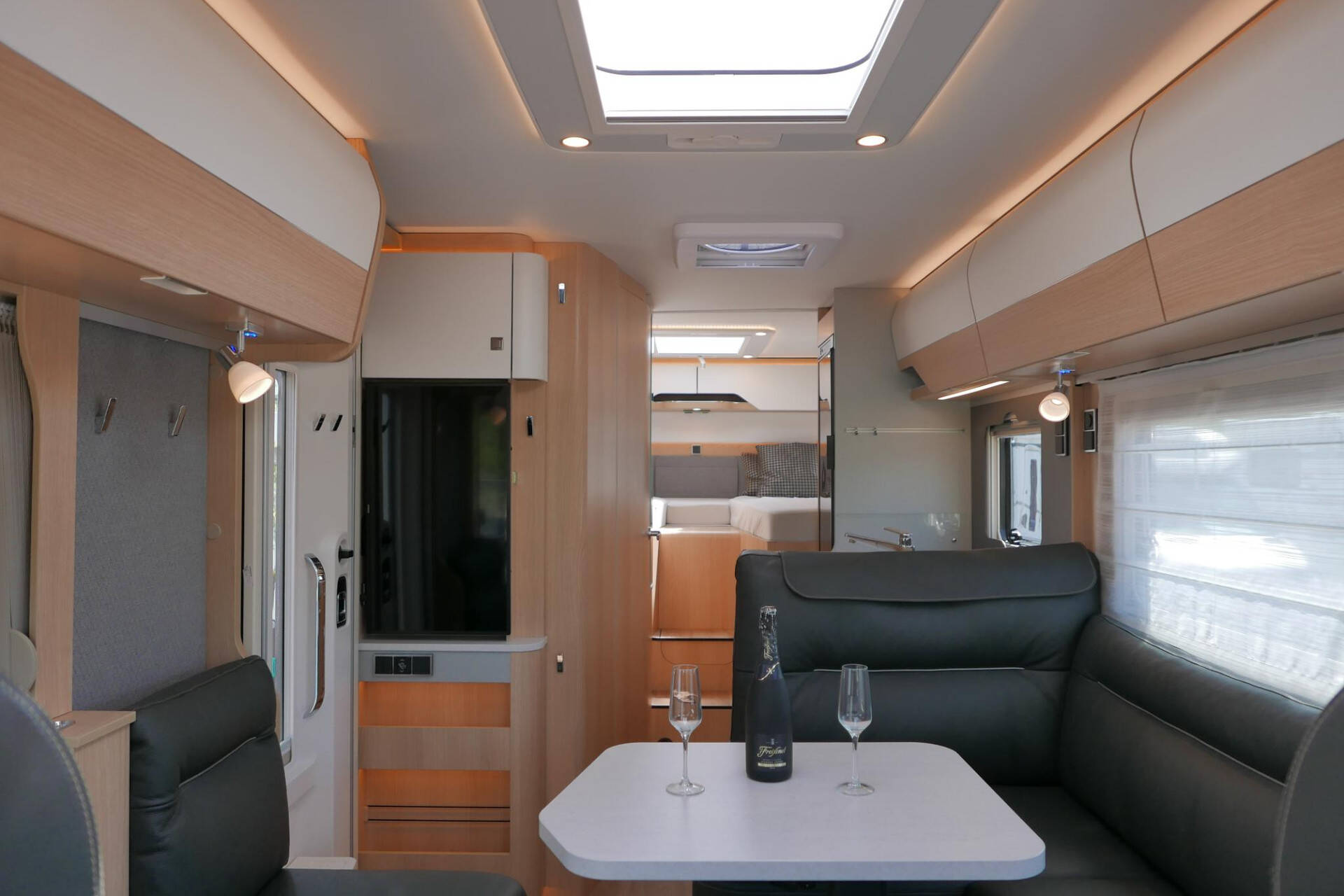 Door de voorstoelen te draaien ontstaat een gezellige en ruime zithoek met L-zit. De tafel is in lengte en breedte verschuifbaar. Het Grand Oak meubeldecor in combinatie met de luxe leder Grigio bekleding geven de zithoek een moderne uitstraling. De bovenkastjes geven een extra ruimtelijk gevoel en stahoogte. Door het AL-KO chassis beschikt deze camper over een volledig vlakke vloer. In de mee verwarmde dubbele bodem bevindt zich, naast de 180 l schoon- en 150 l vuilwatertank, extra opbergruimte. Deze ruimte is doormiddel van de luiken in de vloer en via de kleppen aan de buitenkant te bereiken is. Uiteraard zijn alle ramen en de toegangsdeur voorzien van horren en plisséverduistering.