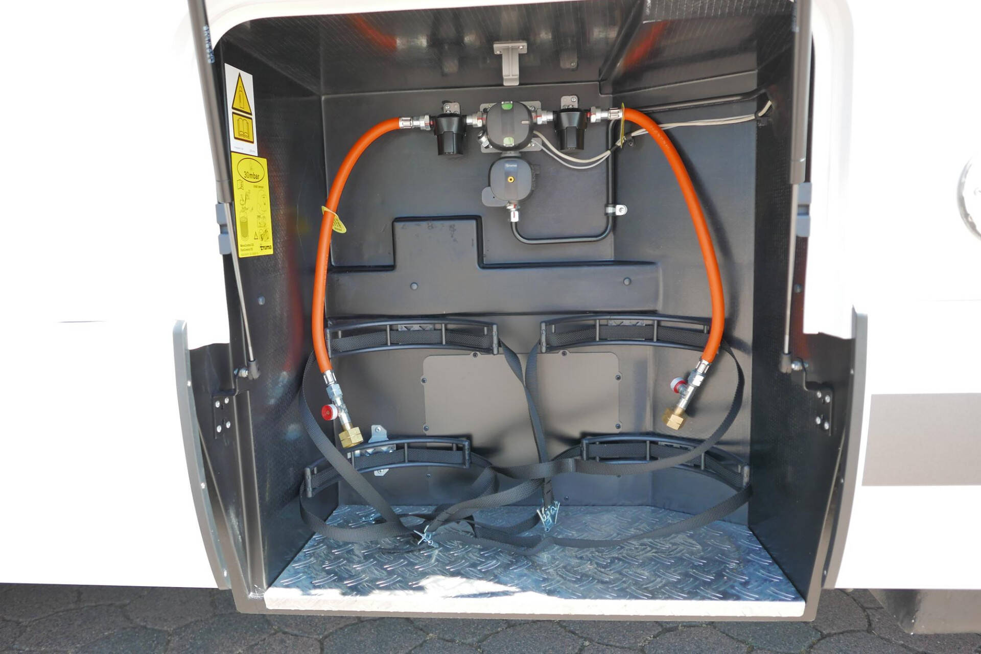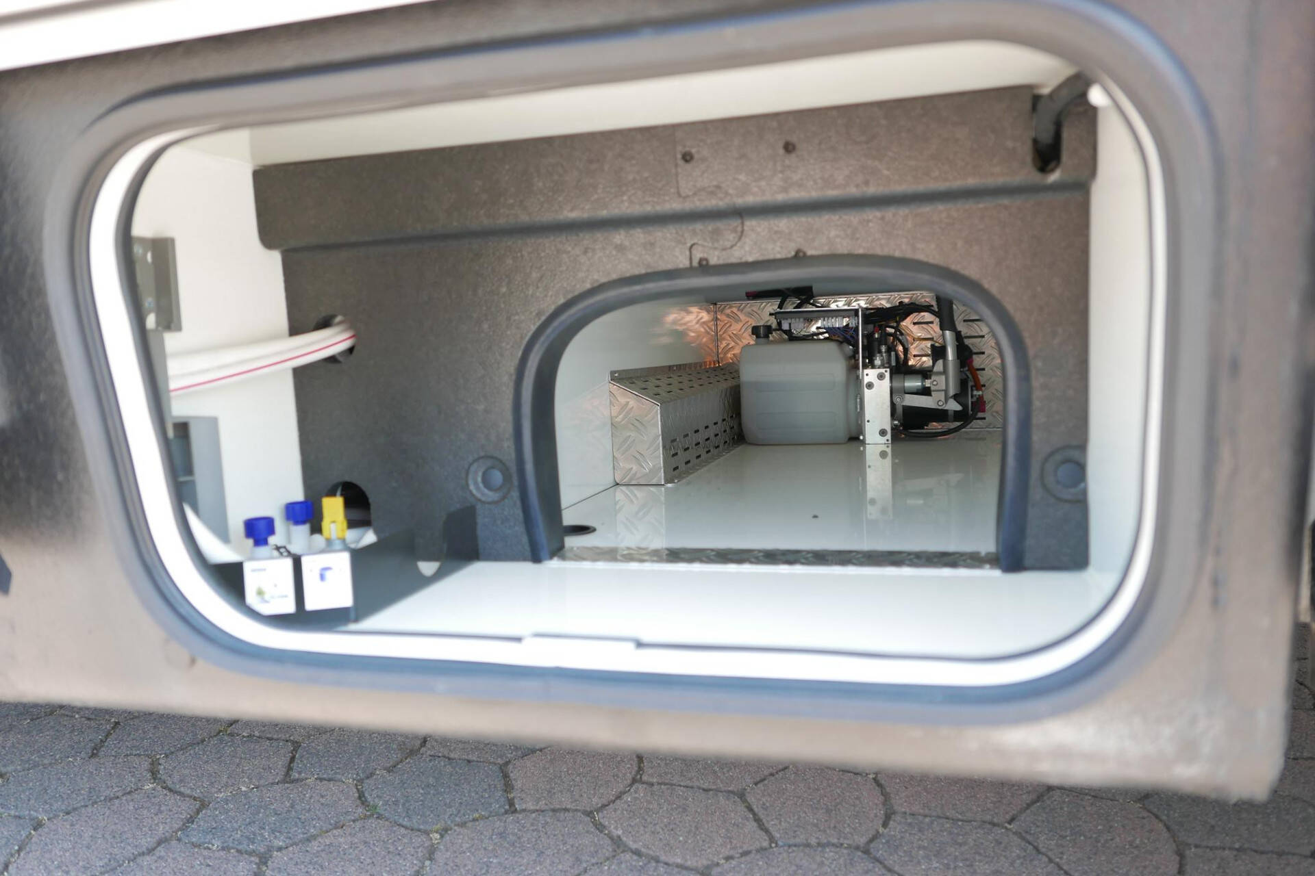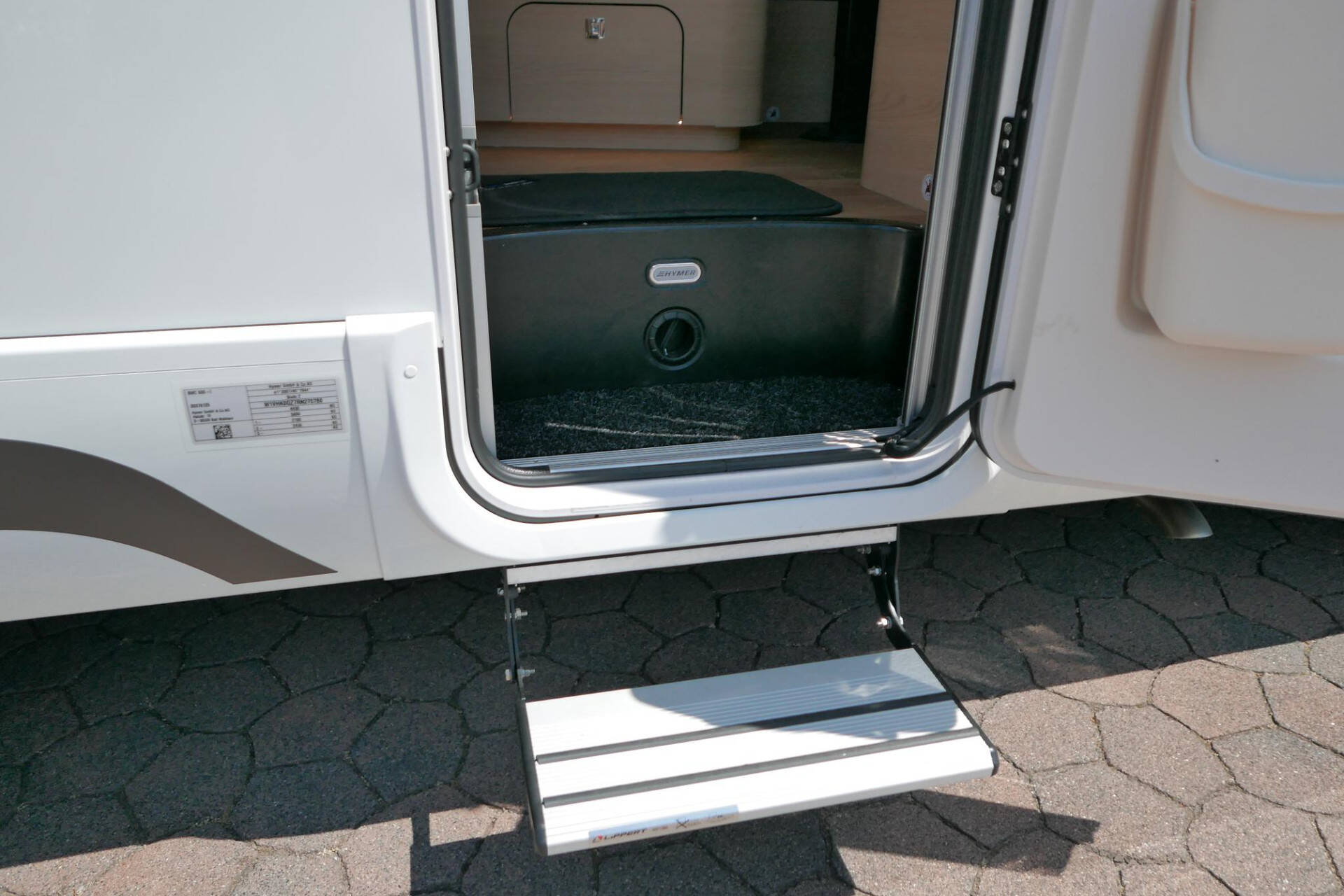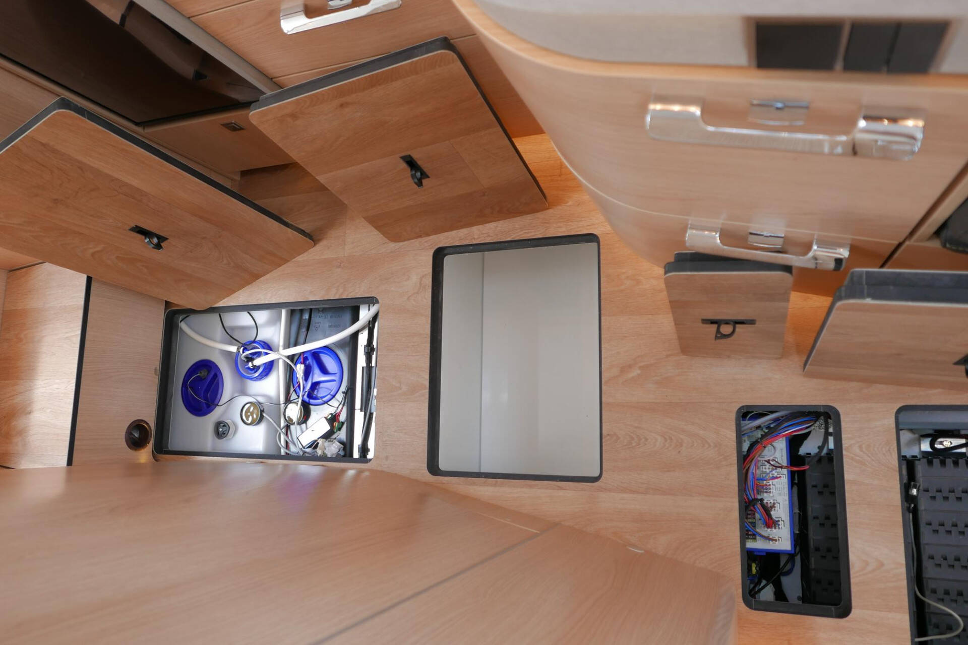 Door de voorstoelen te draaien ontstaat een gezellige en ruime zithoek met L-zit. De tafel is in lengte en breedte verschuifbaar. Het Grand Oak meubeldecor in combinatie met de luxe leder Grigio bekleding geven de zithoek een moderne uitstraling. De bovenkastjes geven een extra ruimtelijk gevoel en stahoogte. Door het AL-KO chassis beschikt deze camper over een volledig vlakke vloer. In de mee verwarmde dubbele bodem bevindt zich, naast de 180 l schoon- en 150 l vuilwatertank, extra opbergruimte. Deze ruimte is doormiddel van de luiken in de vloer en via de kleppen aan de buitenkant te bereiken is. Uiteraard zijn alle ramen en de toegangsdeur voorzien van horren en plisséverduistering.