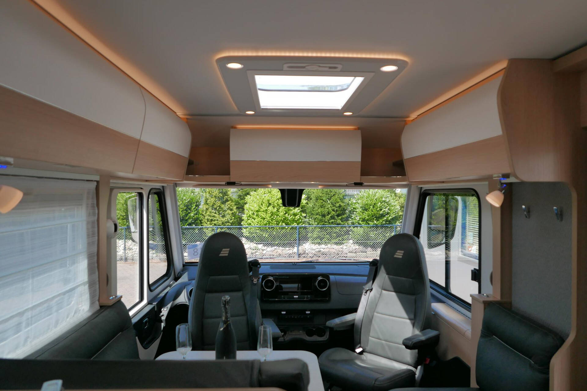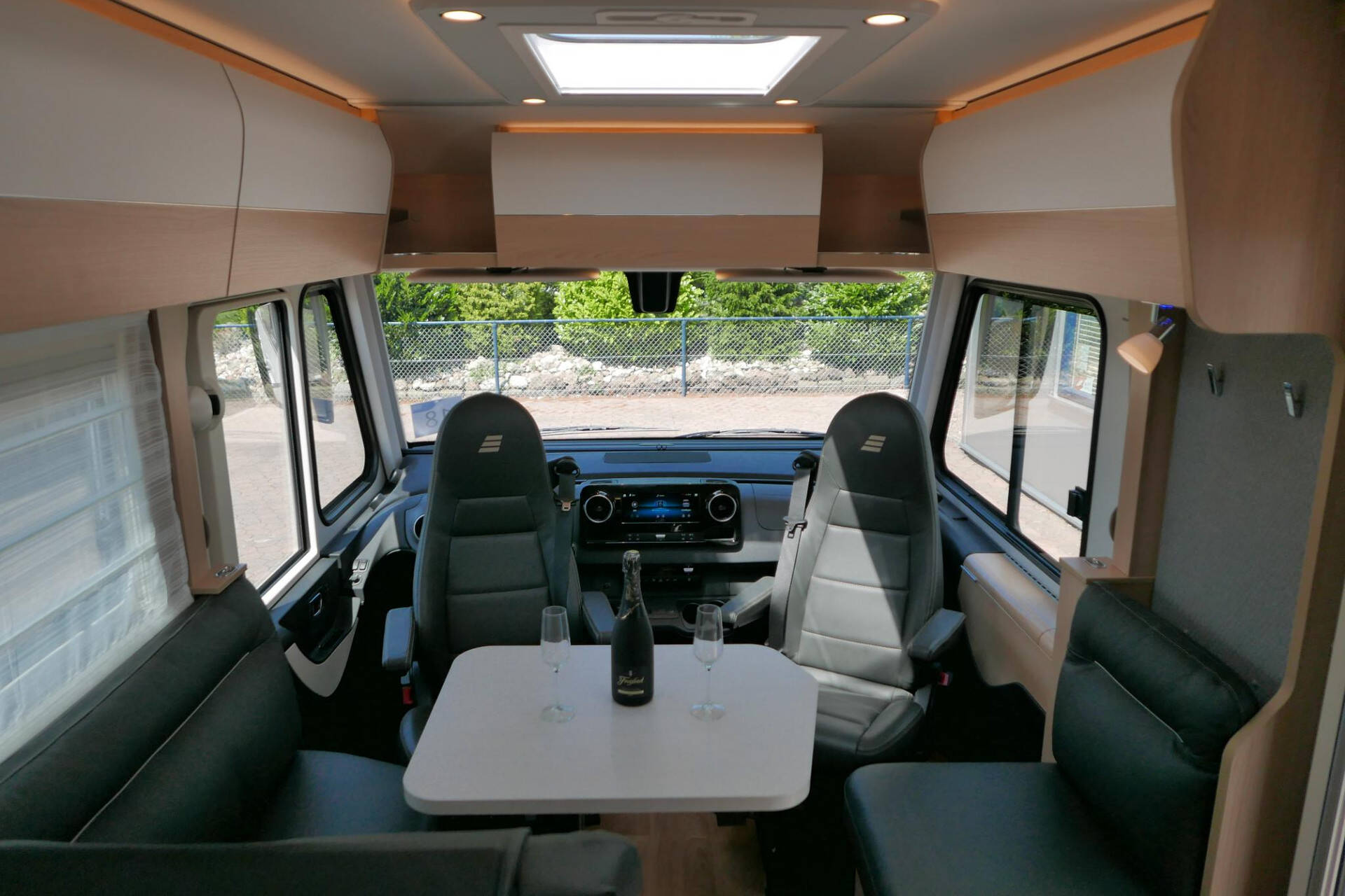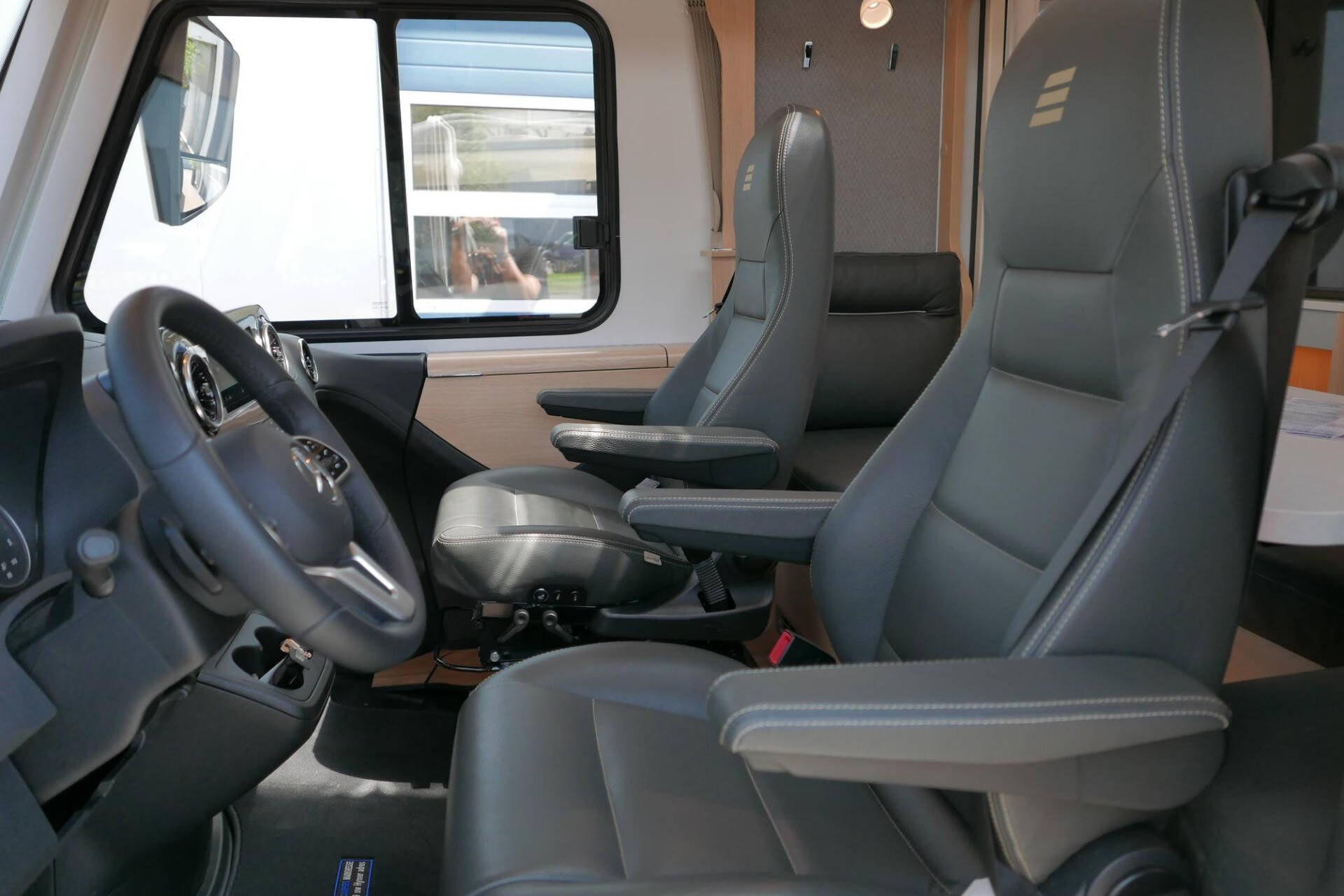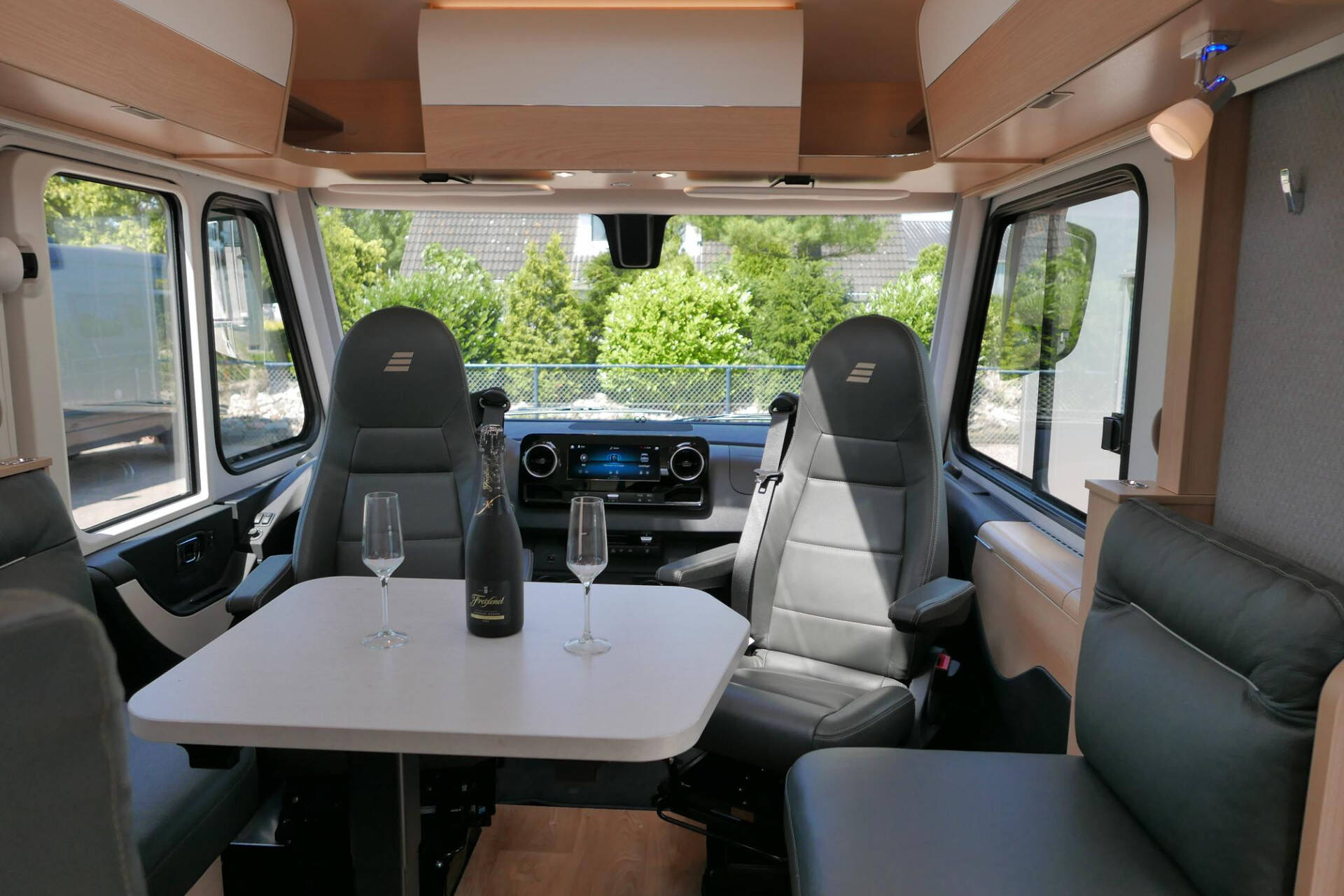 In de cabine van deze integraal camper valt meteen het waanzinnige panorama uitzicht op. Niet alleen om volop te genieten van de omgeving om u heen, maar ook voor een goed overzicht op het verkeer tijdens het rijden. De cockpit is voorzien van het luxe Mercedes-Benz MBUX multimediasysteem met 10,25 inch scherm voor onder andere navigatie, achteruitrijcamera en media. De 2 comfortabele pilotenstoelen zijn volledig verstelbaar en draaibaar.