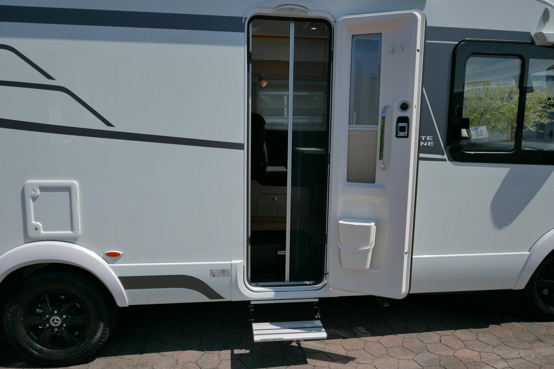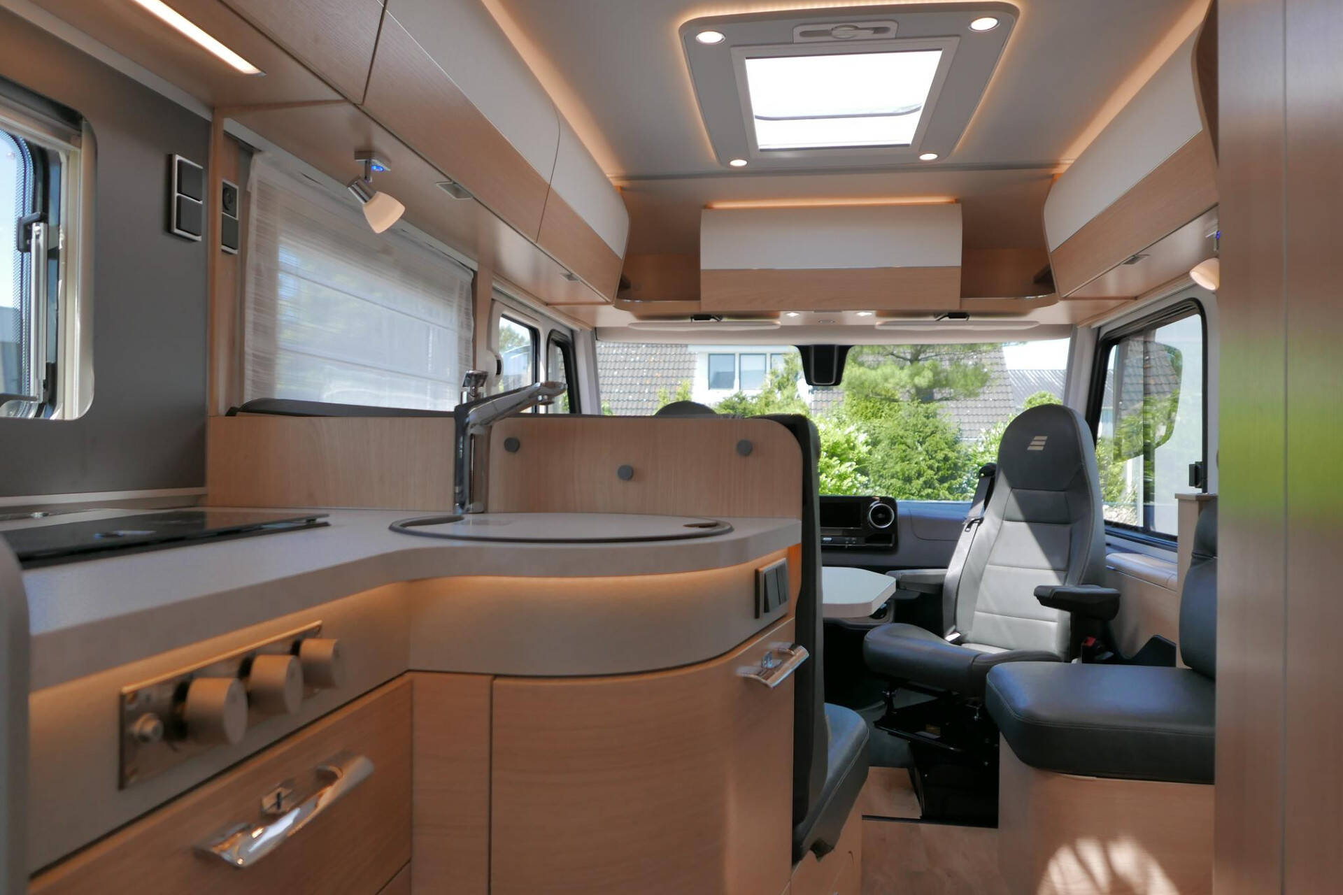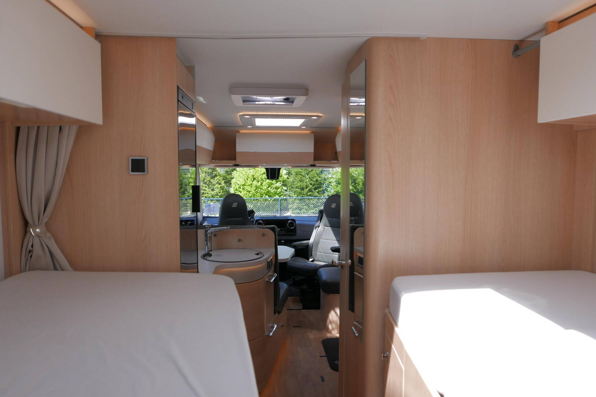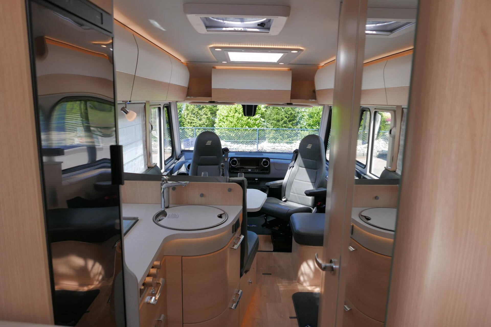 In de cabine van deze integraal camper valt meteen het waanzinnige panorama uitzicht op. Niet alleen om volop te genieten van de omgeving om u heen, maar ook voor een goed overzicht op het verkeer tijdens het rijden. De cockpit is voorzien van het luxe Mercedes-Benz MBUX multimediasysteem met 10,25 inch scherm voor onder andere navigatie, achteruitrijcamera en media. De 2 comfortabele pilotenstoelen zijn volledig verstelbaar en draaibaar.
