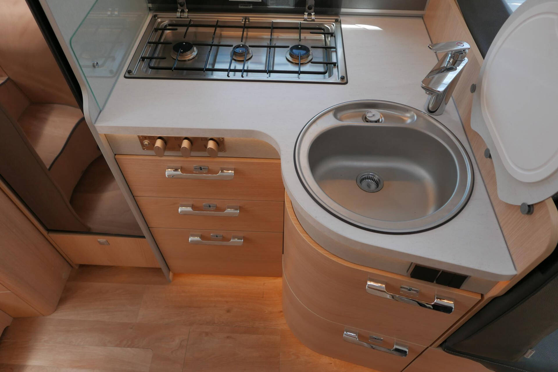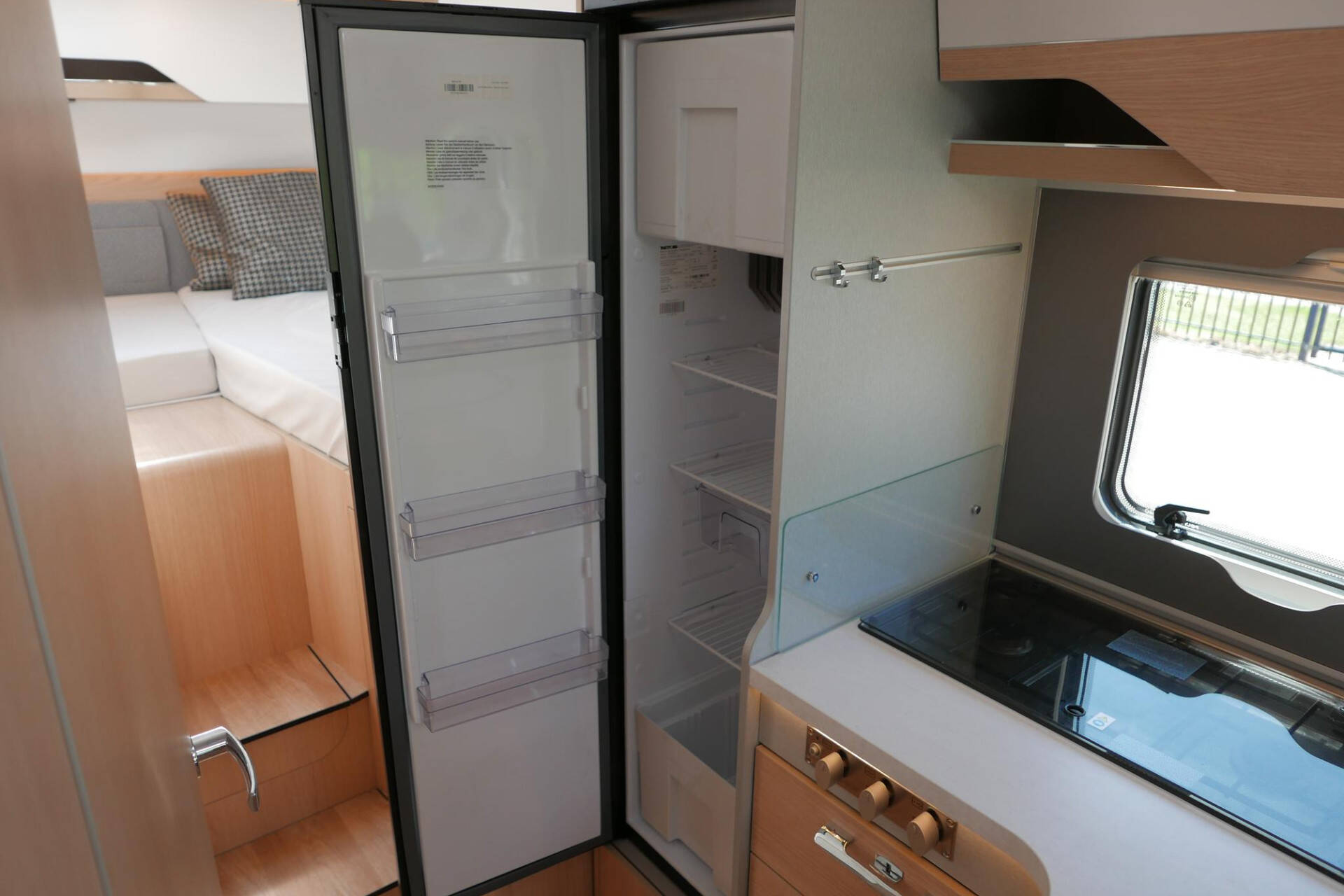 De ruime hoekkeuken is voorzien van diverse gelagerde boodschappenladen en een 3 pits gasstel. Hiernaast vindt u de hoge Smart-Tower koelkast 142 l met apart vriesgedeelte en automatische omschakeling 230V/12V/gas.