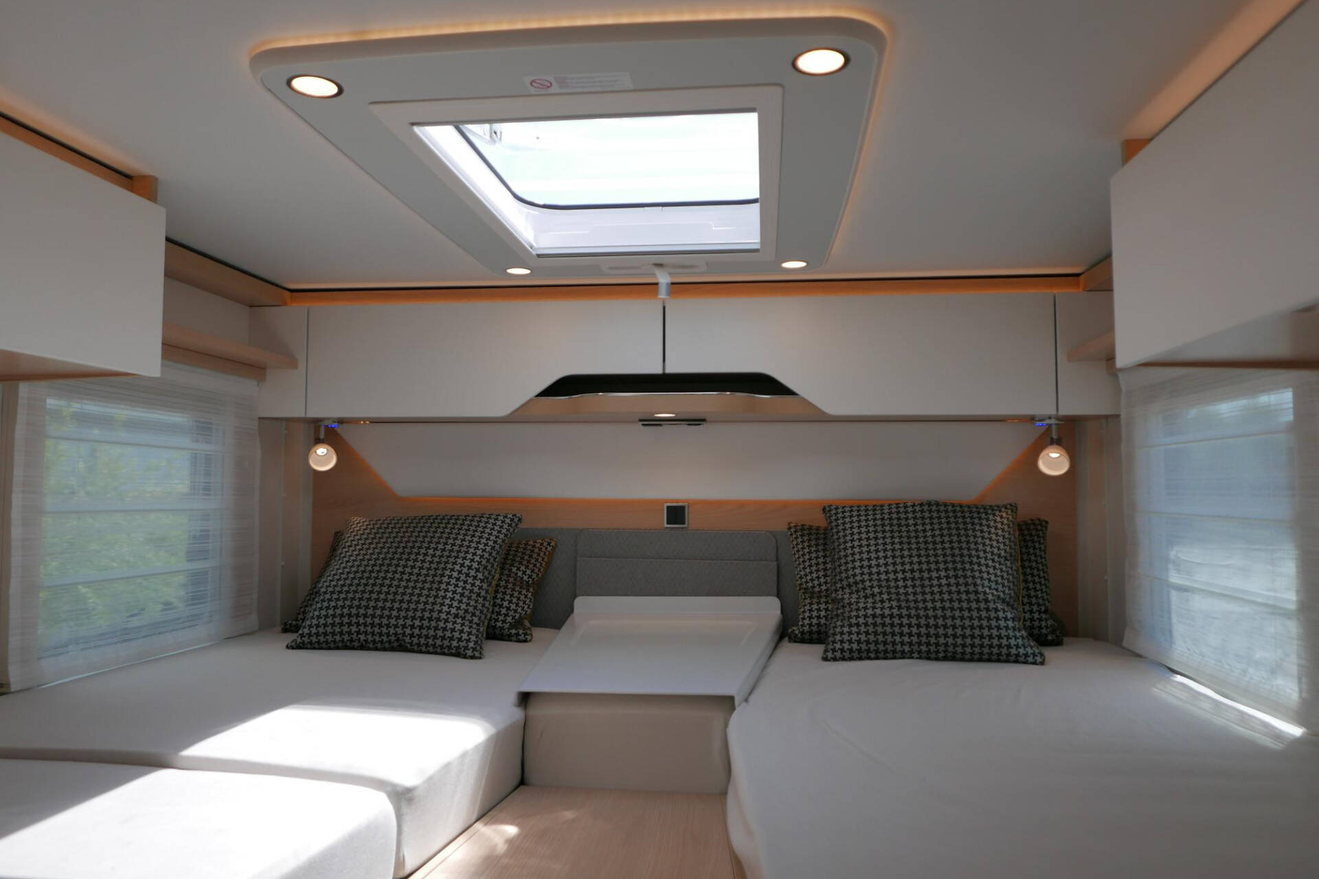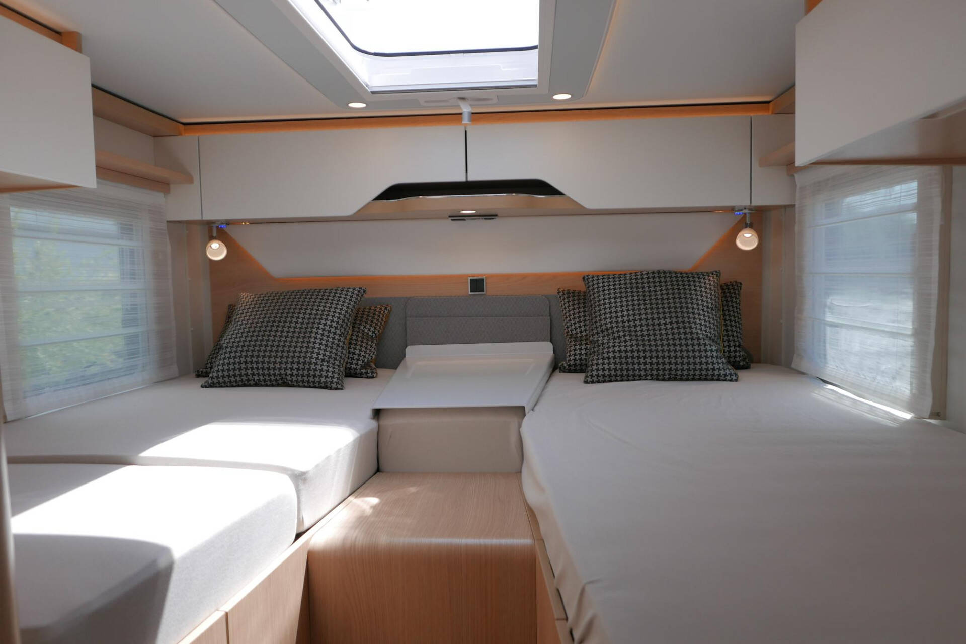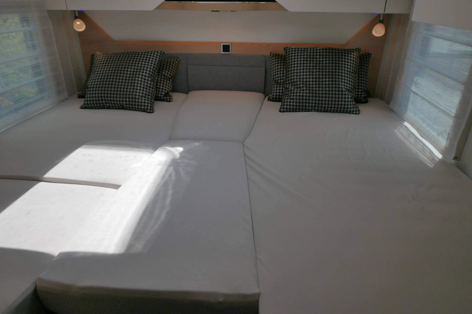 Achterin bevinden zich de 2 enkele lengte bedden. Doormiddel van het extra tussenstuk en kussen is één groot bed te creëren. Onder de bedden is aan beide kanten nog meer kastruimte te vinden.