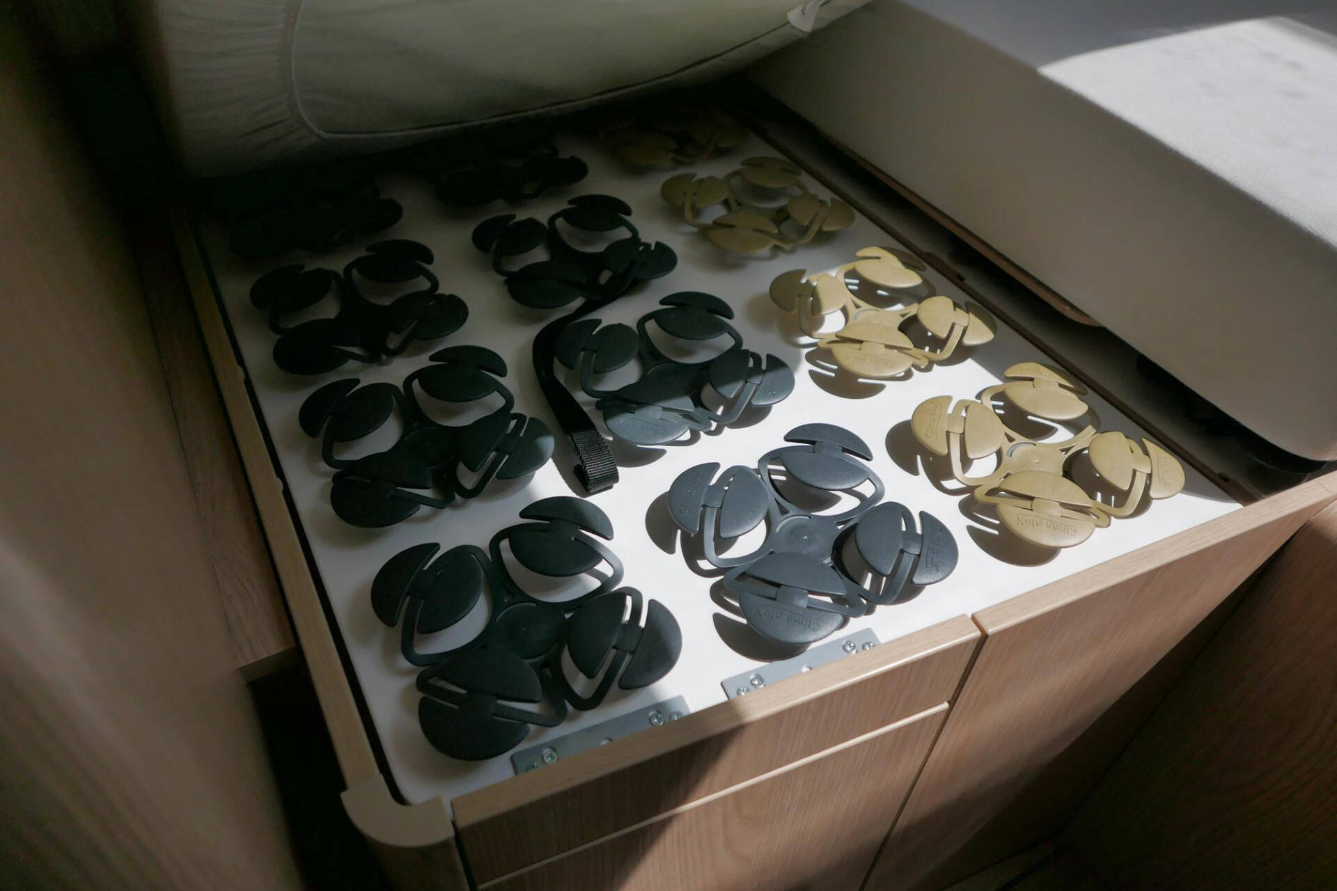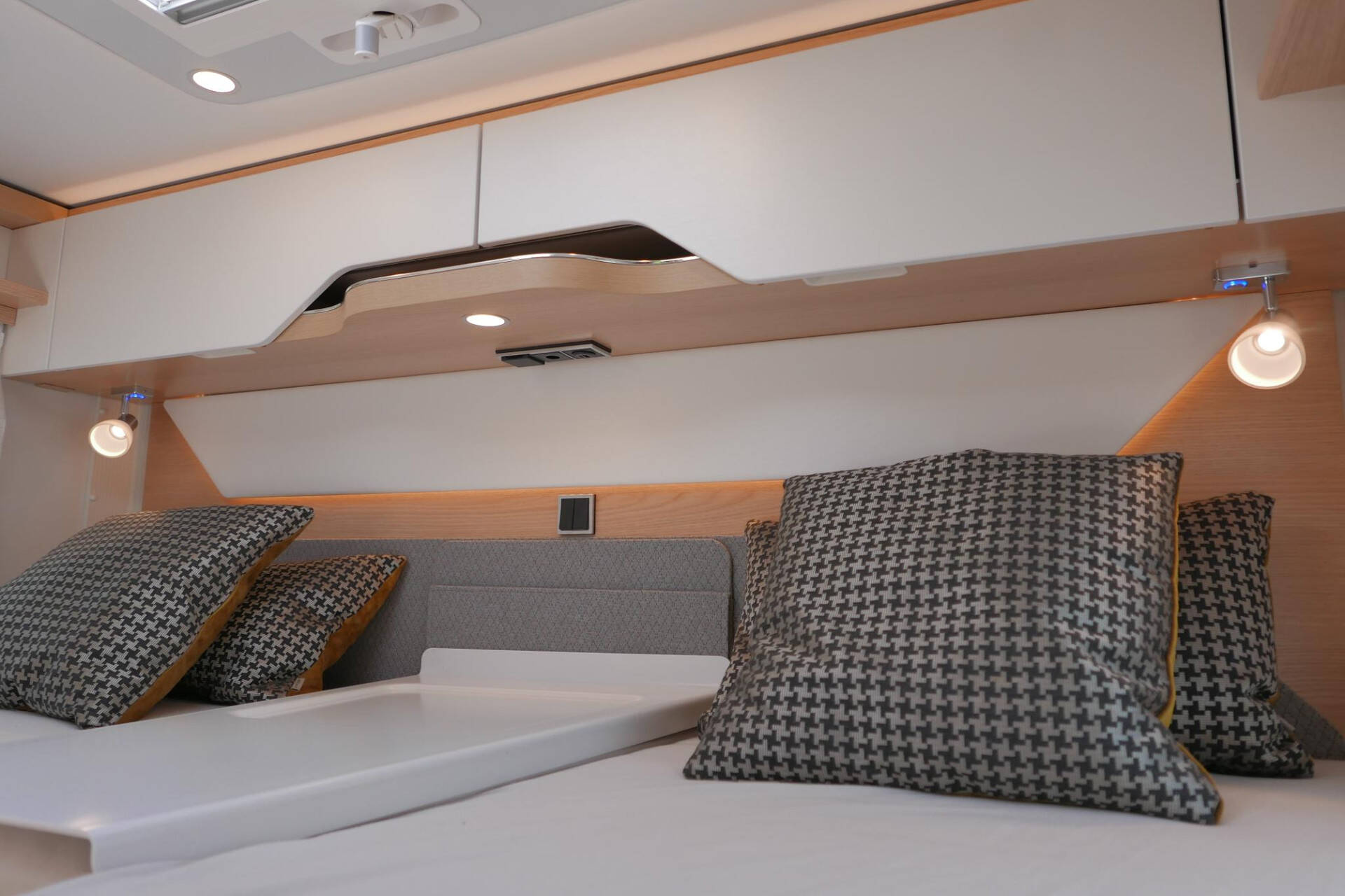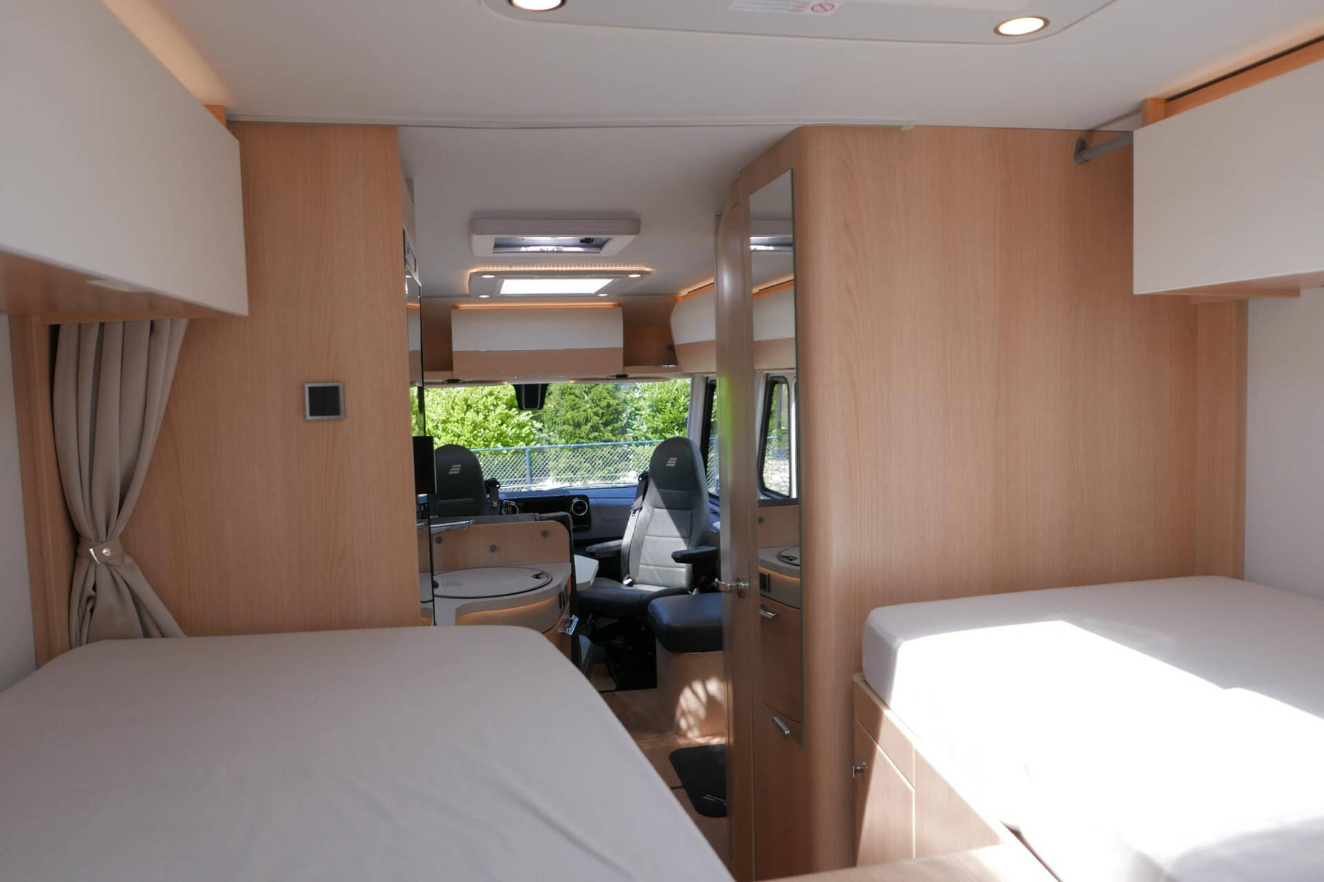 Achterin bevinden zich de 2 enkele lengte bedden. Doormiddel van het extra tussenstuk en kussen is één groot bed te creëren. Onder de bedden is aan beide kanten nog meer kastruimte te vinden.