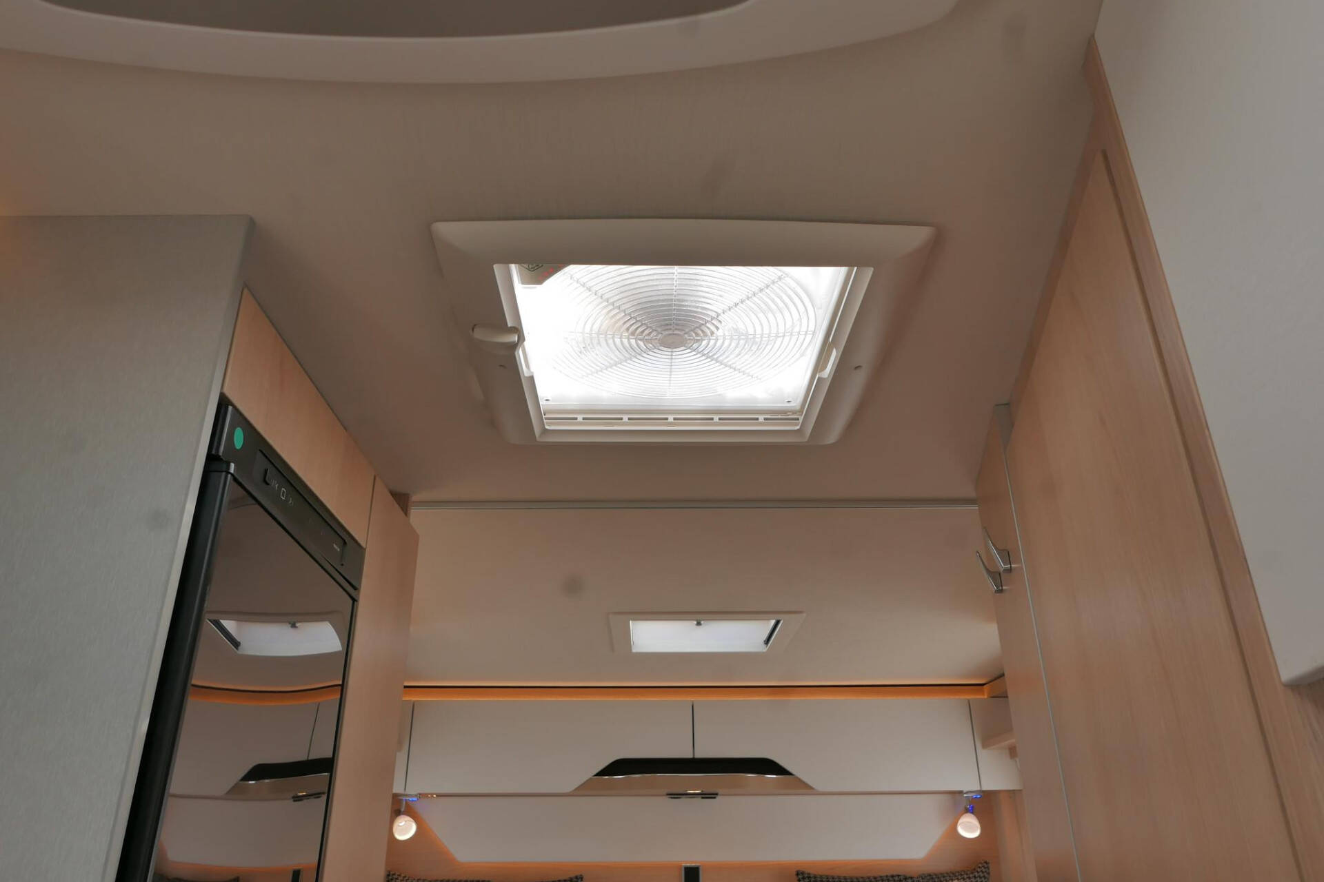 De keuken is uitgerust met diverse ruime gelagerde boodschappenladen, een 3 pits gasstel en daarnaast een grote Smart-Tower koelkast (142 L) met apart vriesgedeelte en automatische omschakeling 220V/12V/gas.