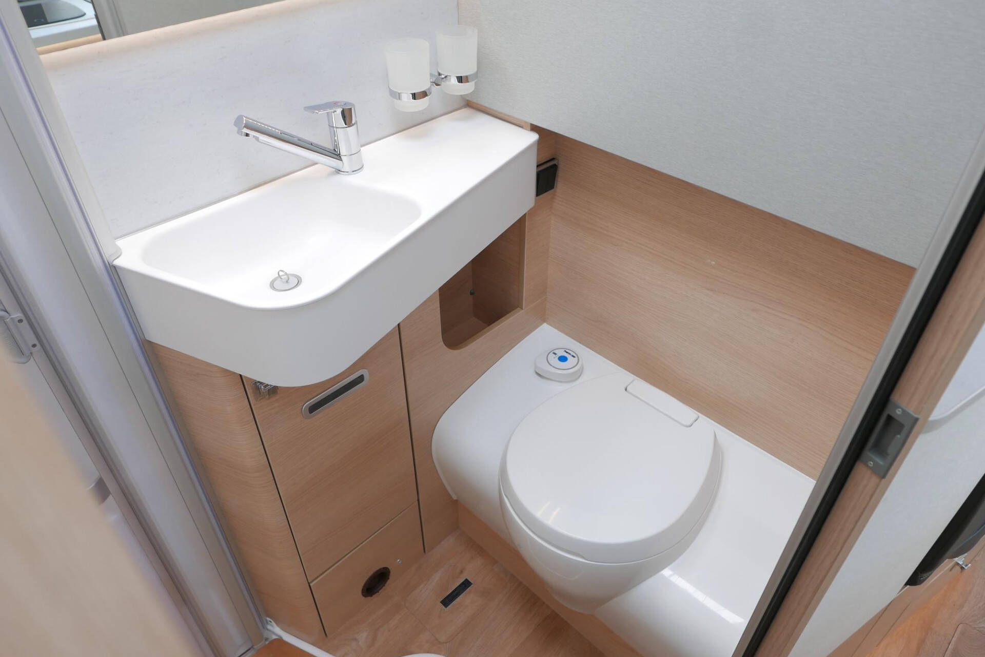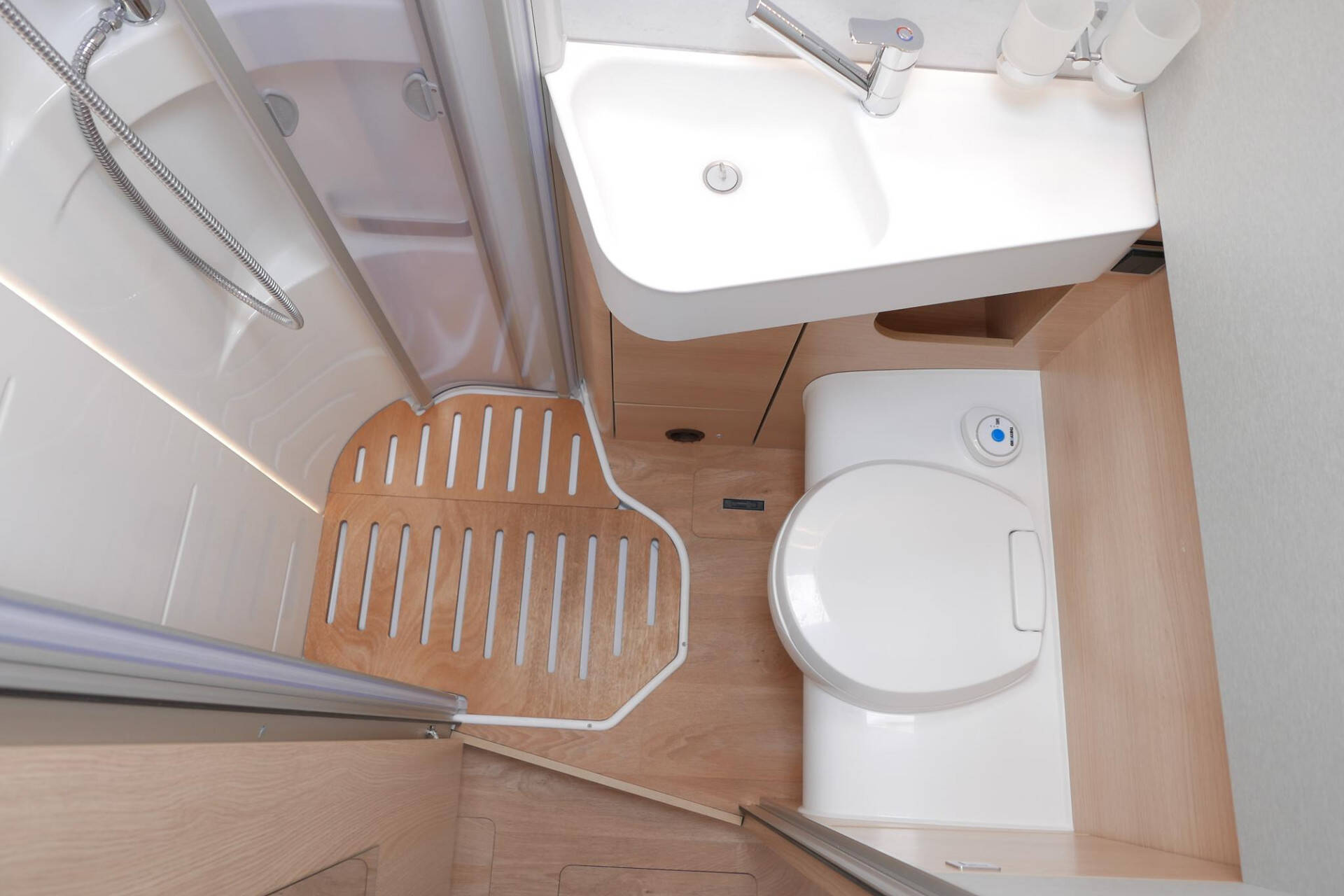 Tegenover de keuken vindt u de comfortabele toiletruimte met wastafel en ruime douchecabine. Ook vindt u hier een grote spiegel en diverse kastjes.