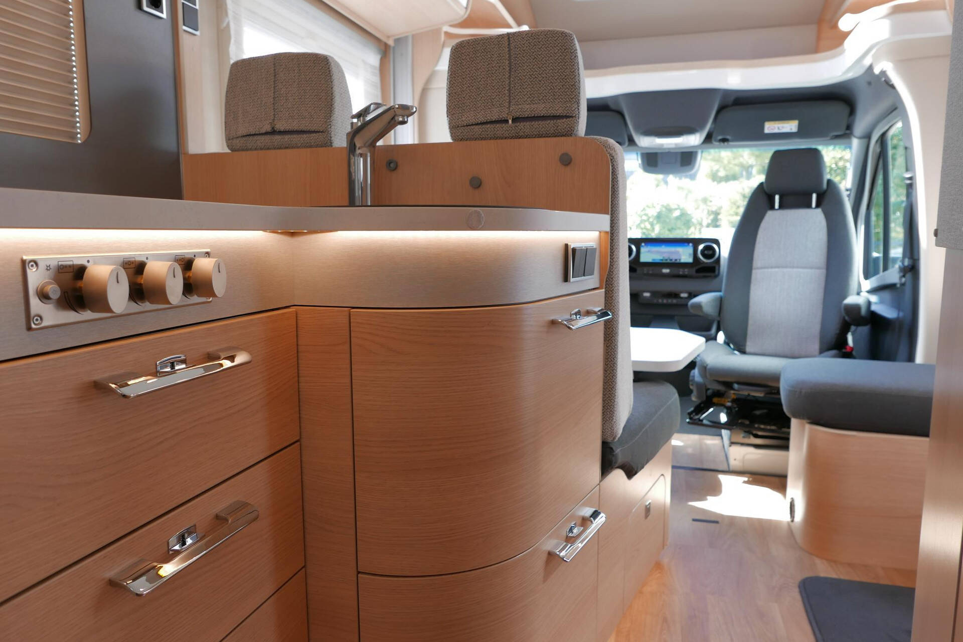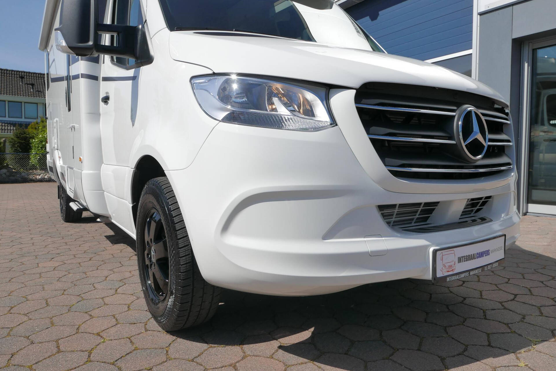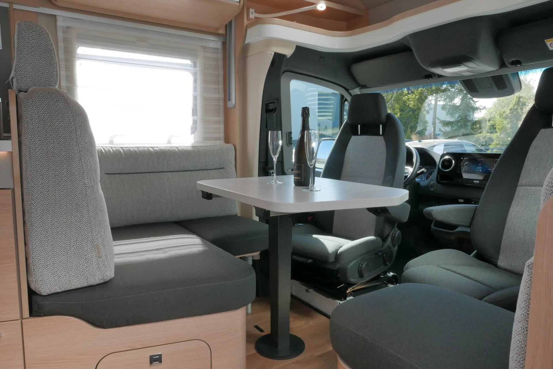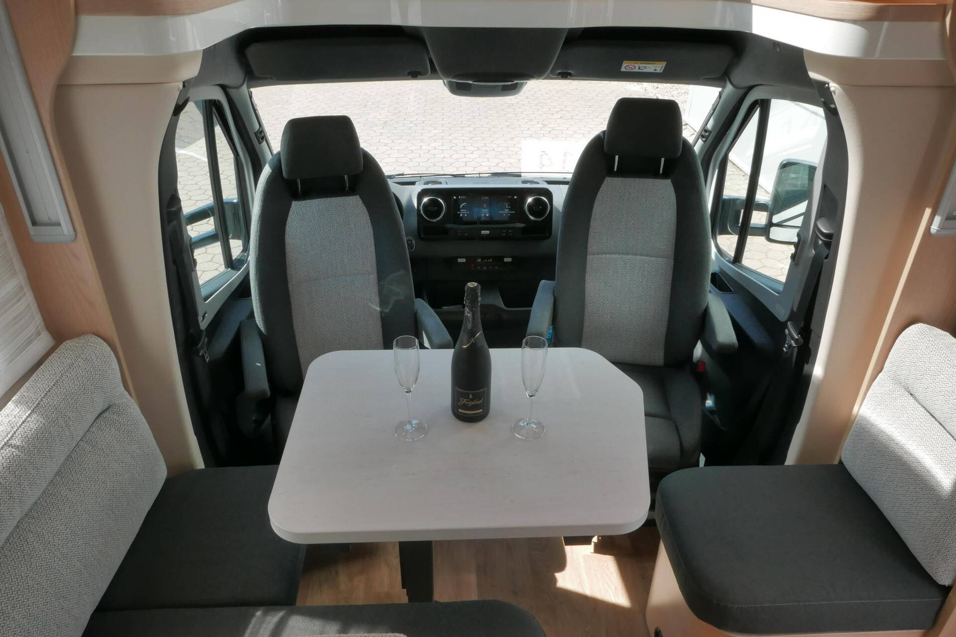 De cabine van deze half-integraalcamper is makkelijk toegankelijk via de bestuurders- en de passagiersdeur. De cabine is uitgerust met het Mercedes-Benz 10,25 inch MBUX multimedia systeem en 2 luxe pilotenstoelen die volledig verstelbaar en draaibaar zijn. Verder beschikt deze camper over: