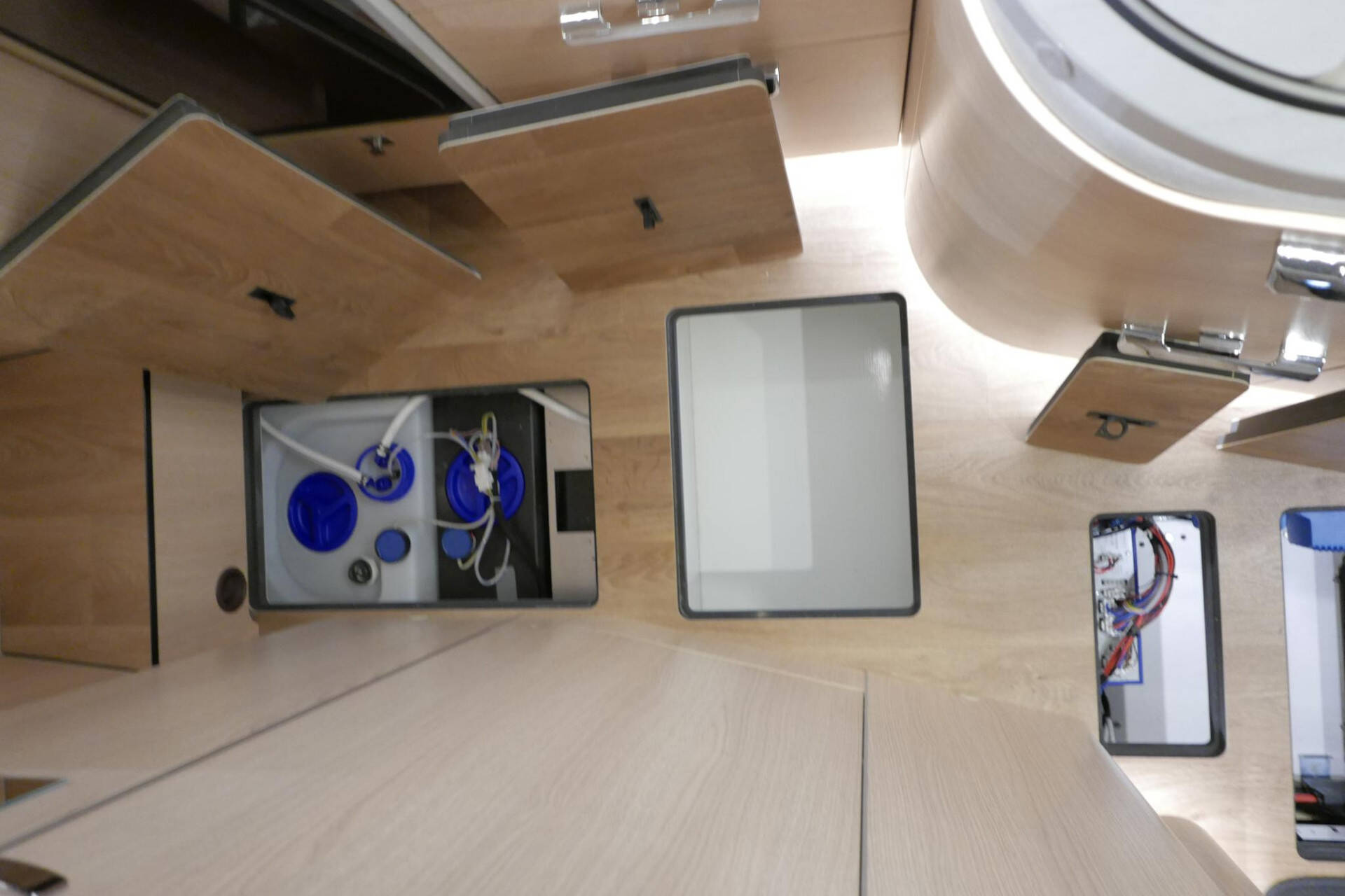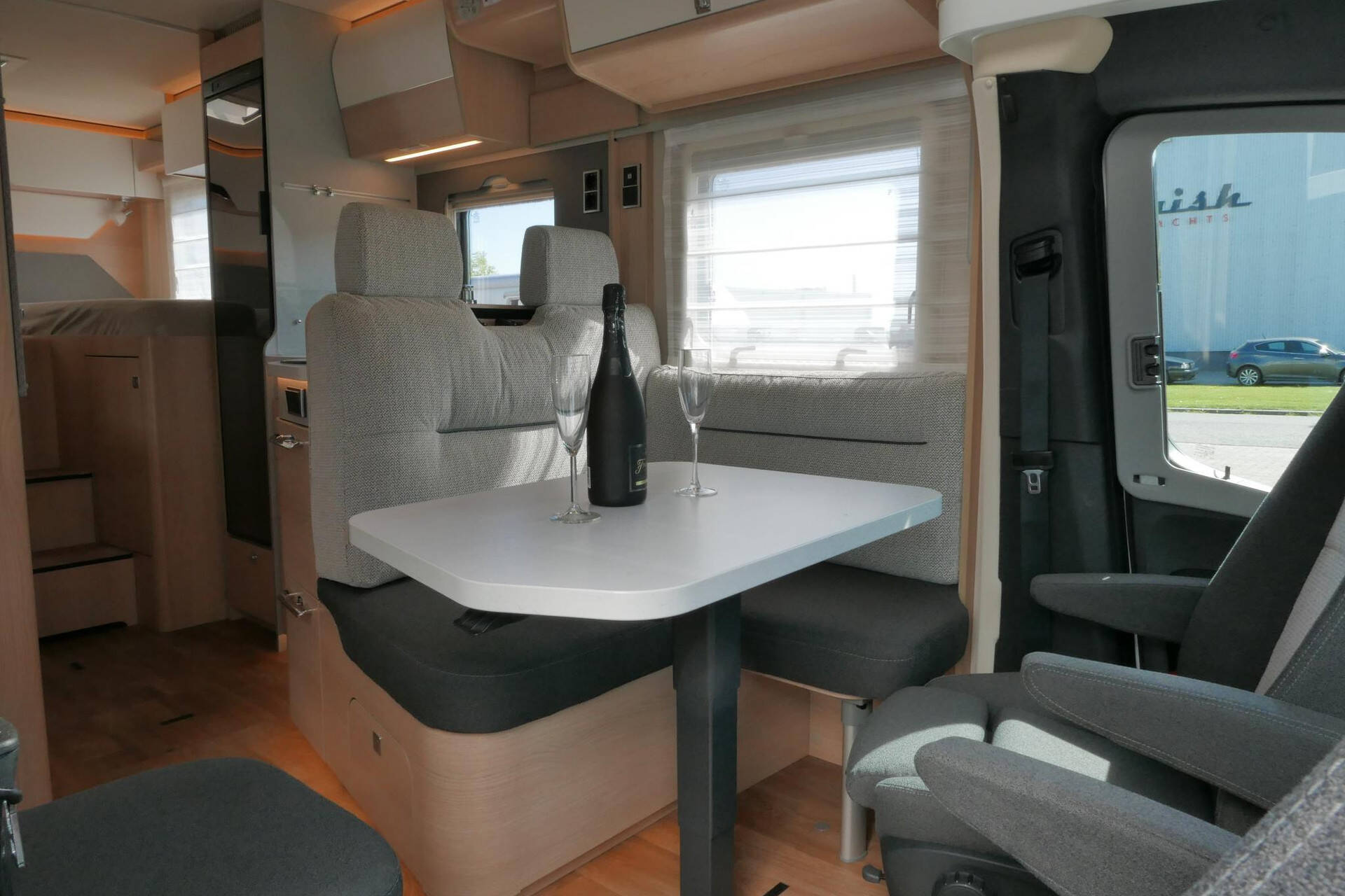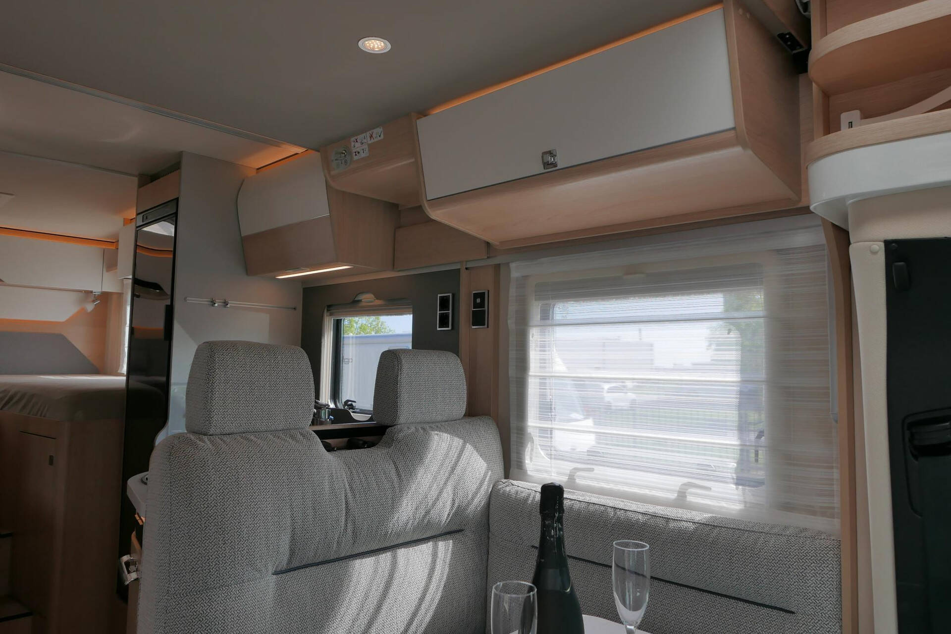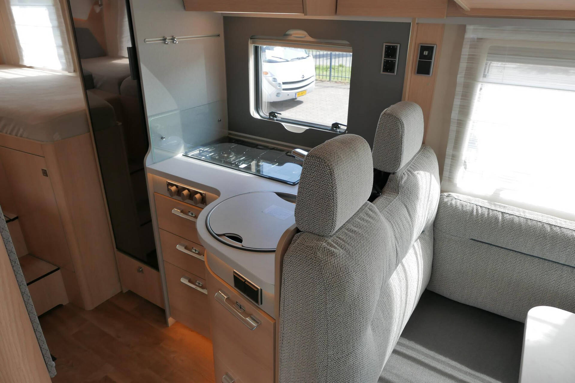 Door de voorstoelen te draaien ontstaat een ruime en gezellige zithoek met L-zit. Het Grand Oak meubeldecor in combinatie met de luxe Kitami bekleding geven de woonruimte een warme uitstraling. Tevens is deze half integraal uit gerust met een elektrische bedienbaar hefbed. Door het AL-KO maxi chassis beschikt deze camper over een volledig vlakke vloer met in de mee verwarmde dubbele bodem extra opbergruimte die ook vanaf de buitenkant te bereiken is. De 180 liter schoon- en 150 liter vuilwatertank zijn tevens in de dubbele bodem gesitueerd. Uiteraard zijn alle ramen en deuren voorzien van horren en plisséverduistering.