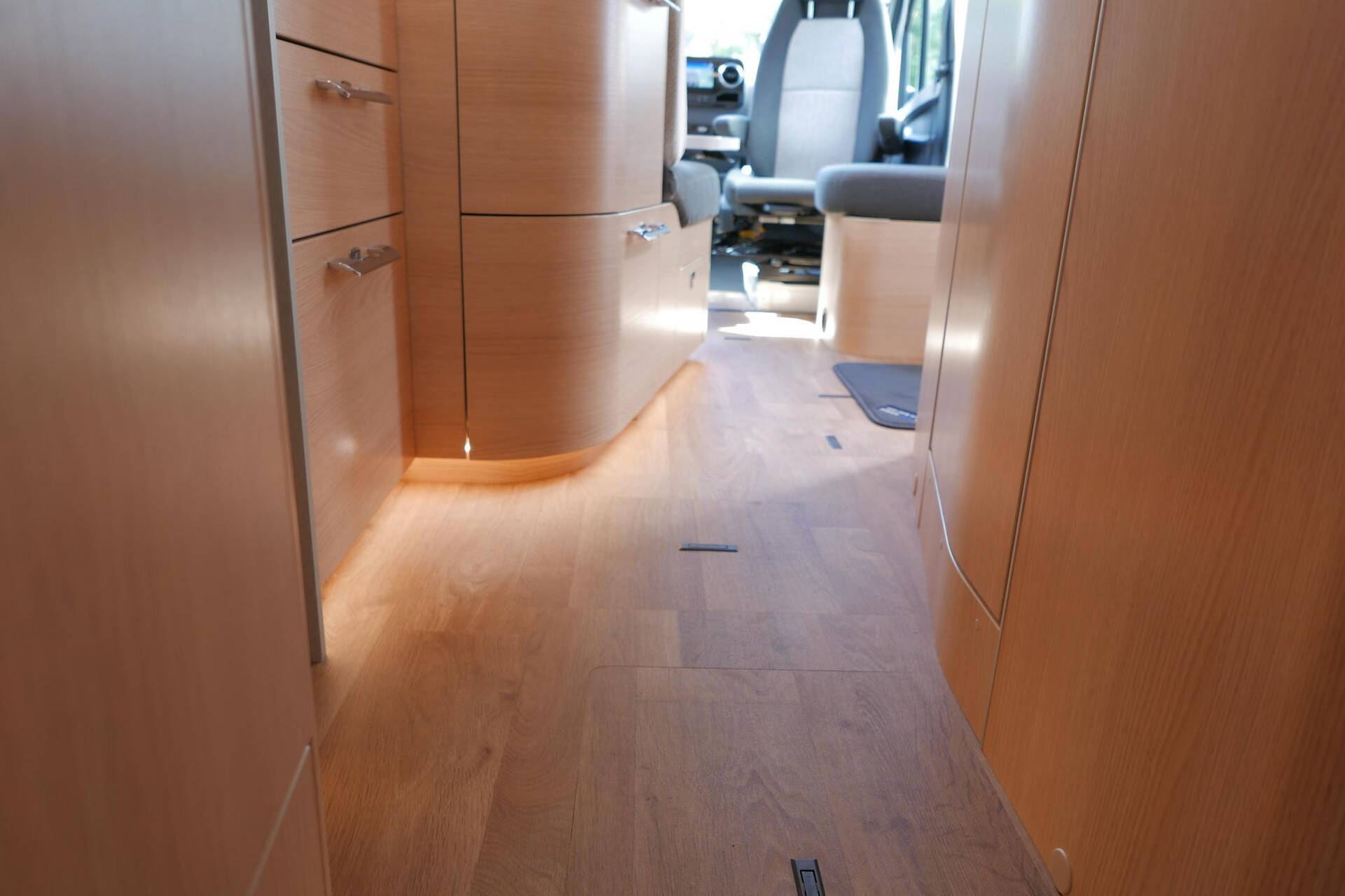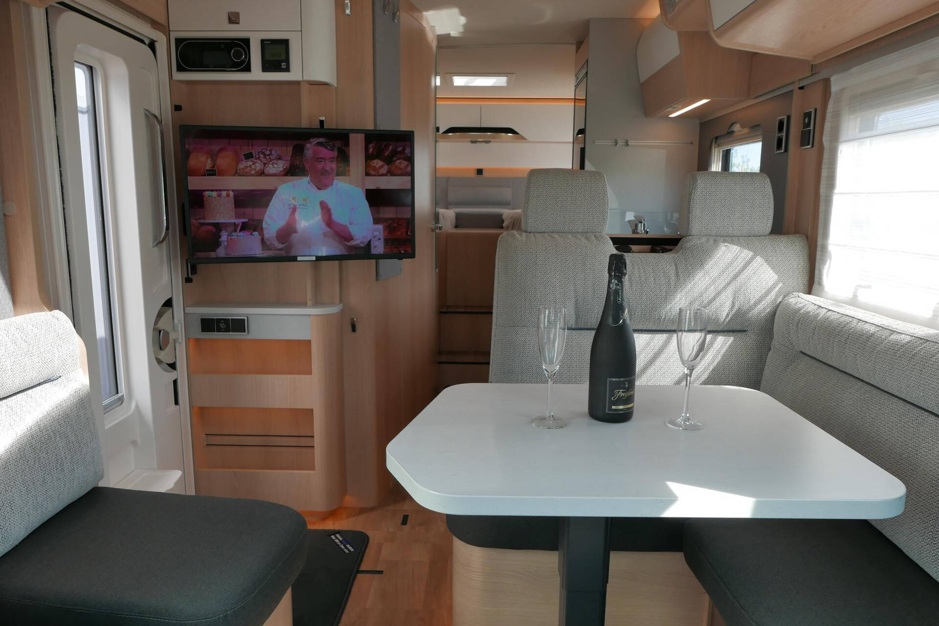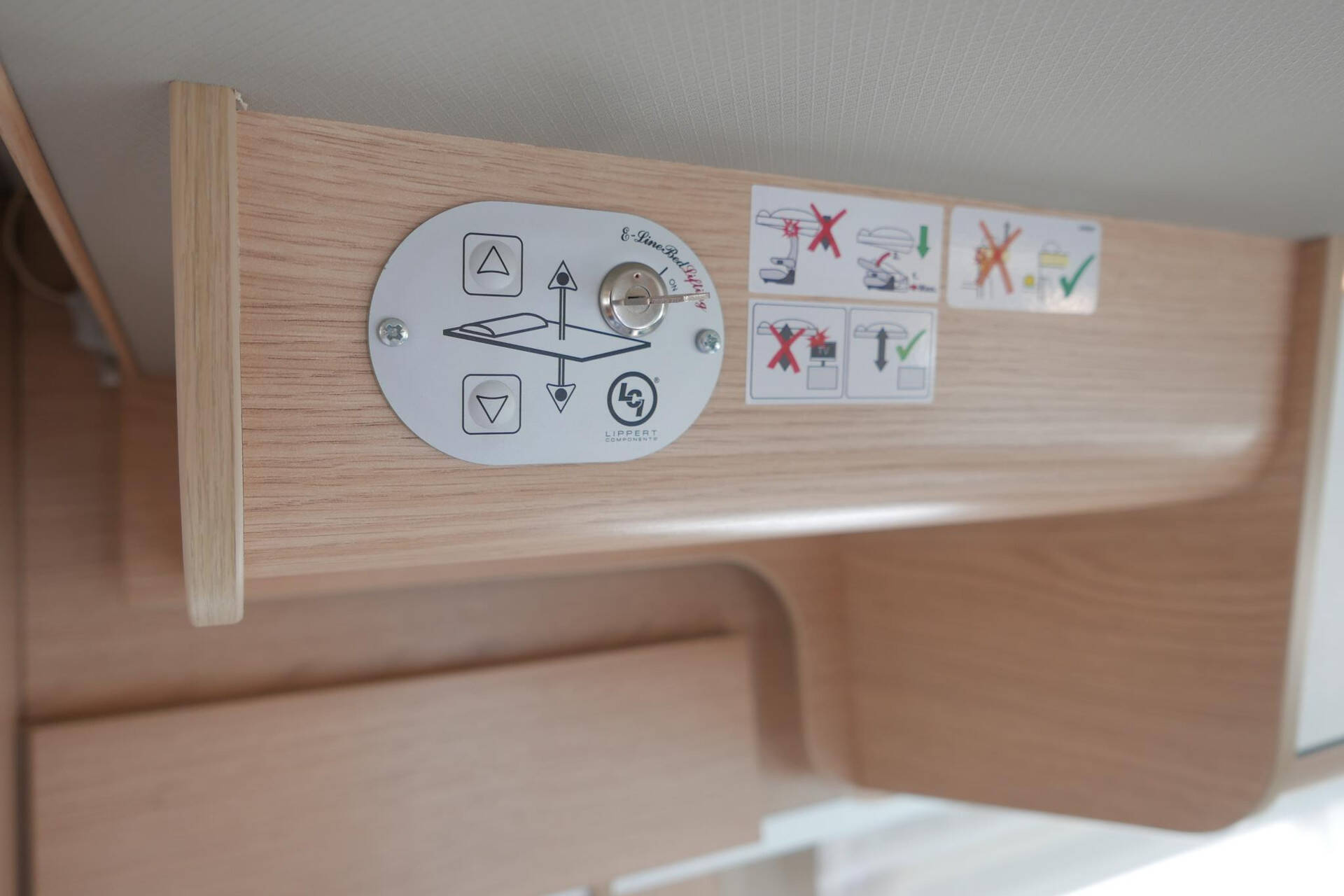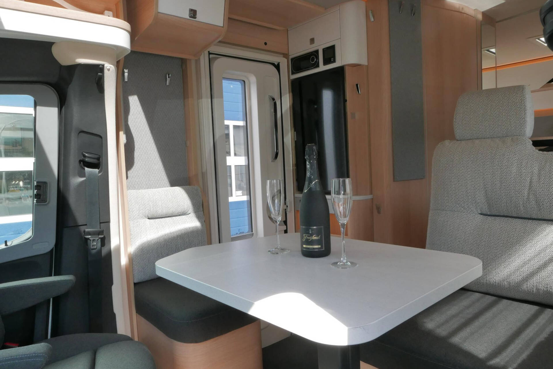Door de voorstoelen te draaien ontstaat een ruime en gezellige zithoek met L-zit. Het Grand Oak meubeldecor in combinatie met de luxe Kitami bekleding geven de woonruimte een warme uitstraling. Tevens is deze half integraal uit gerust met een elektrische bedienbaar hefbed. Door het AL-KO maxi chassis beschikt deze camper over een volledig vlakke vloer met in de mee verwarmde dubbele bodem extra opbergruimte die ook vanaf de buitenkant te bereiken is. De 180 liter schoon- en 150 liter vuilwatertank zijn tevens in de dubbele bodem gesitueerd. Uiteraard zijn alle ramen en deuren voorzien van horren en plisséverduistering.