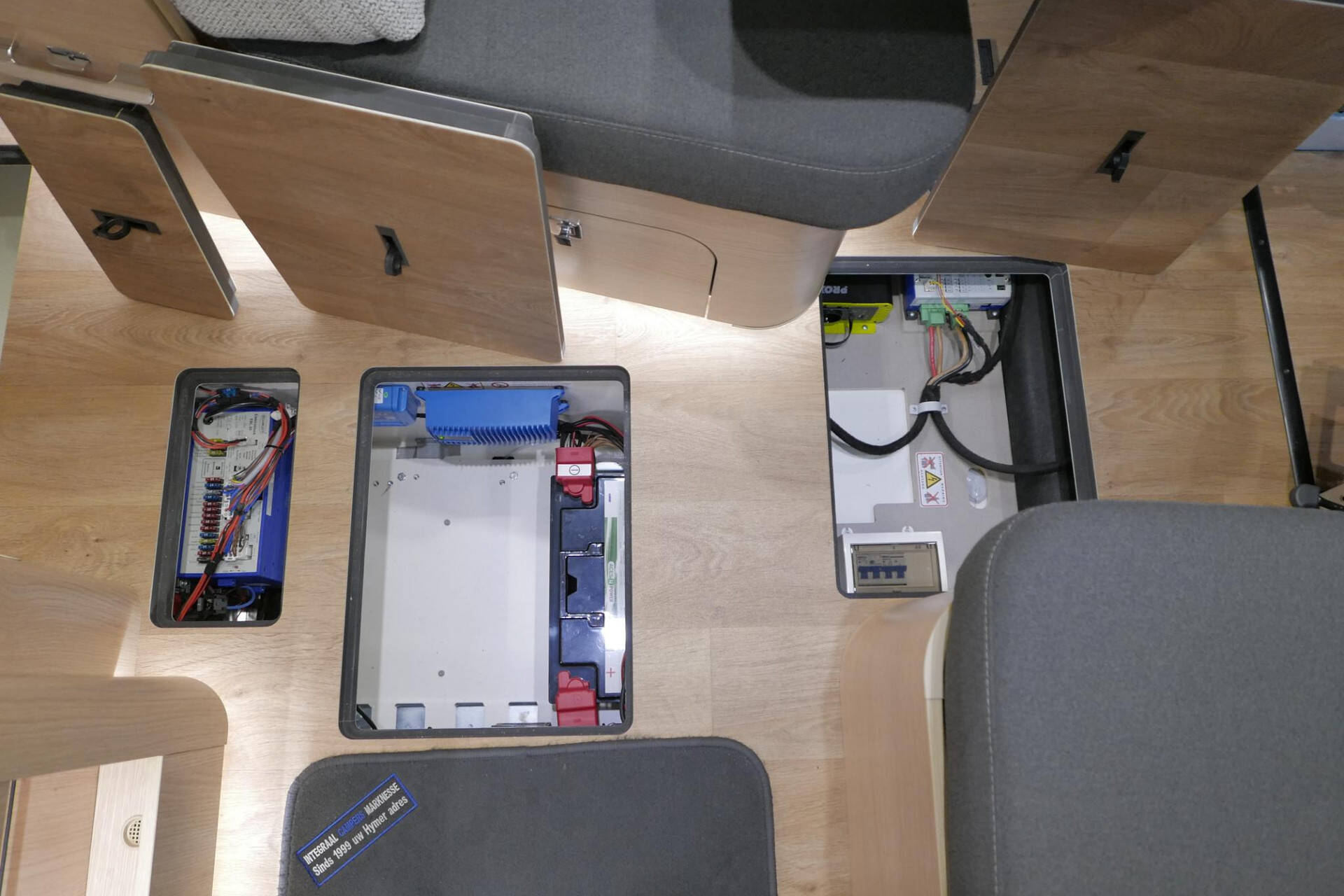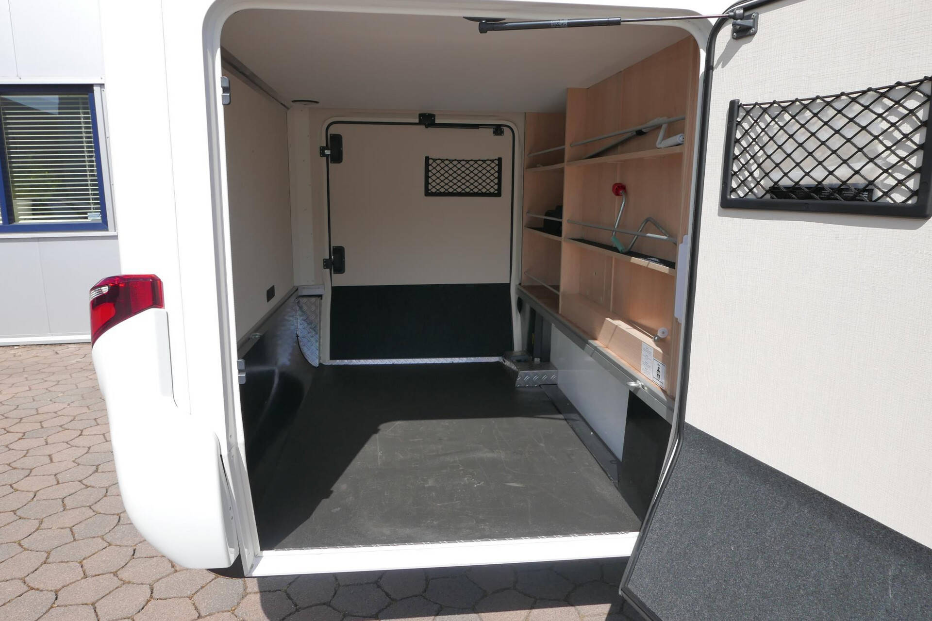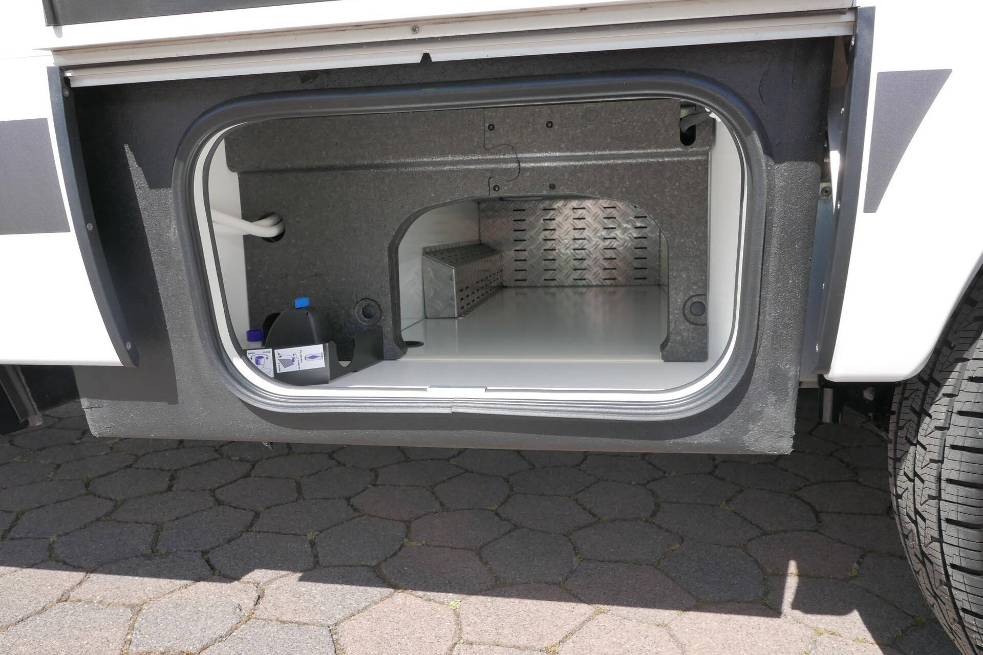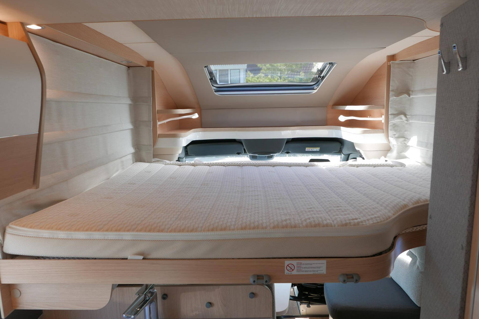 Door de voorstoelen te draaien ontstaat een ruime en gezellige zithoek met L-zit. Het Grand Oak meubeldecor in combinatie met de luxe Kitami bekleding geven de woonruimte een warme uitstraling. Tevens is deze half integraal uit gerust met een elektrische bedienbaar hefbed. Door het AL-KO maxi chassis beschikt deze camper over een volledig vlakke vloer met in de mee verwarmde dubbele bodem extra opbergruimte die ook vanaf de buitenkant te bereiken is. De 180 liter schoon- en 150 liter vuilwatertank zijn tevens in de dubbele bodem gesitueerd. Uiteraard zijn alle ramen en deuren voorzien van horren en plisséverduistering.