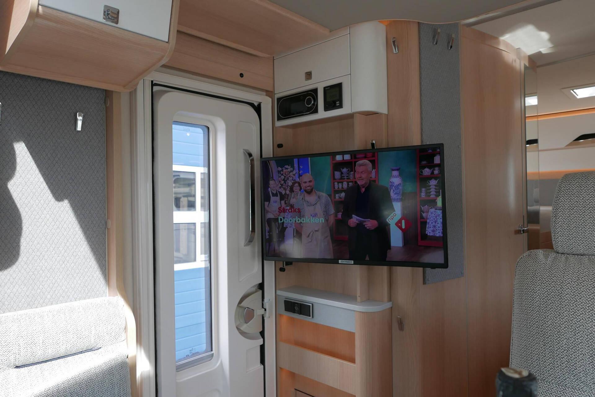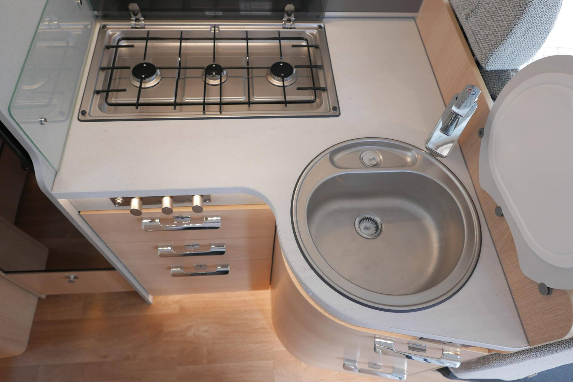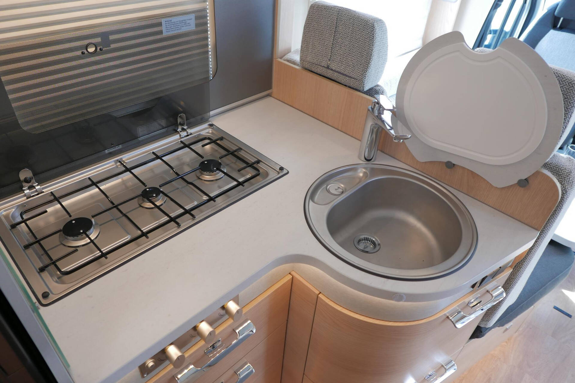 De ruime hoekkeuken is voorzien van diverse gelagerde boodschappenladen en een 3 pits gasstel. Hiernaast vindt u de hoge Smart-Tower koelkast 142 l met apart vriesgedeelte en automatische omschakeling 230V/12V/gas.