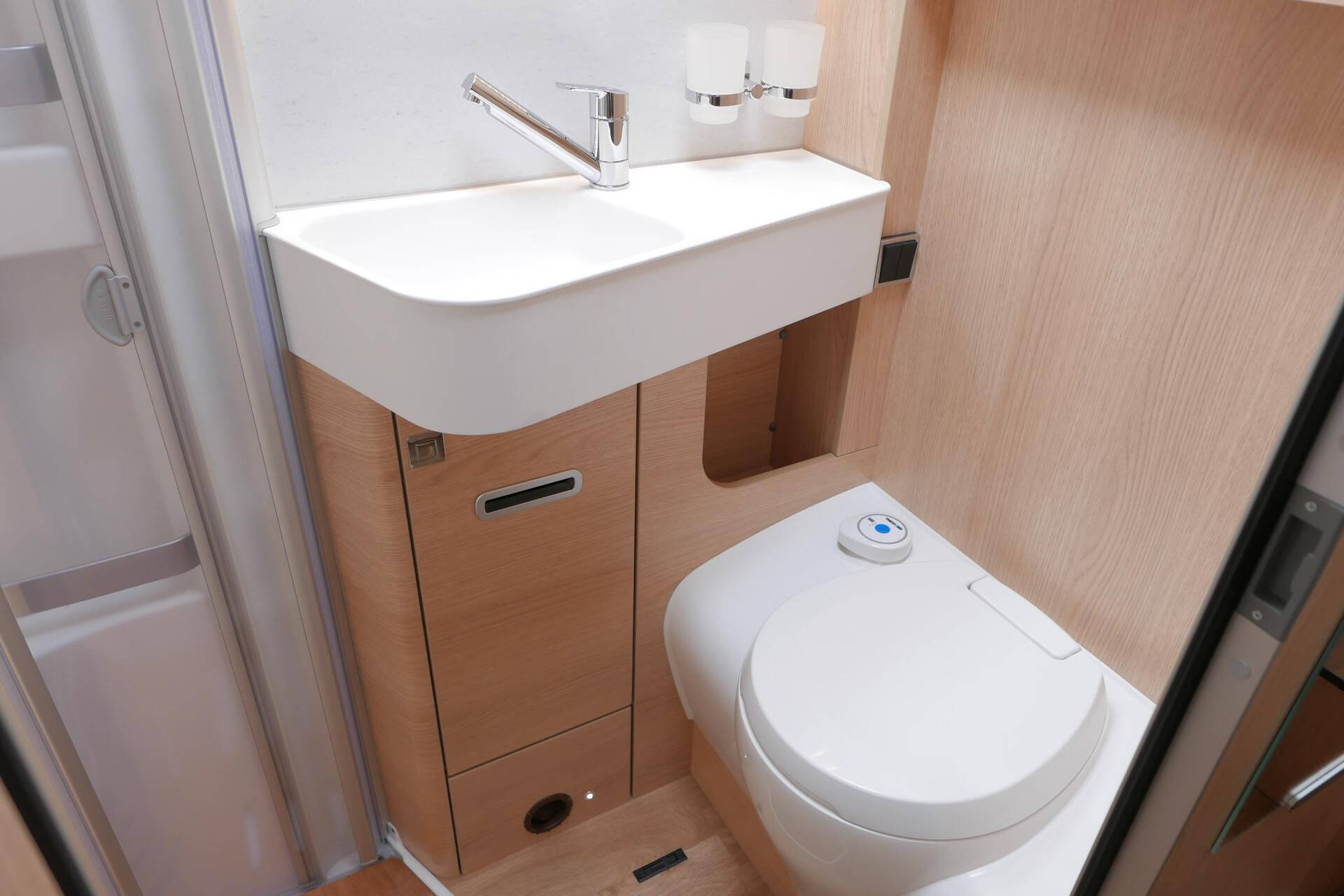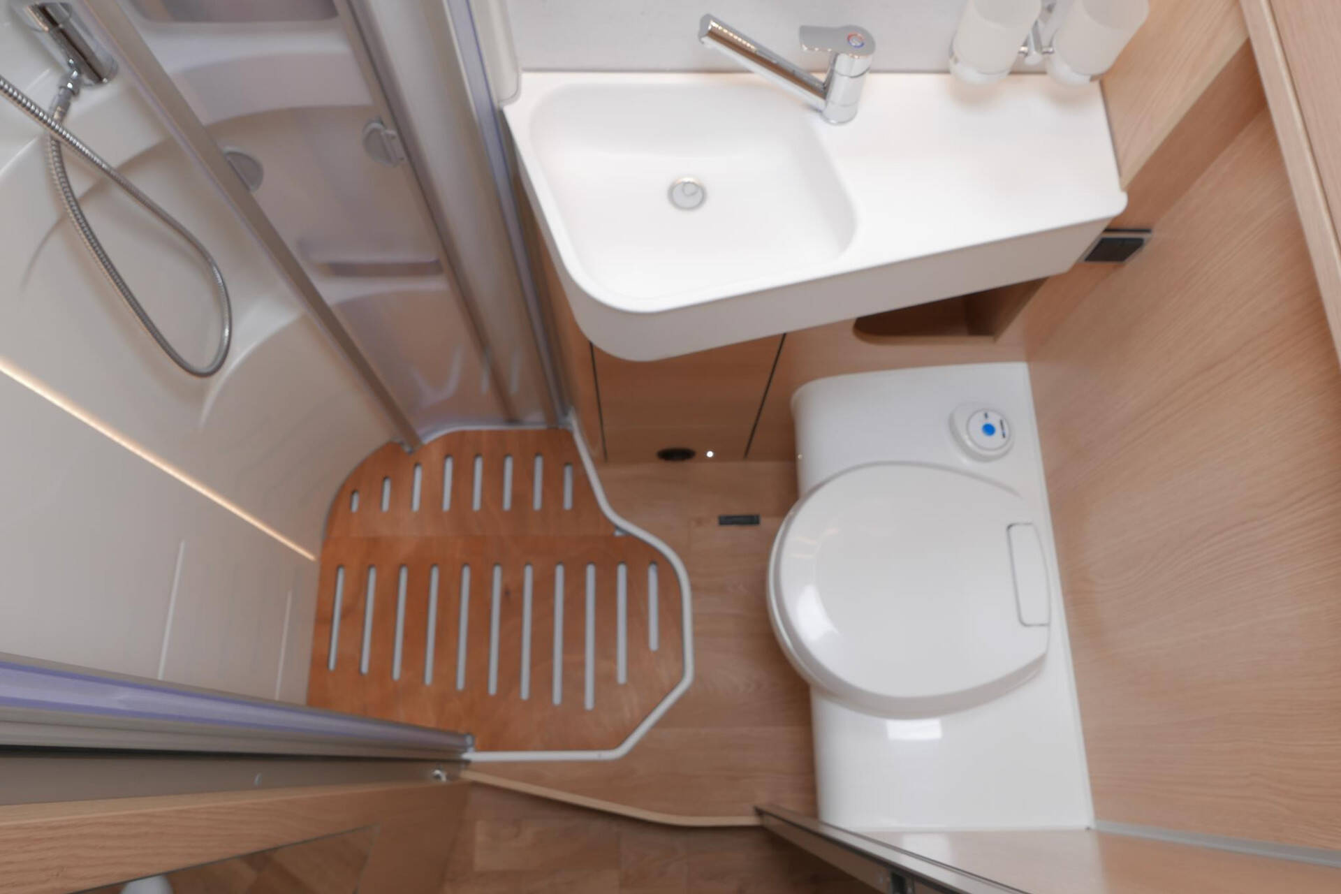Tegenover de keuken is de gecombineerde douche- en toiletruimte gesitueerd. Zeker wanneer u niet (vaak) in de camper doucht heeft u hierdoor een royale badkamer. Naast de toilet en douche is een wasbak met grote spiegel en diverse kastruimte aanwezig. De houten douchevlonder zorgt voor een vlakke vloer in de ruimte.