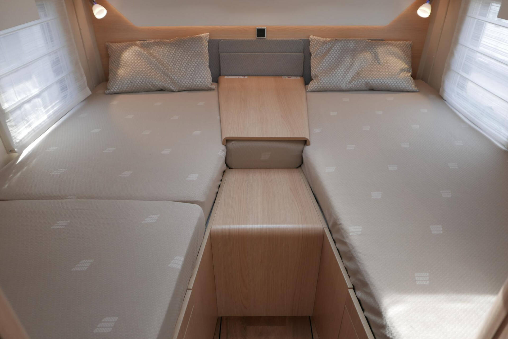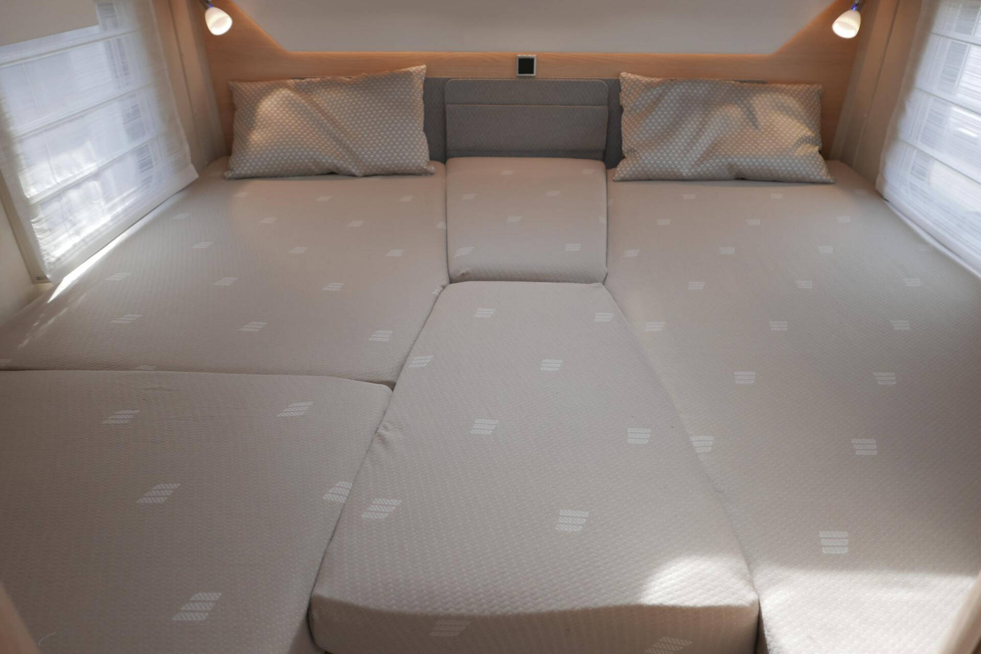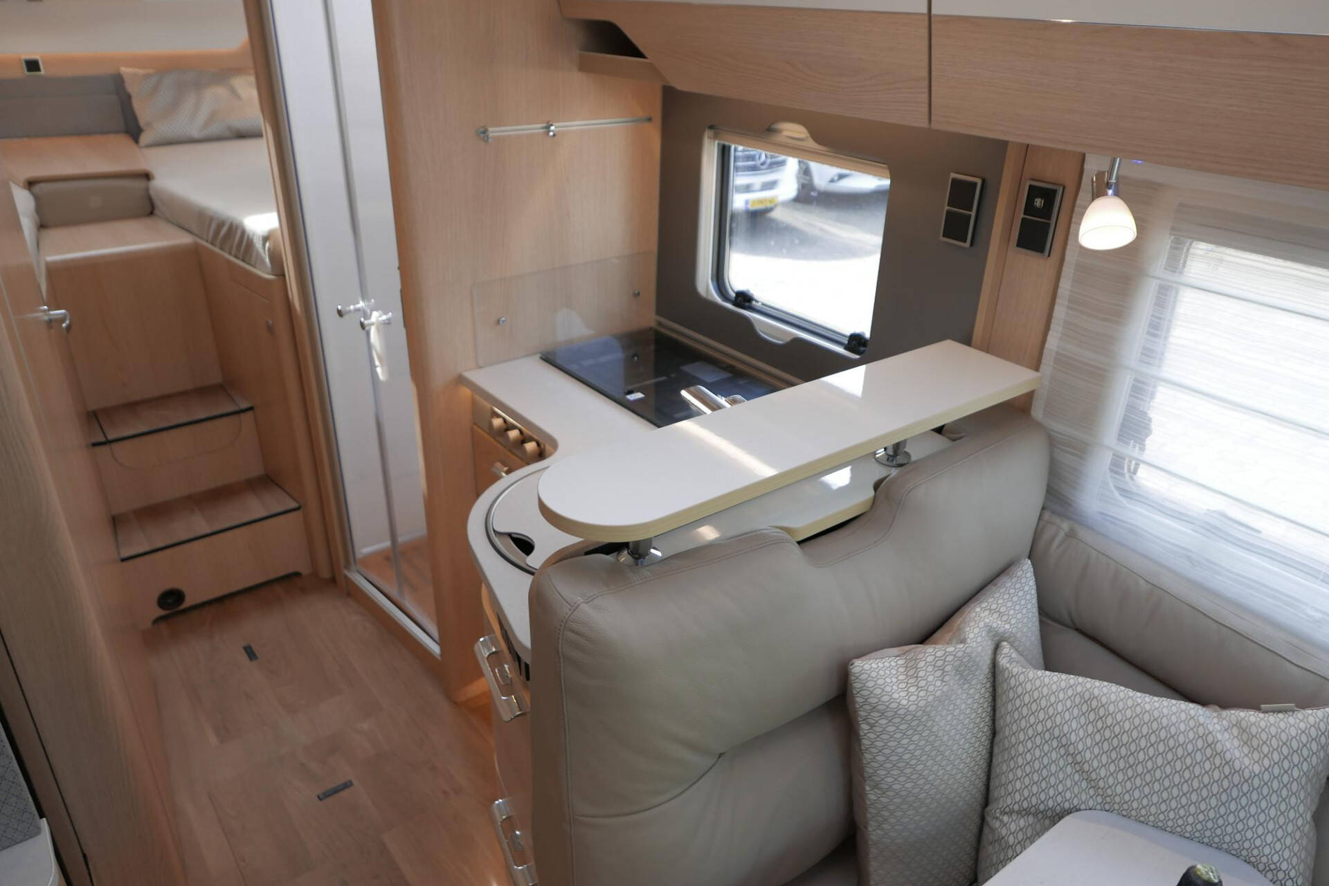 Door de voorstoelen te draaien ontstaat een ruime en gezellige zithoek met L-zit. Het Grand Oak meubeldecor in combinatie met de luxe leder Tortora bekleding geven de woonruimte een lichte uitstraling. Door het AL-KO maxi chassis beschikt deze camper over een volledig vlakke vloer met in de mee verwarmde dubbele bodem extra opbergruimte die ook vanaf de buitenkant te bereiken is. De 180 liter schoon- en 150 liter vuilwatertank zijn tevens in de dubbele bodem gesitueerd. Uiteraard zijn alle ramen en deuren voorzien van horren en plisséverduistering.
