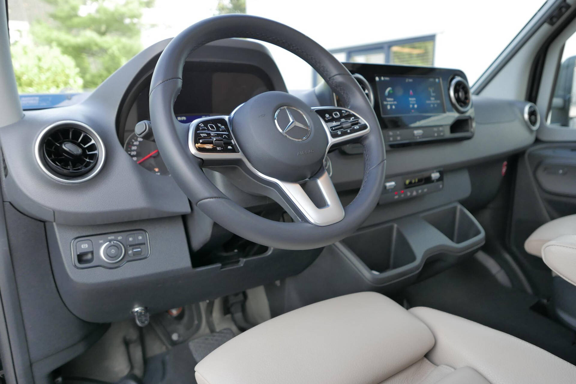 De cabine van deze half-integraalcamper is makkelijk toegankelijk via de bestuurders- en de passagiersdeur. De cabine is uitgerust met het Mercedes-Benz 10,25 inch MBUX multimedia systeem en 2 luxe pilotenstoelen die volledig verstelbaar en draaibaar zijn. Verder beschikt deze camper over: