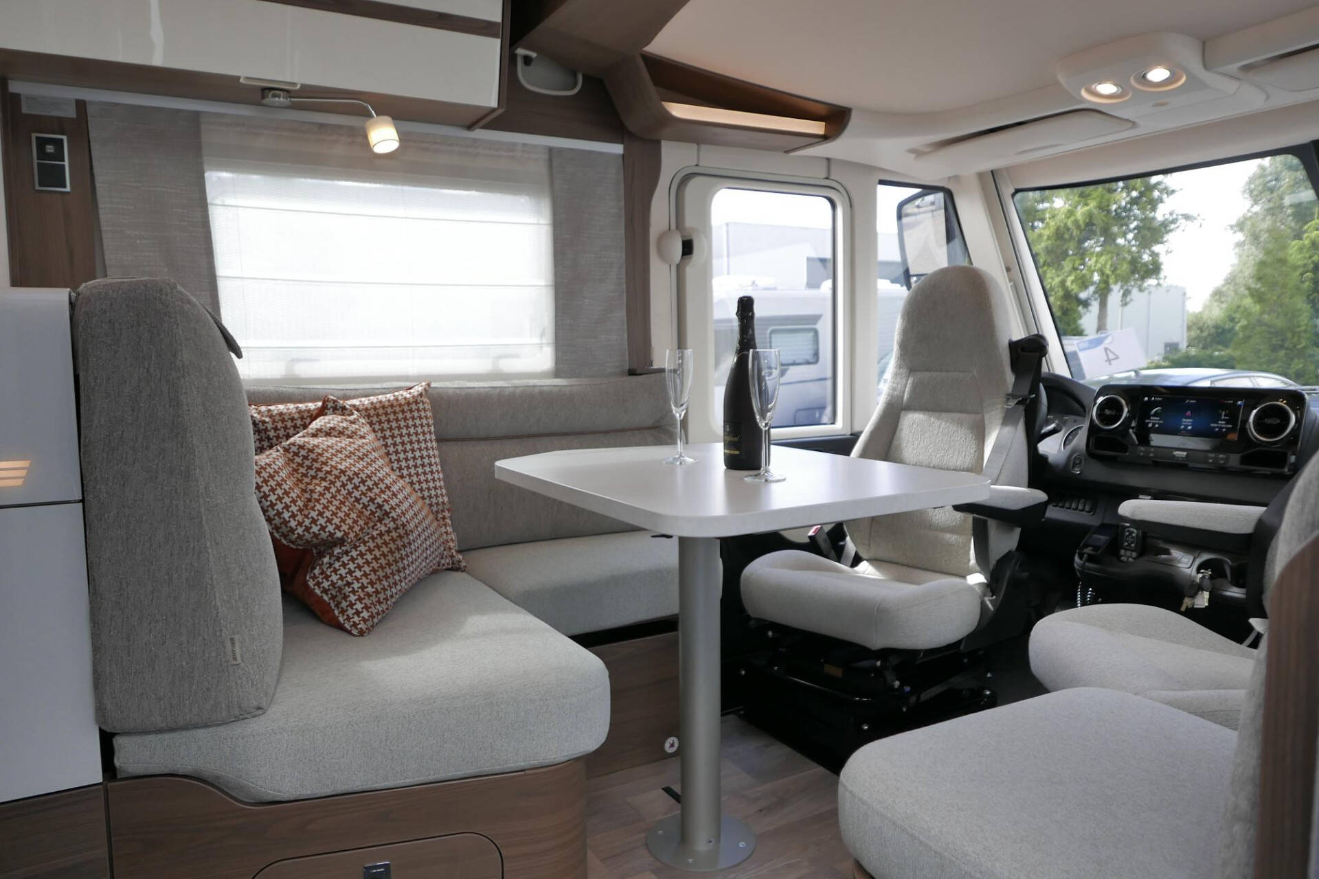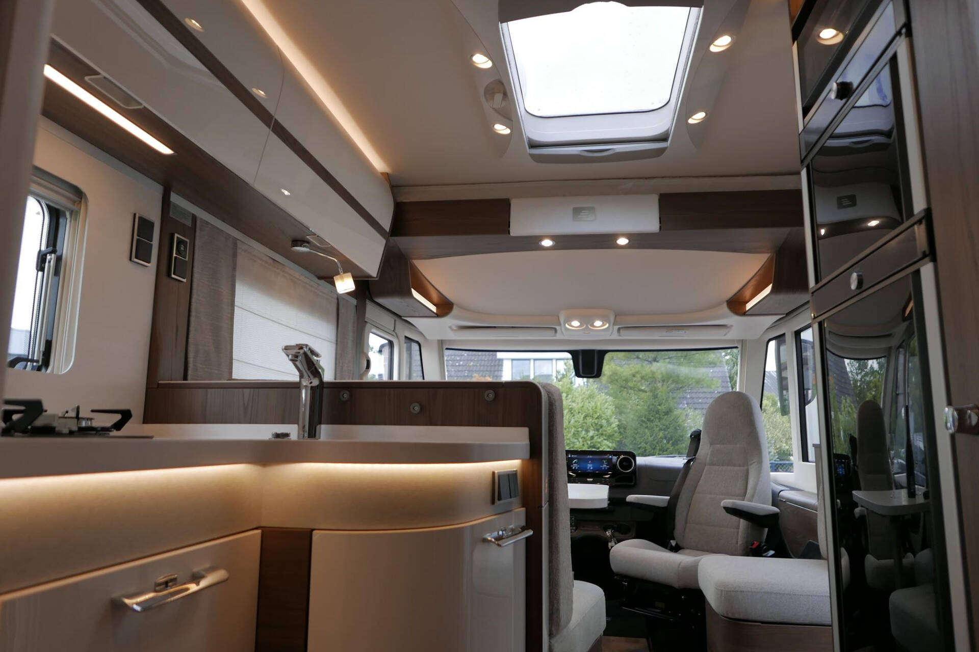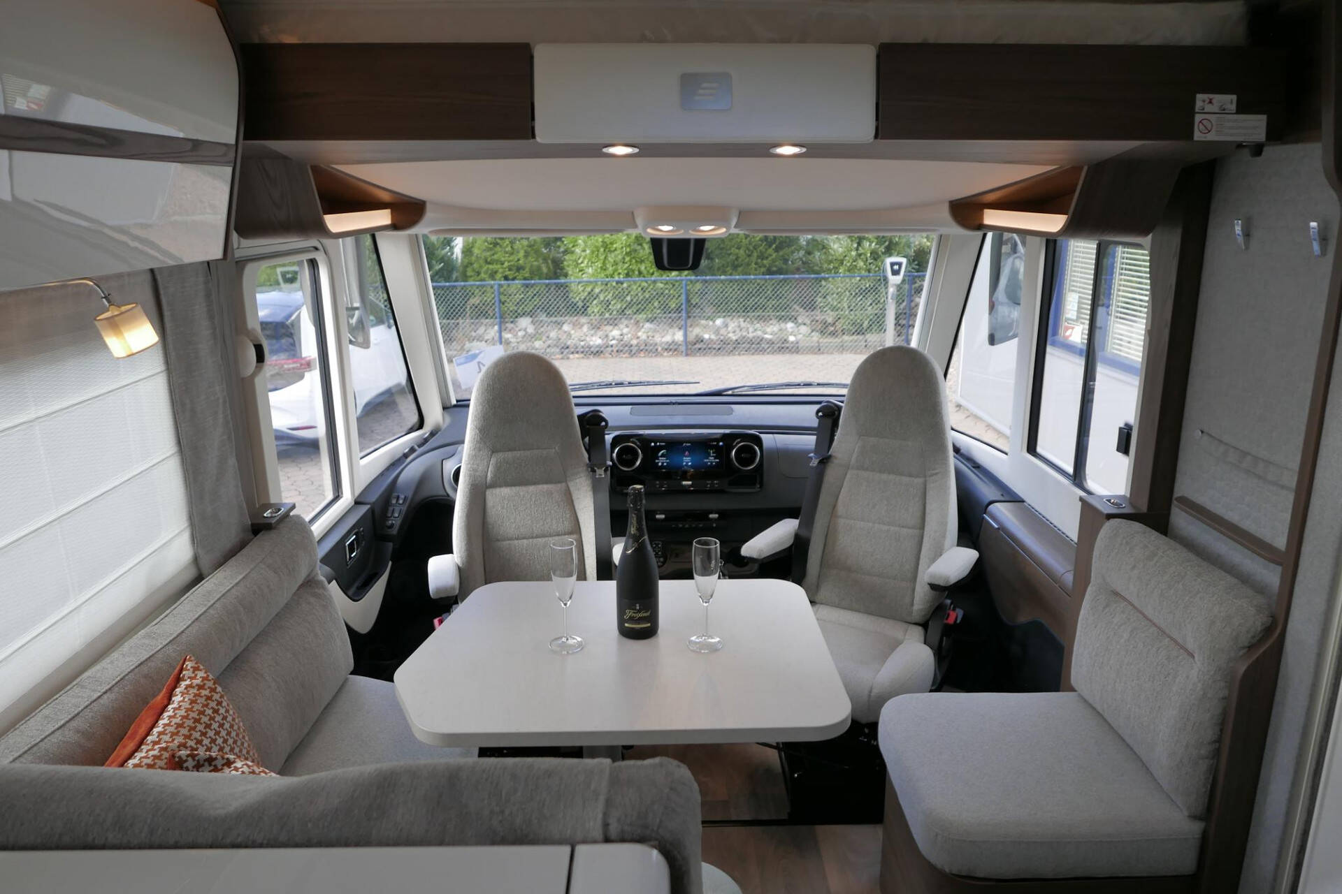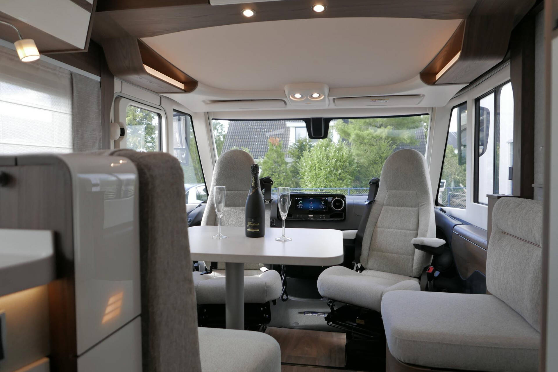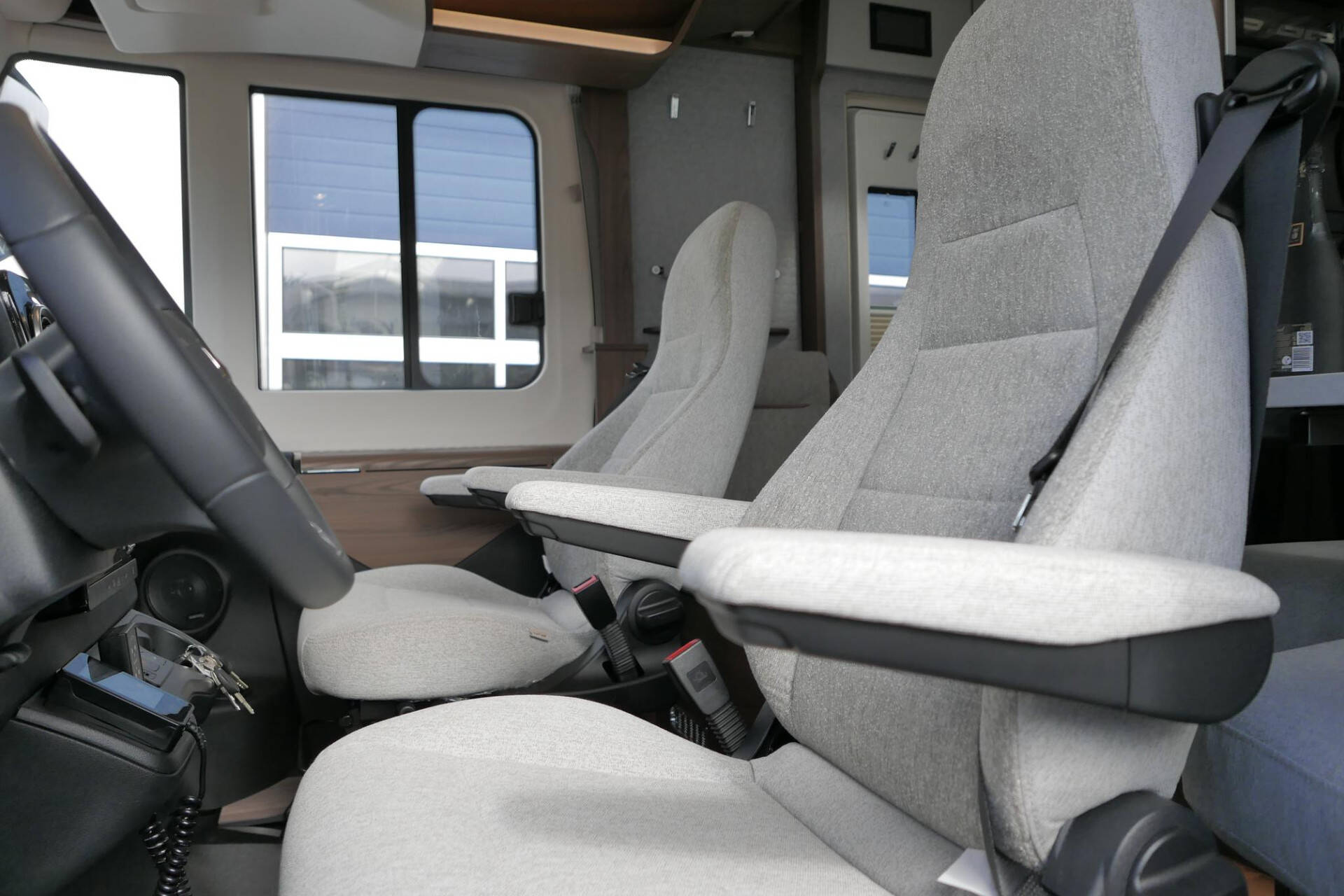 In de cabine van deze integraalcamper valt meteen het waanzinnige panorama uitzicht op, niet alleen om volop te genieten van de omgeving, maar ook voor een goed overzicht op het verkeer tijdens het rijden. De cockpit is voorzien van het Mercedes-Benz 10,25 inch MBUX multimediasysteem waarop onder andere de navigatie, de achteruitrijcamera en de DAB+ radio te bedienen zijn. De 2 comfortabele Aguti ergoflex stoelen zijn volledig verstelbaar en draaibaar. In het zijbankje is een extra 5e stoel met gordel te plaatsen, UNIEK. Verder beschikt deze camper over: