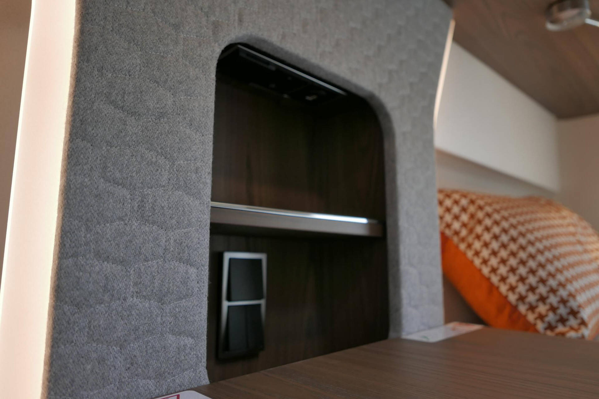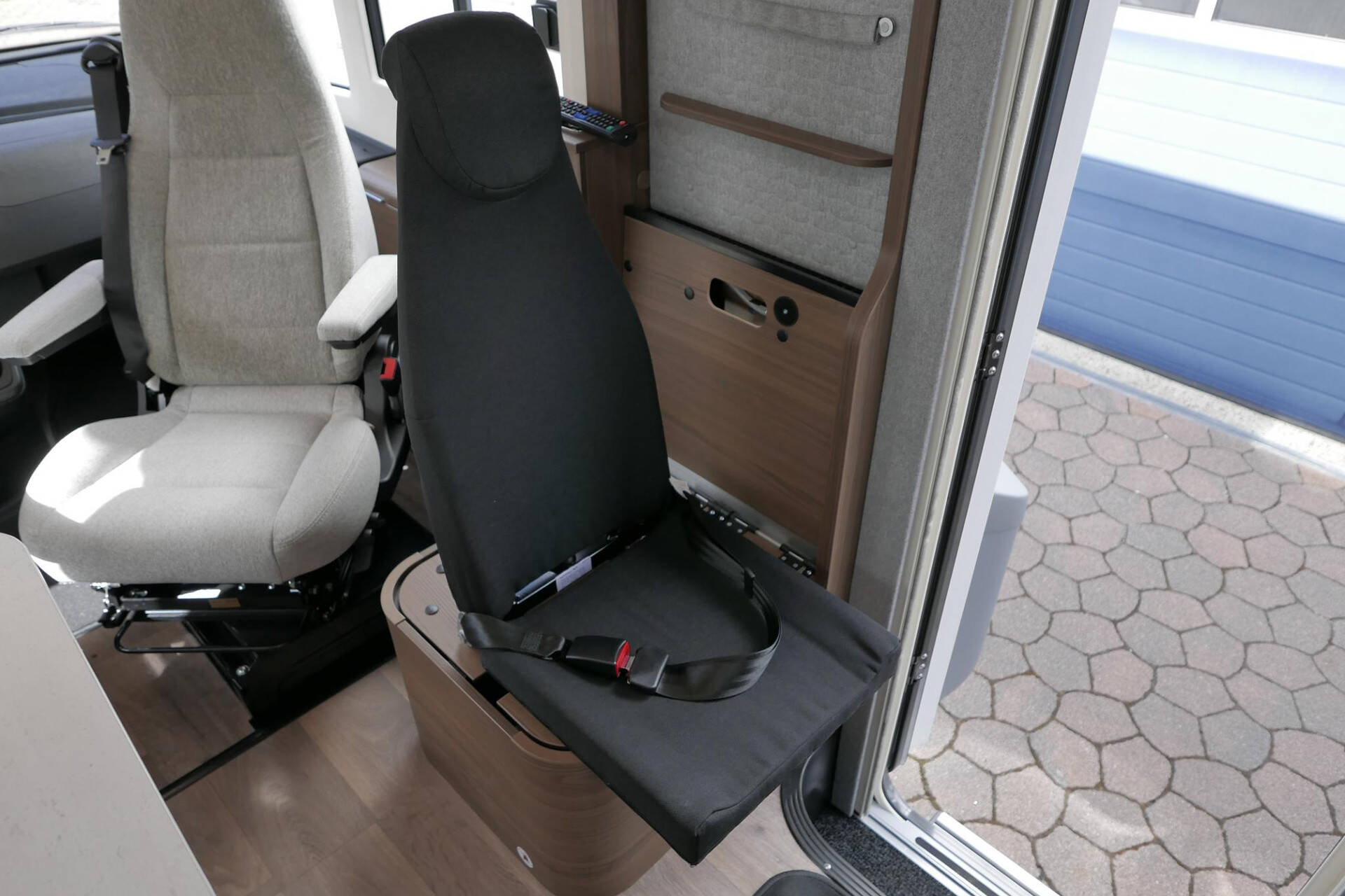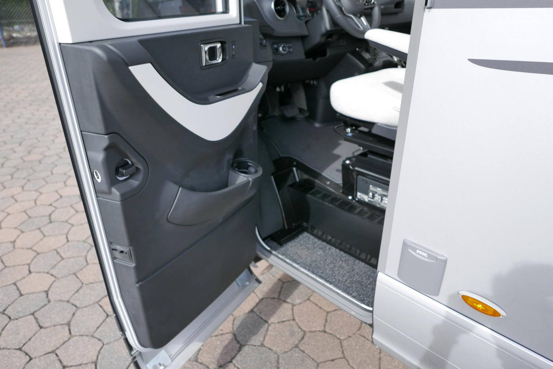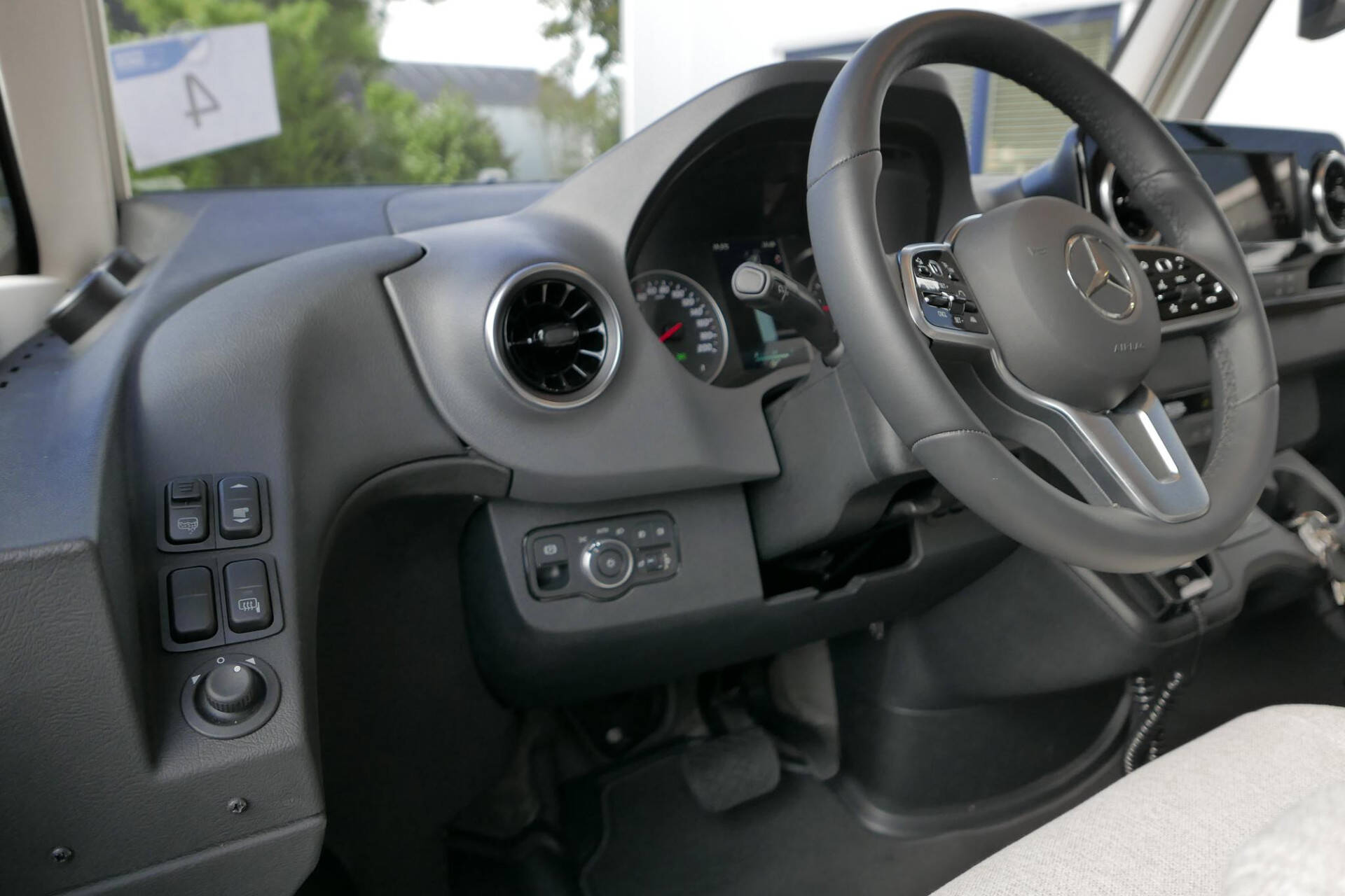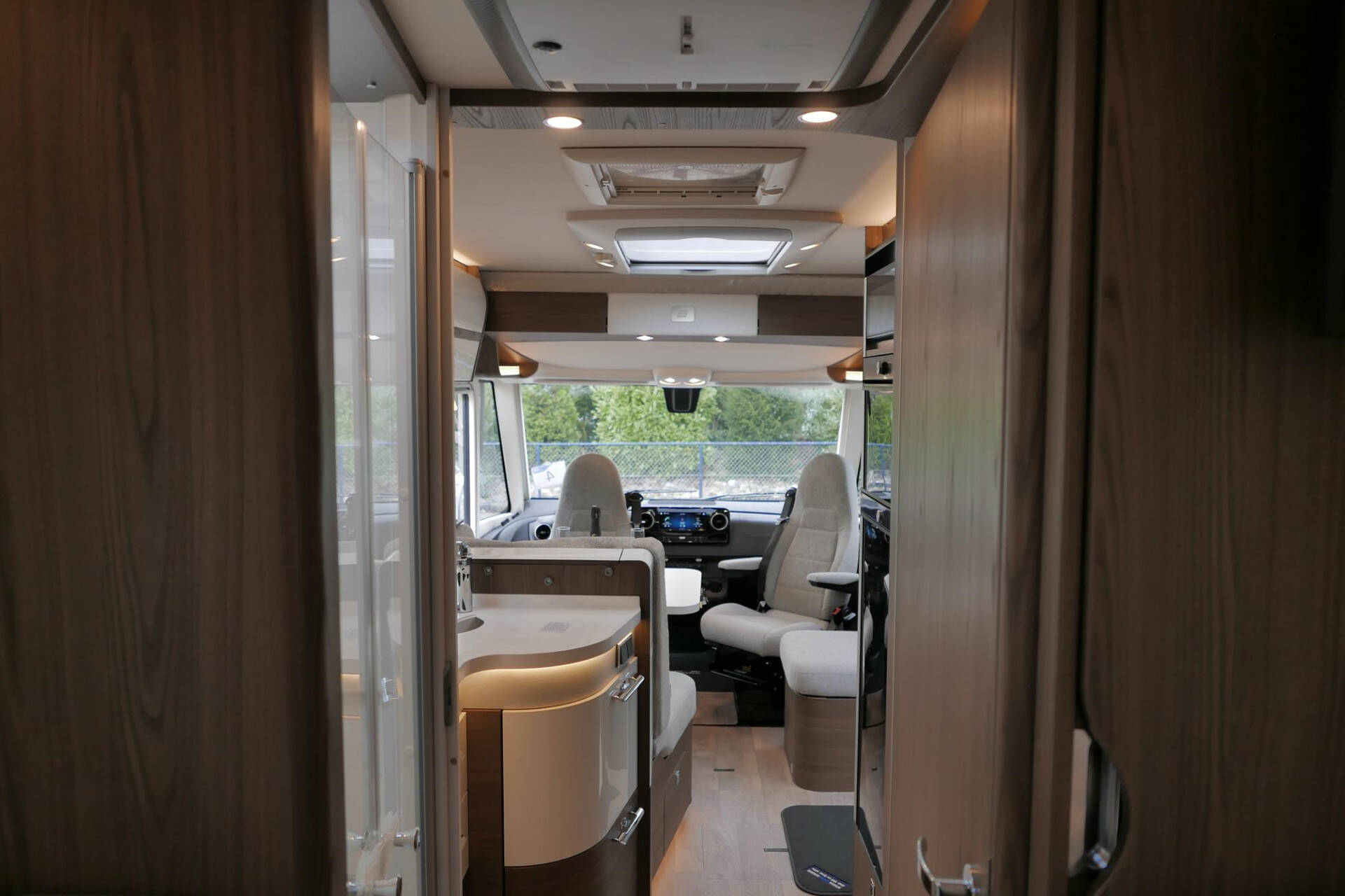 In de cabine van deze integraalcamper valt meteen het waanzinnige panorama uitzicht op, niet alleen om volop te genieten van de omgeving, maar ook voor een goed overzicht op het verkeer tijdens het rijden. De cockpit is voorzien van het Mercedes-Benz 10,25 inch MBUX multimediasysteem waarop onder andere de navigatie, de achteruitrijcamera en de DAB+ radio te bedienen zijn. De 2 comfortabele Aguti ergoflex stoelen zijn volledig verstelbaar en draaibaar. In het zijbankje is een extra 5e stoel met gordel te plaatsen, UNIEK. Verder beschikt deze camper over: