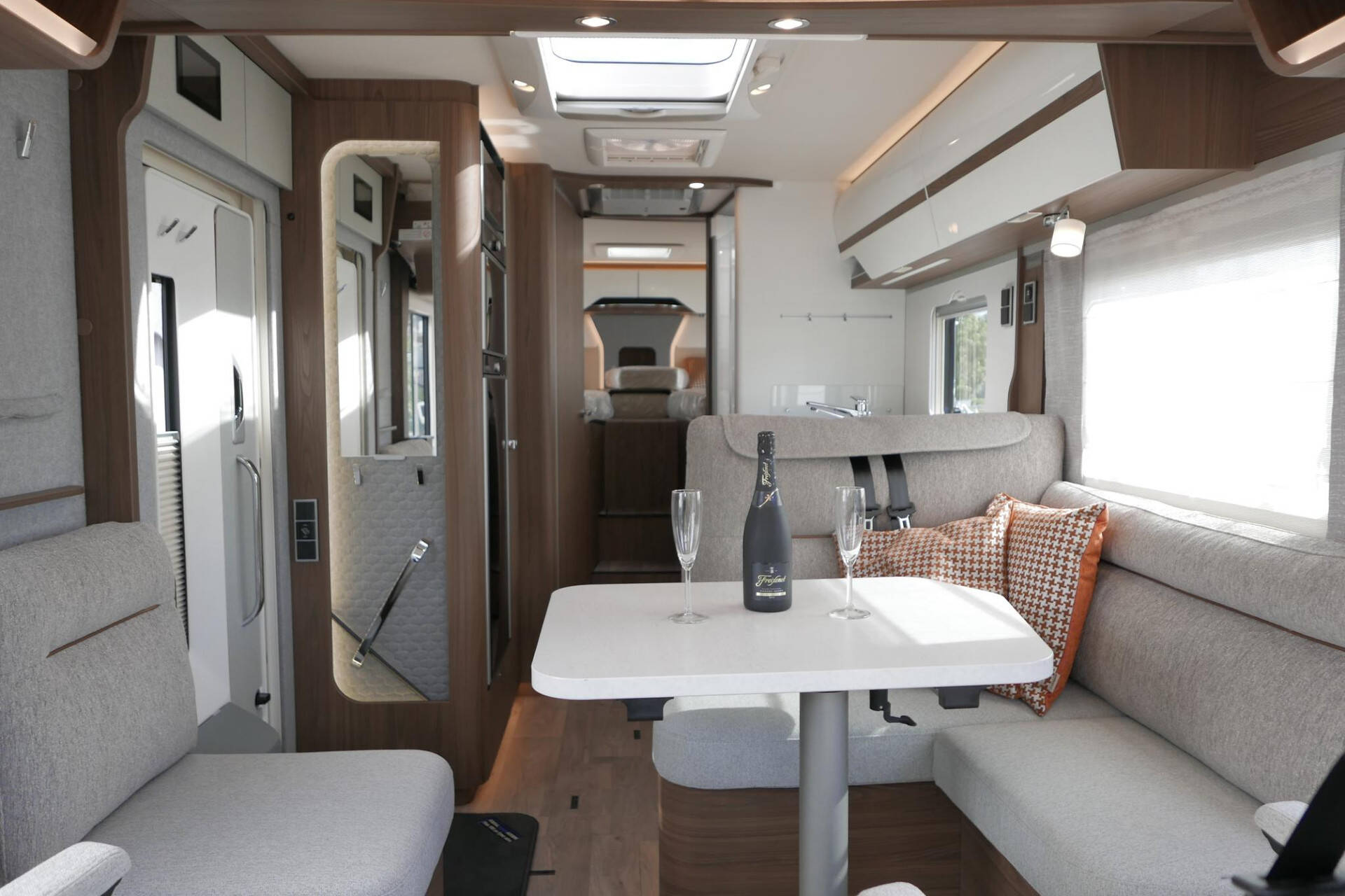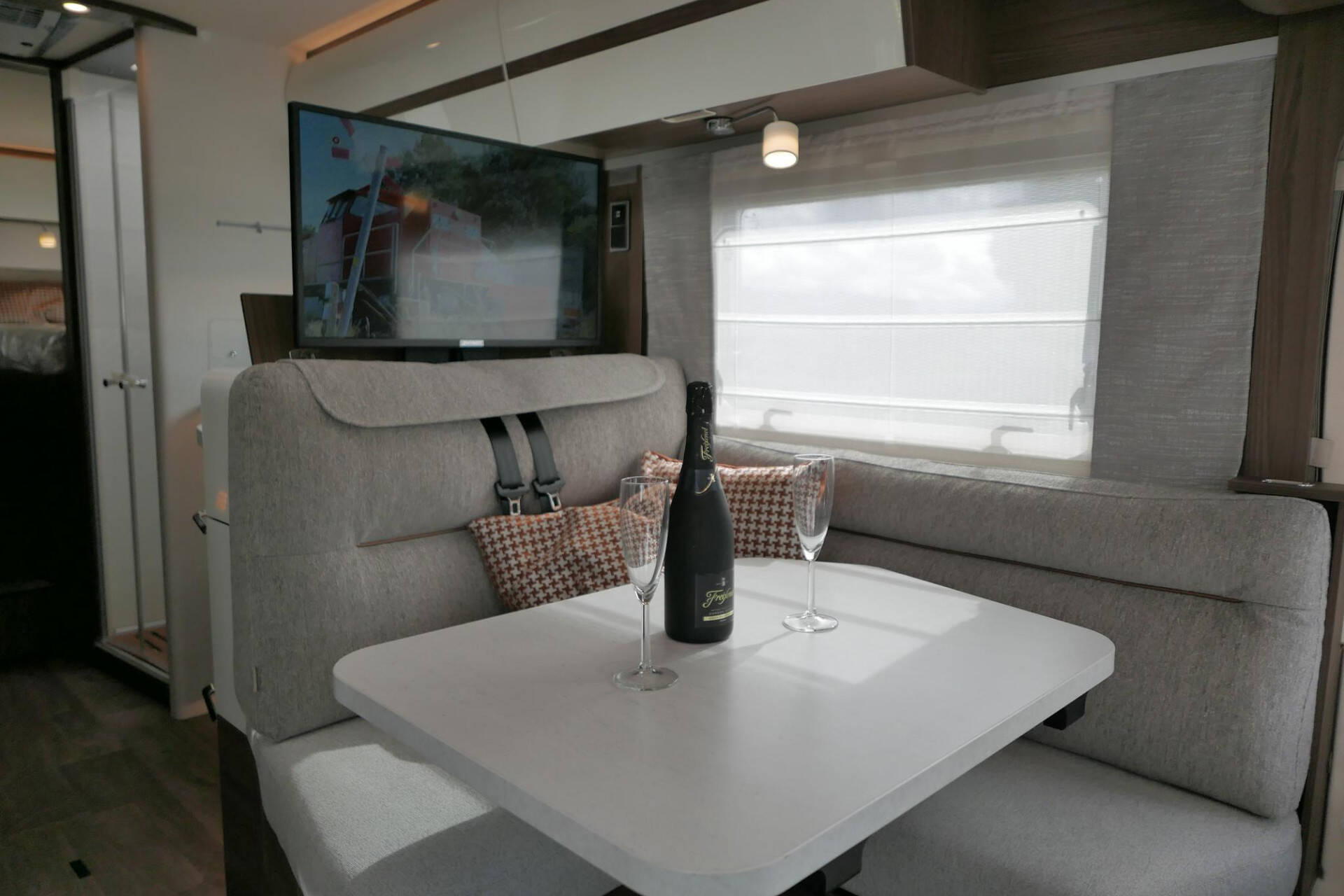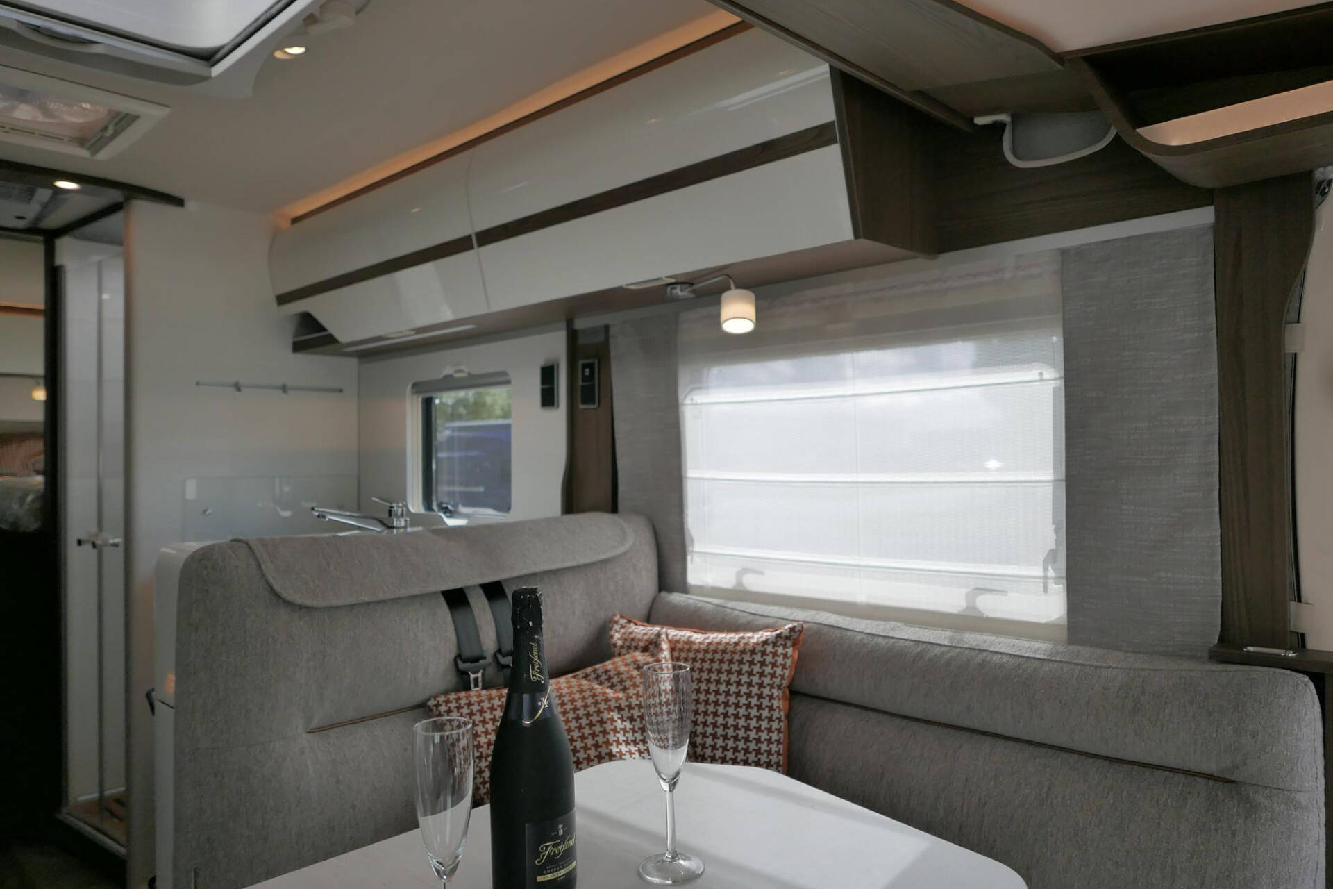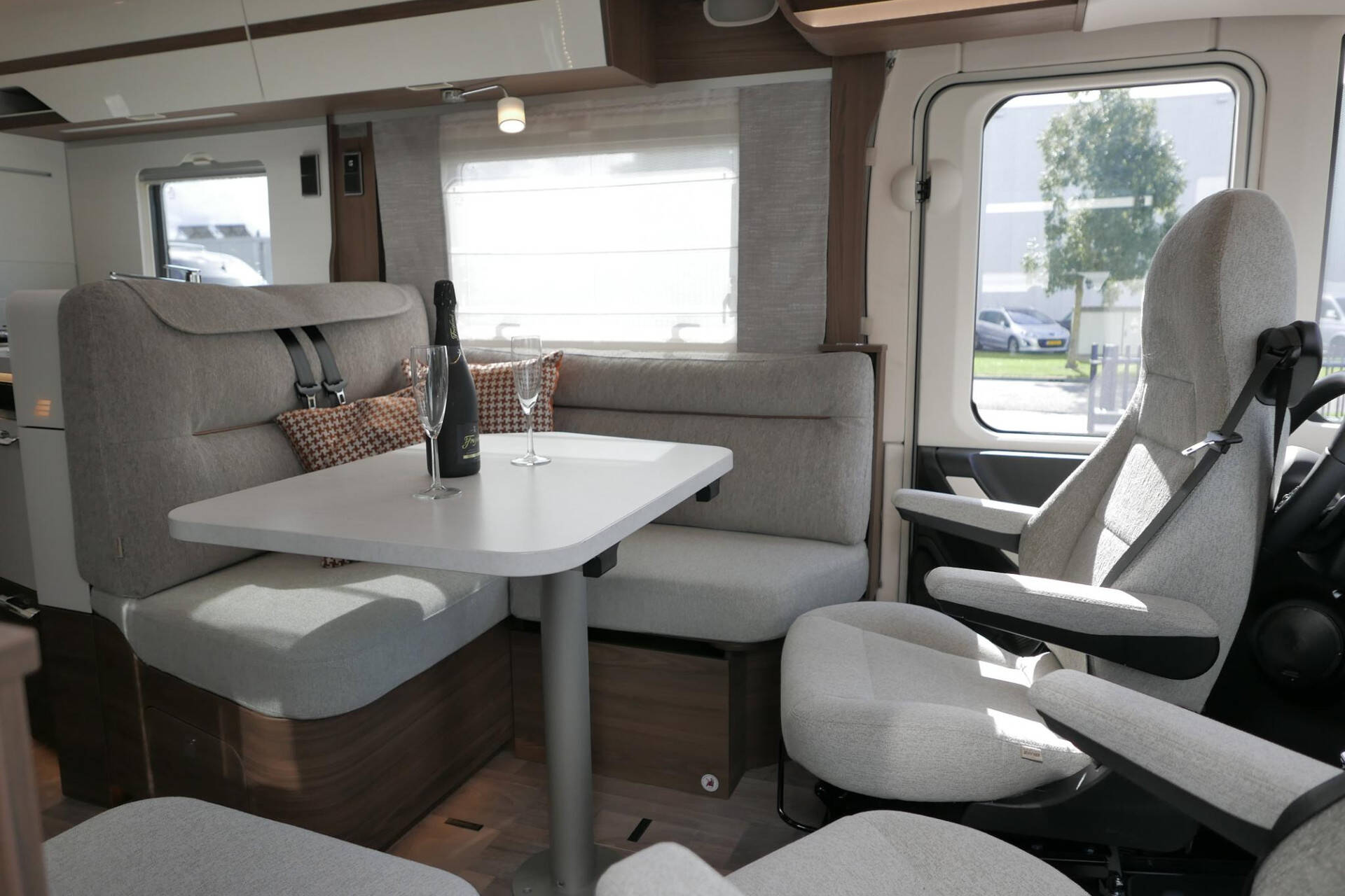 Door de voorstoelen te draaien ontstaat een royale zithoek met L-zit met een 360° draaibare en verstelbare tafel. Het Velvet Ash meubeldecor in combinatie met de Phoenix bekleding zorgen een chique uitstraling. Door het AL-KO chassis beschikt deze camper over een vlakke vloer met in de mee verwarmde dubbele bodem extra opbergruimte die zowel van binnenuit als van buitenaf te bereiken is. Ook de 180 liter schoon- 150 liter vuilwatertank bevinden zich in de dubbele bodem. Natuurlijk zijn alle ramen de toegangsdeur voorzien van horren en plisséverduistering.