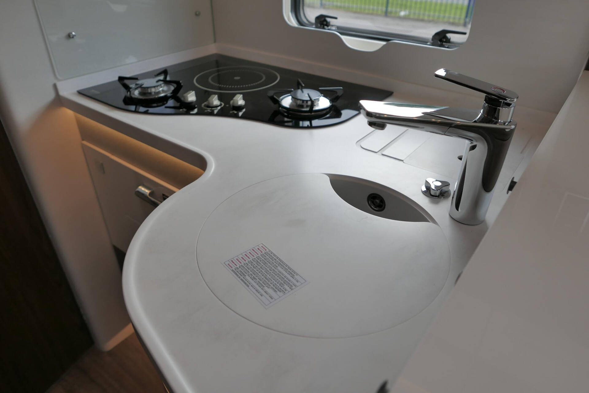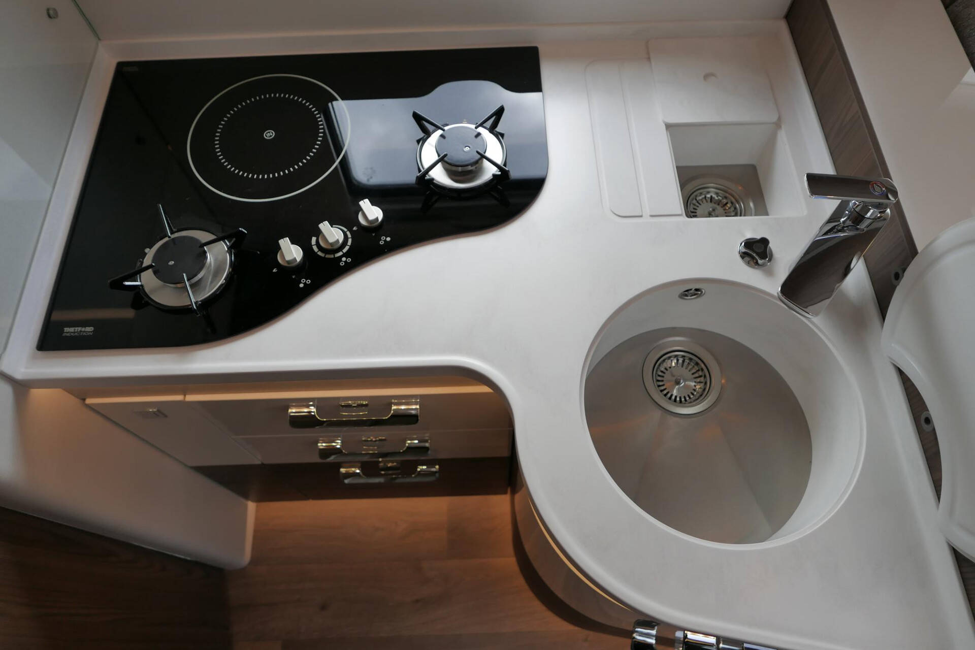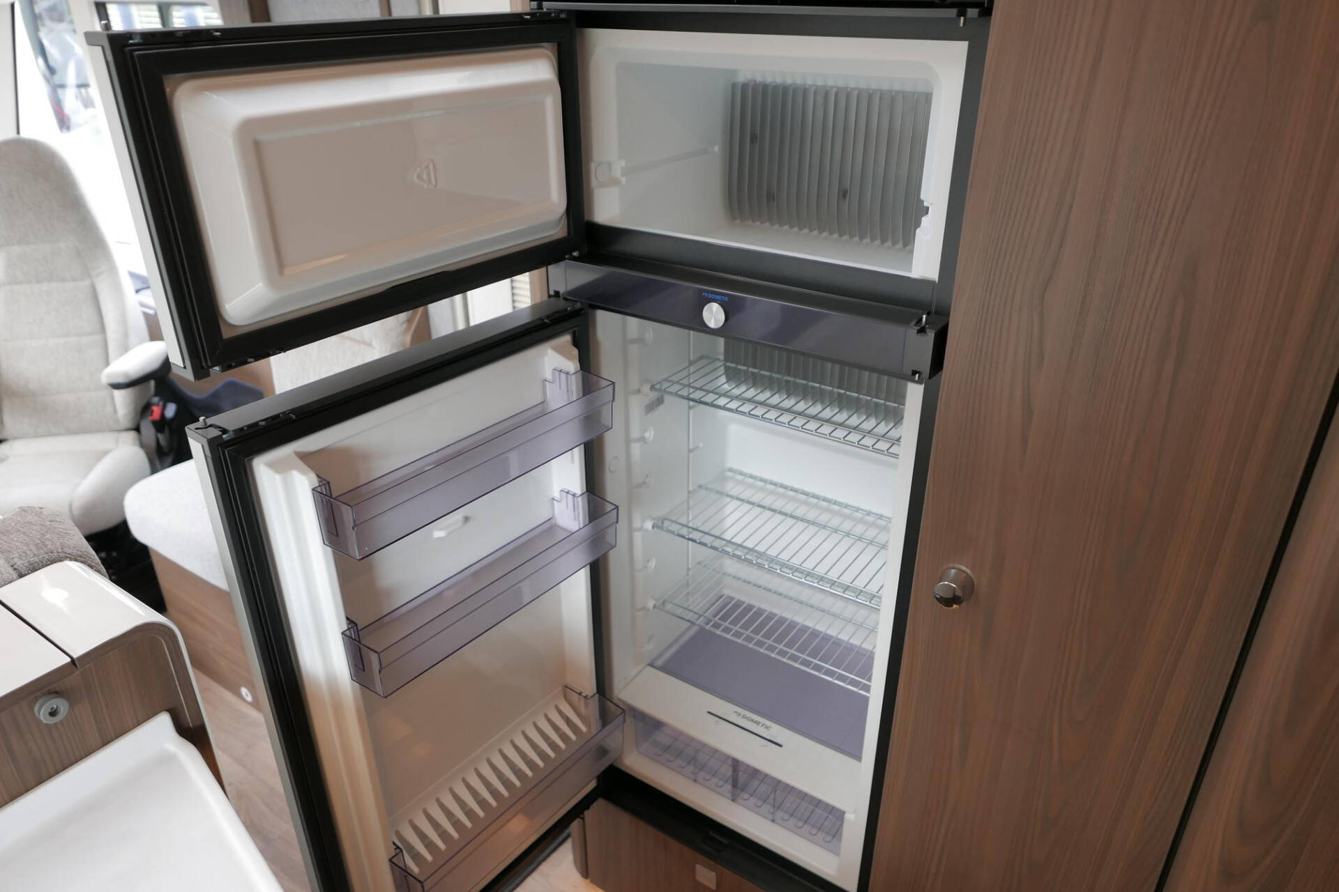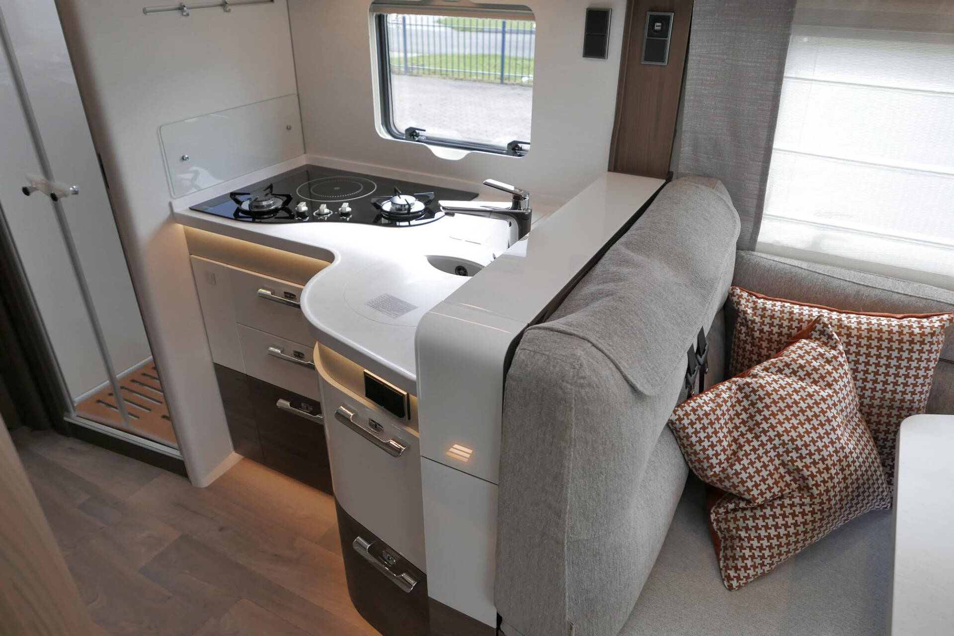 De luxe hoekkeuken is voorzien van diverse gelagerde boodschappenladen, waaronder een apothekerslade en 2 pits gasstel én een inductie kookplaat. Hier tegenover bevindt zich de grote TecTower koelkast met aparte vriezer en automatische omschakeling 230V/12V/gas. De deuren zijn zowel links als rechts scharnierend, zodat u vanuit de keuken én vanuit de woonruimte makkelijk in de koelkast kunt.